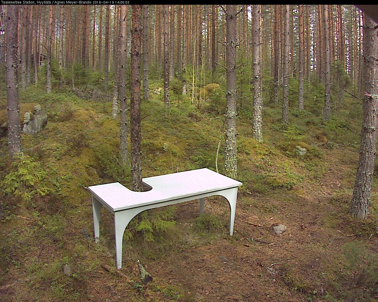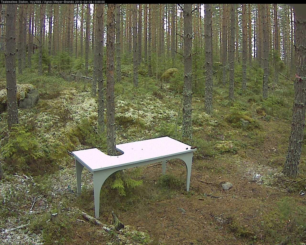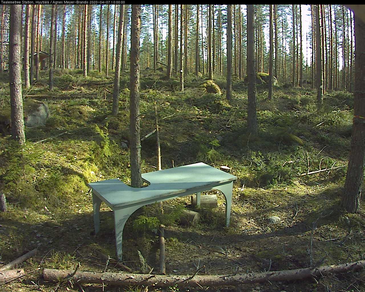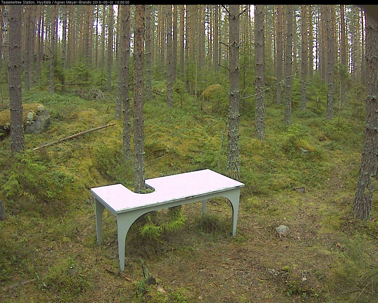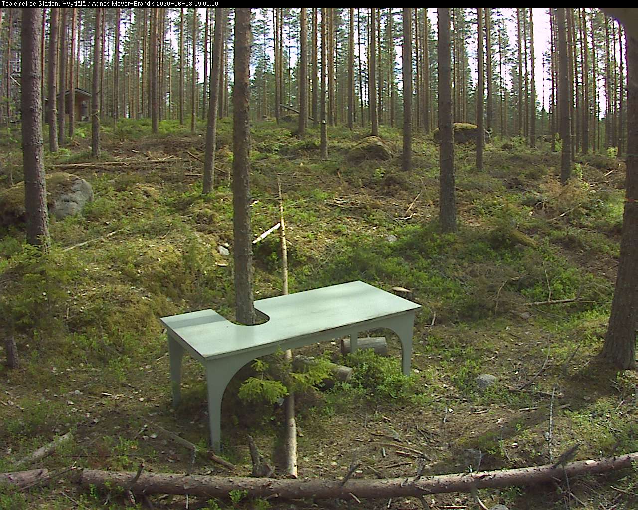 Agnes Meyer-Brandiksen työ Hyytiälässä alkoi tutustumalla aseman muihin tutkijoihin. Pystyäkseen tapaamaan ihmisiä metsässä, hän rakensi pöydän, josta muodostui kohtauspiste ja paikka teehetkille Agneksen ja puun kanssa.