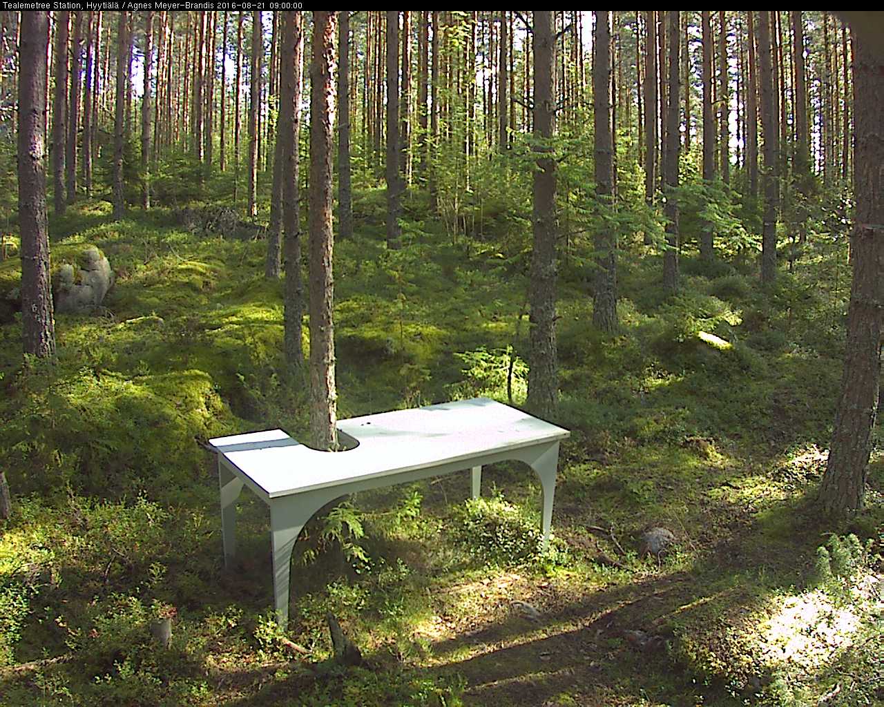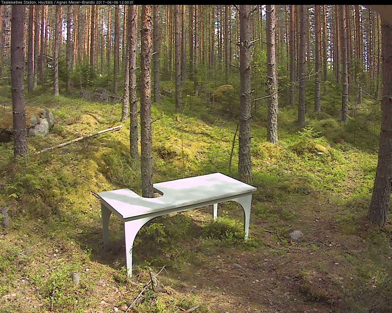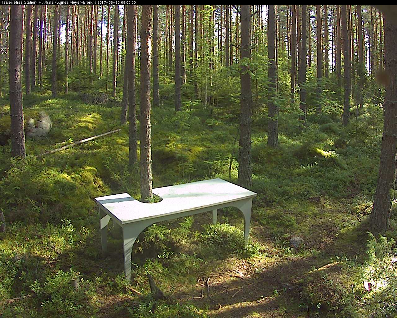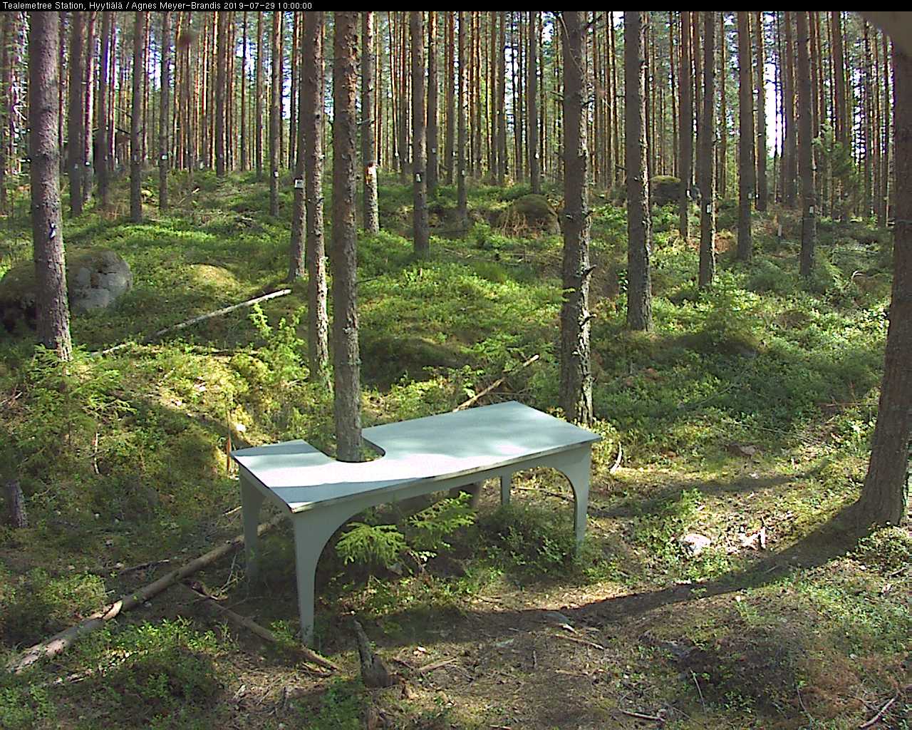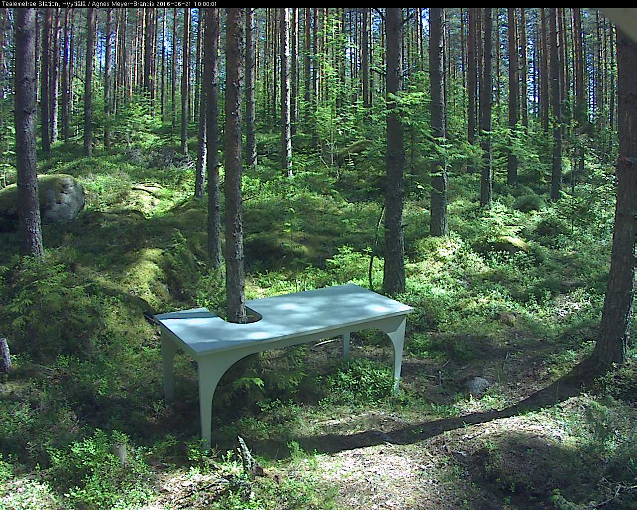 Agnes Meyer-Brandiksen työ Hyytiälässä alkoi tutustumalla aseman muihin tutkijoihin. Pystyäkseen tapaamaan ihmisiä metsässä, hän rakensi pöydän, josta muodostui kohtauspiste ja paikka teehetkille Agneksen ja puun kanssa.