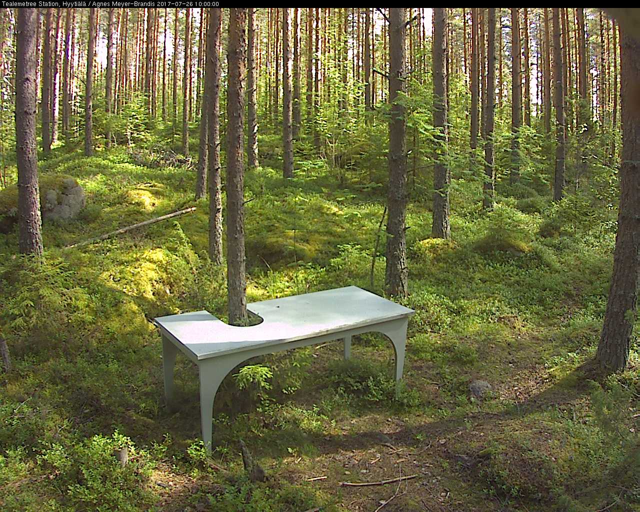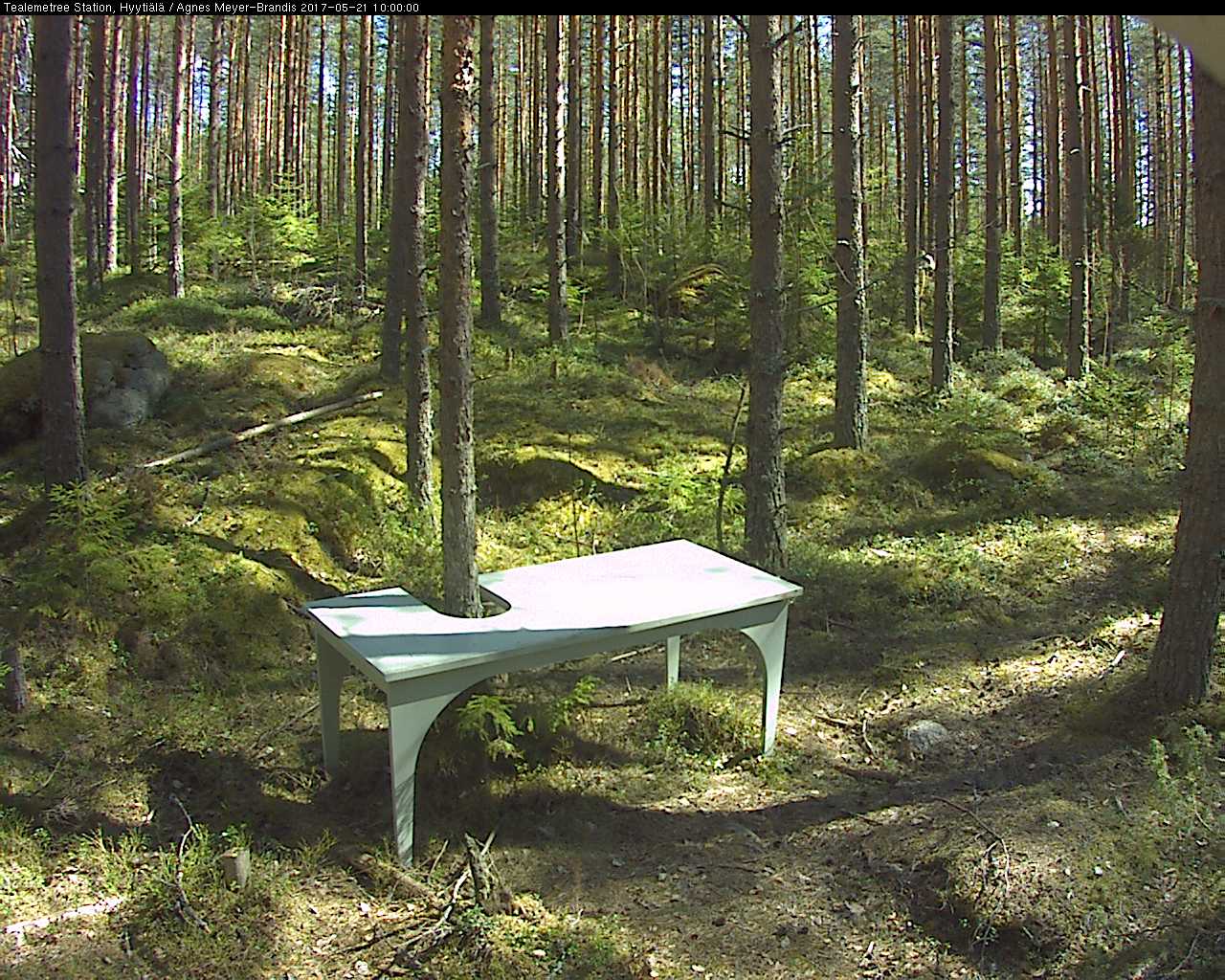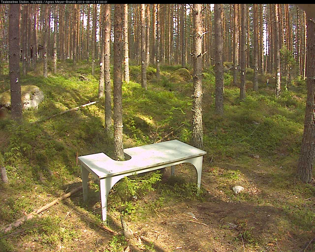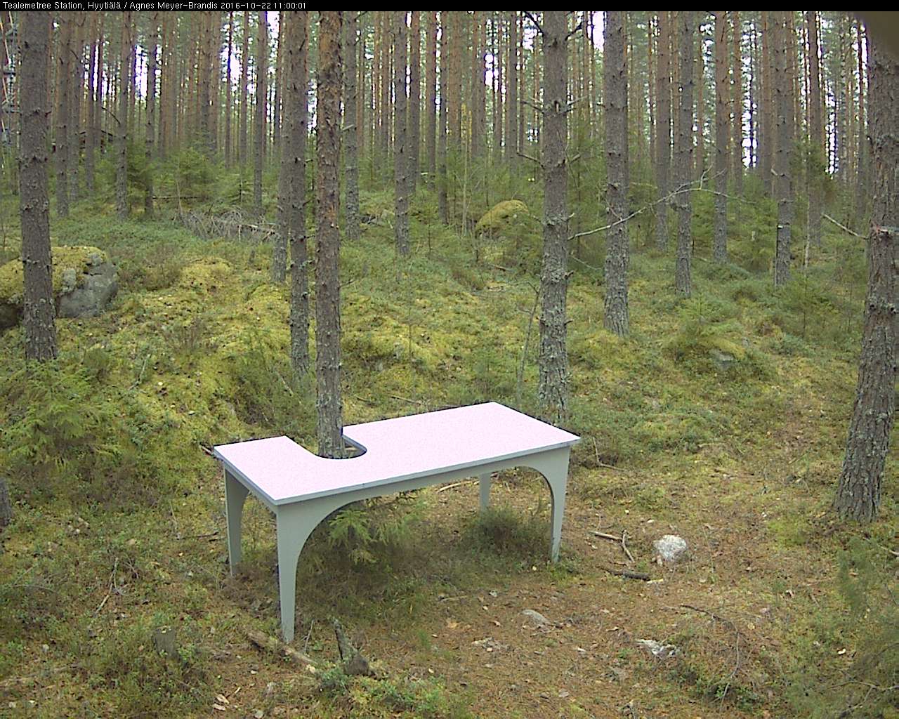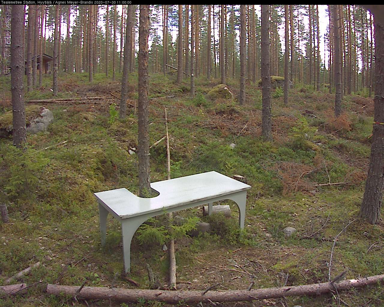 Agnes Meyer-Brandiksen työ Hyytiälässä alkoi tutustumalla aseman muihin tutkijoihin. Pystyäkseen tapaamaan ihmisiä metsässä, hän rakensi pöydän, josta muodostui kohtauspiste ja paikka teehetkille Agneksen ja puun kanssa.