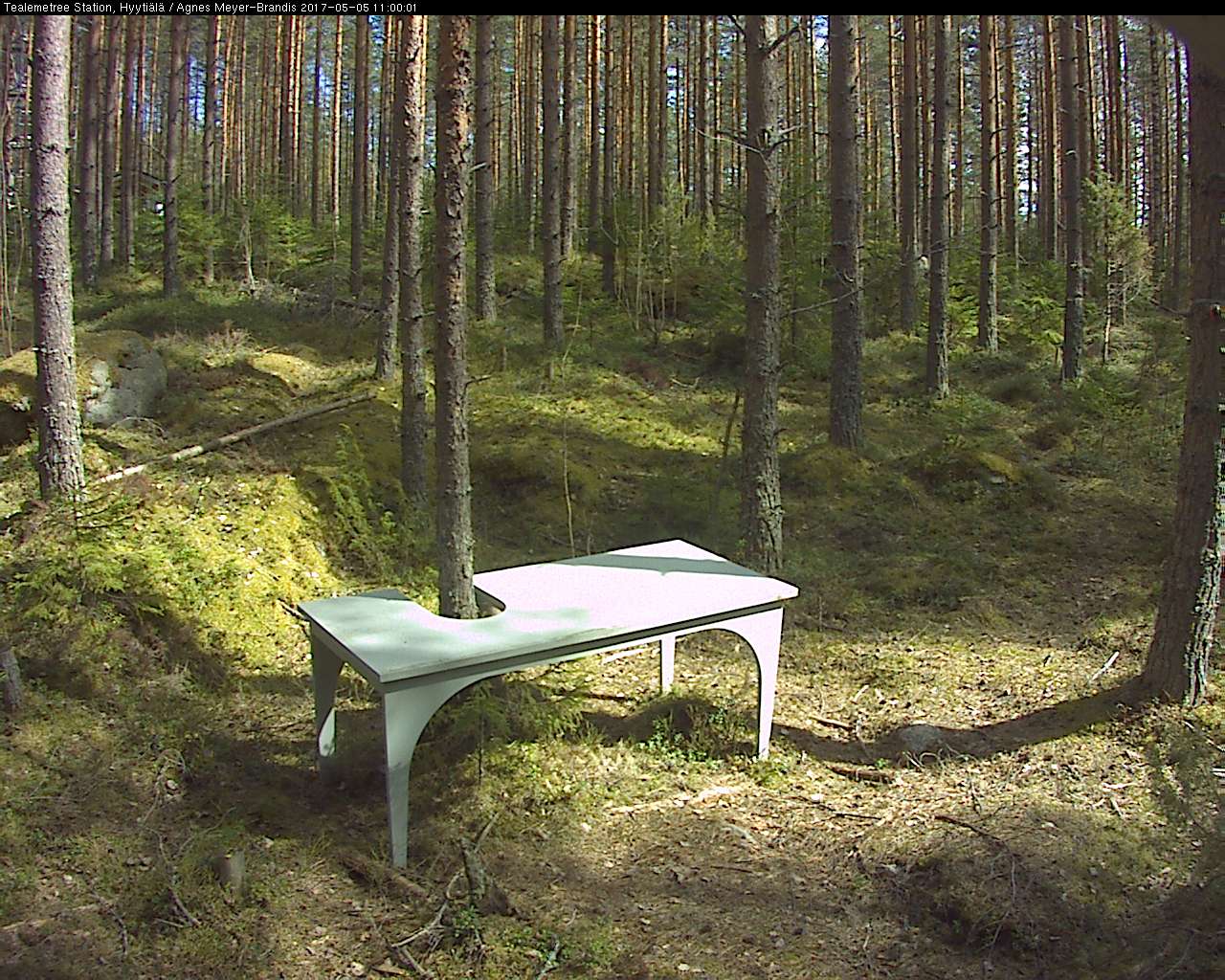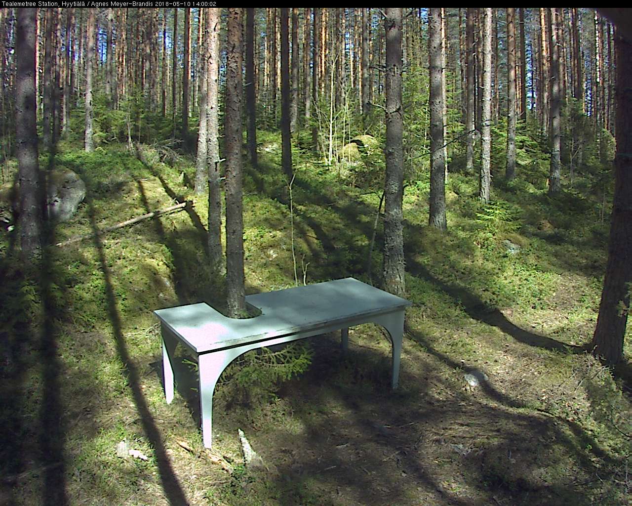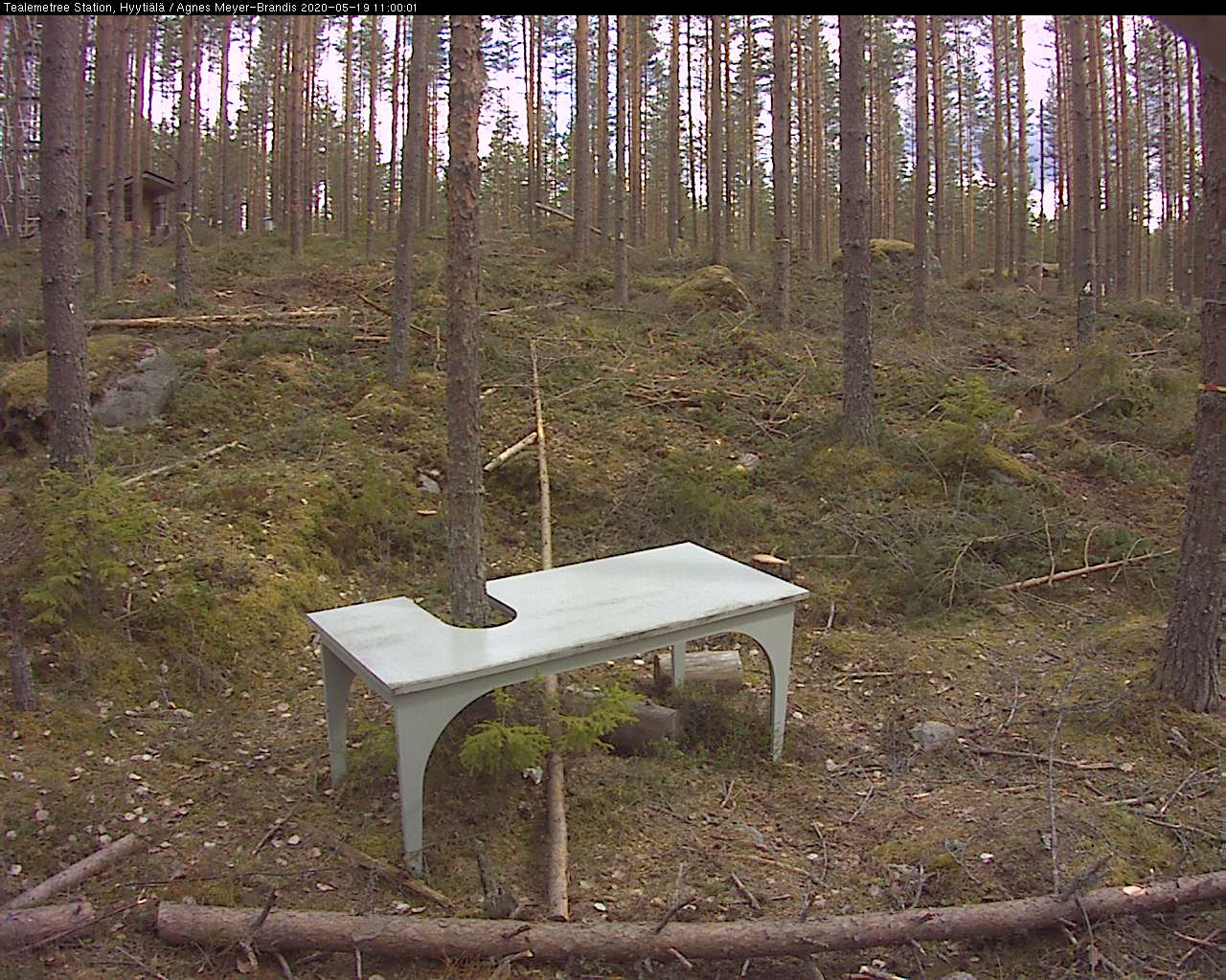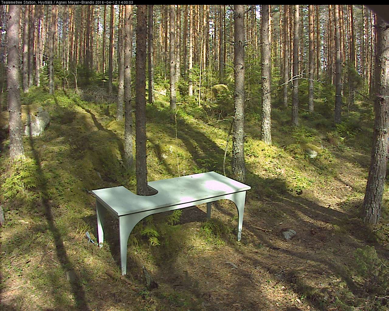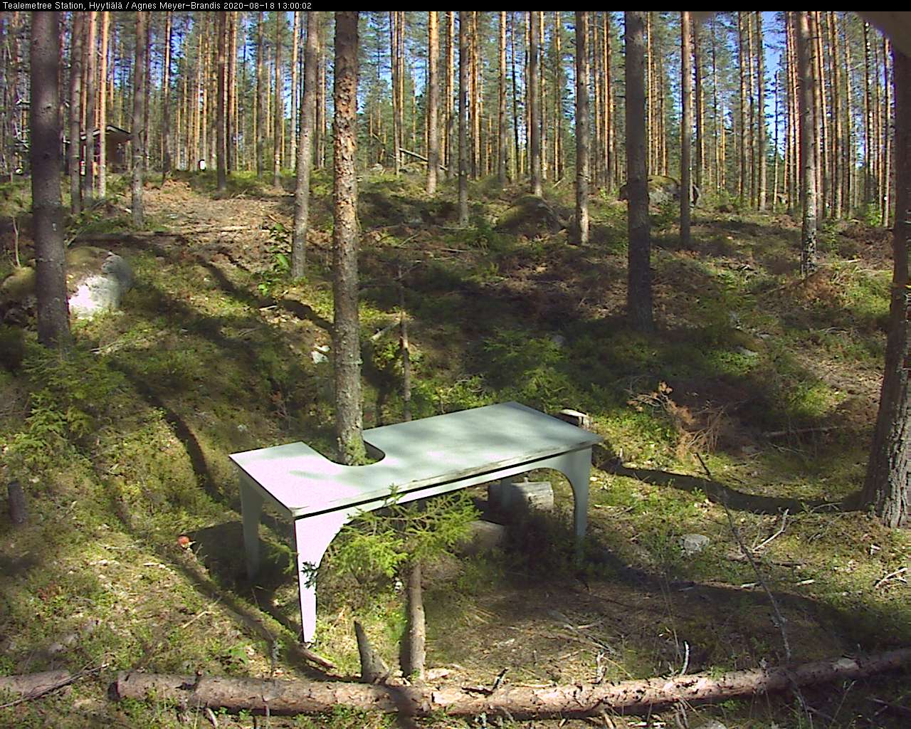 Agnes Meyer-Brandiksen työ Hyytiälässä alkoi tutustumalla aseman muihin tutkijoihin. Pystyäkseen tapaamaan ihmisiä metsässä, hän rakensi pöydän, josta muodostui kohtauspiste ja paikka teehetkille Agneksen ja puun kanssa.