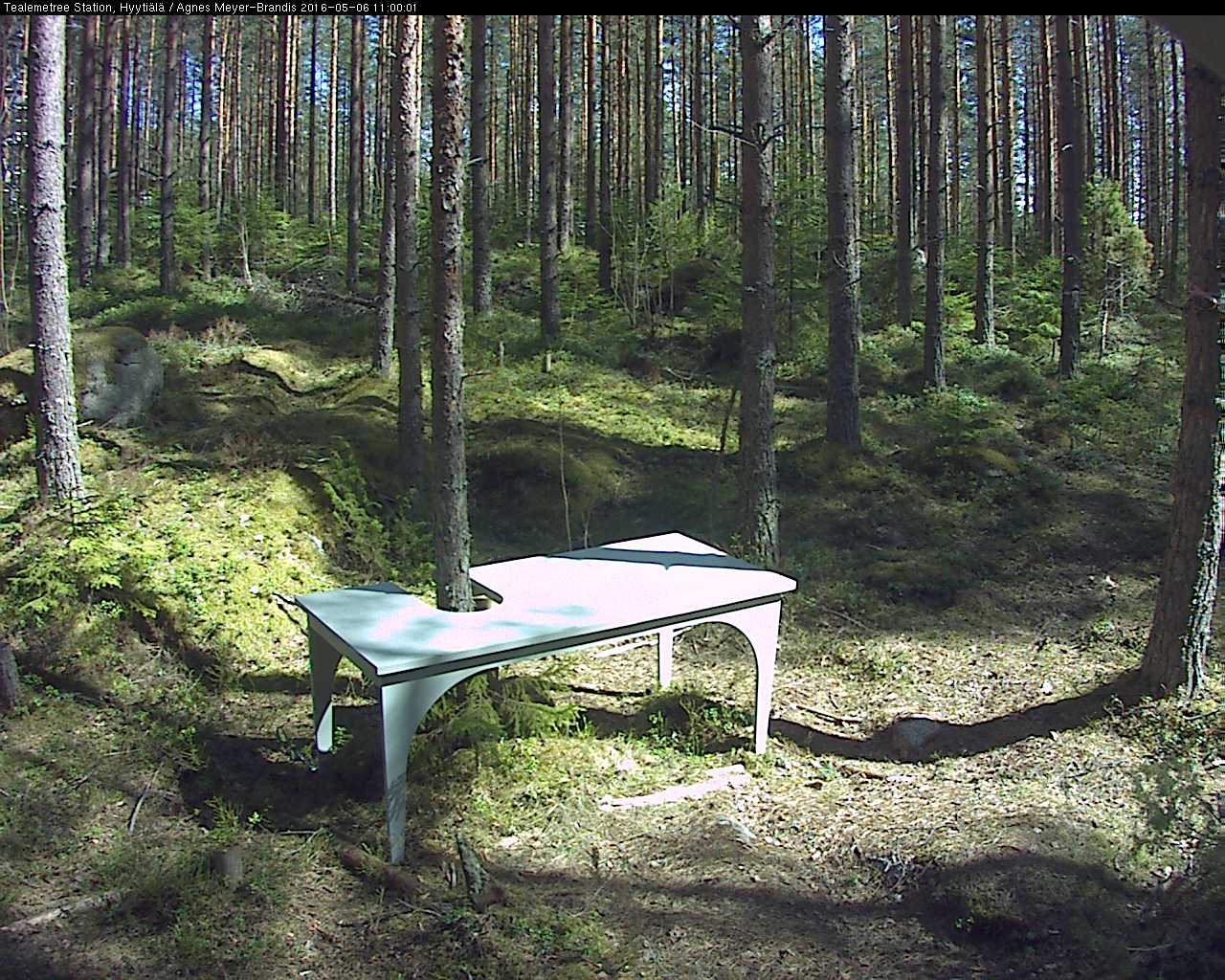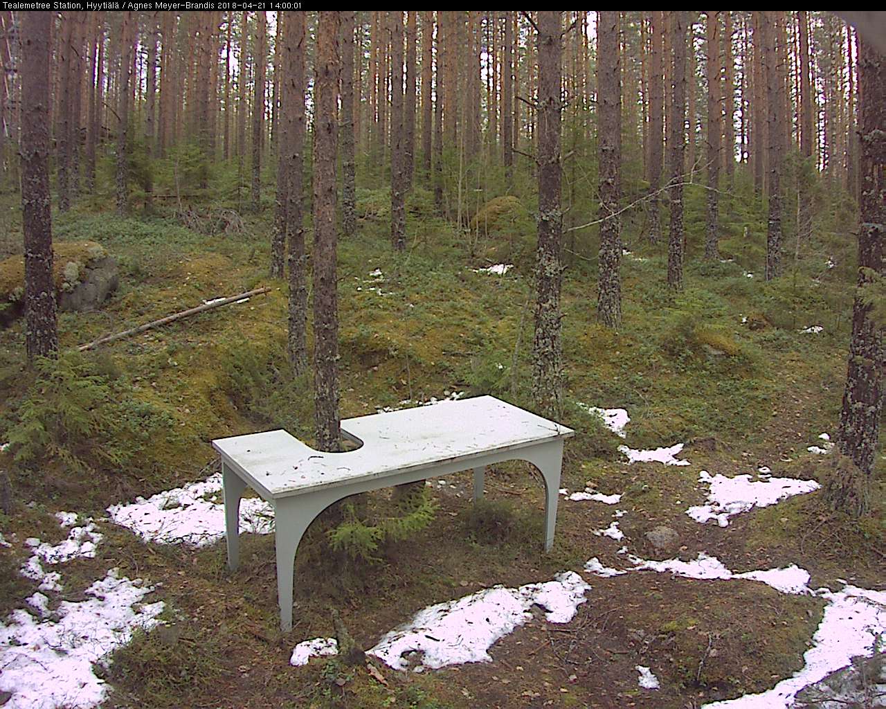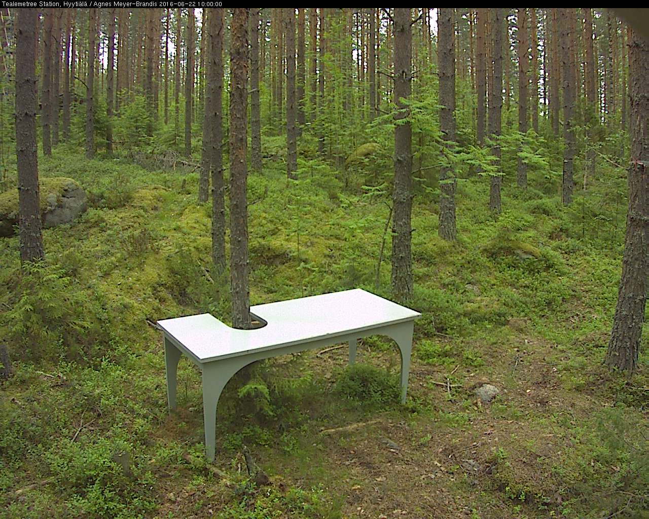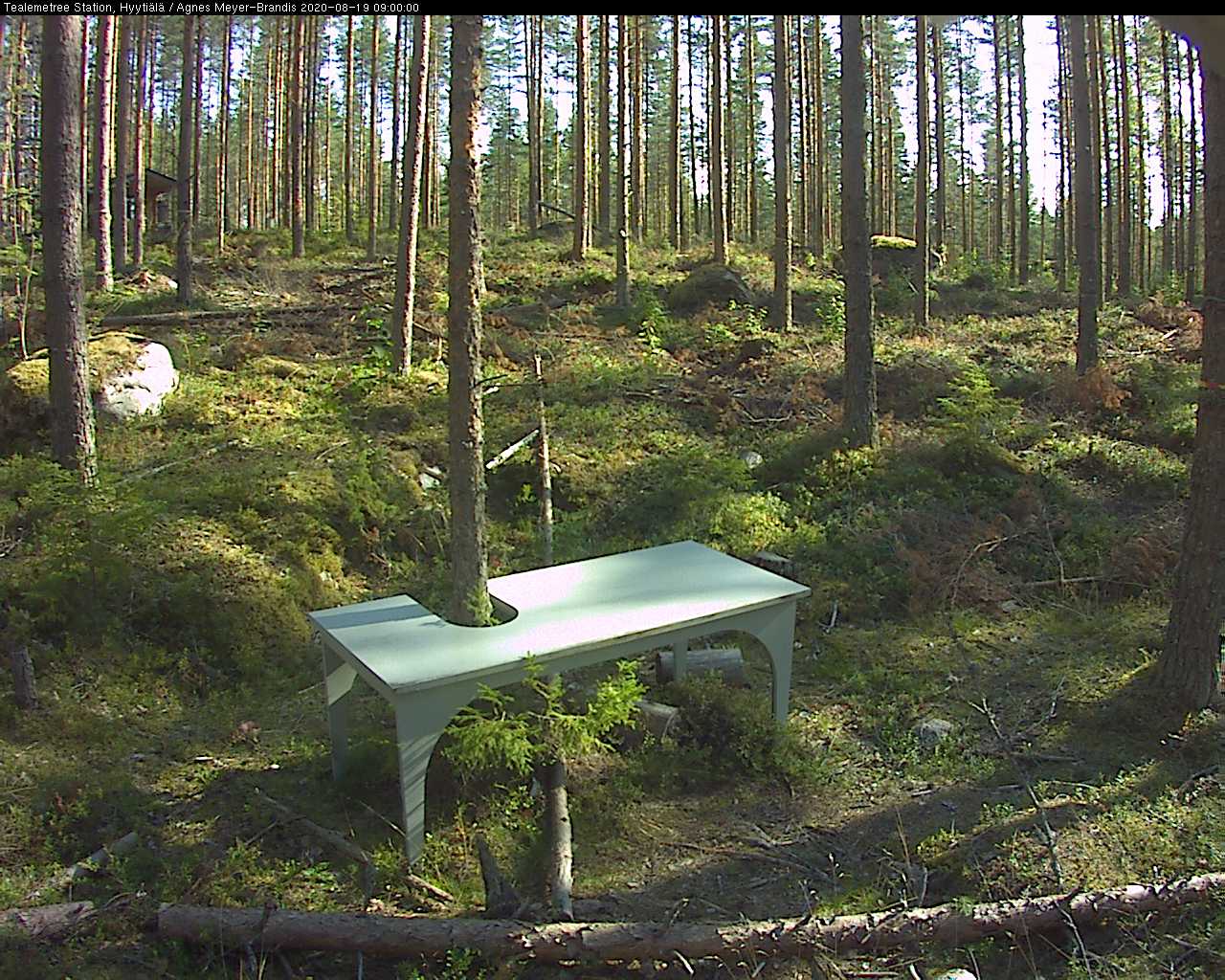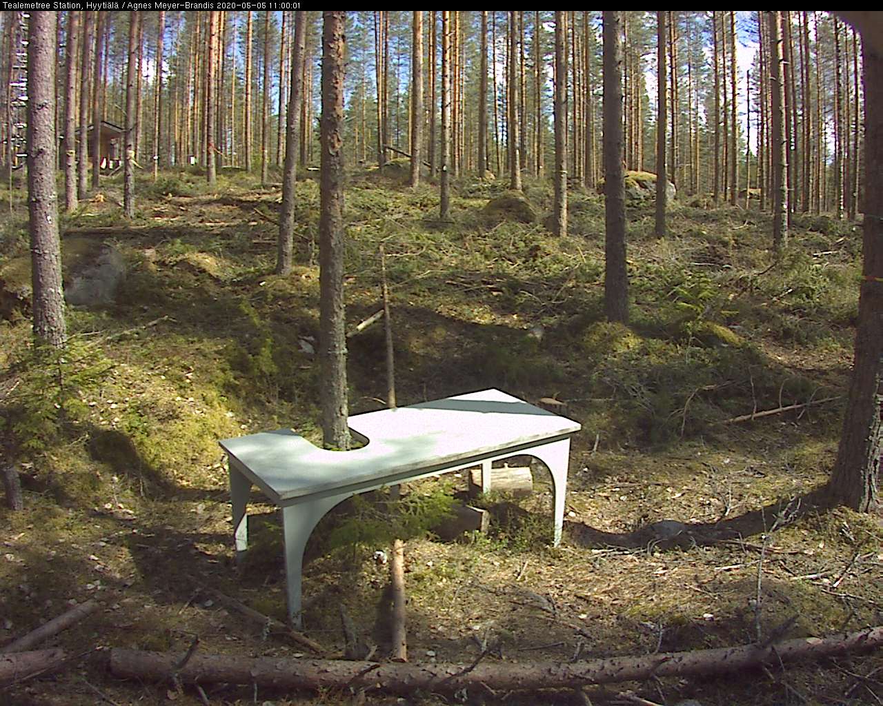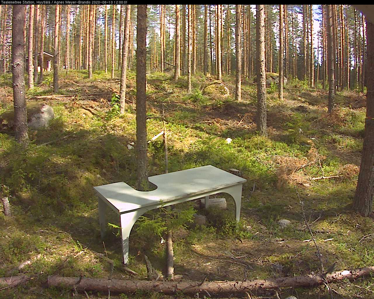 Agnes Meyer-Brandiksen työ Hyytiälässä alkoi tutustumalla aseman muihin tutkijoihin. Pystyäkseen tapaamaan ihmisiä metsässä, hän rakensi pöydän, josta muodostui kohtauspiste ja paikka teehetkille Agneksen ja puun kanssa.