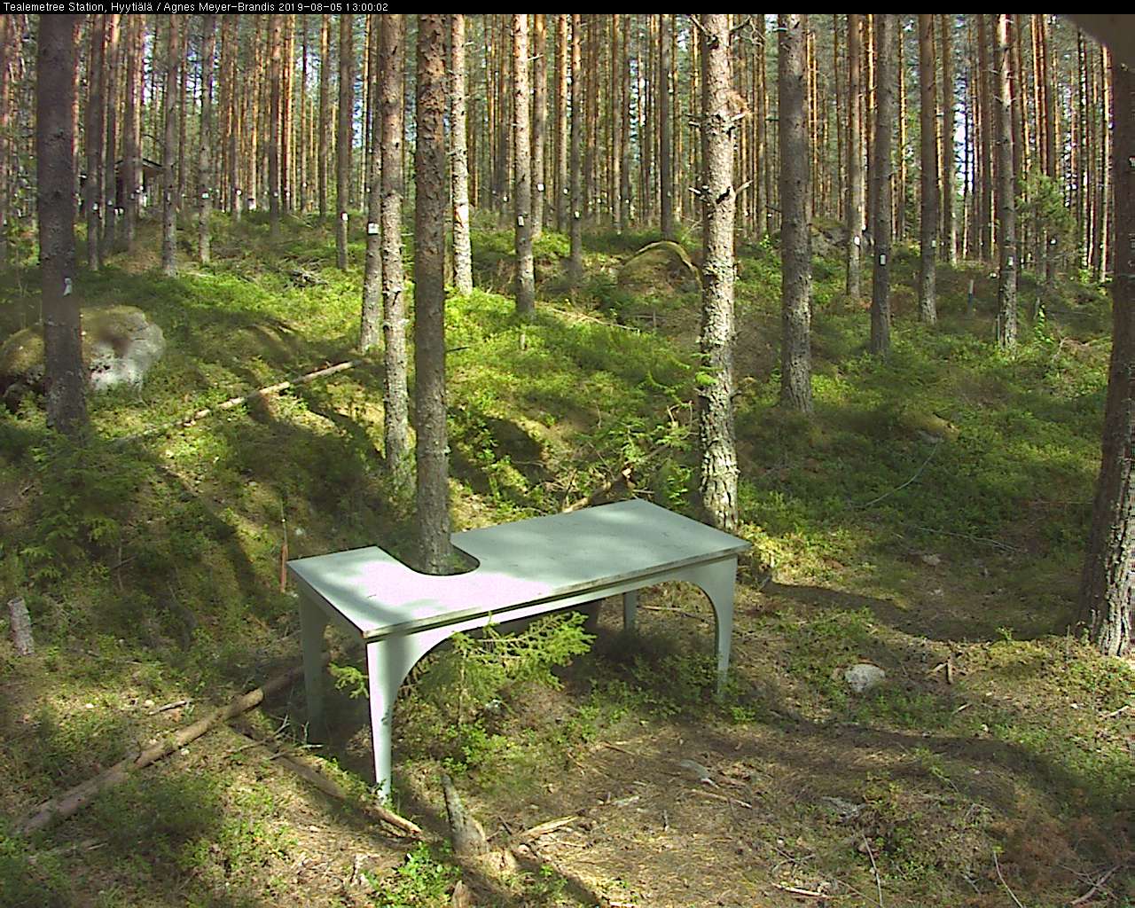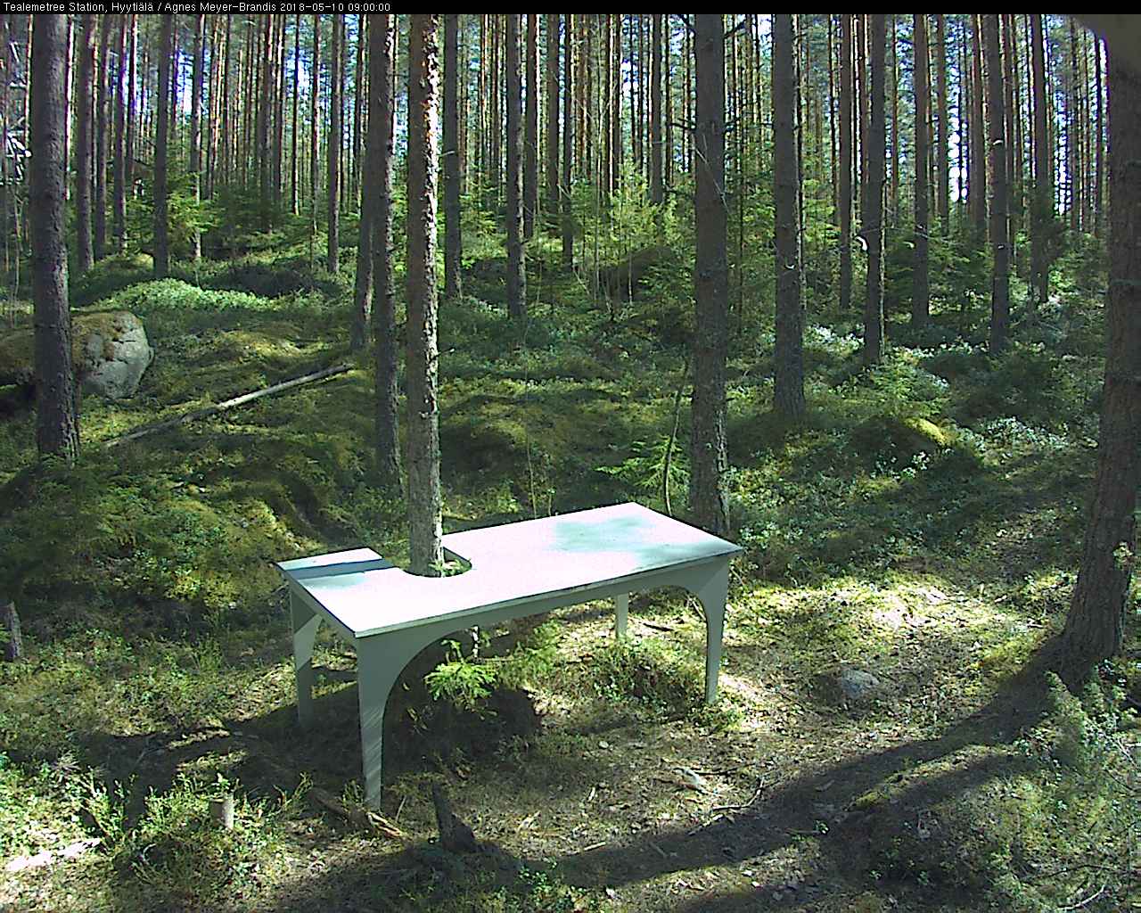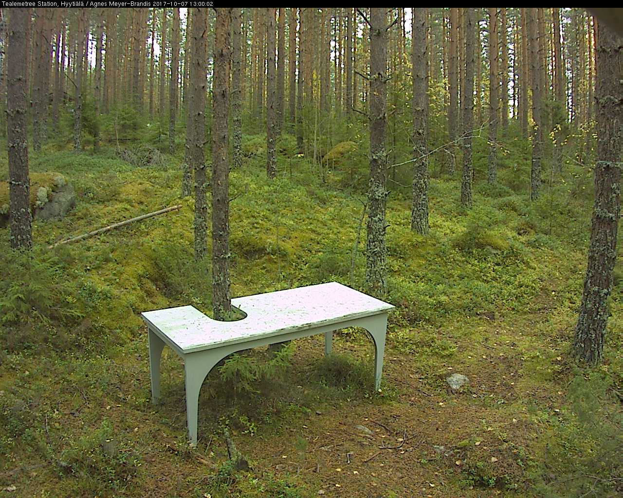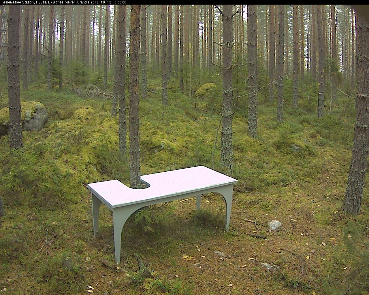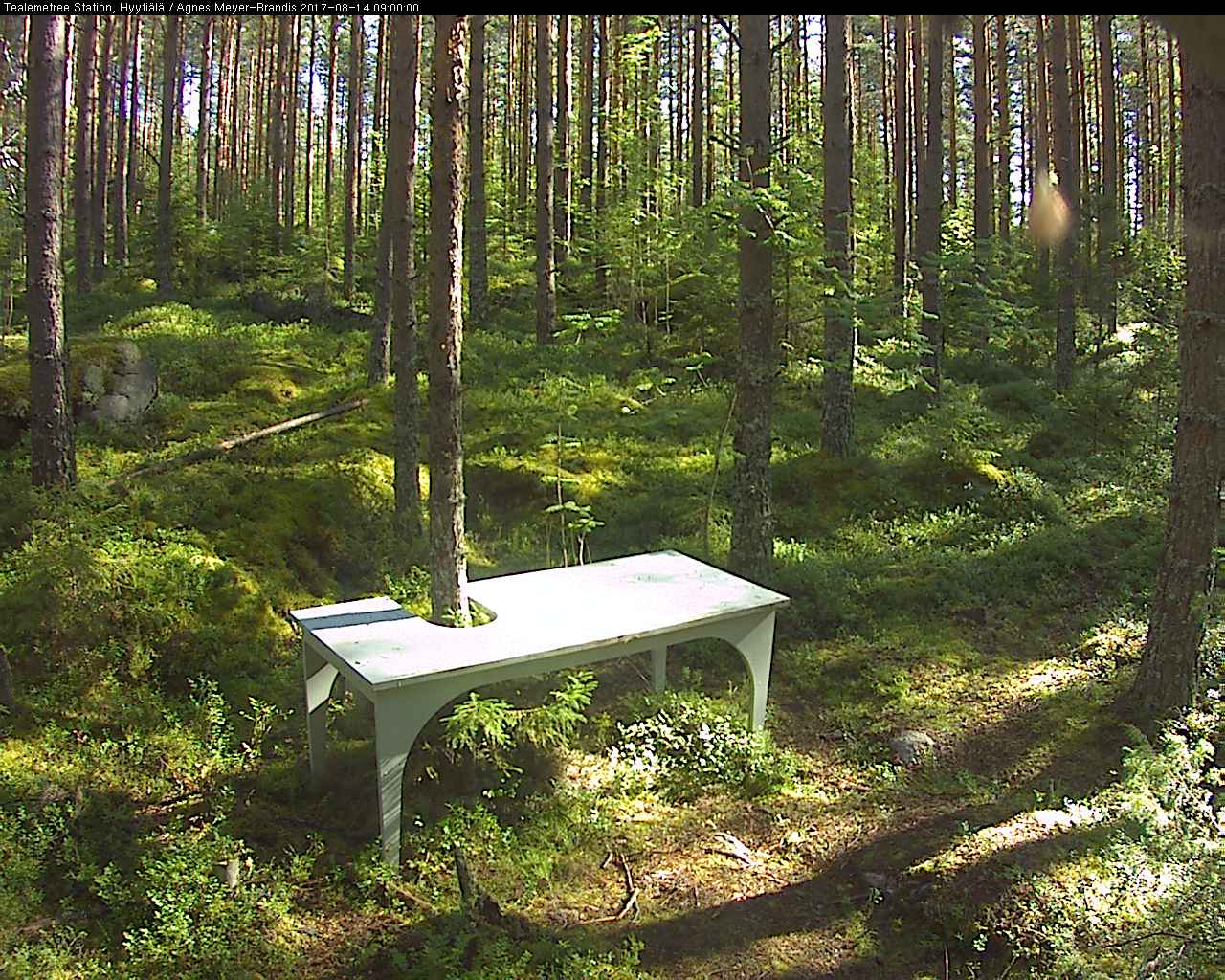 Agnes Meyer-Brandiksen työ Hyytiälässä alkoi tutustumalla aseman muihin tutkijoihin. Pystyäkseen tapaamaan ihmisiä metsässä, hän rakensi pöydän, josta muodostui kohtauspiste ja paikka teehetkille Agneksen ja puun kanssa.