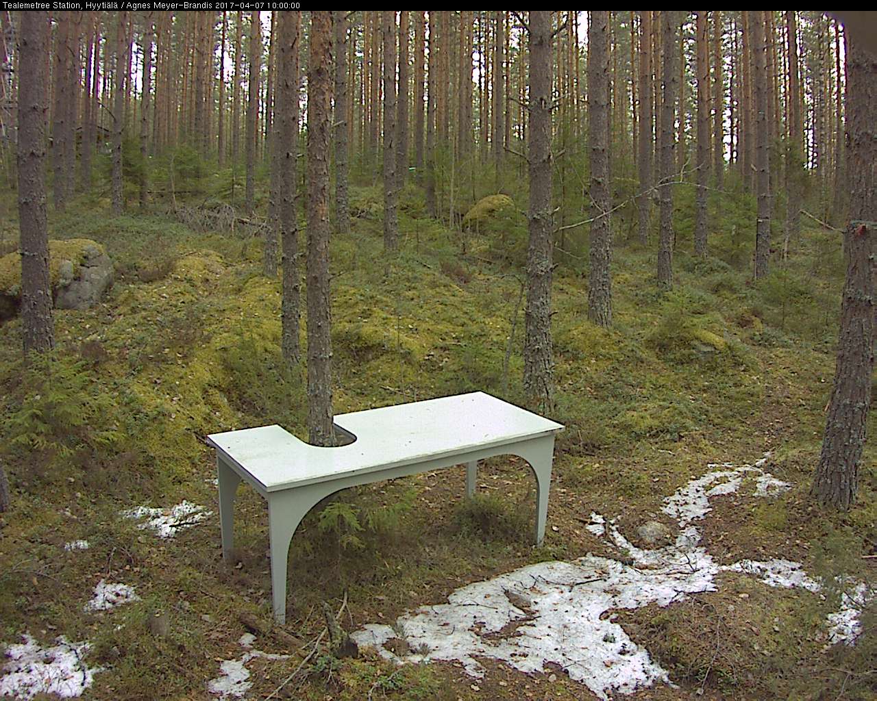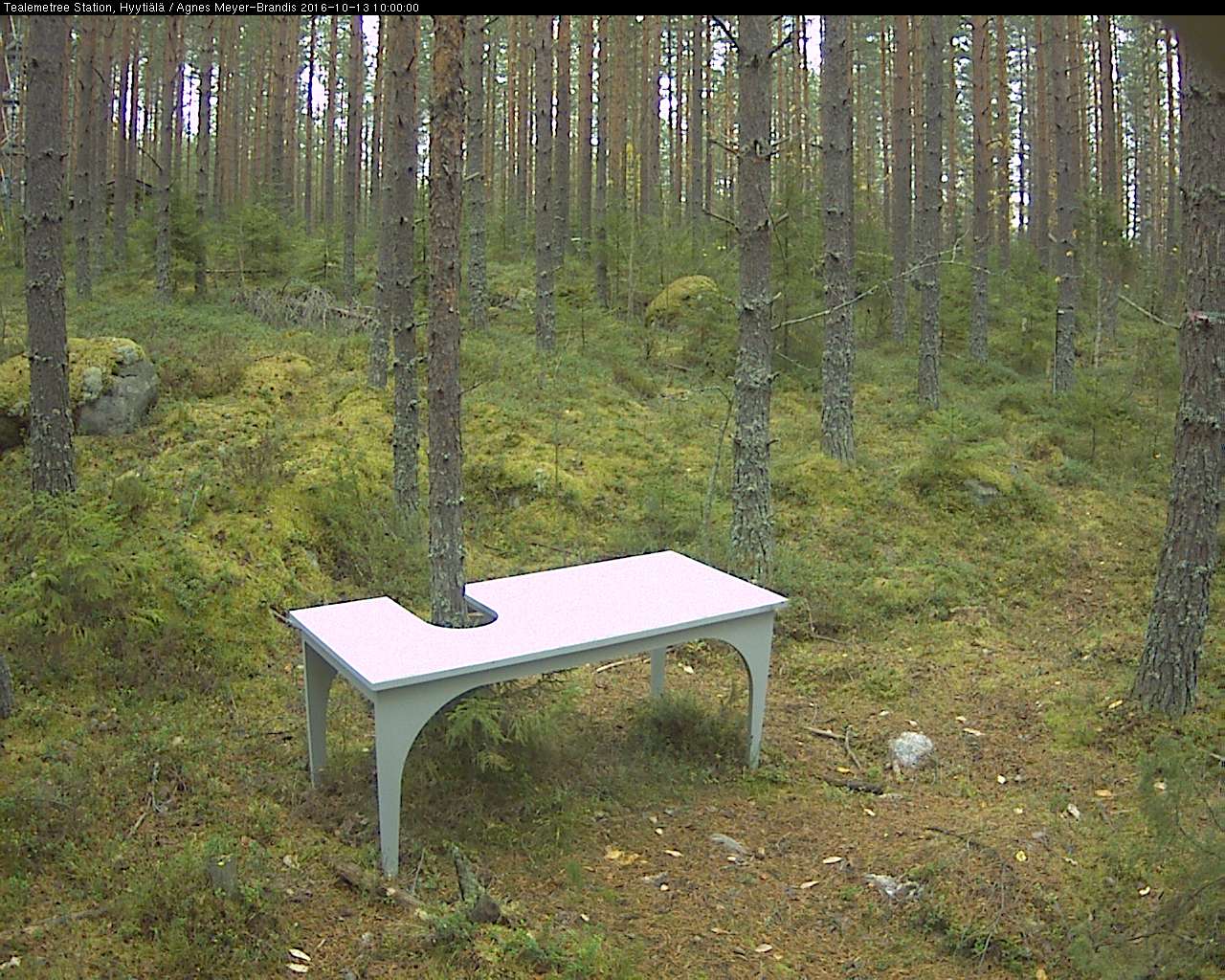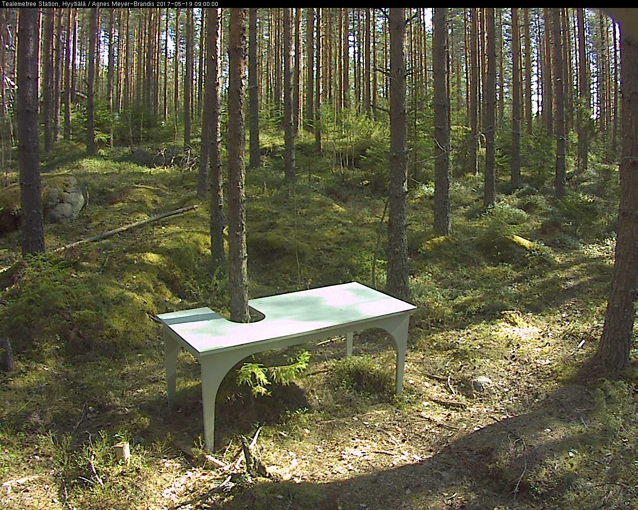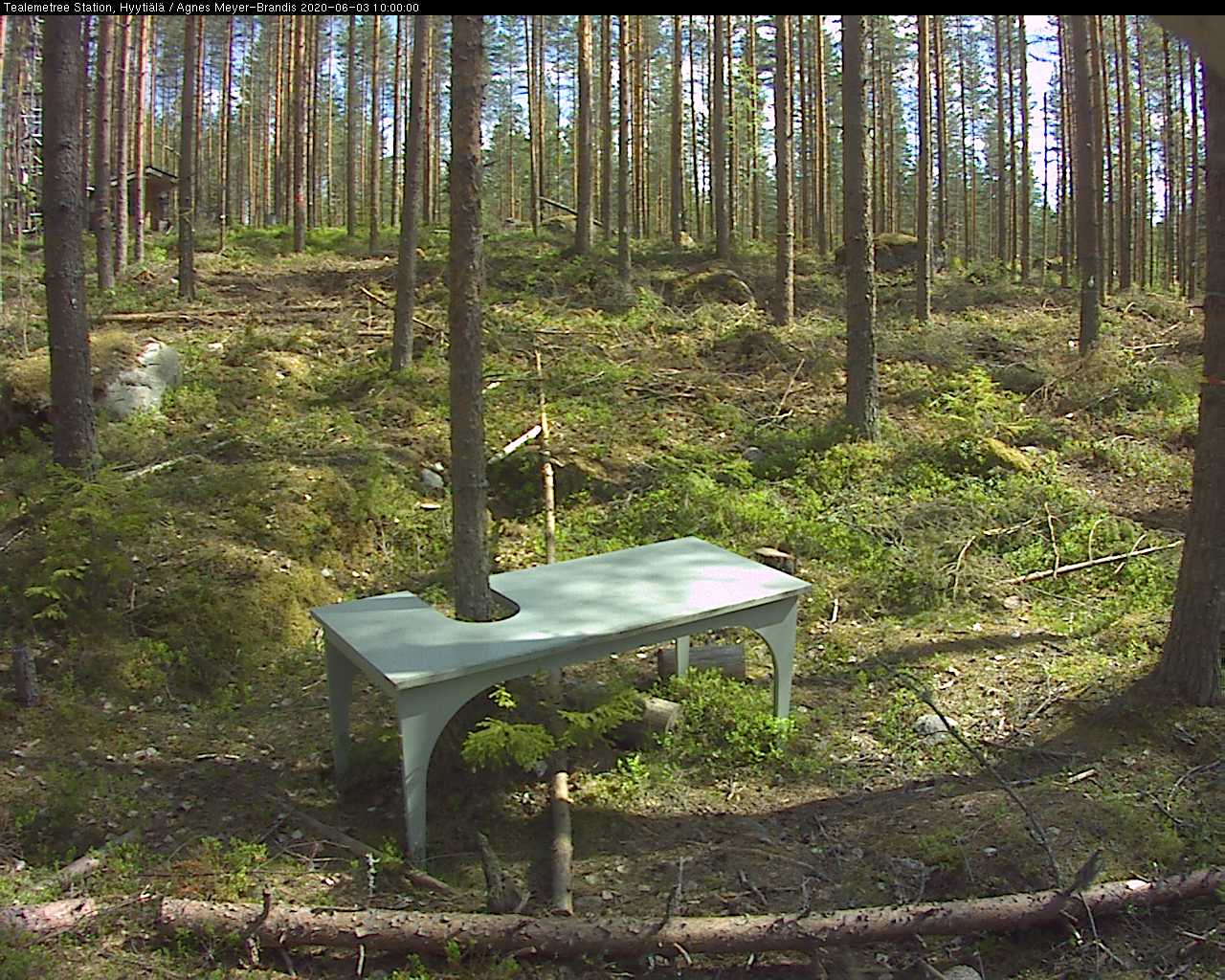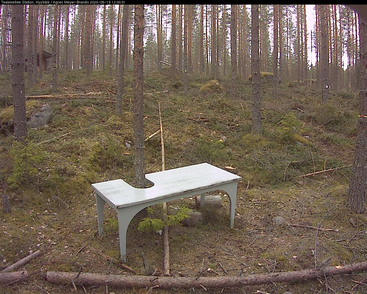 Agnes Meyer-Brandiksen työ Hyytiälässä alkoi tutustumalla aseman muihin tutkijoihin. Pystyäkseen tapaamaan ihmisiä metsässä, hän rakensi pöydän, josta muodostui kohtauspiste ja paikka teehetkille Agneksen ja puun kanssa.