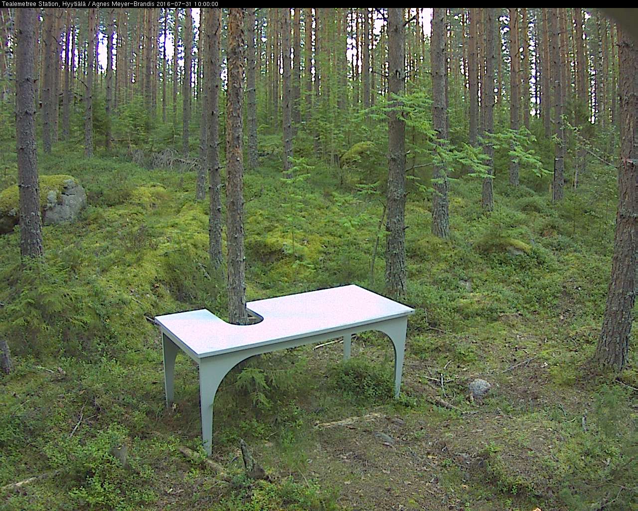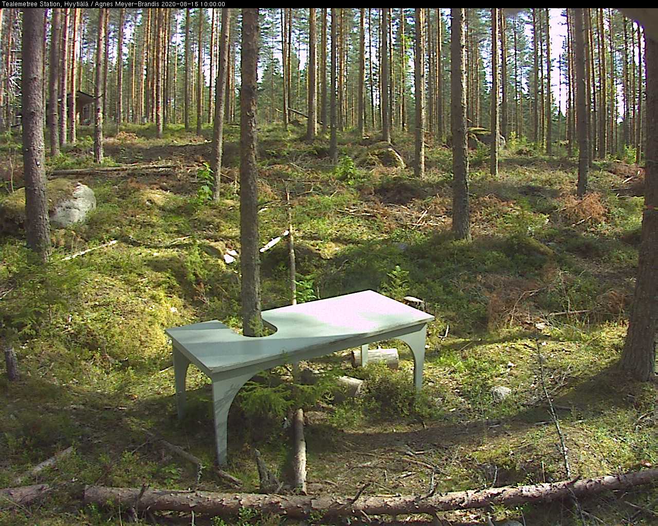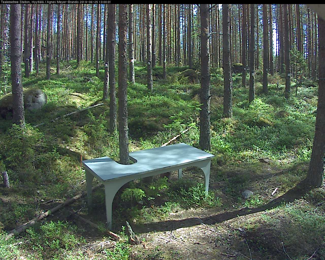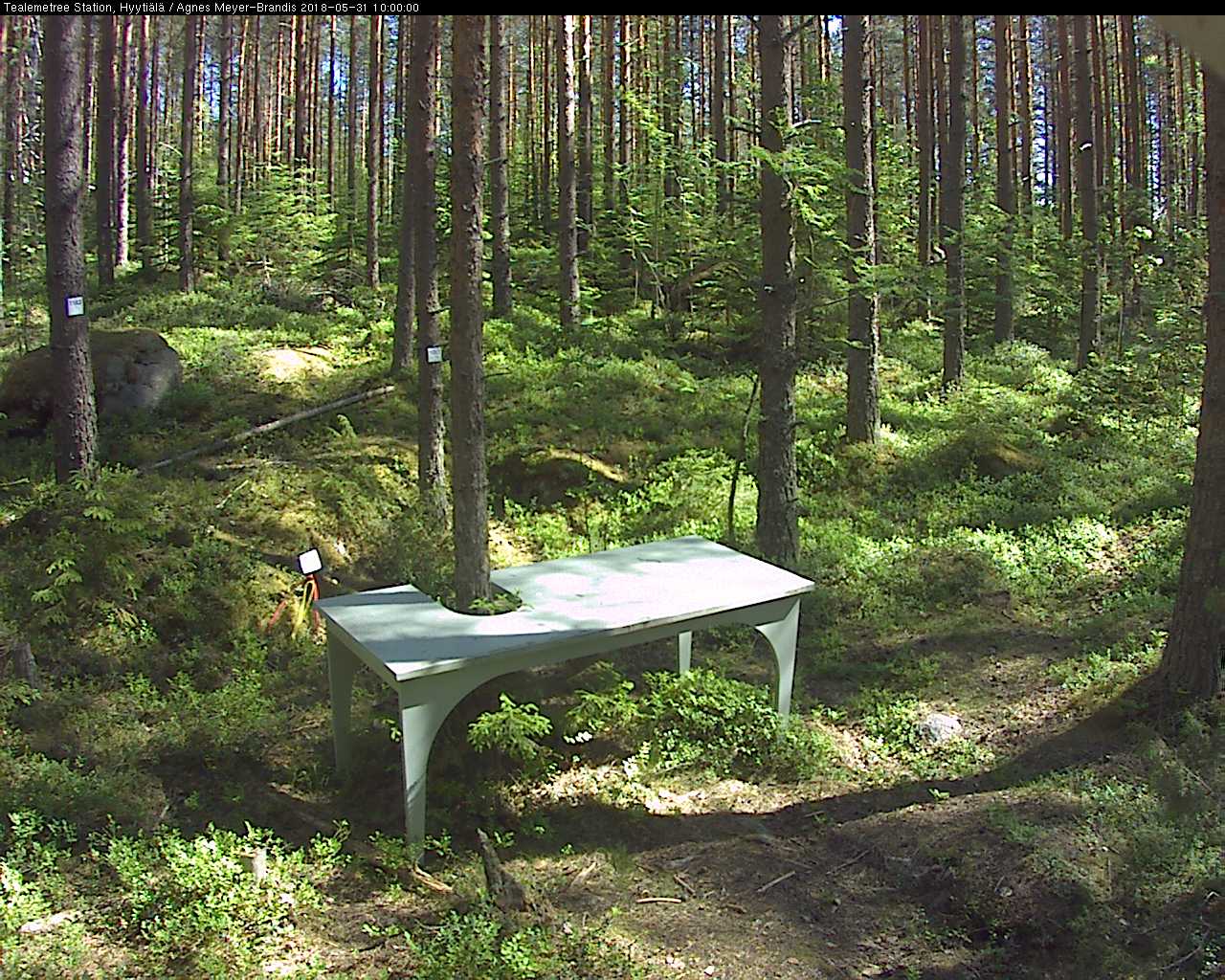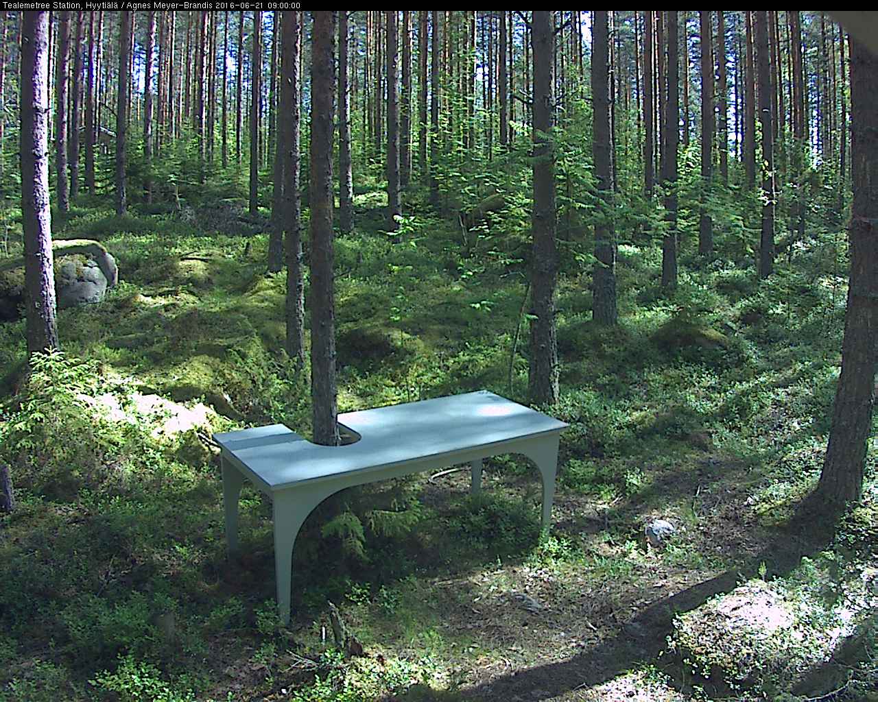 Agnes Meyer-Brandiksen työ Hyytiälässä alkoi tutustumalla aseman muihin tutkijoihin. Pystyäkseen tapaamaan ihmisiä metsässä, hän rakensi pöydän, josta muodostui kohtauspiste ja paikka teehetkille Agneksen ja puun kanssa.