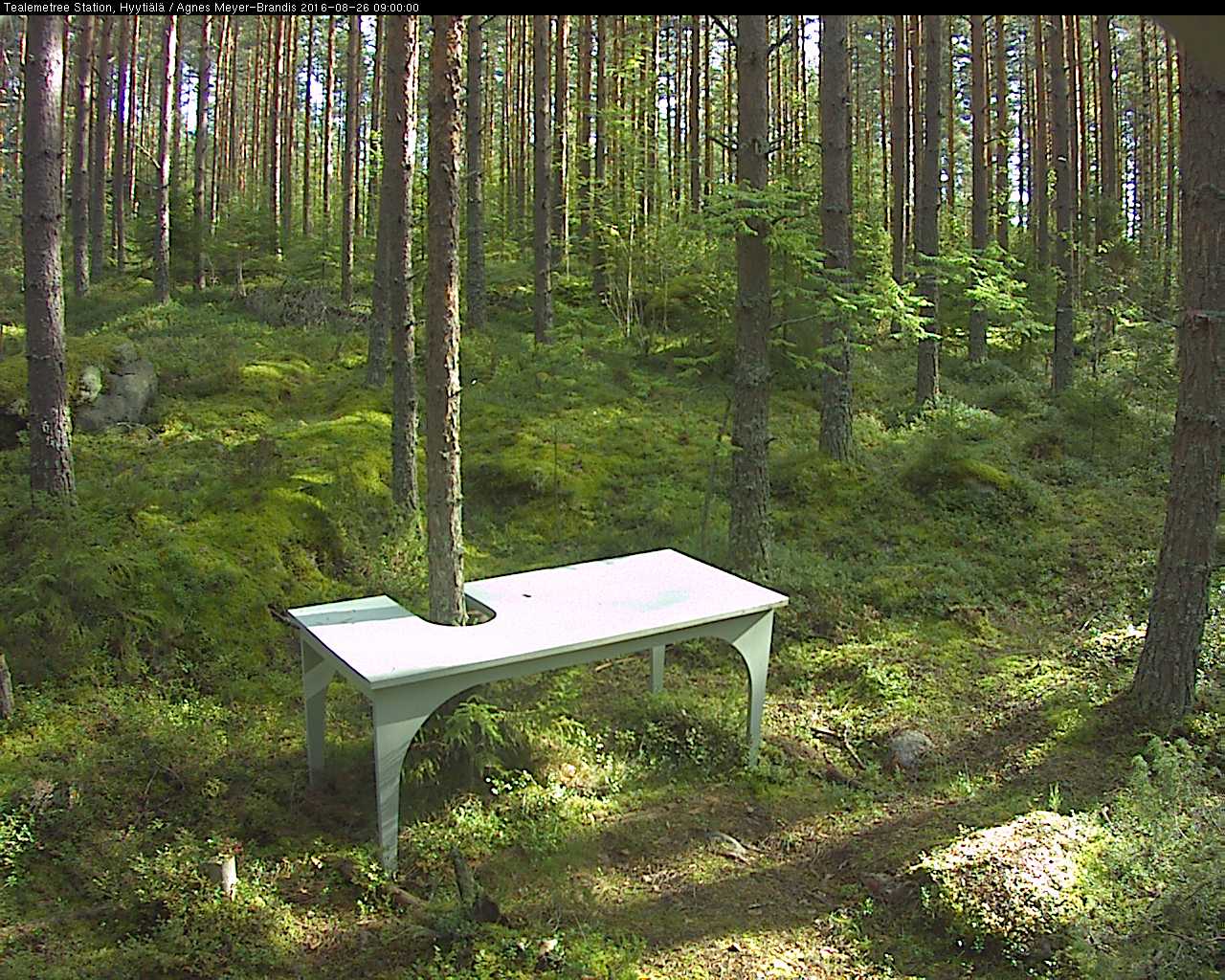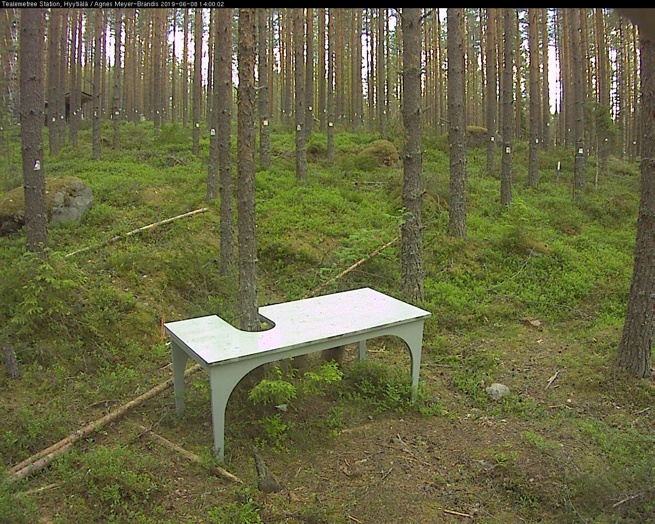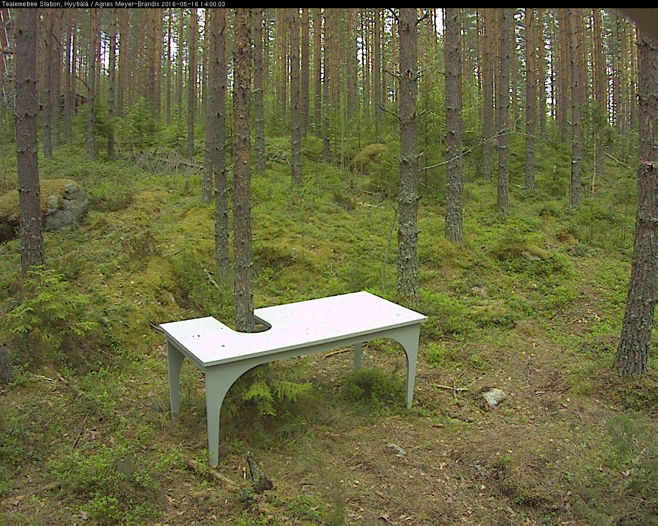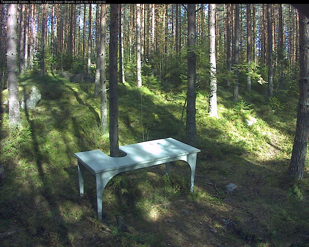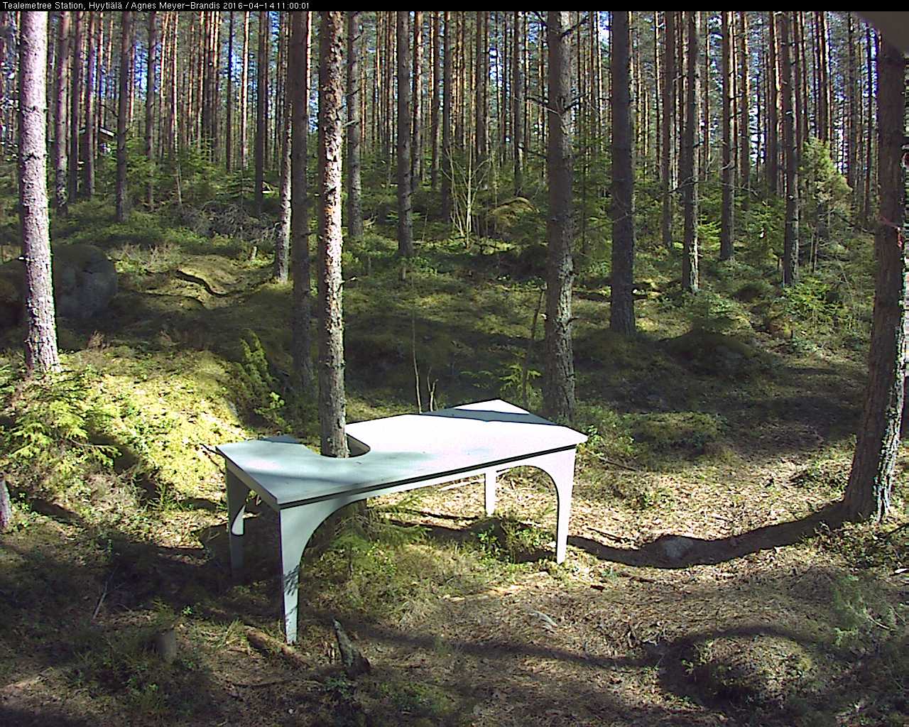Agnes Meyer-Brandiksen työ Hyytiälässä alkoi tutustumalla aseman muihin tutkijoihin. Pystyäkseen tapaamaan ihmisiä metsässä, hän rakensi pöydän, josta muodostui kohtauspiste ja paikka teehetkille Agneksen ja puun kanssa.