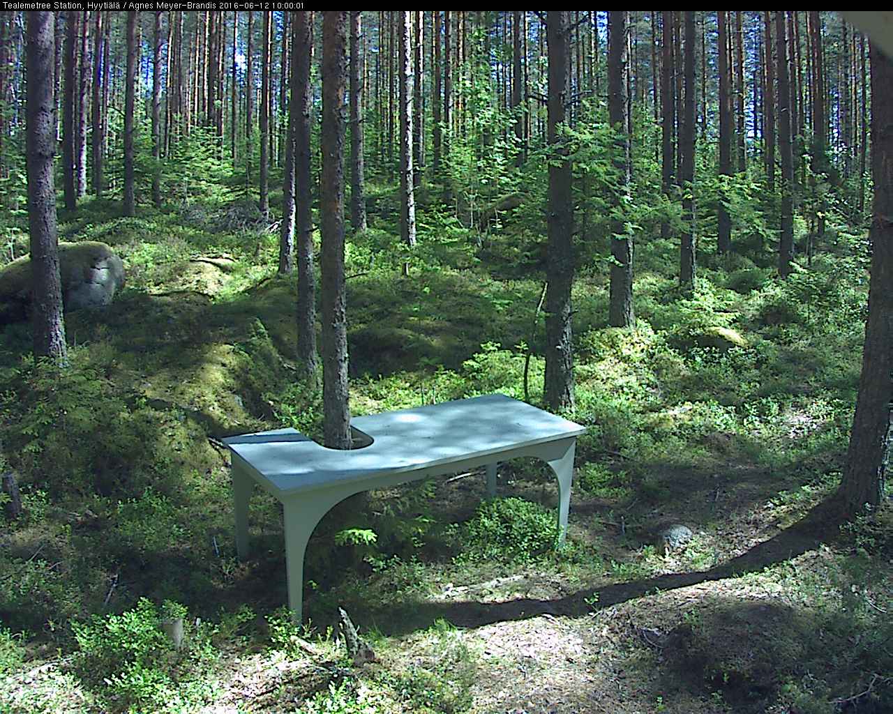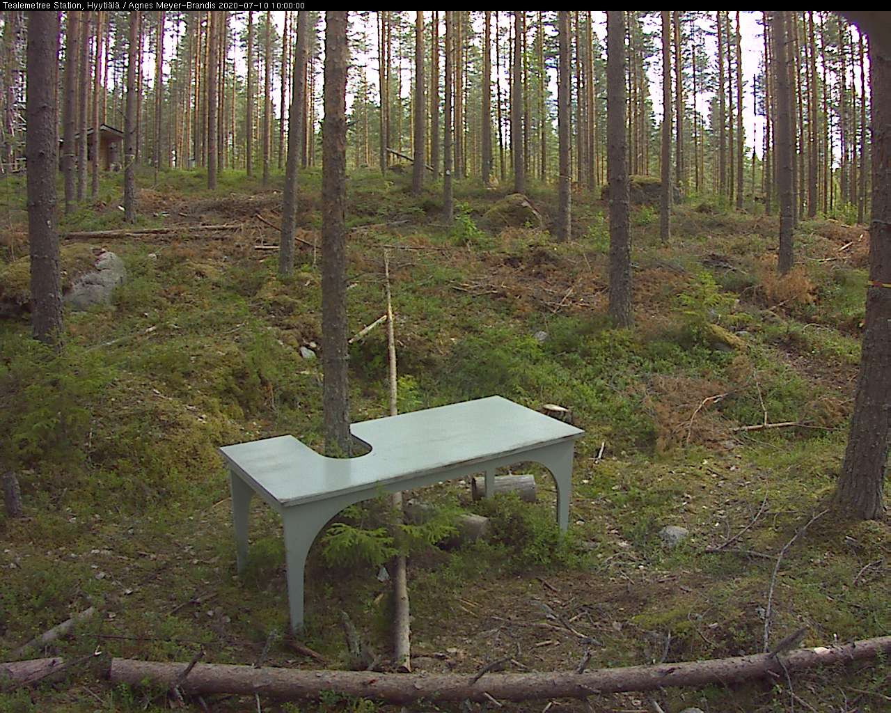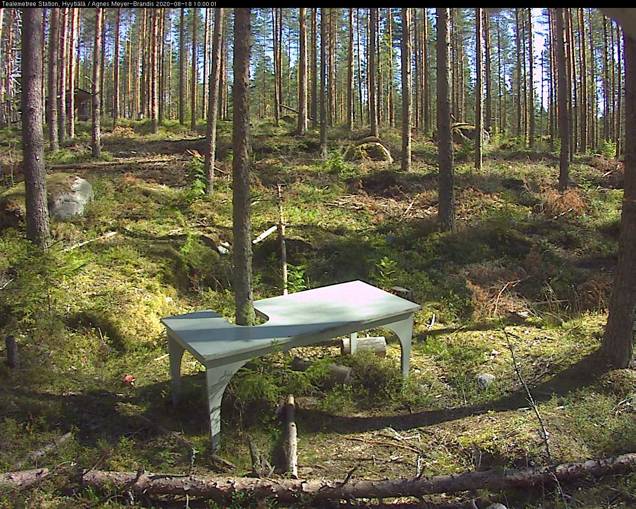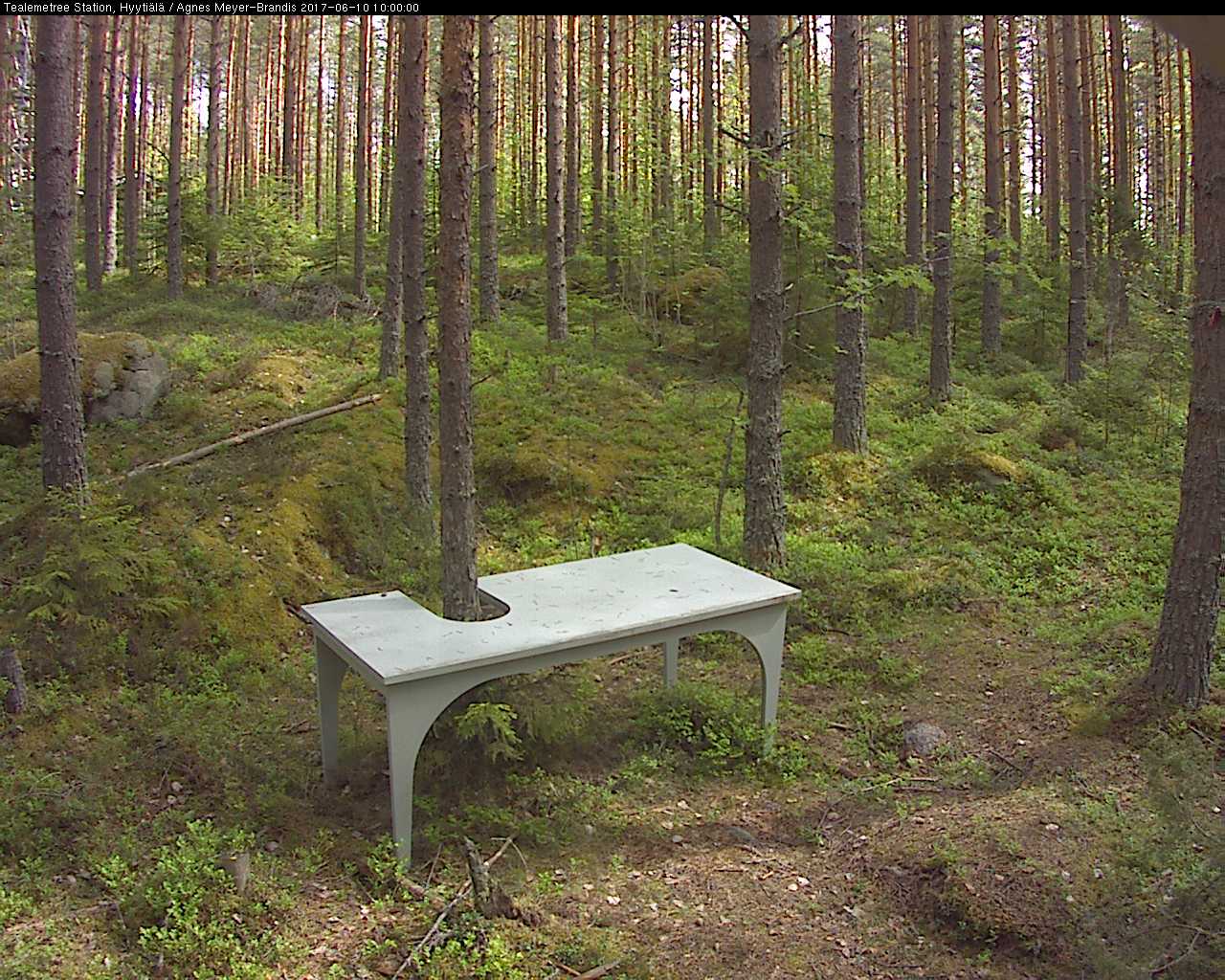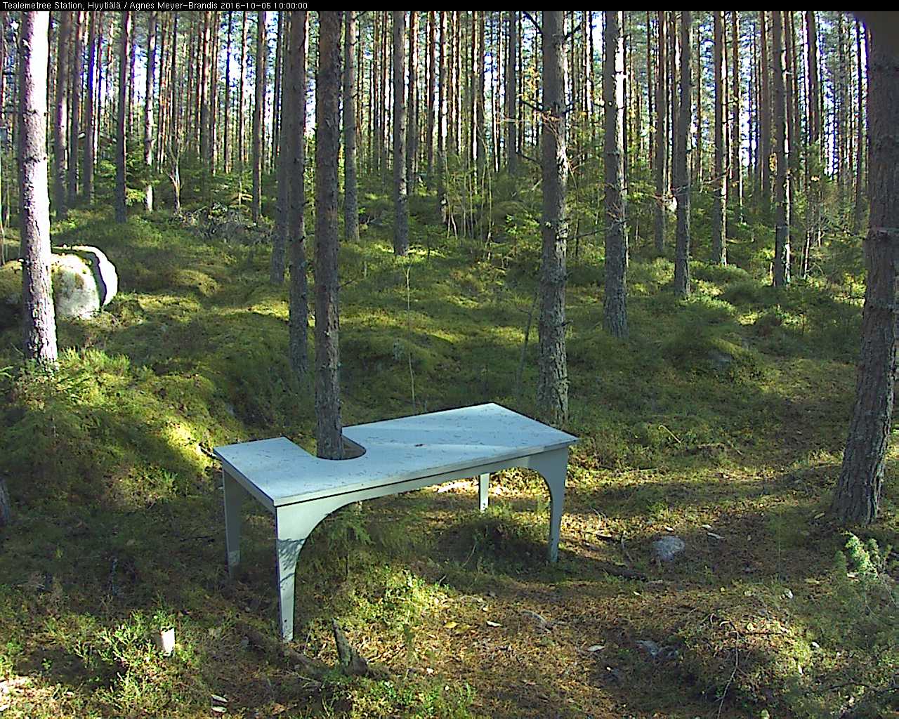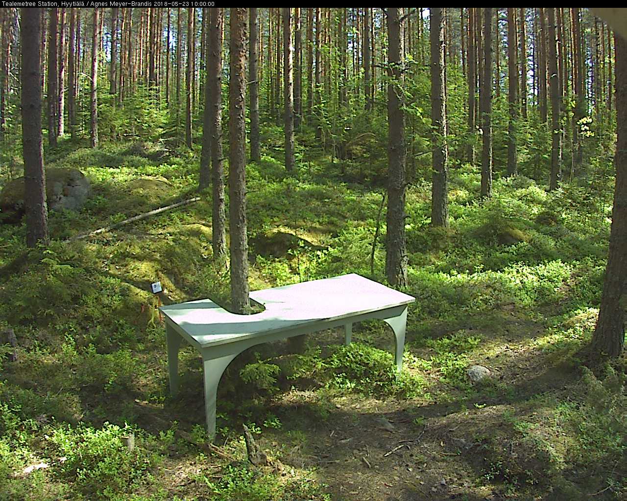 Agnes Meyer-Brandiksen työ Hyytiälässä alkoi tutustumalla aseman muihin tutkijoihin. Pystyäkseen tapaamaan ihmisiä metsässä, hän rakensi pöydän, josta muodostui kohtauspiste ja paikka teehetkille Agneksen ja puun kanssa.