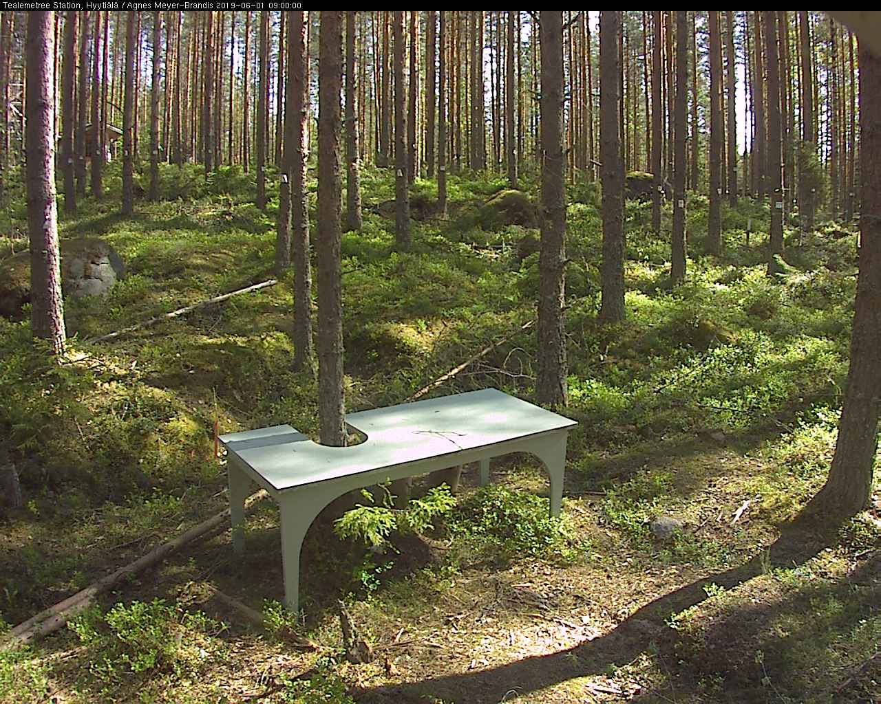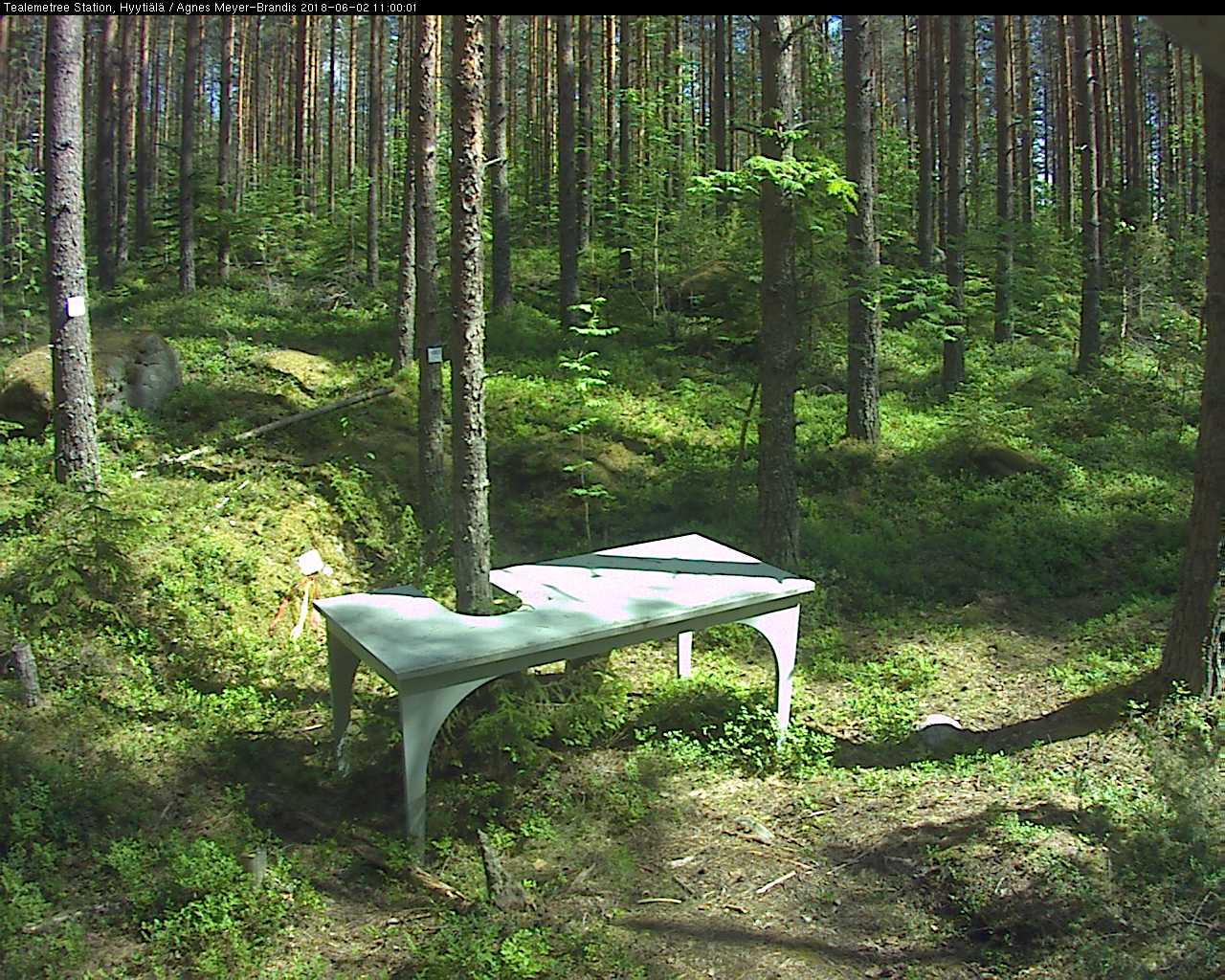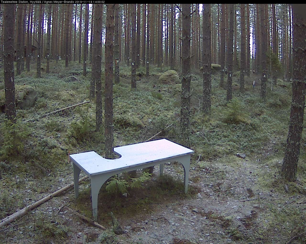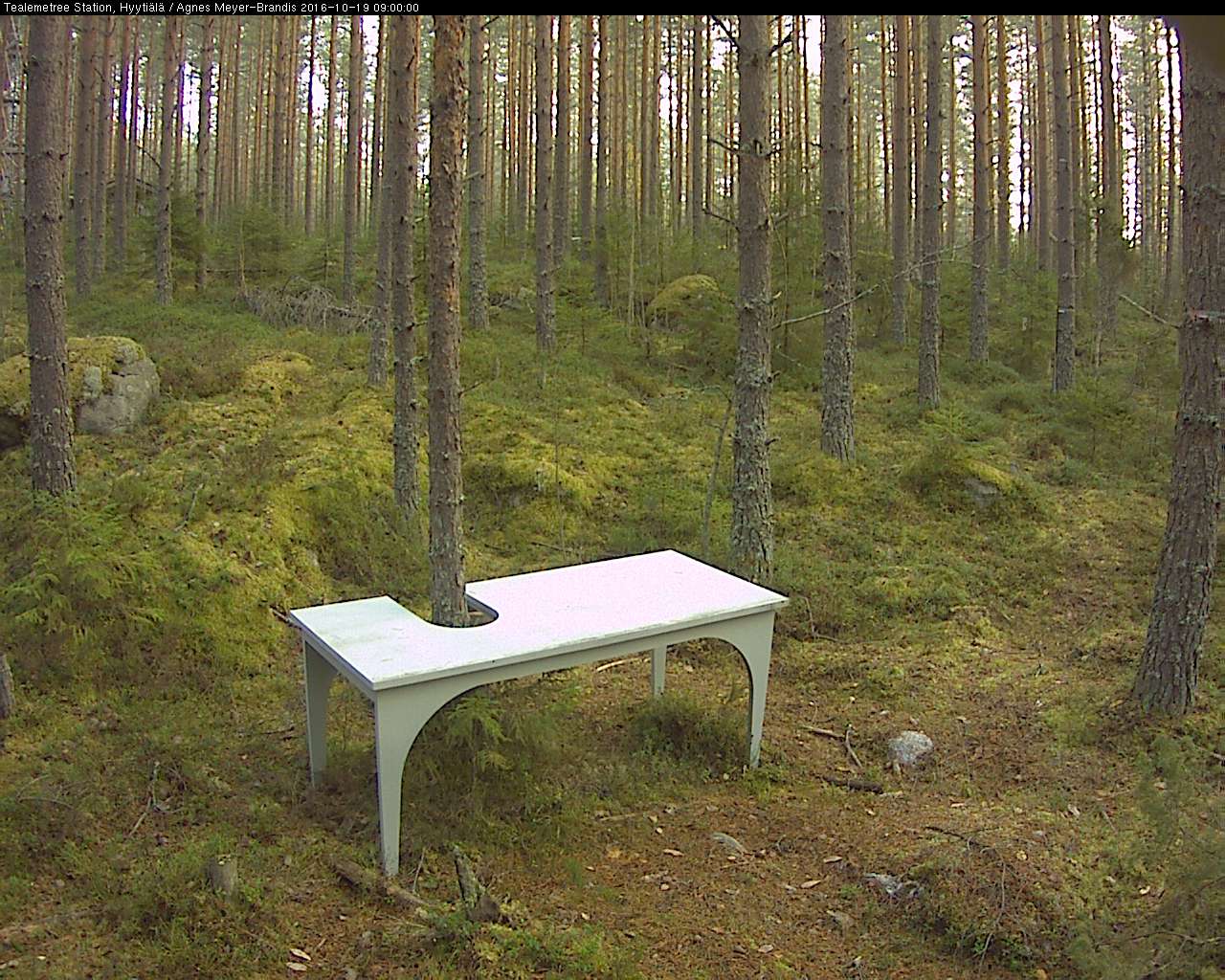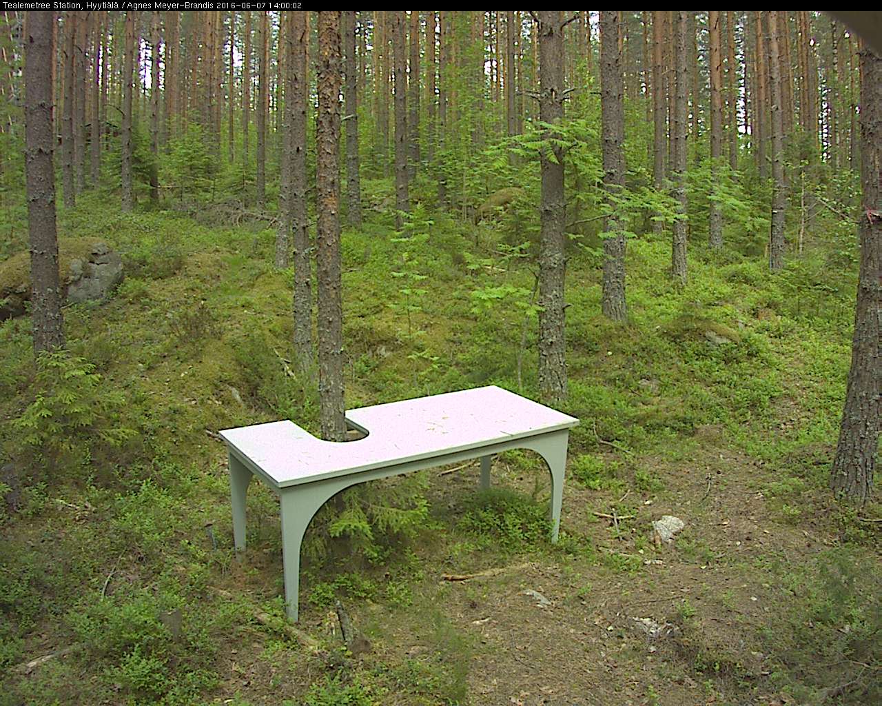 Agnes Meyer-Brandiksen työ Hyytiälässä alkoi tutustumalla aseman muihin tutkijoihin. Pystyäkseen tapaamaan ihmisiä metsässä, hän rakensi pöydän, josta muodostui kohtauspiste ja paikka teehetkille Agneksen ja puun kanssa.