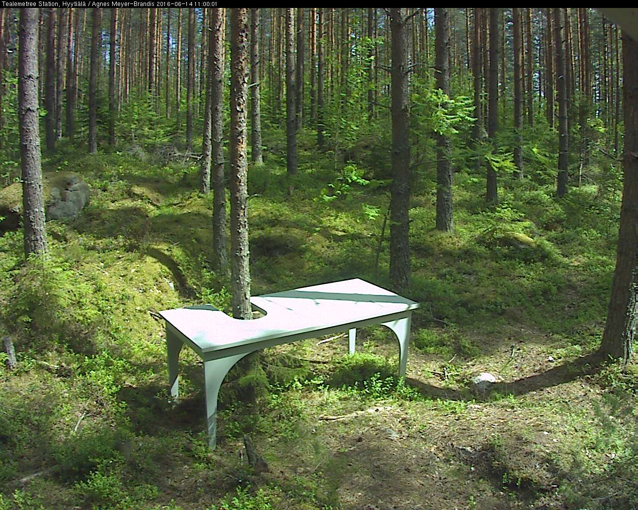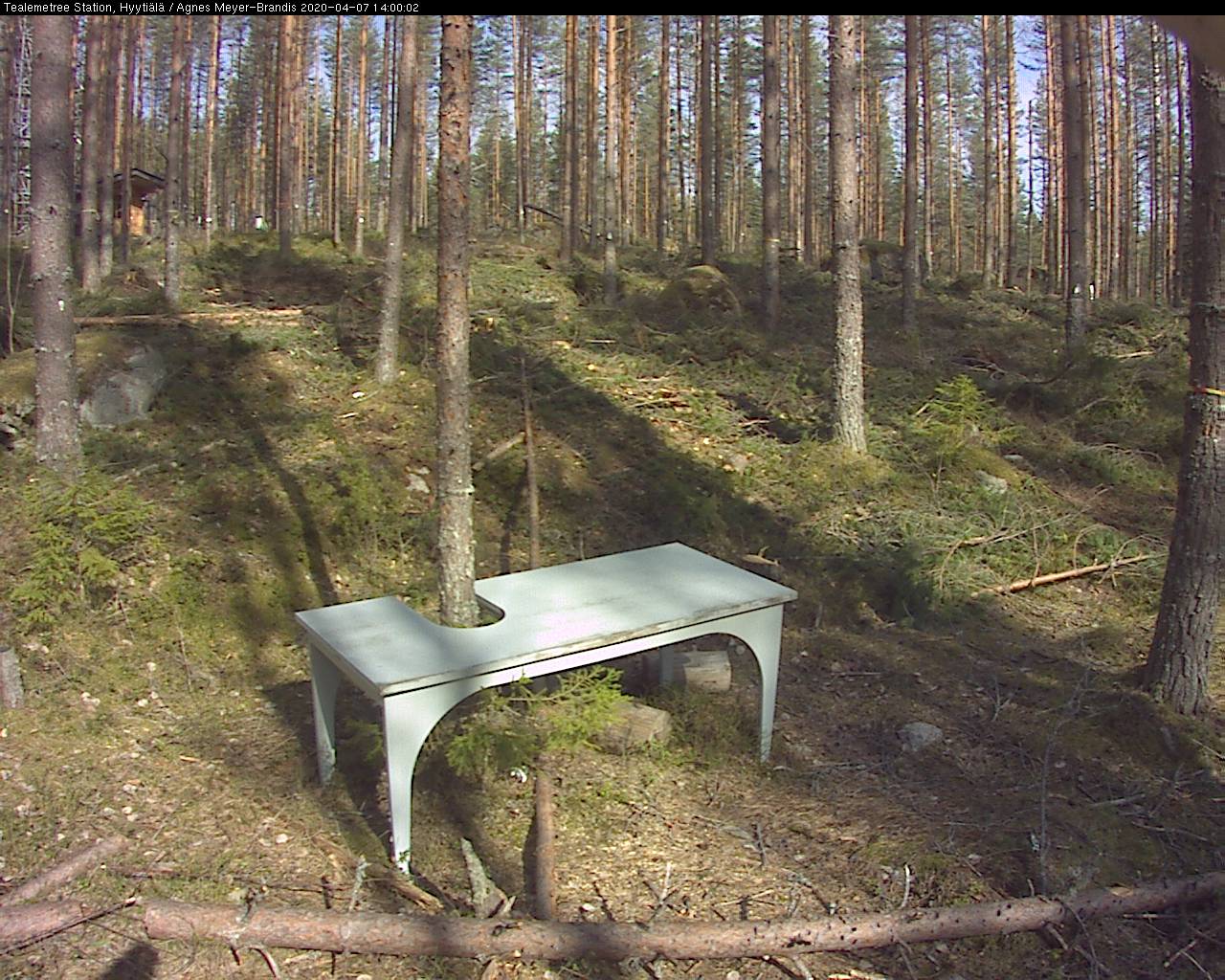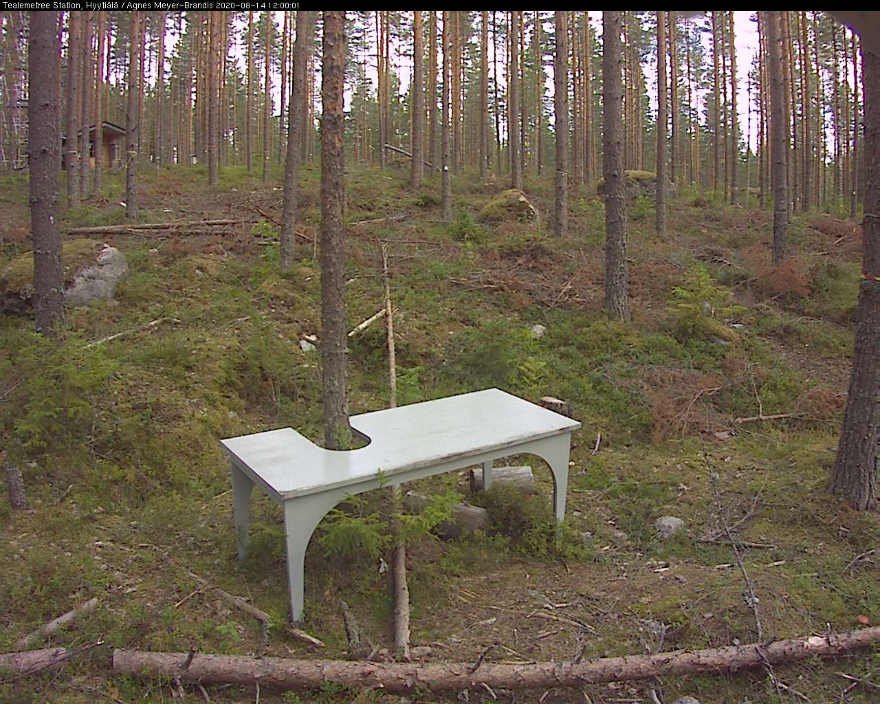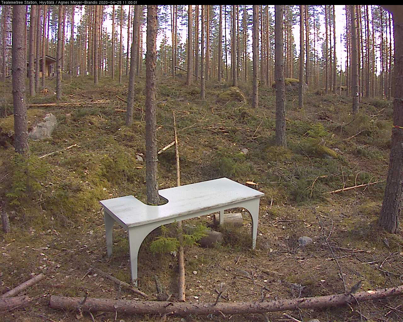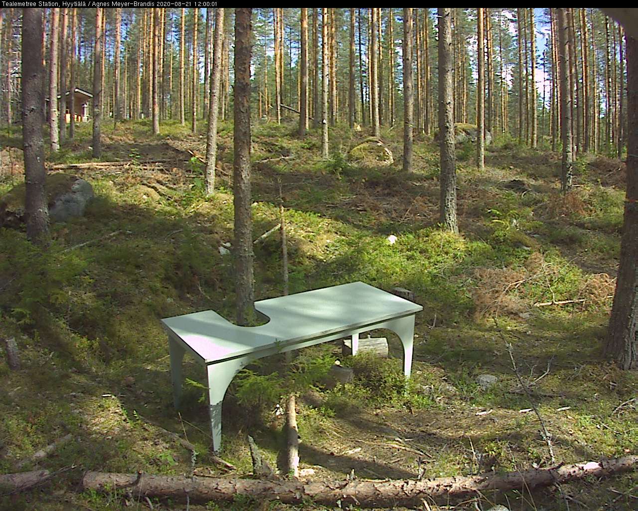 Agnes Meyer-Brandiksen työ Hyytiälässä alkoi tutustumalla aseman muihin tutkijoihin. Pystyäkseen tapaamaan ihmisiä metsässä, hän rakensi pöydän, josta muodostui kohtauspiste ja paikka teehetkille Agneksen ja puun kanssa.