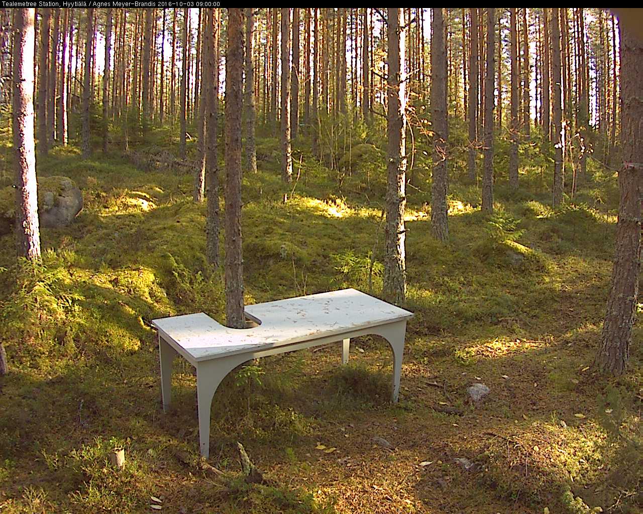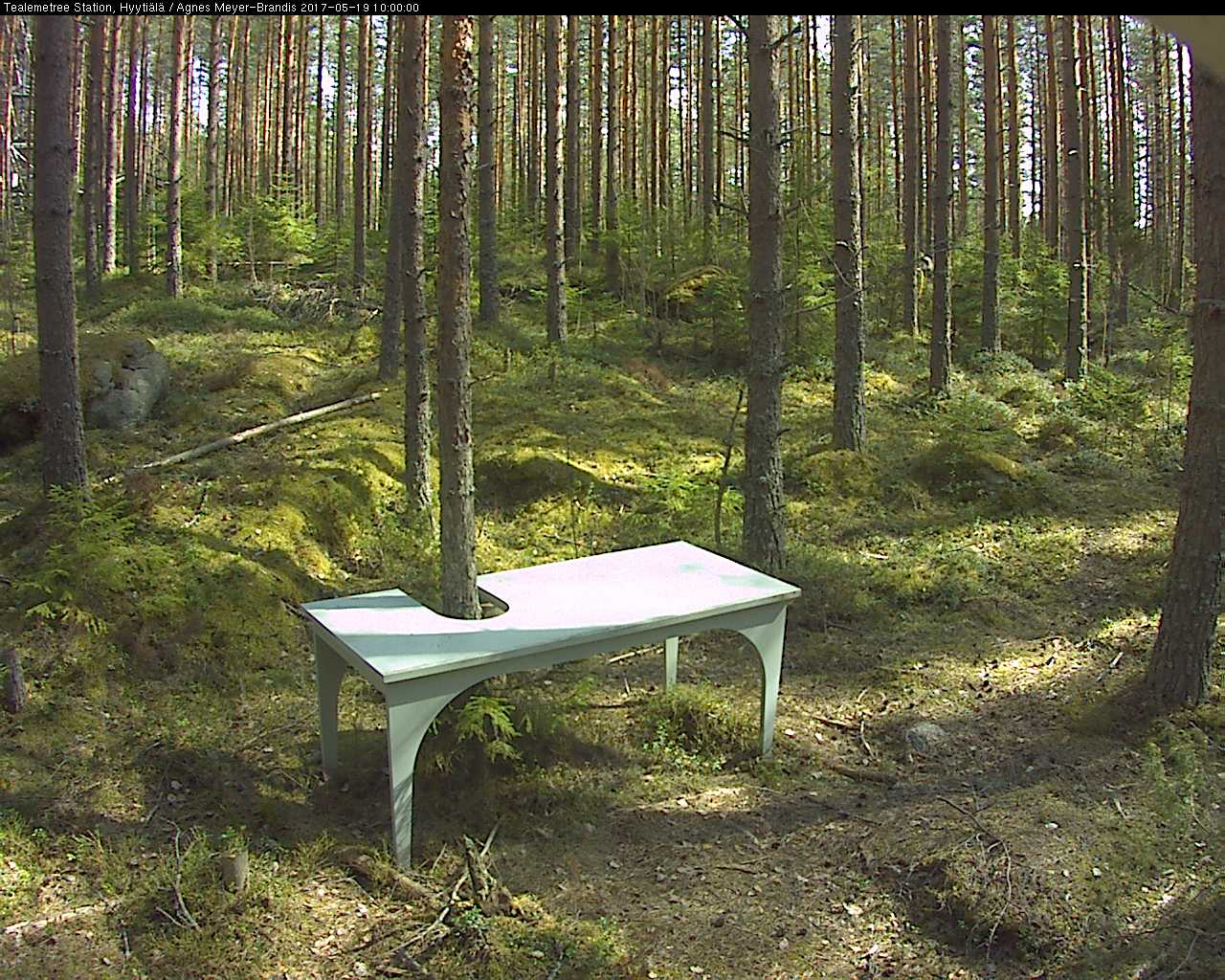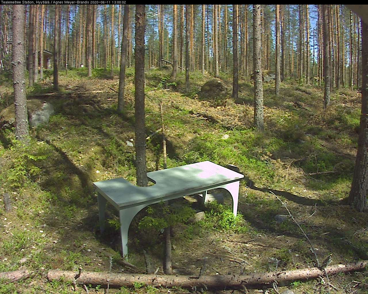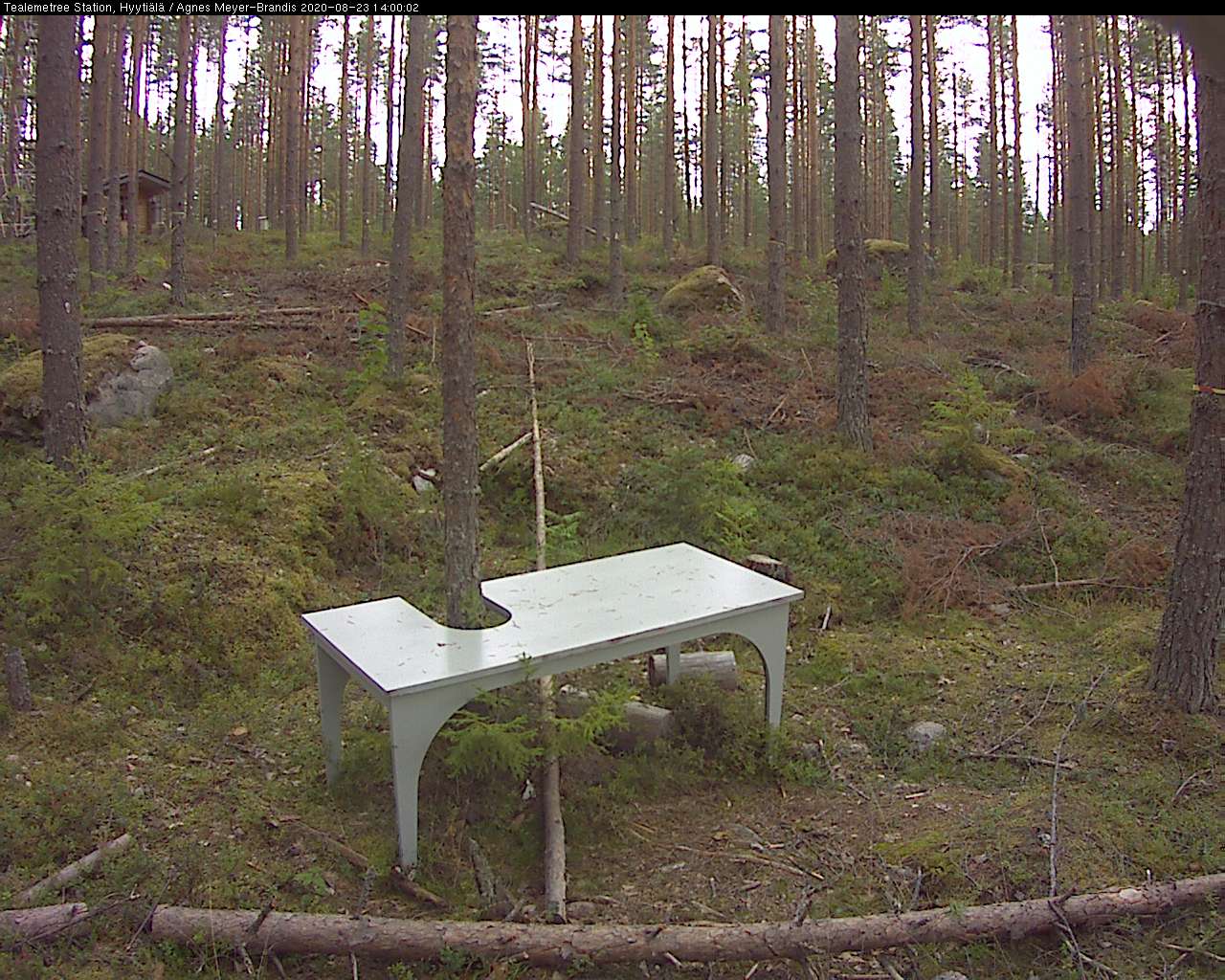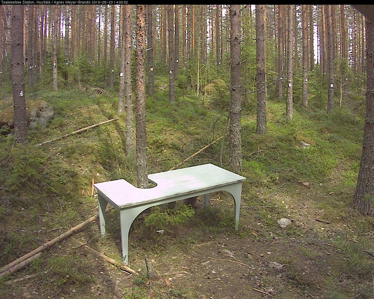 Agnes Meyer-Brandiksen työ Hyytiälässä alkoi tutustumalla aseman muihin tutkijoihin. Pystyäkseen tapaamaan ihmisiä metsässä, hän rakensi pöydän, josta muodostui kohtauspiste ja paikka teehetkille Agneksen ja puun kanssa.