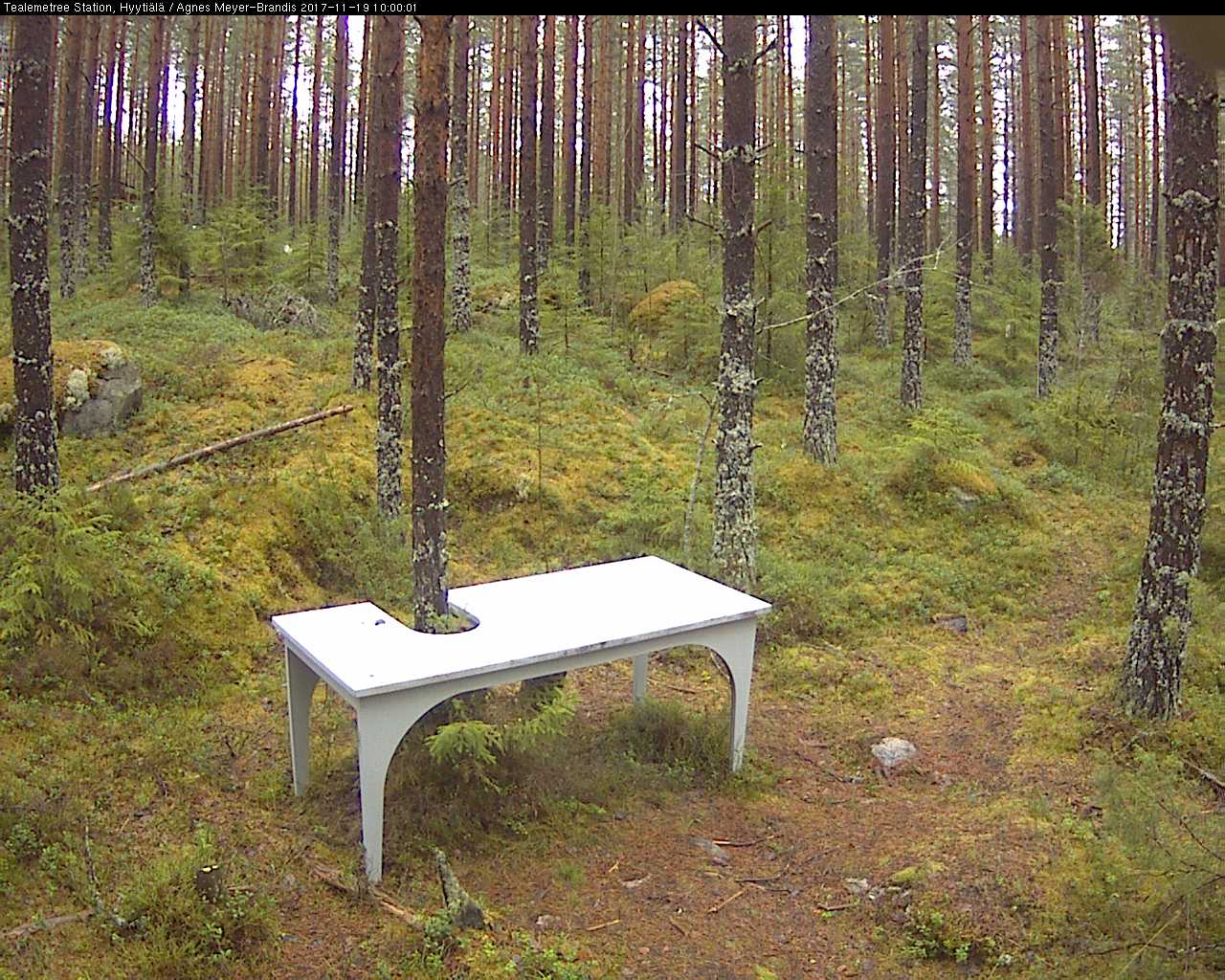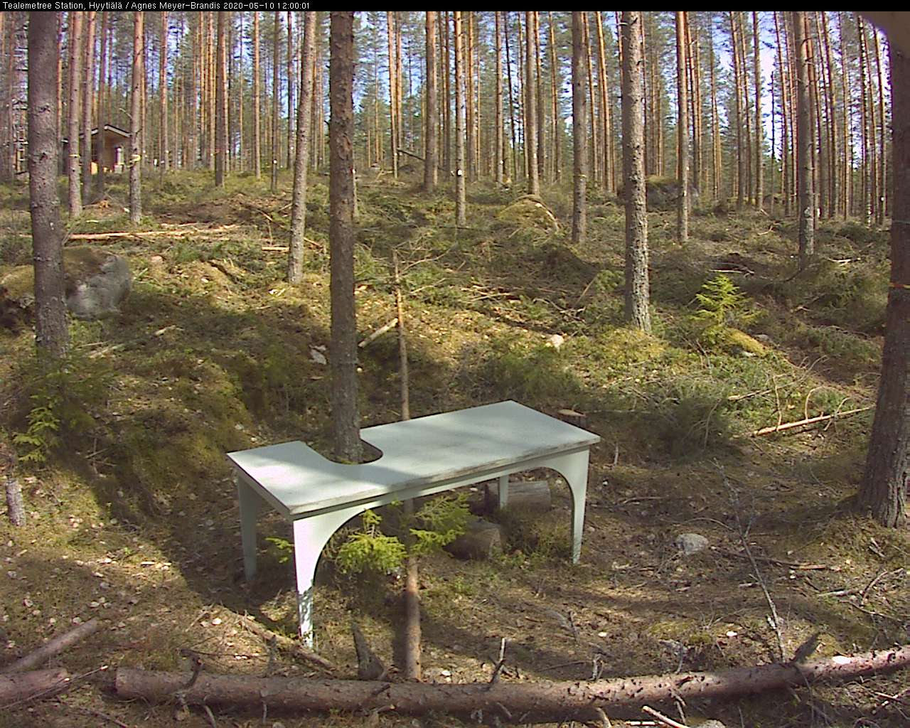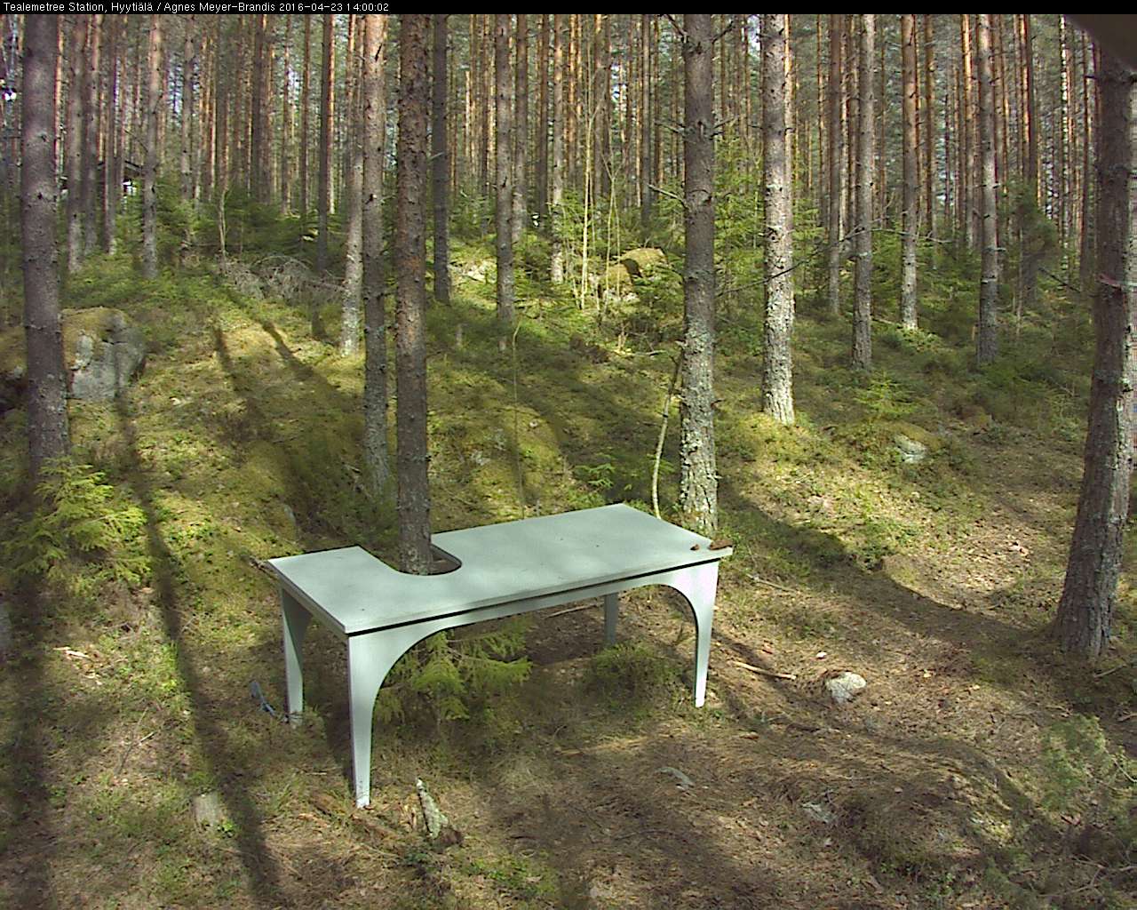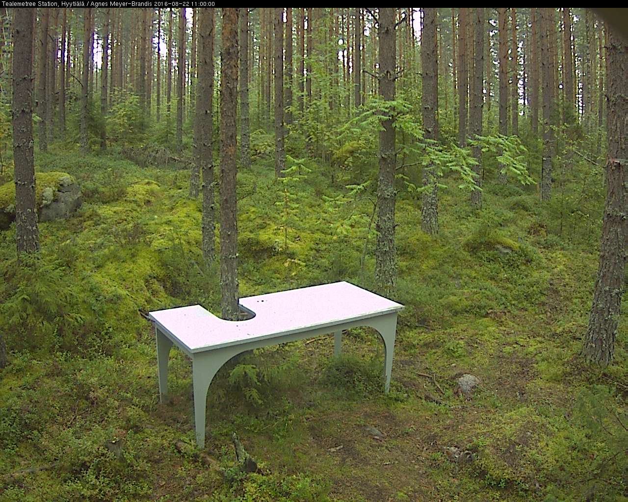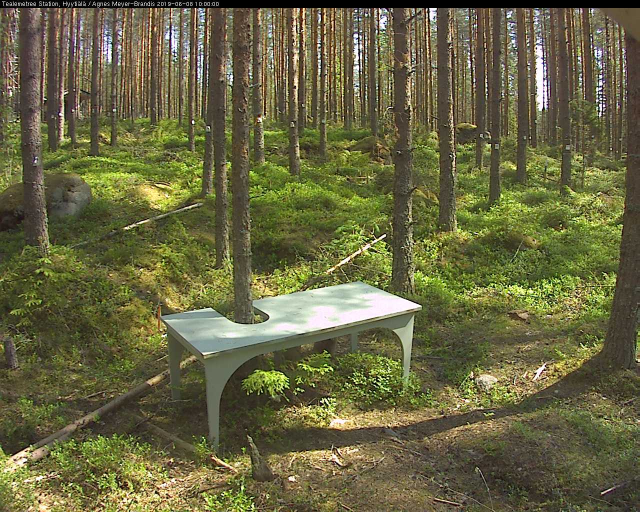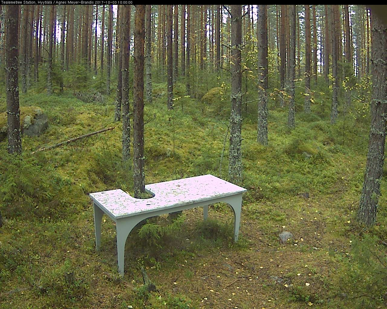 Agnes Meyer-Brandiksen työ Hyytiälässä alkoi tutustumalla aseman muihin tutkijoihin. Pystyäkseen tapaamaan ihmisiä metsässä, hän rakensi pöydän, josta muodostui kohtauspiste ja paikka teehetkille Agneksen ja puun kanssa.