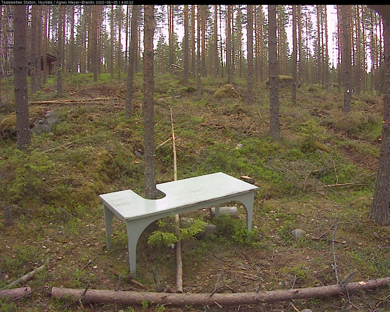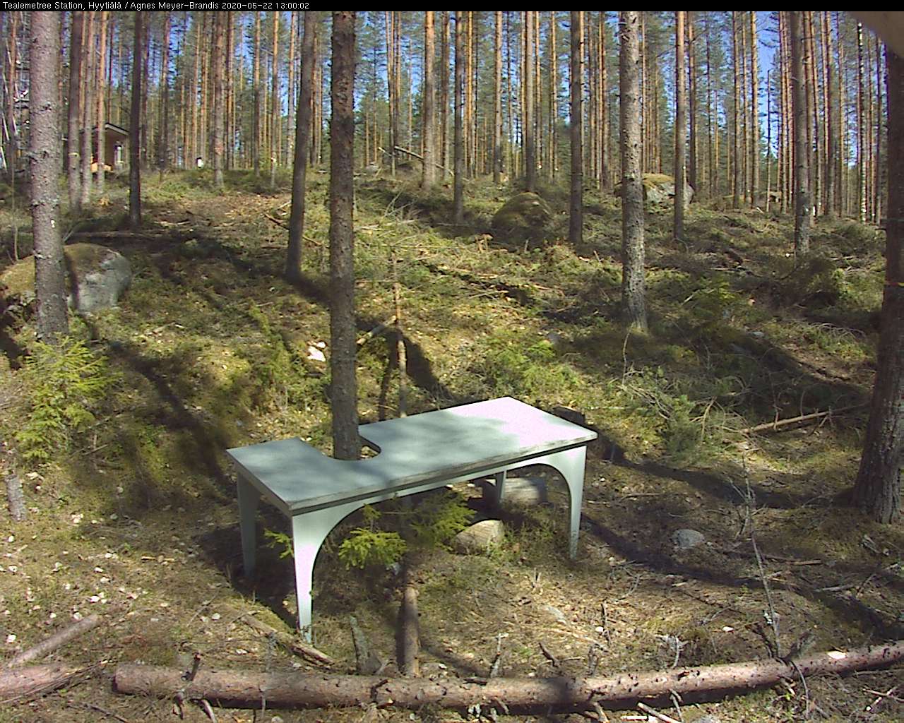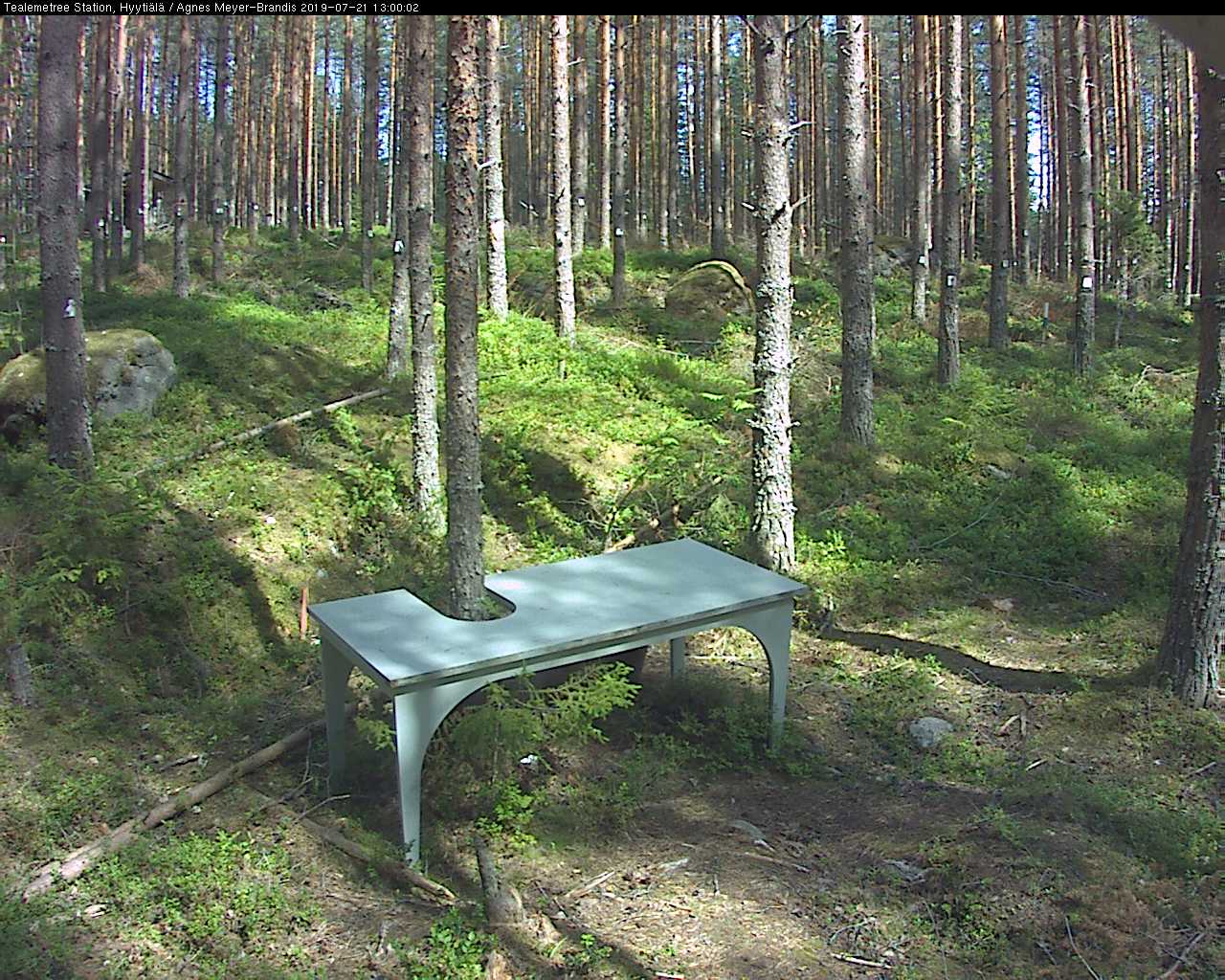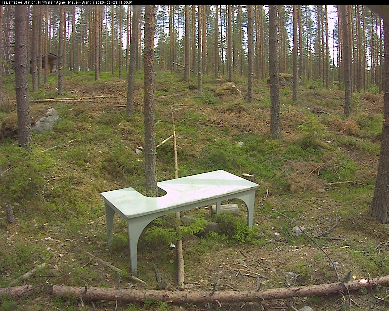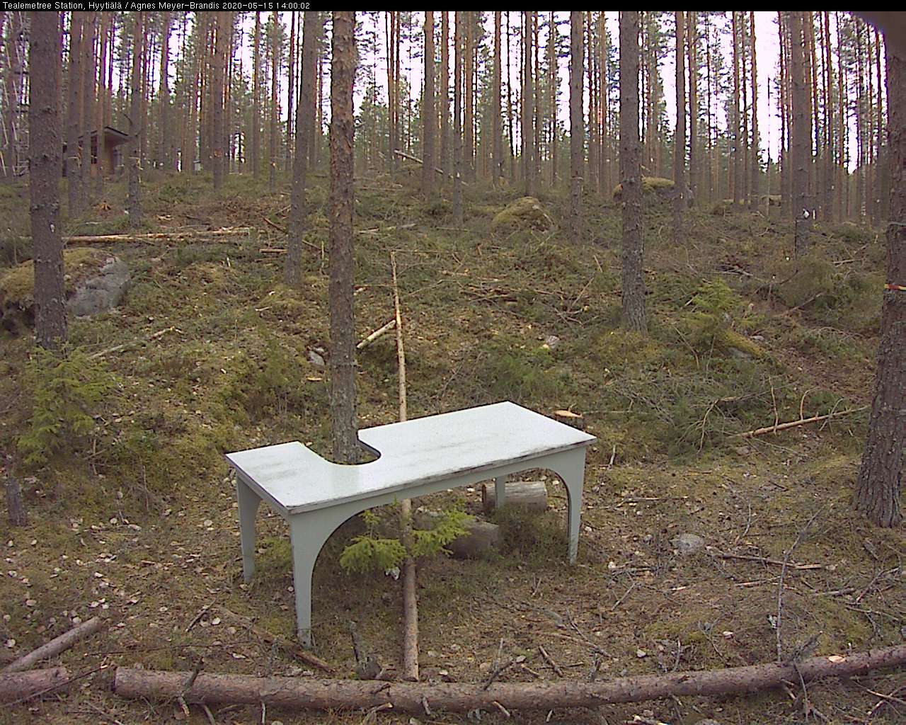 Agnes Meyer-Brandiksen työ Hyytiälässä alkoi tutustumalla aseman muihin tutkijoihin. Pystyäkseen tapaamaan ihmisiä metsässä, hän rakensi pöydän, josta muodostui kohtauspiste ja paikka teehetkille Agneksen ja puun kanssa.