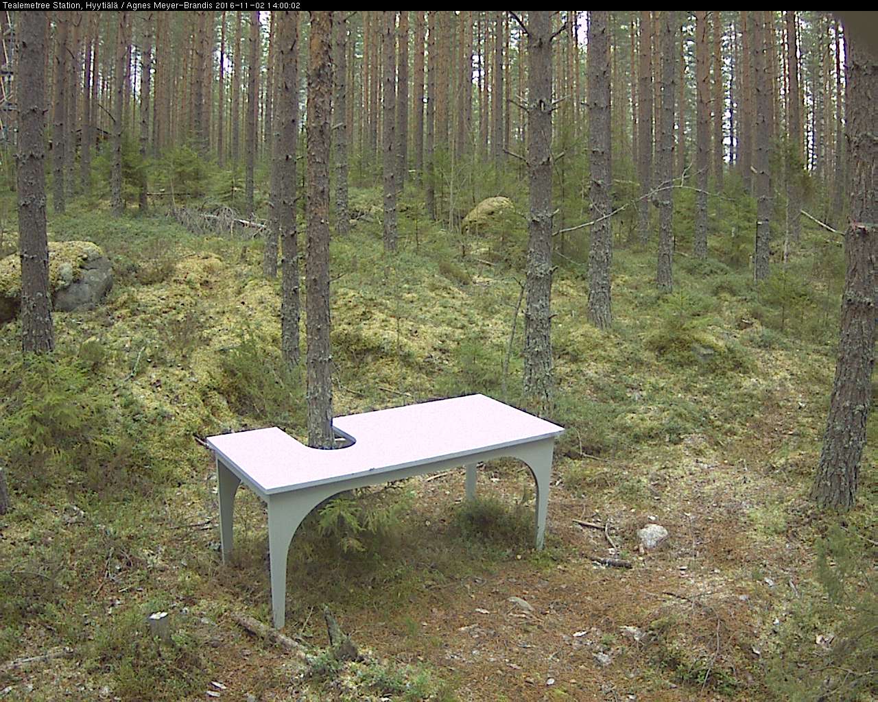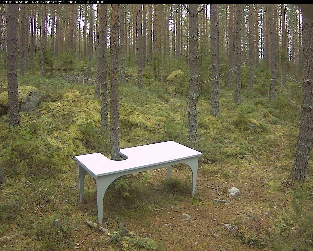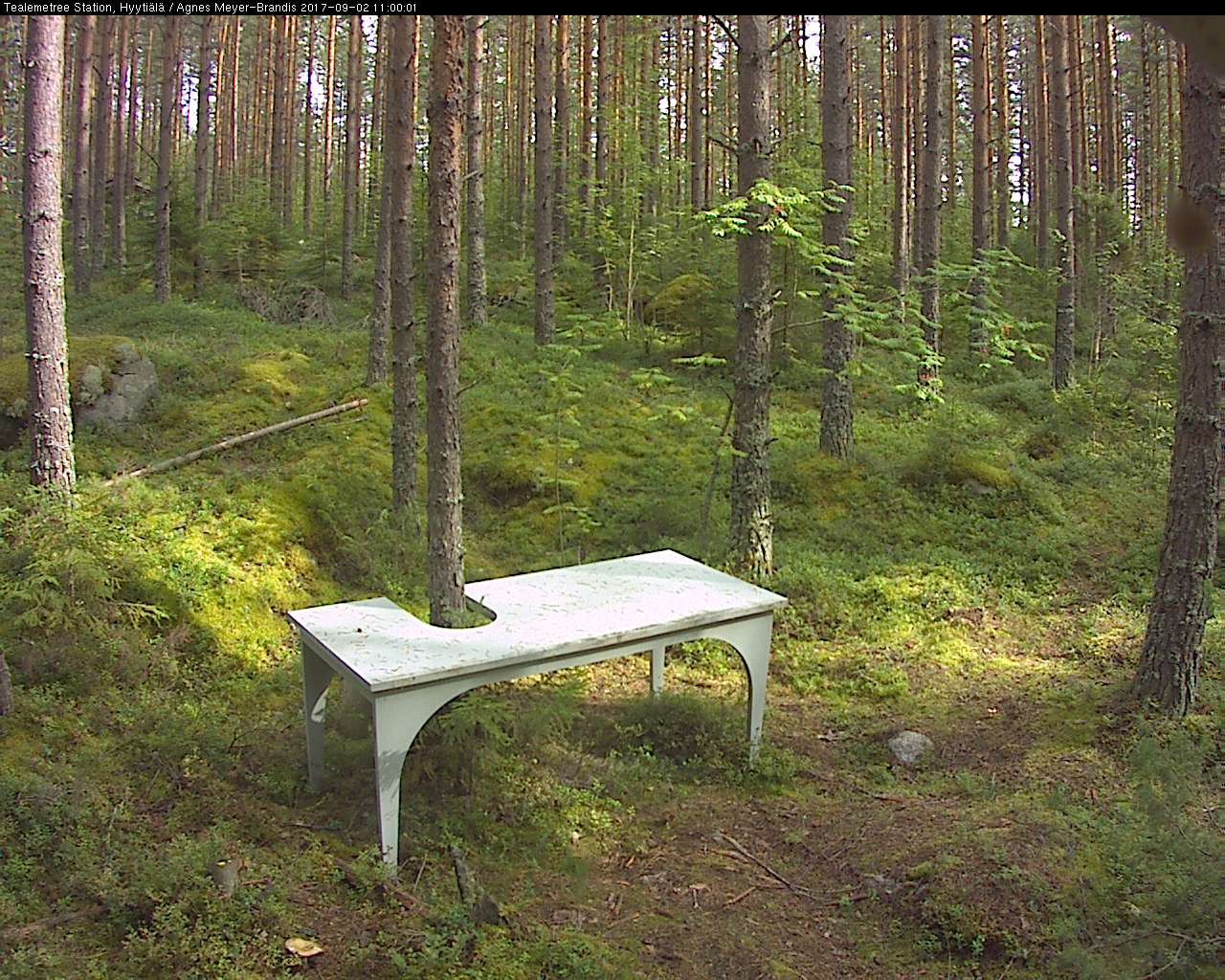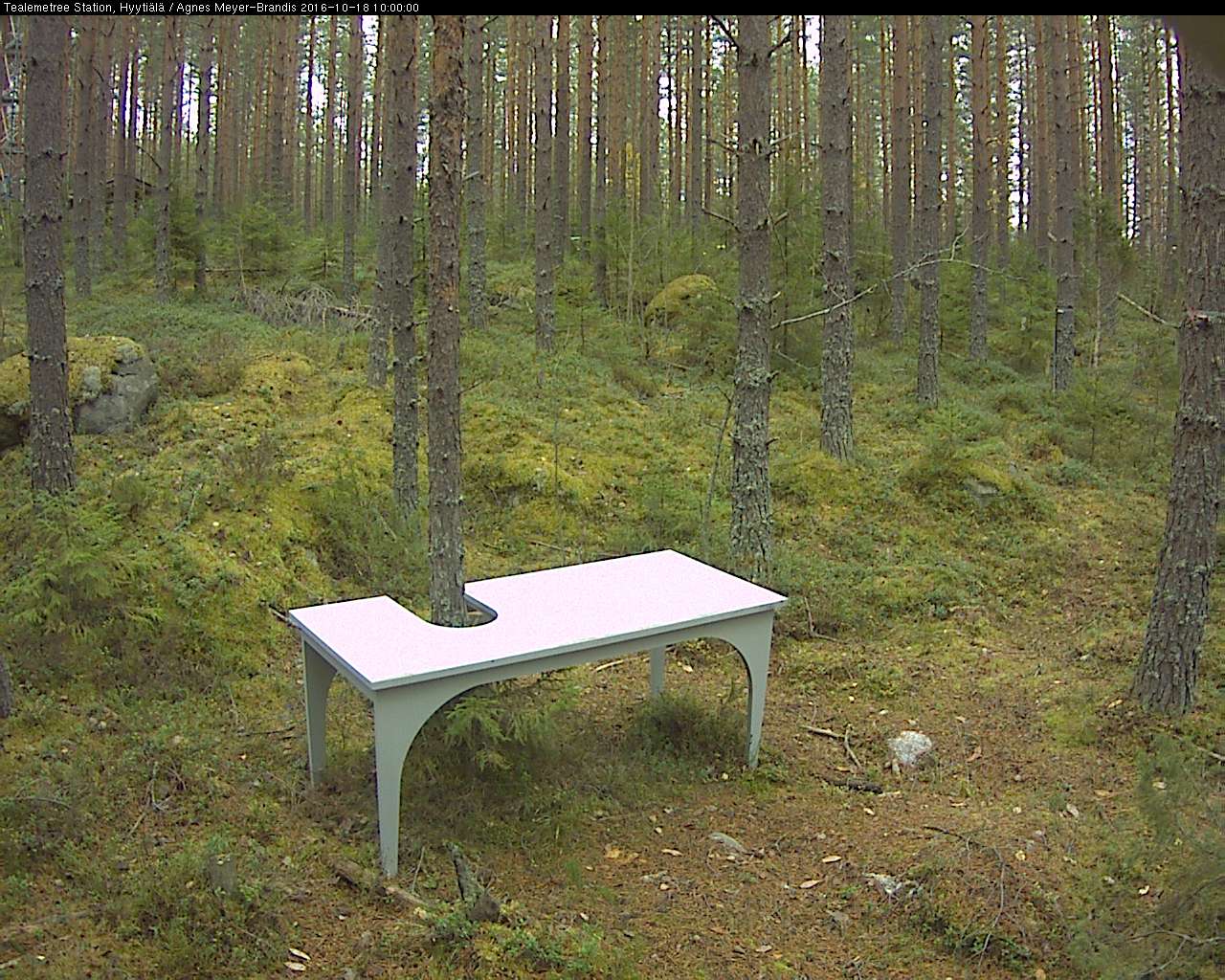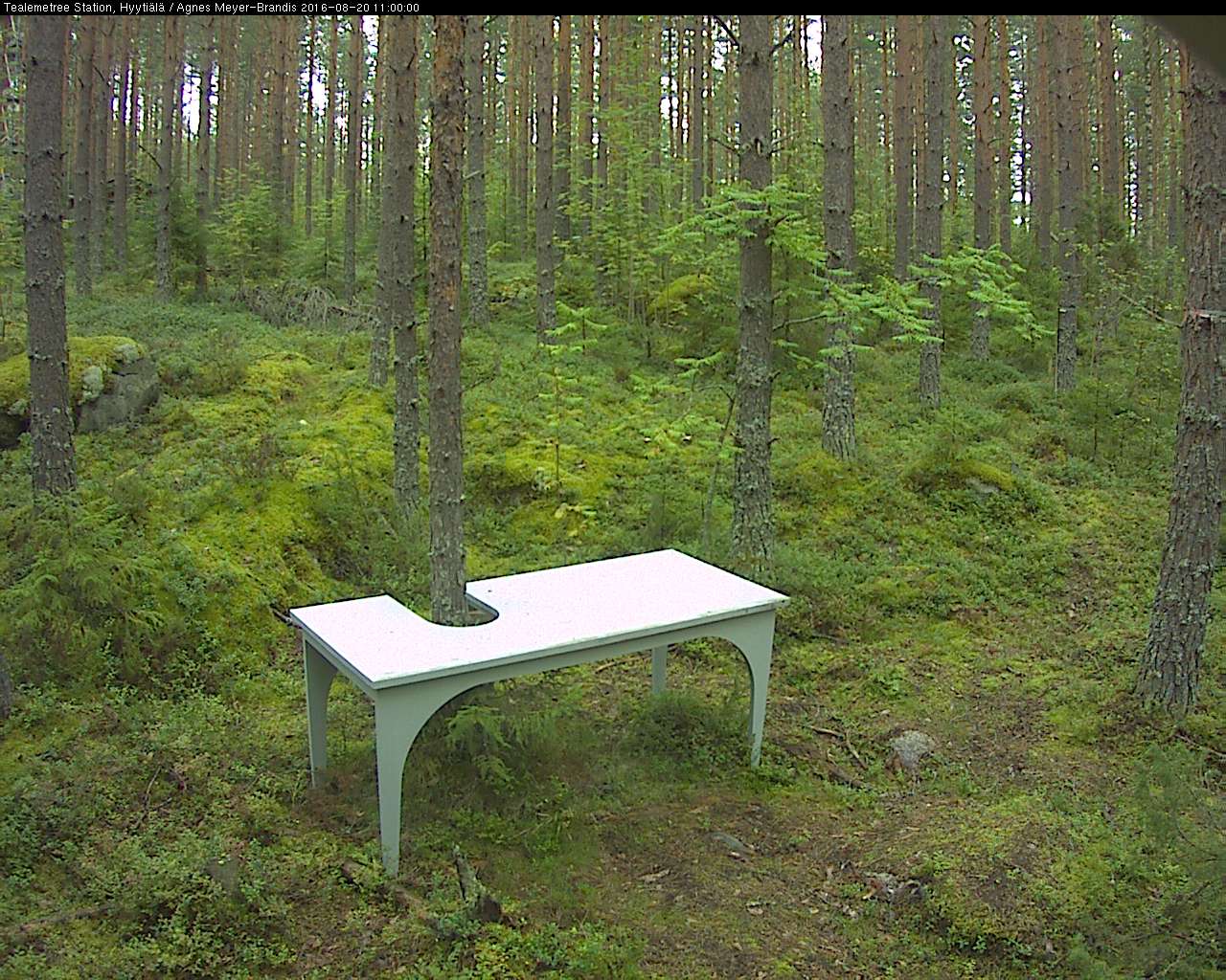 Agnes Meyer-Brandiksen työ Hyytiälässä alkoi tutustumalla aseman muihin tutkijoihin. Pystyäkseen tapaamaan ihmisiä metsässä, hän rakensi pöydän, josta muodostui kohtauspiste ja paikka teehetkille Agneksen ja puun kanssa.