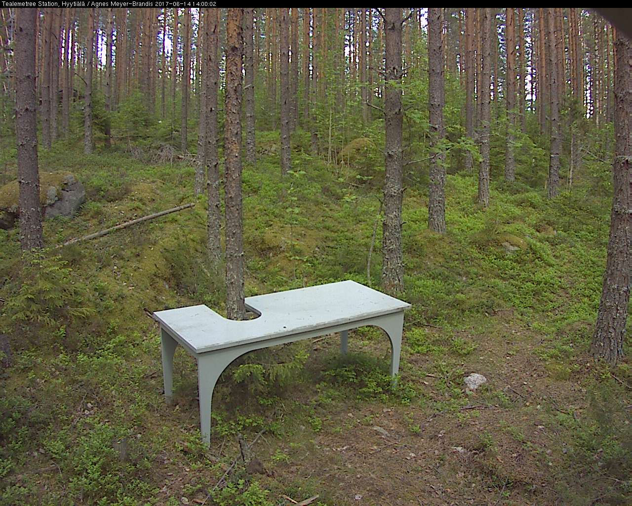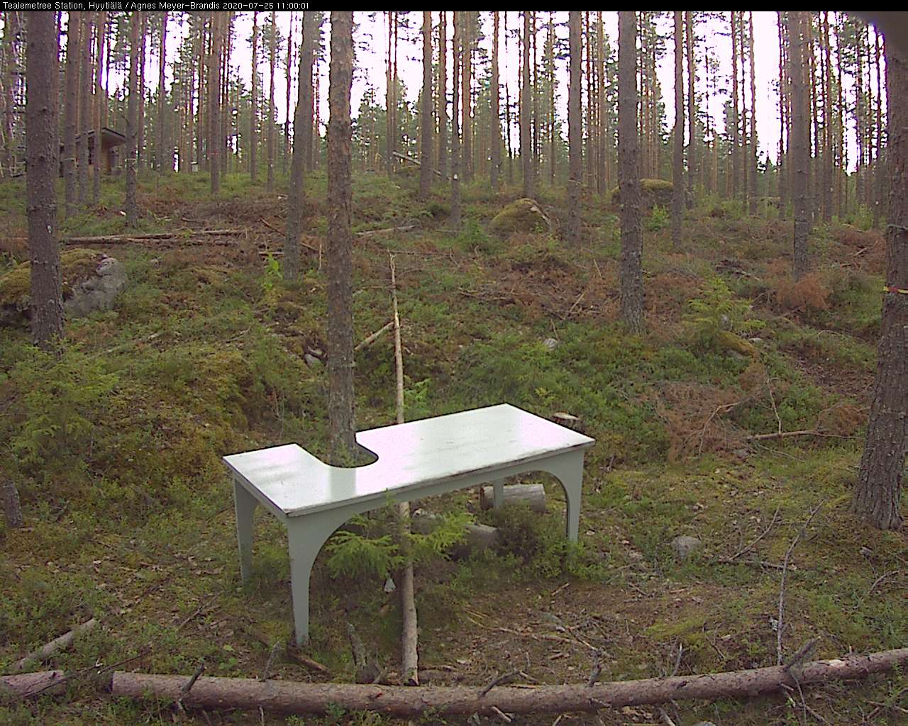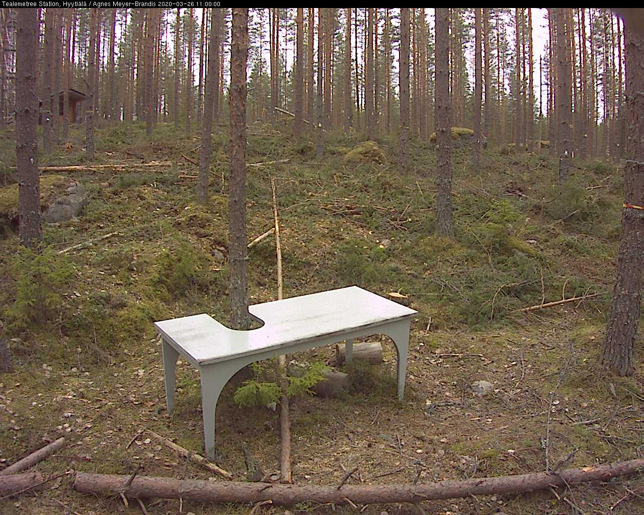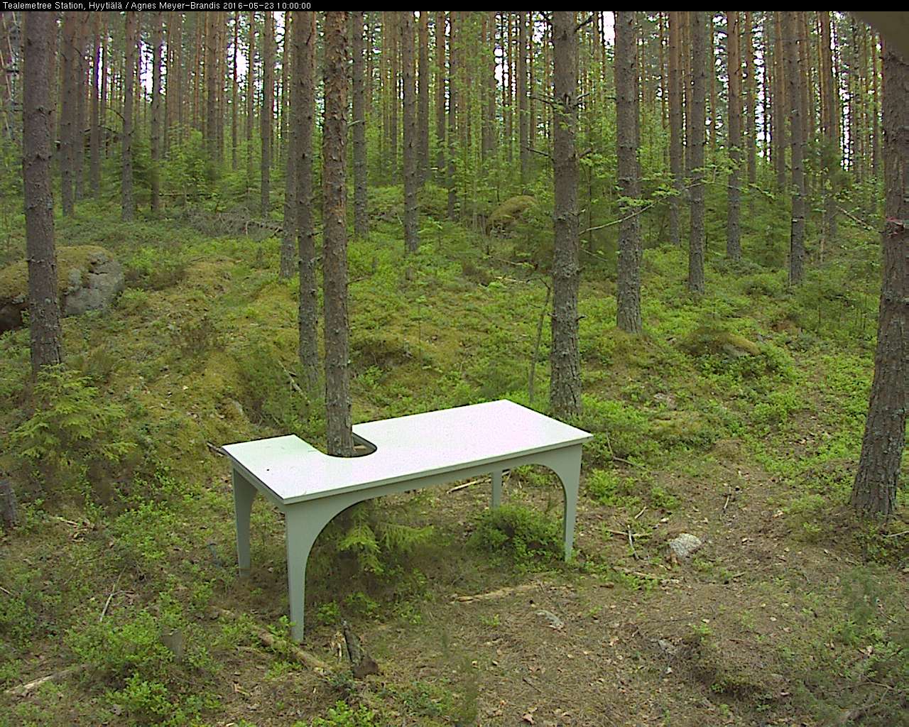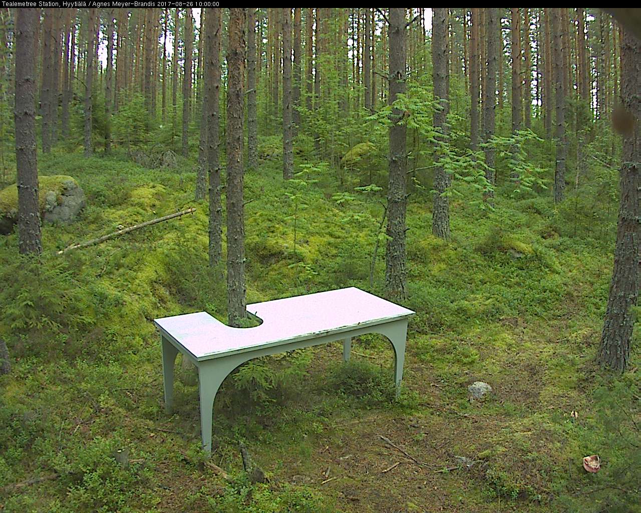 Agnes Meyer-Brandiksen työ Hyytiälässä alkoi tutustumalla aseman muihin tutkijoihin. Pystyäkseen tapaamaan ihmisiä metsässä, hän rakensi pöydän, josta muodostui kohtauspiste ja paikka teehetkille Agneksen ja puun kanssa.
