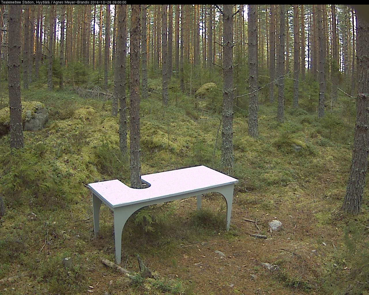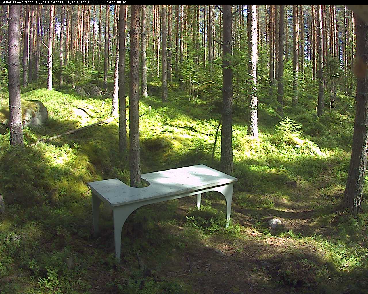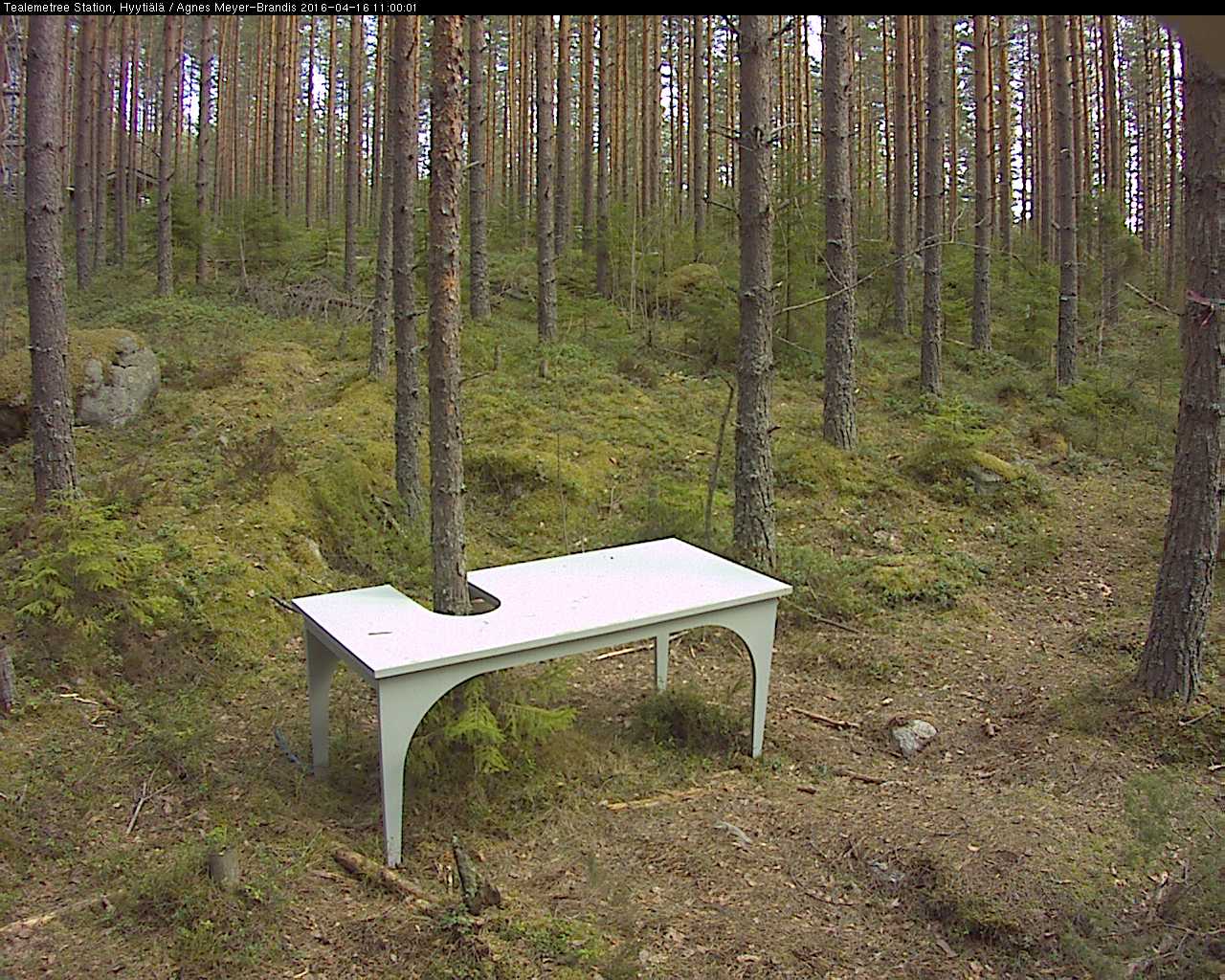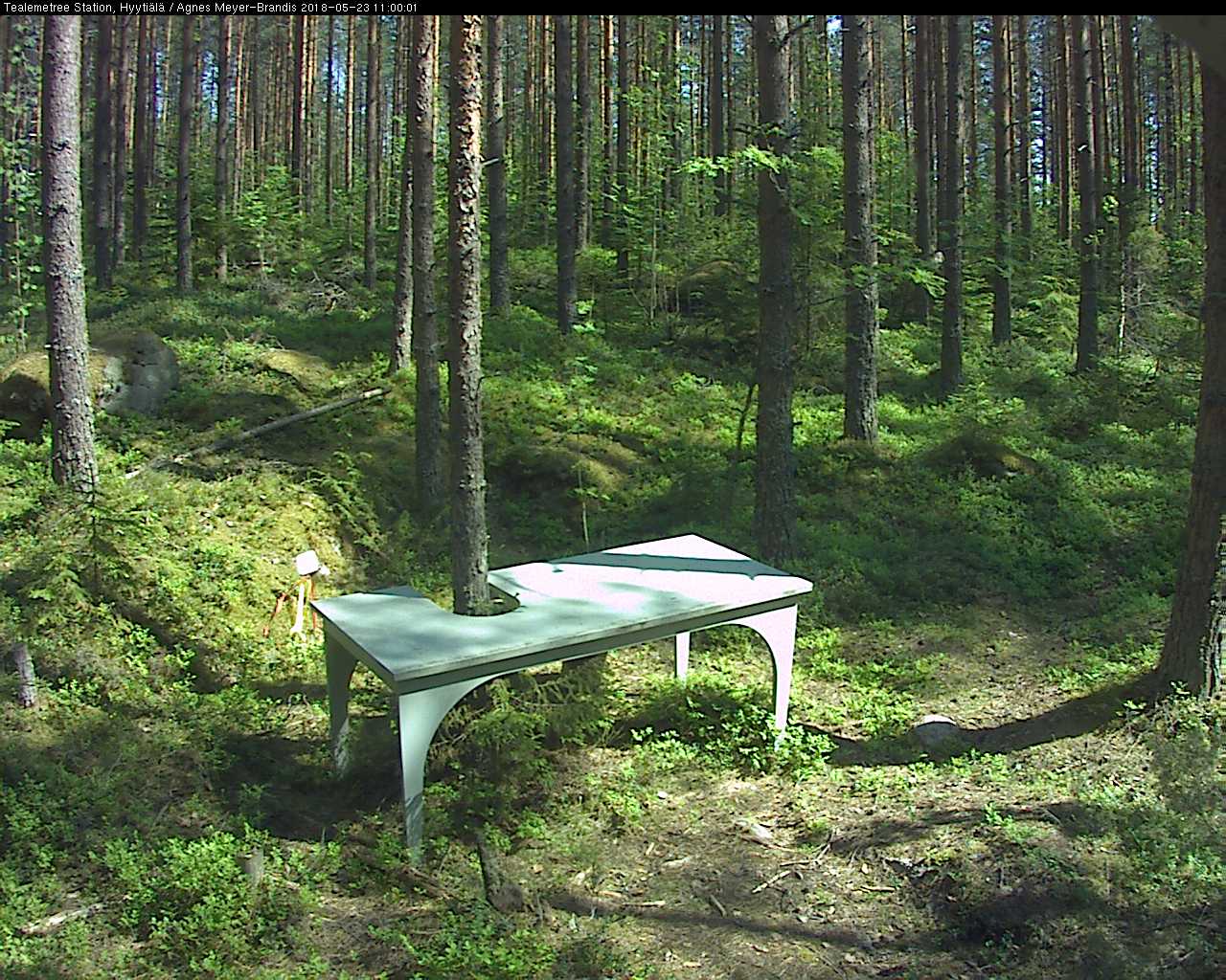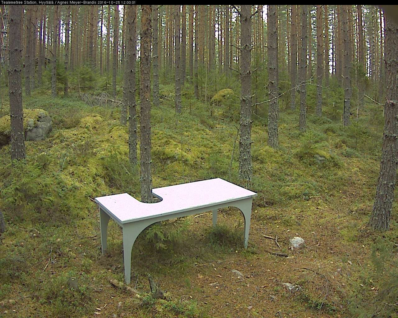 Agnes Meyer-Brandiksen työ Hyytiälässä alkoi tutustumalla aseman muihin tutkijoihin. Pystyäkseen tapaamaan ihmisiä metsässä, hän rakensi pöydän, josta muodostui kohtauspiste ja paikka teehetkille Agneksen ja puun kanssa.