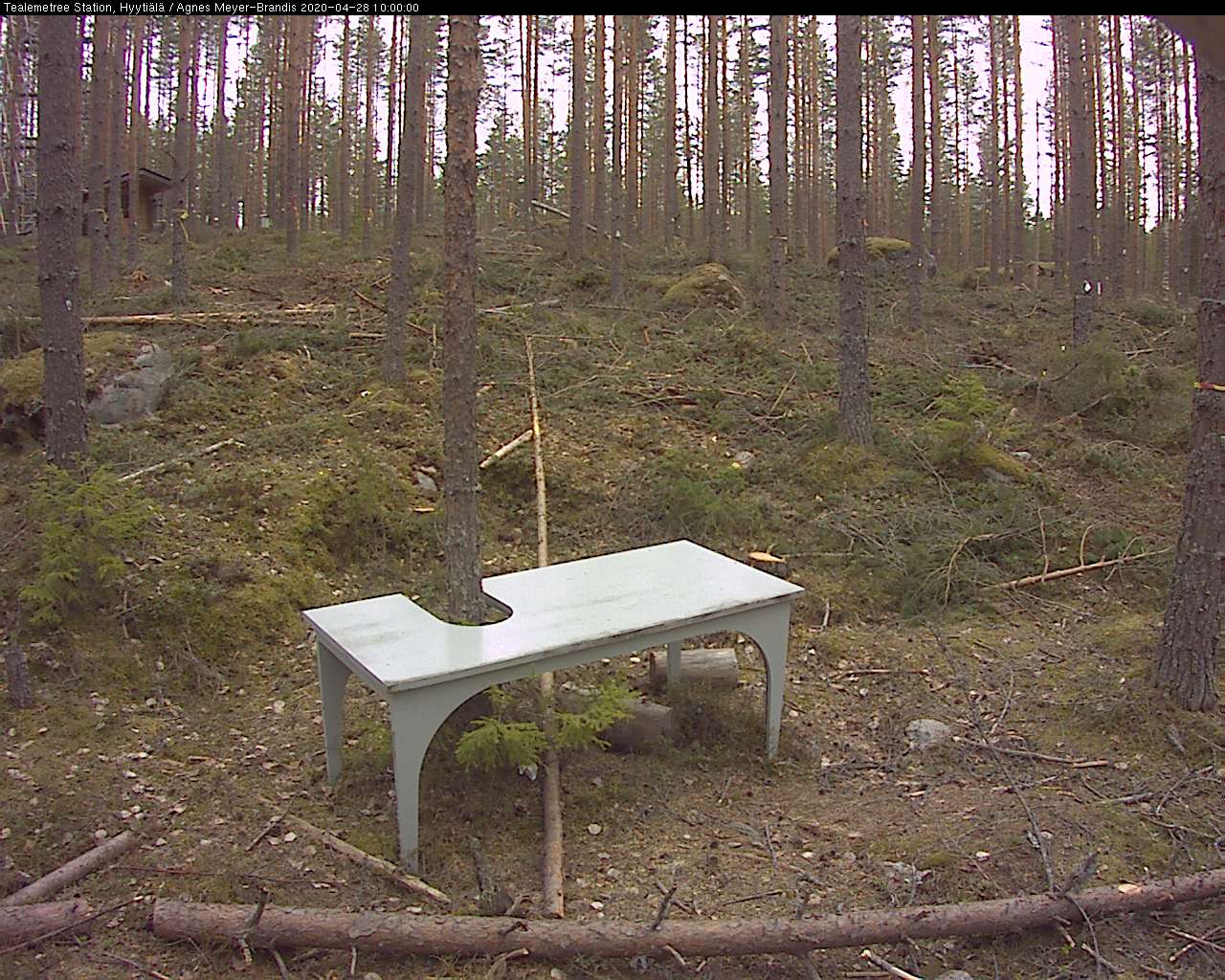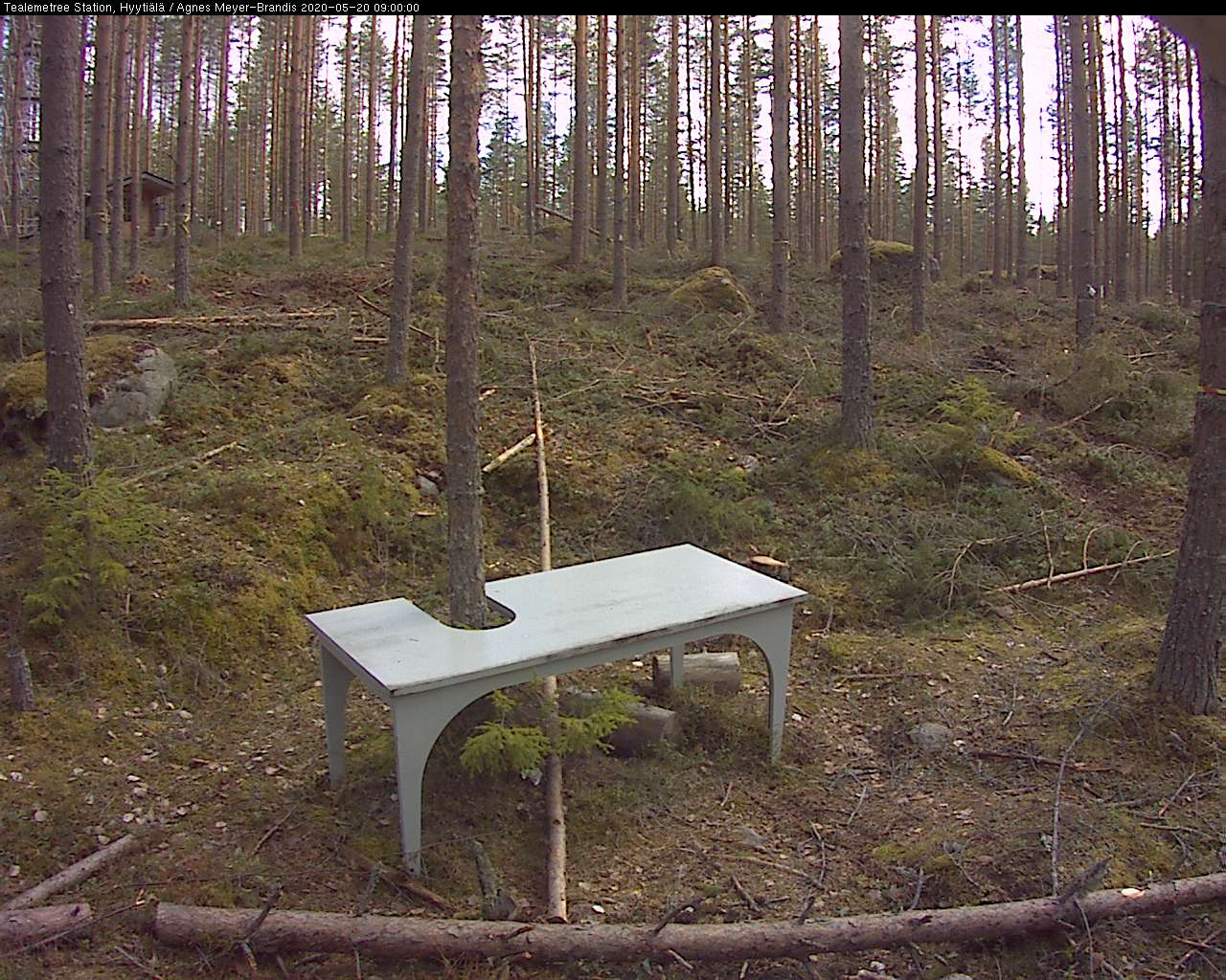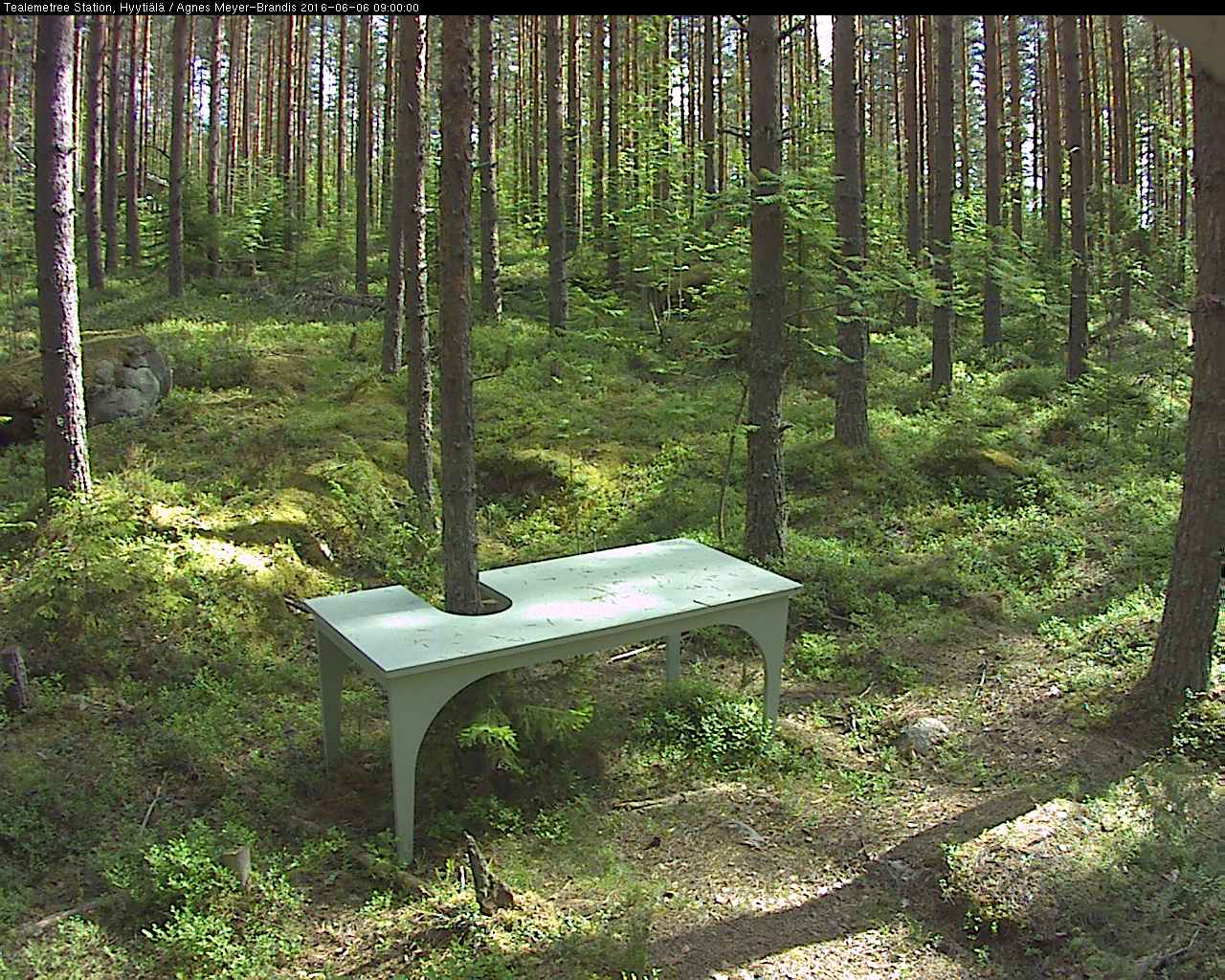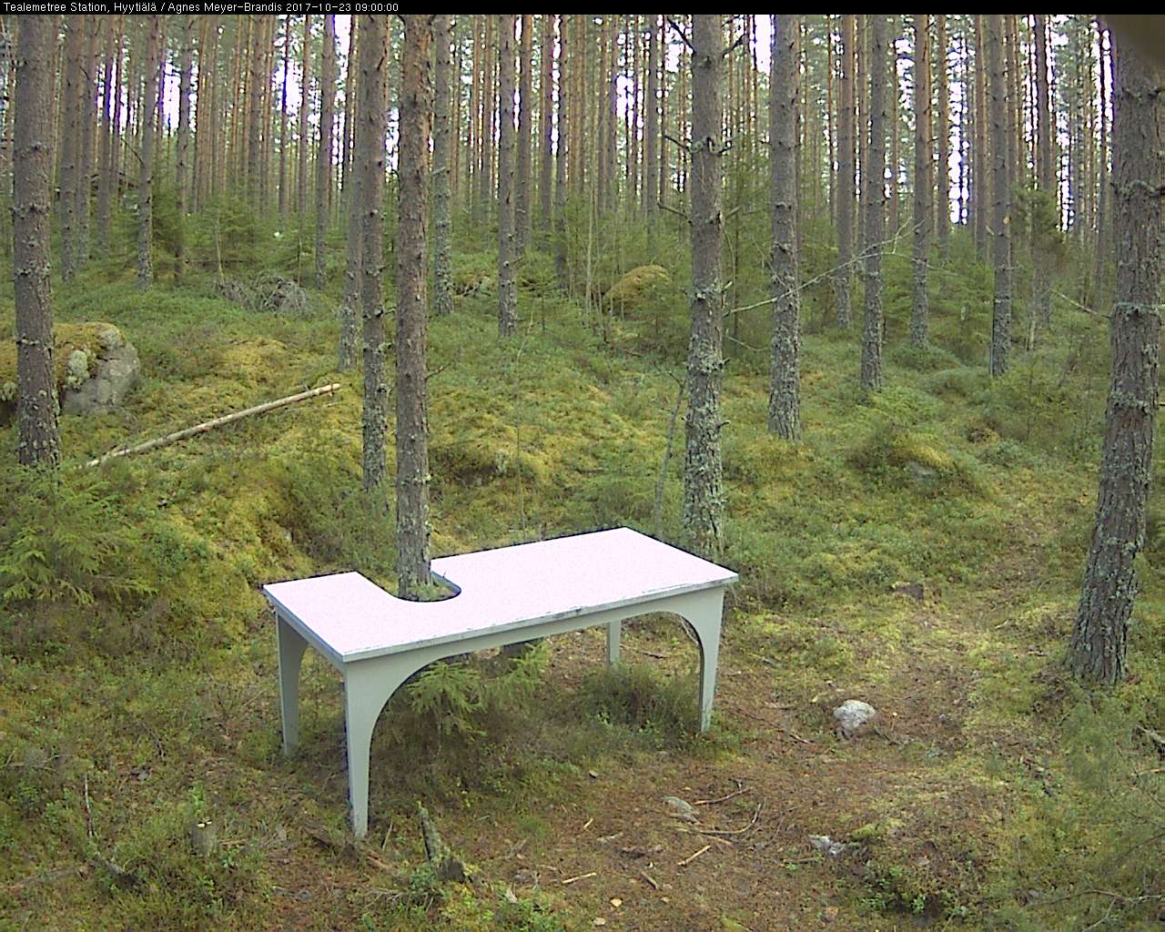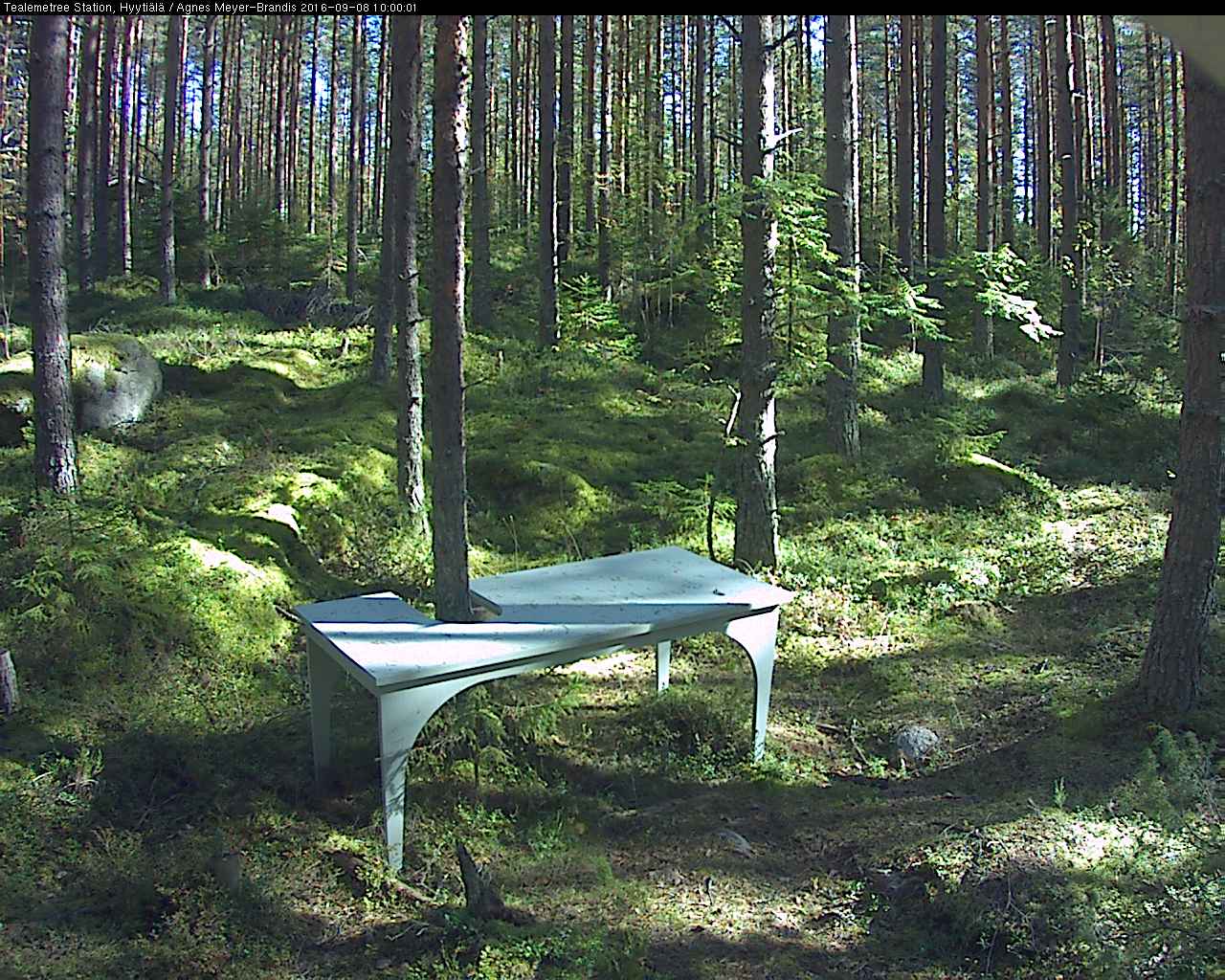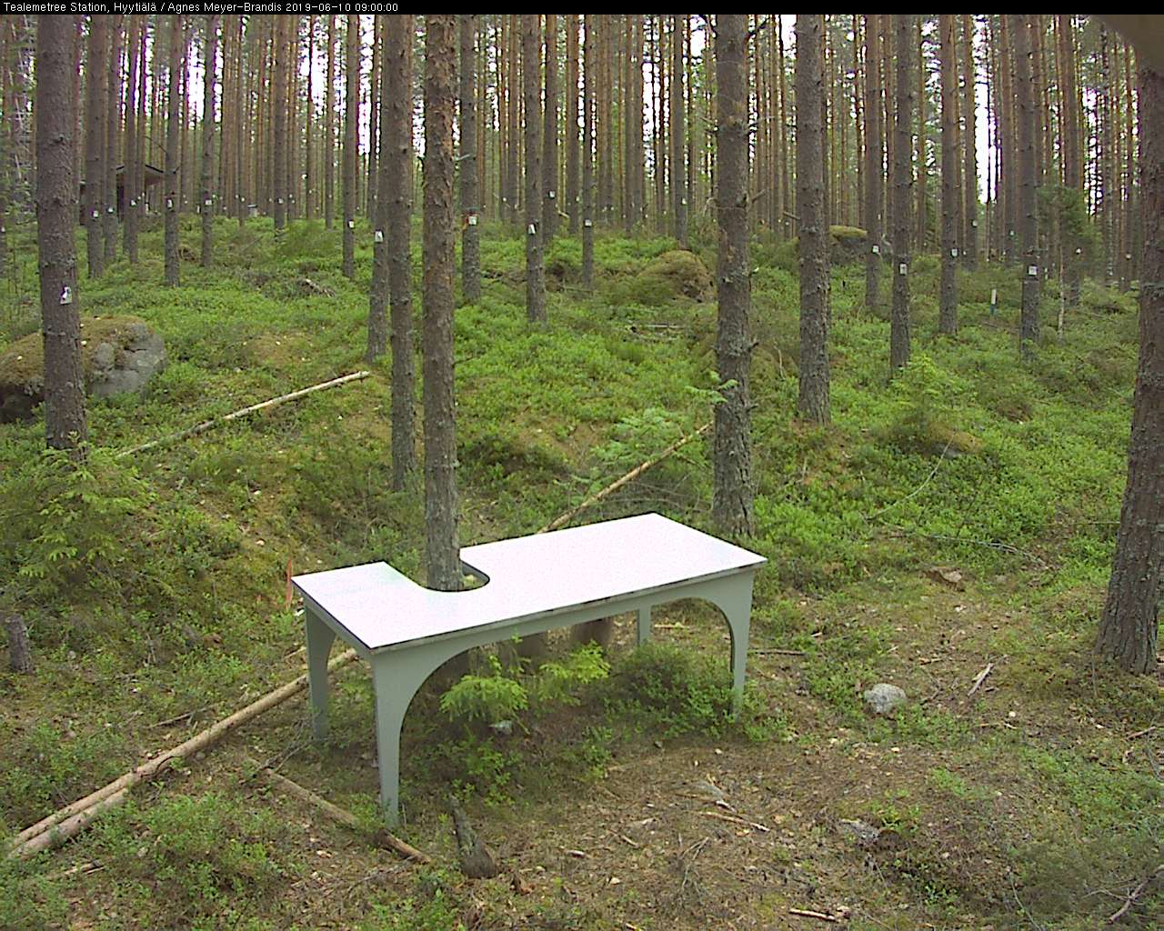 Agnes Meyer-Brandiksen työ Hyytiälässä alkoi tutustumalla aseman muihin tutkijoihin. Pystyäkseen tapaamaan ihmisiä metsässä, hän rakensi pöydän, josta muodostui kohtauspiste ja paikka teehetkille Agneksen ja puun kanssa.