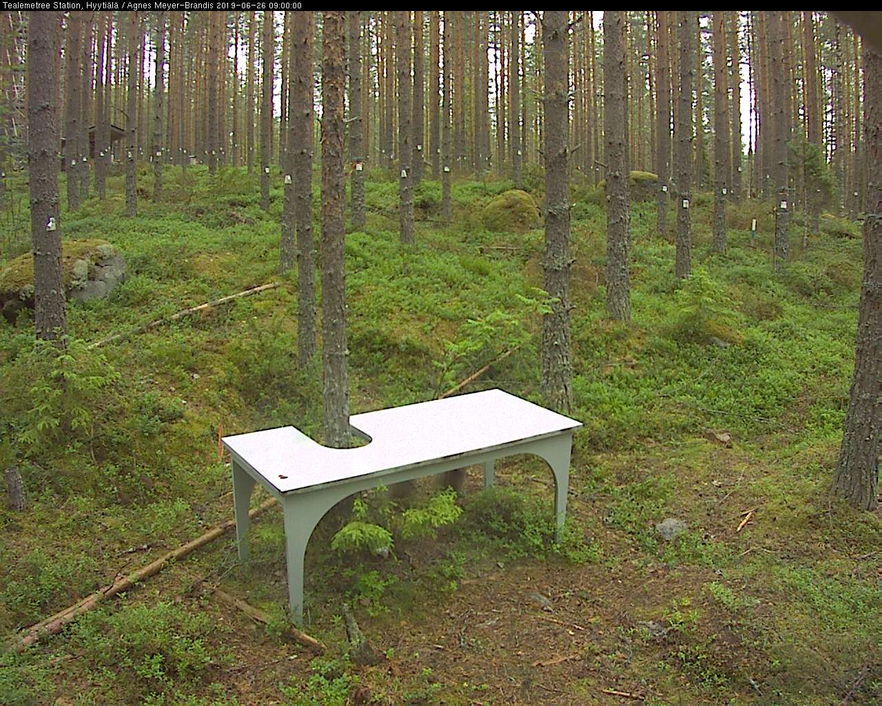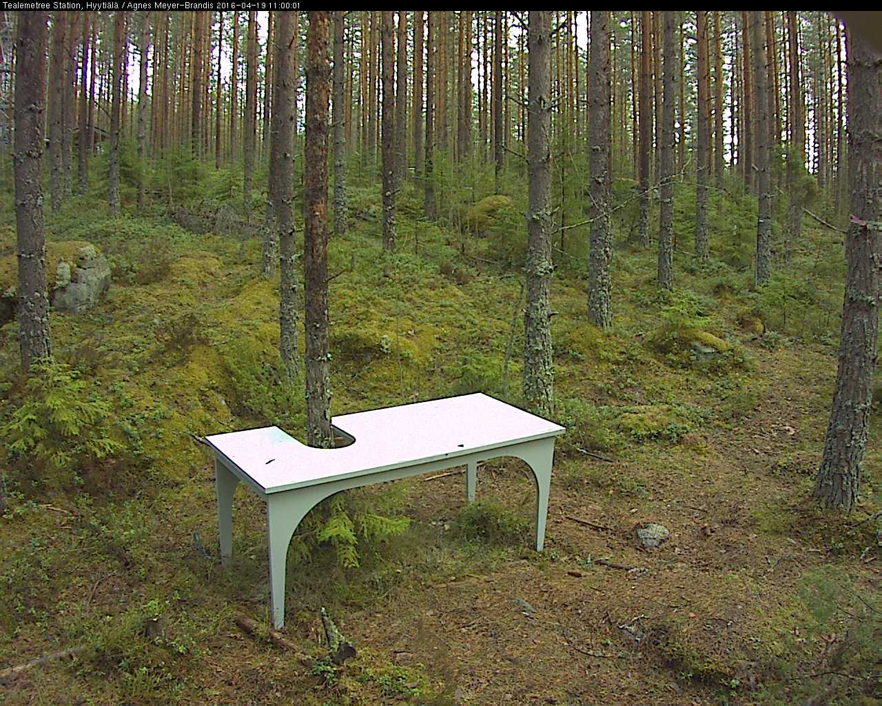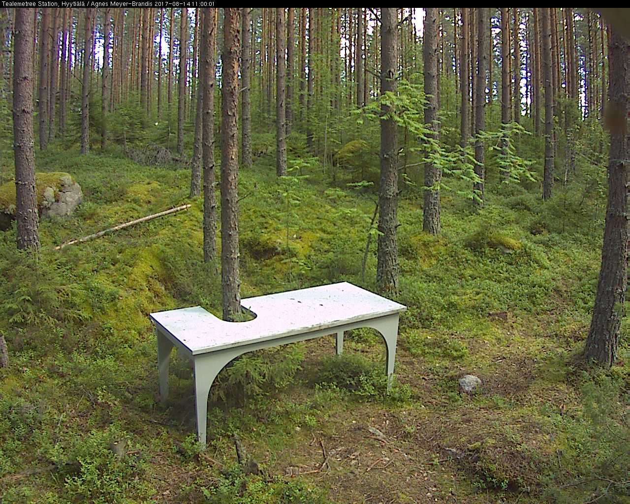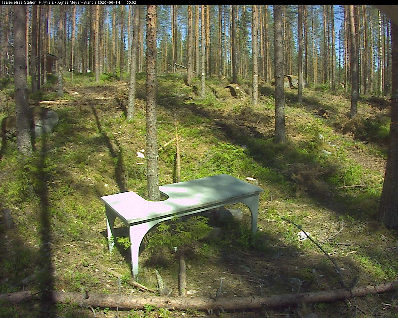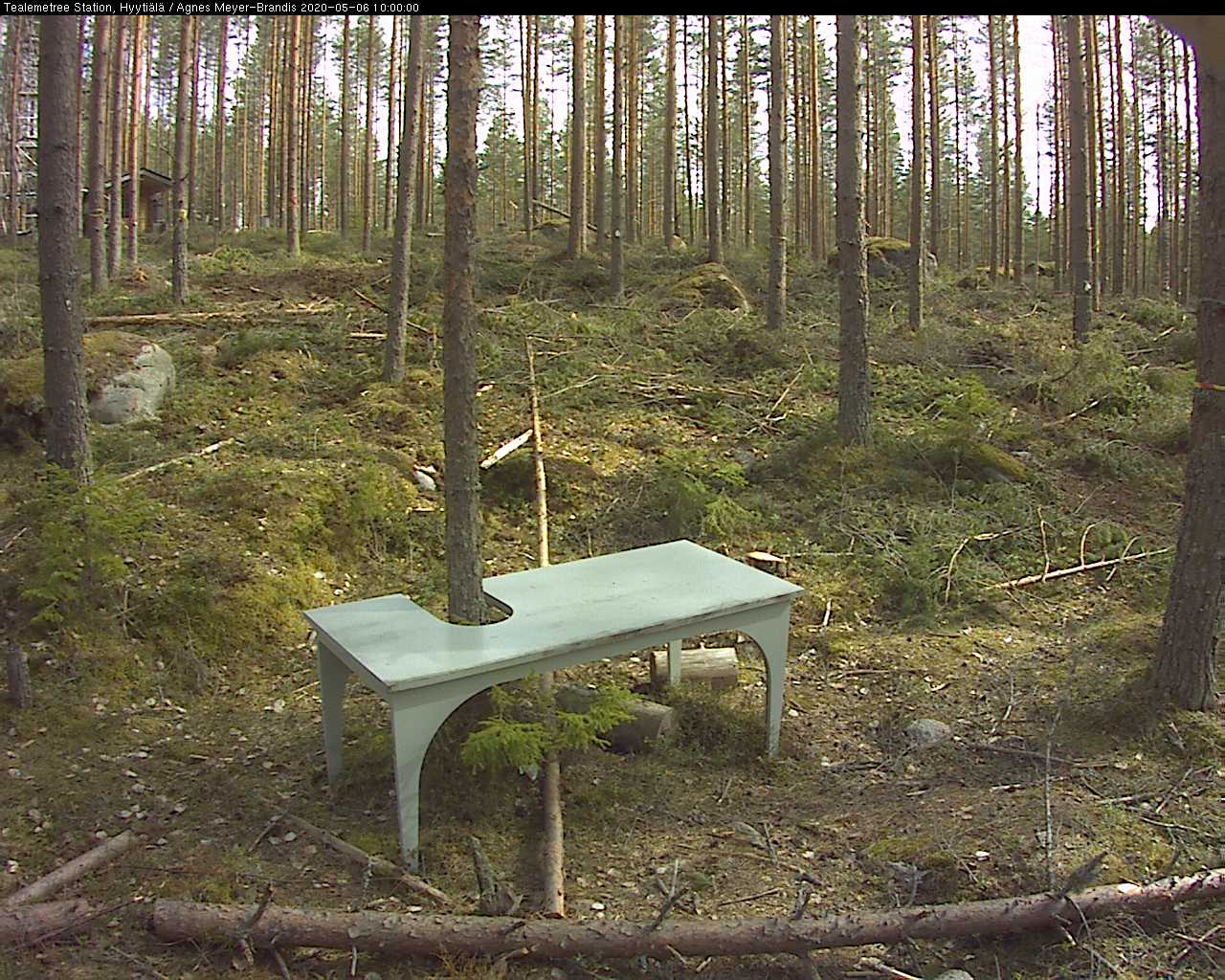 Agnes Meyer-Brandiksen työ Hyytiälässä alkoi tutustumalla aseman muihin tutkijoihin. Pystyäkseen tapaamaan ihmisiä metsässä, hän rakensi pöydän, josta muodostui kohtauspiste ja paikka teehetkille Agneksen ja puun kanssa.