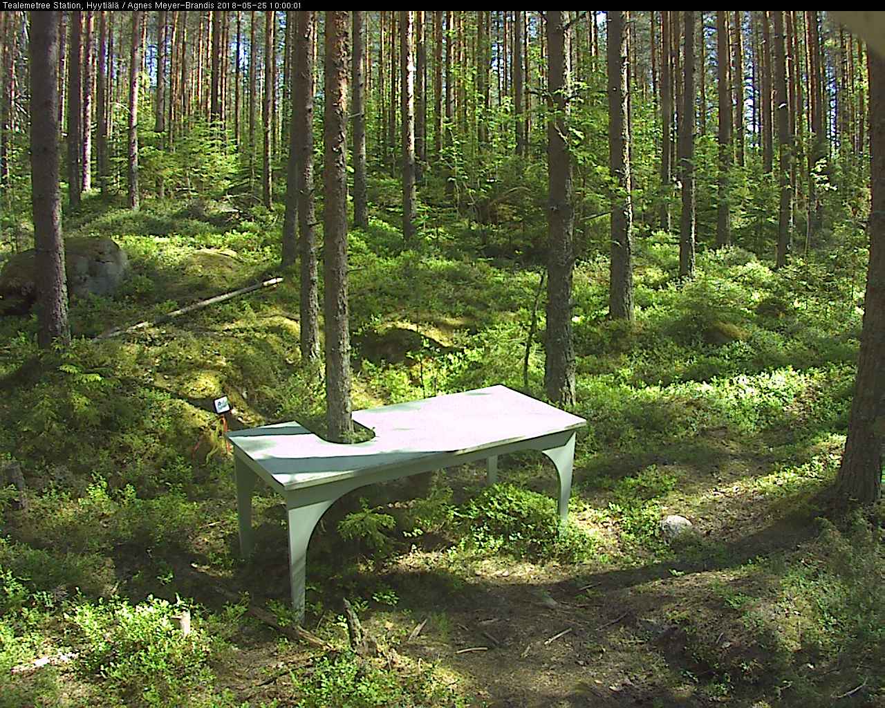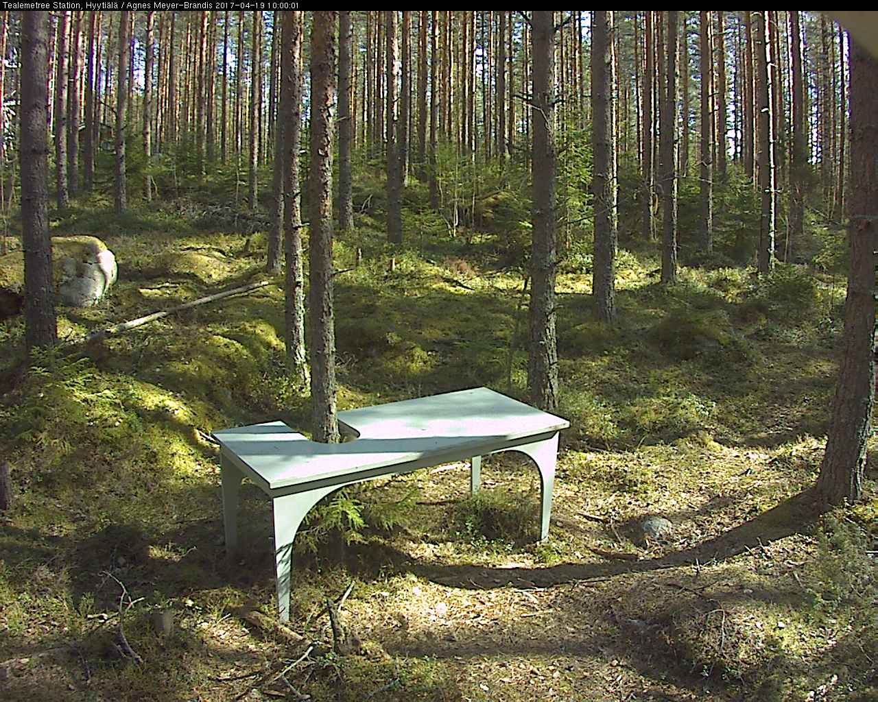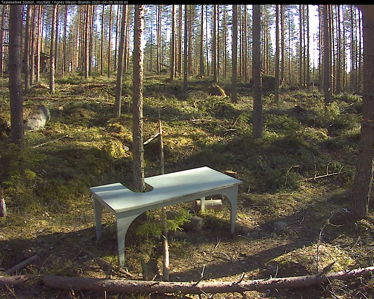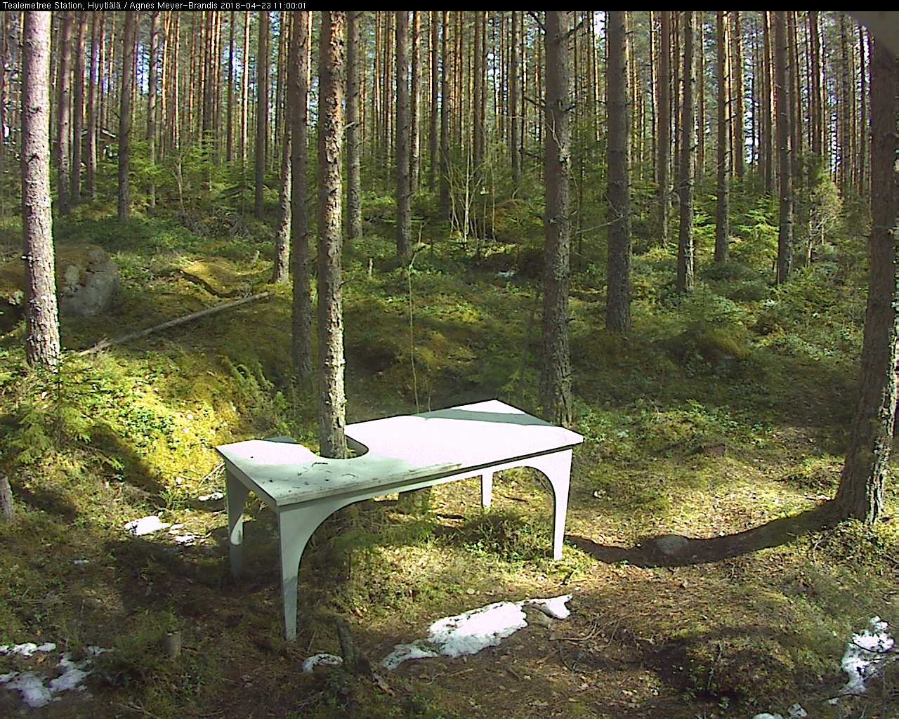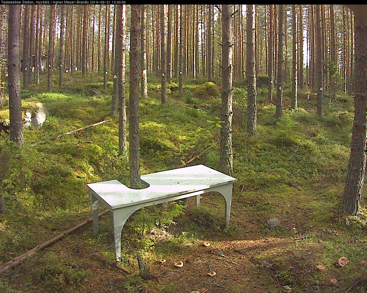 Agnes Meyer-Brandiksen työ Hyytiälässä alkoi tutustumalla aseman muihin tutkijoihin. Pystyäkseen tapaamaan ihmisiä metsässä, hän rakensi pöydän, josta muodostui kohtauspiste ja paikka teehetkille Agneksen ja puun kanssa.