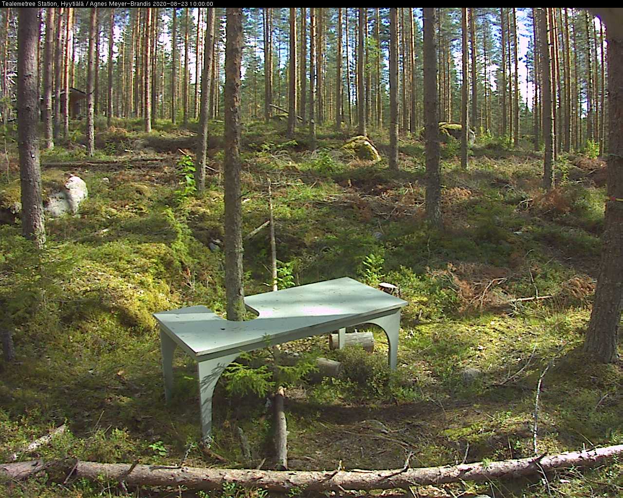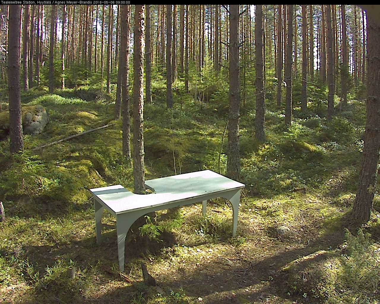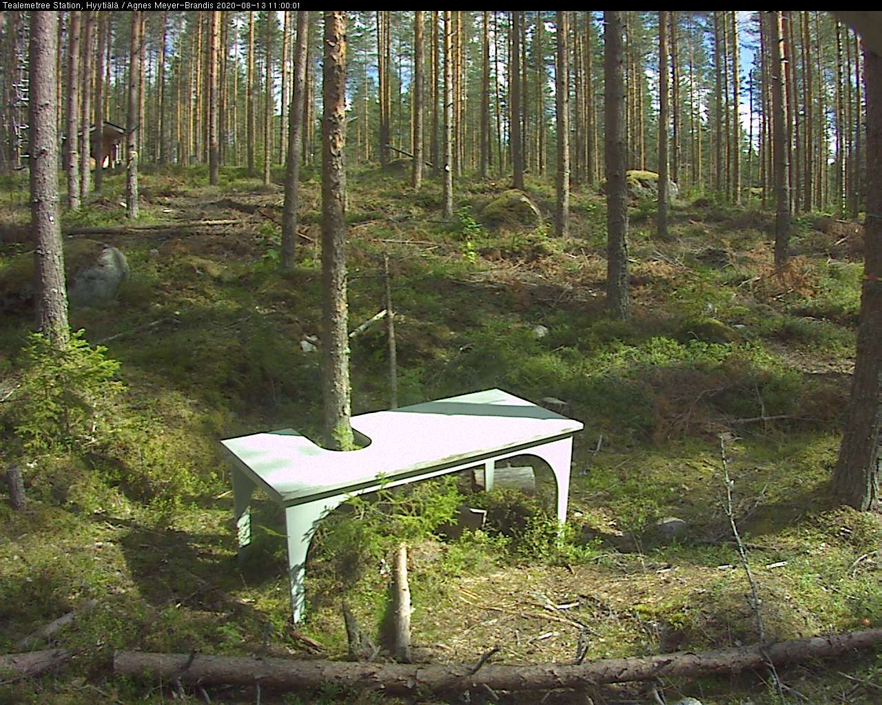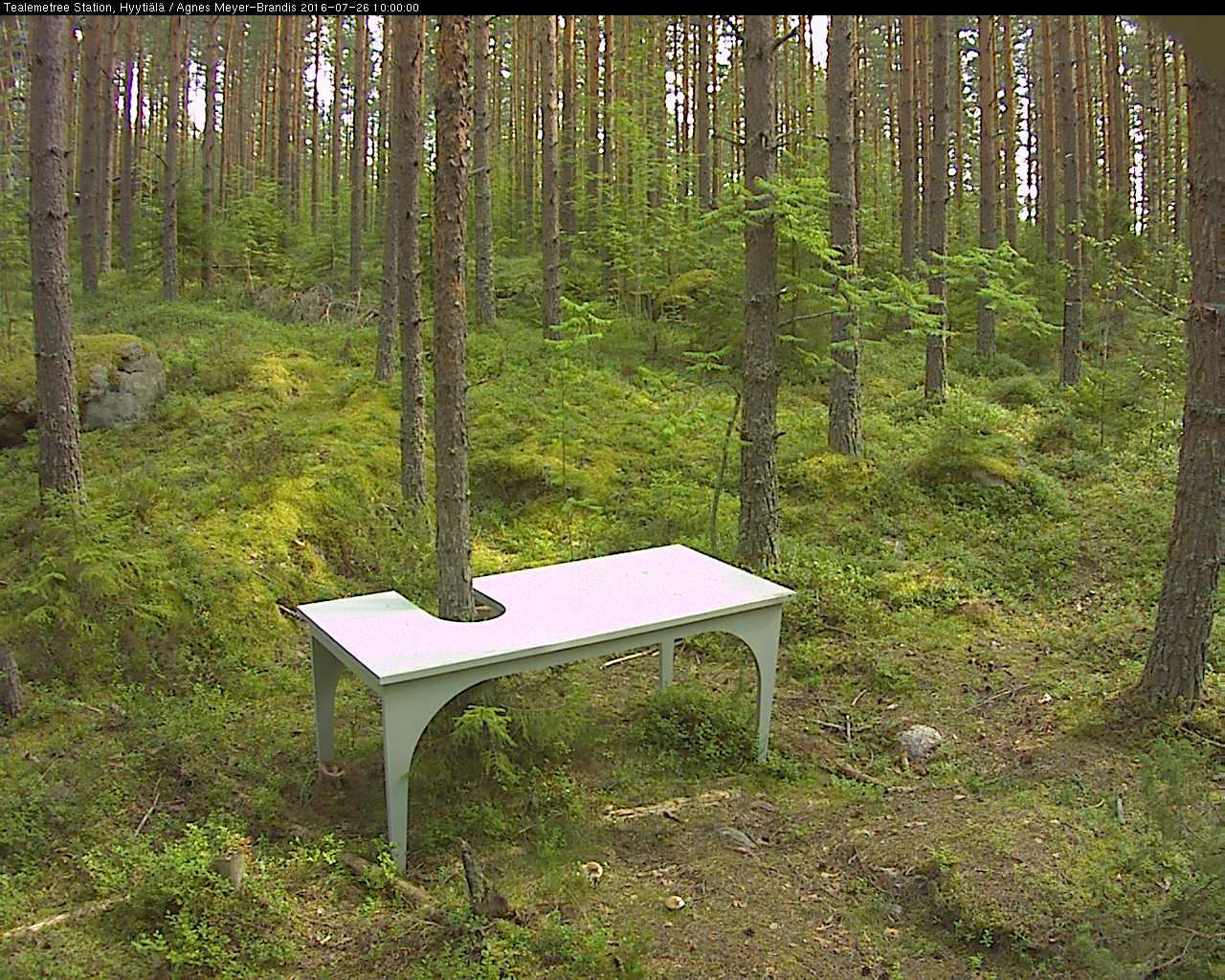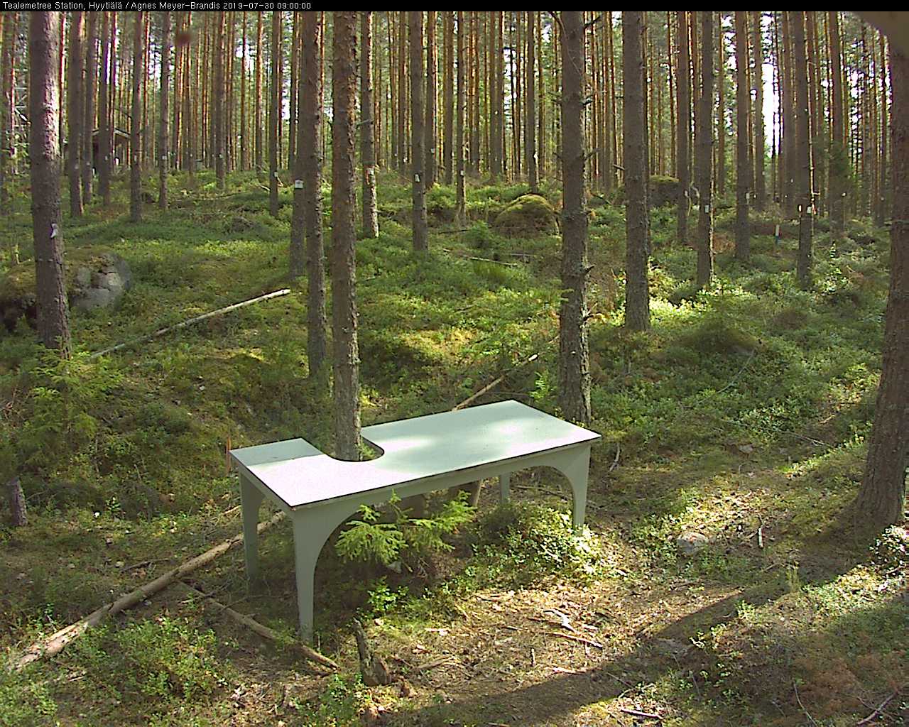 Agnes Meyer-Brandiksen työ Hyytiälässä alkoi tutustumalla aseman muihin tutkijoihin. Pystyäkseen tapaamaan ihmisiä metsässä, hän rakensi pöydän, josta muodostui kohtauspiste ja paikka teehetkille Agneksen ja puun kanssa.