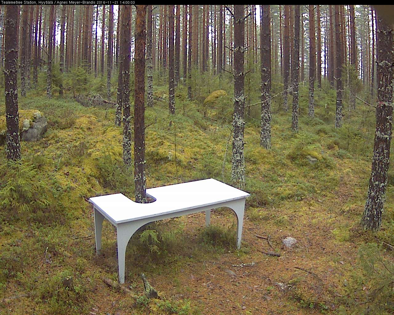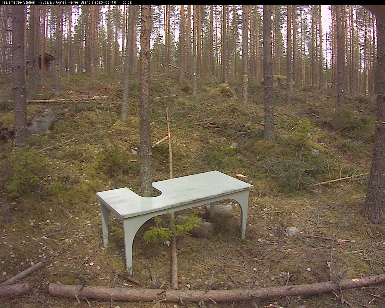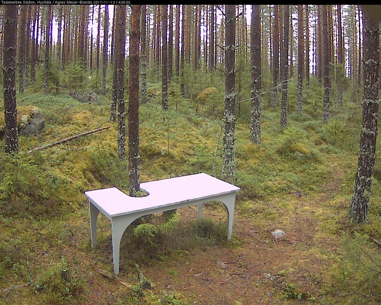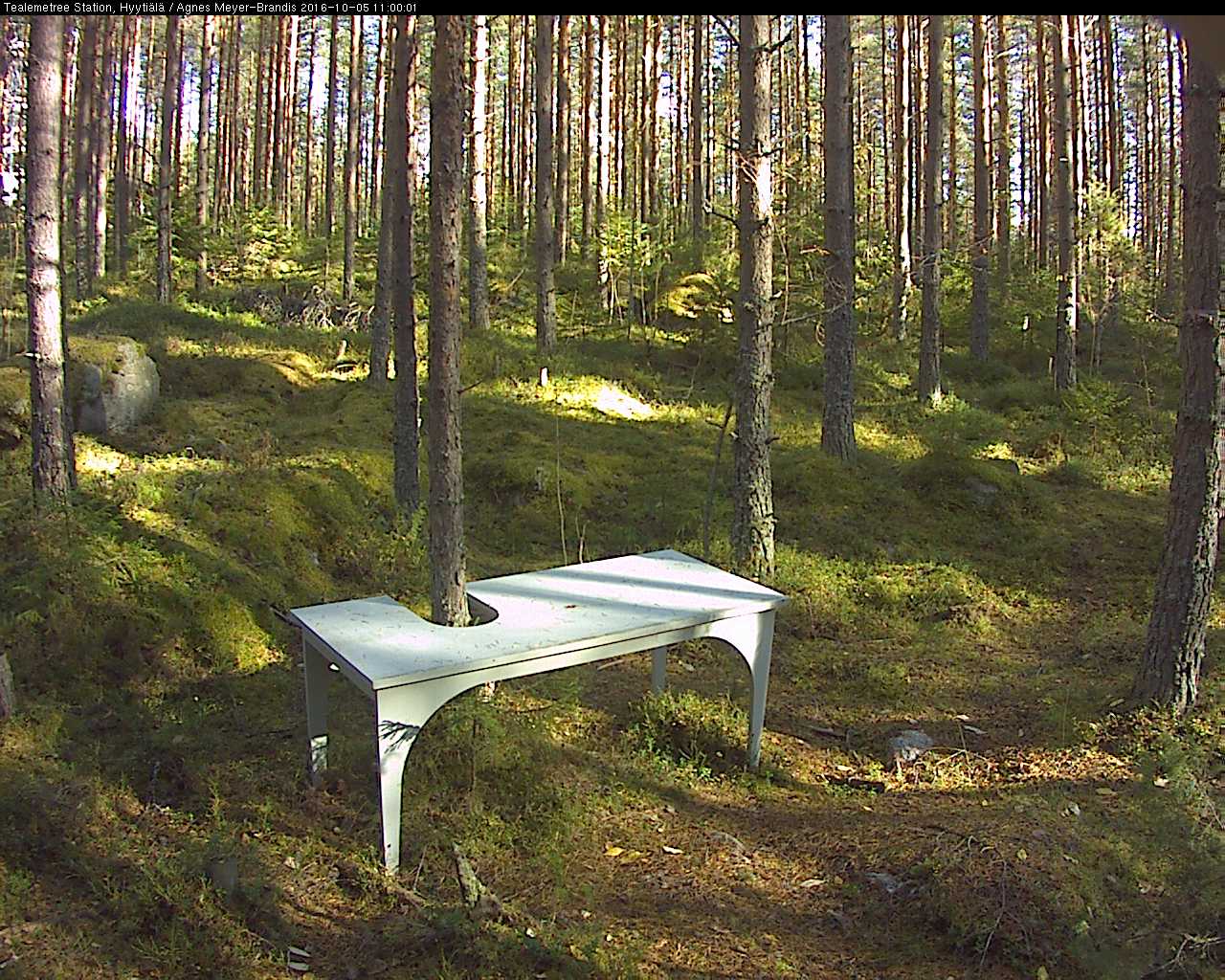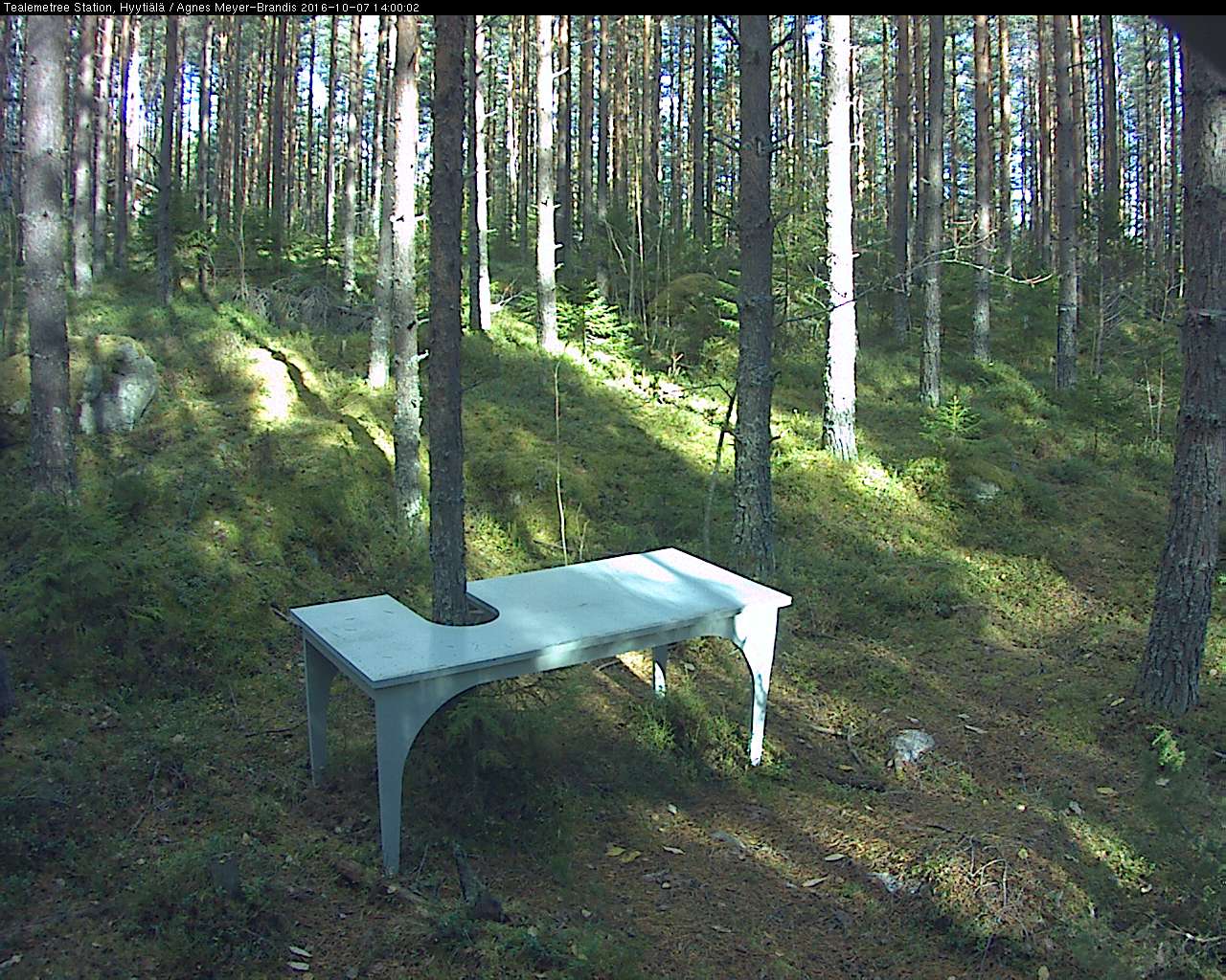 Agnes Meyer-Brandiksen työ Hyytiälässä alkoi tutustumalla aseman muihin tutkijoihin. Pystyäkseen tapaamaan ihmisiä metsässä, hän rakensi pöydän, josta muodostui kohtauspiste ja paikka teehetkille Agneksen ja puun kanssa.