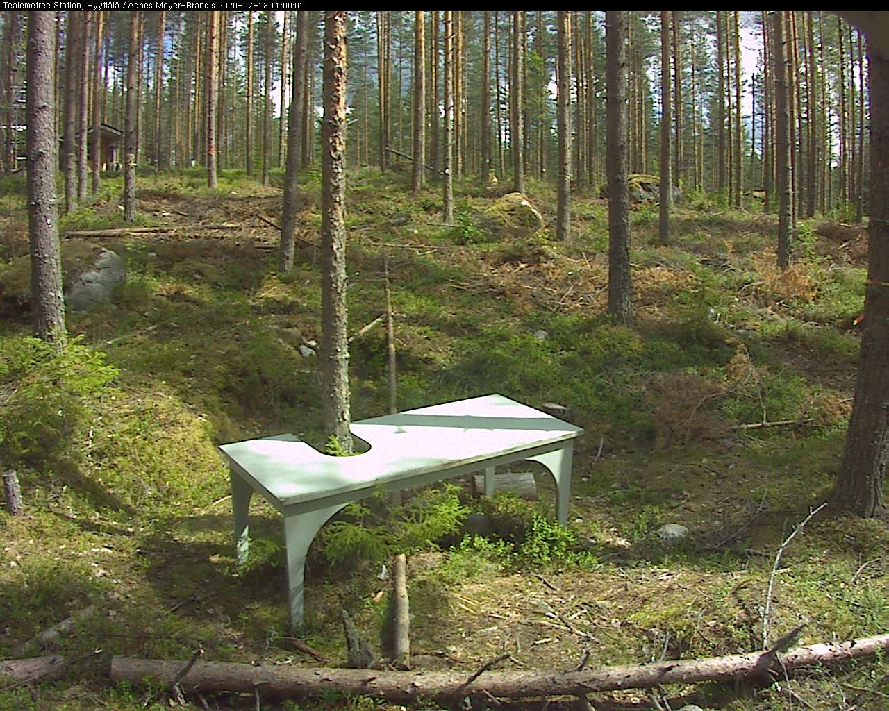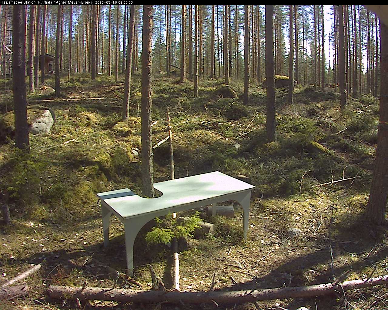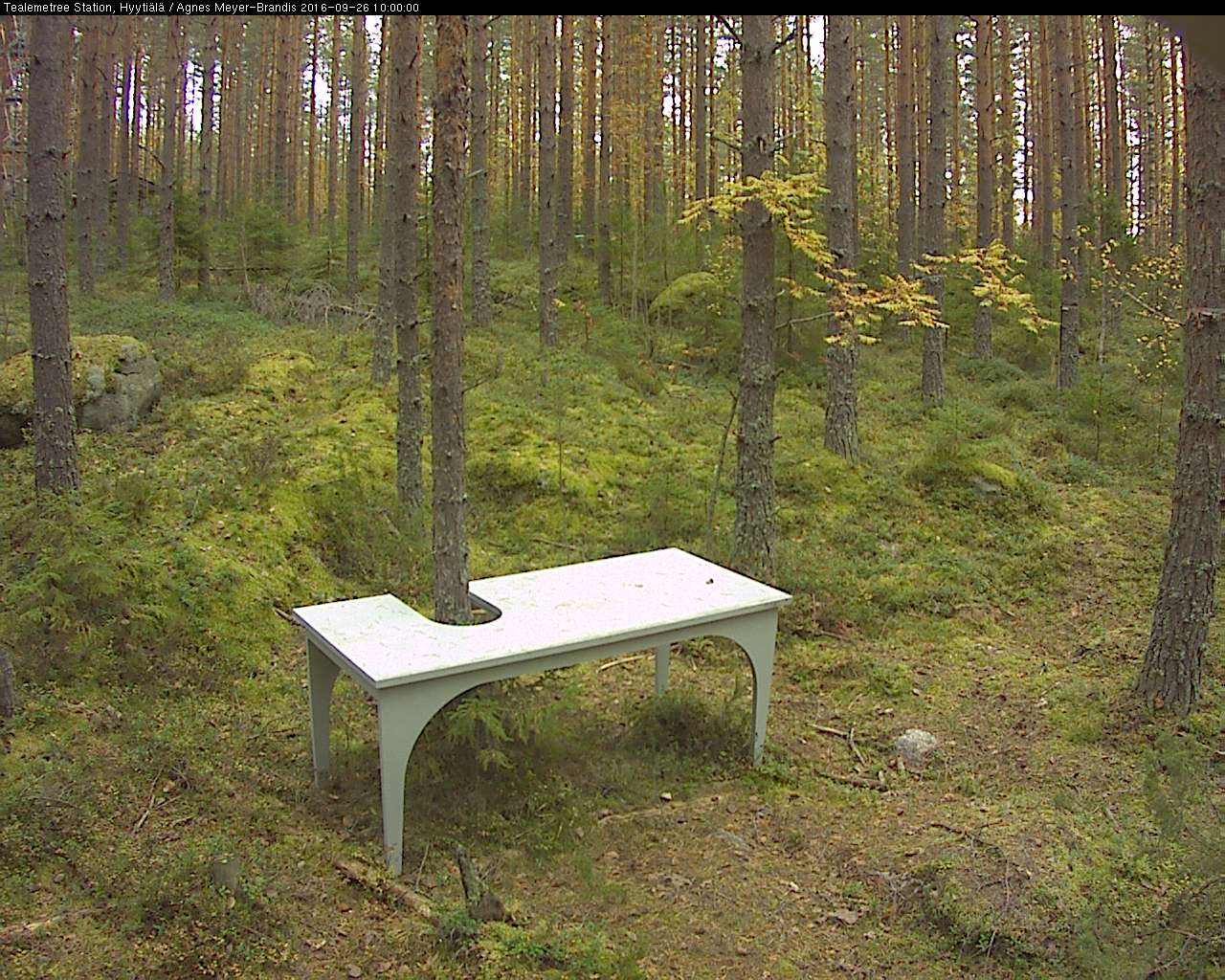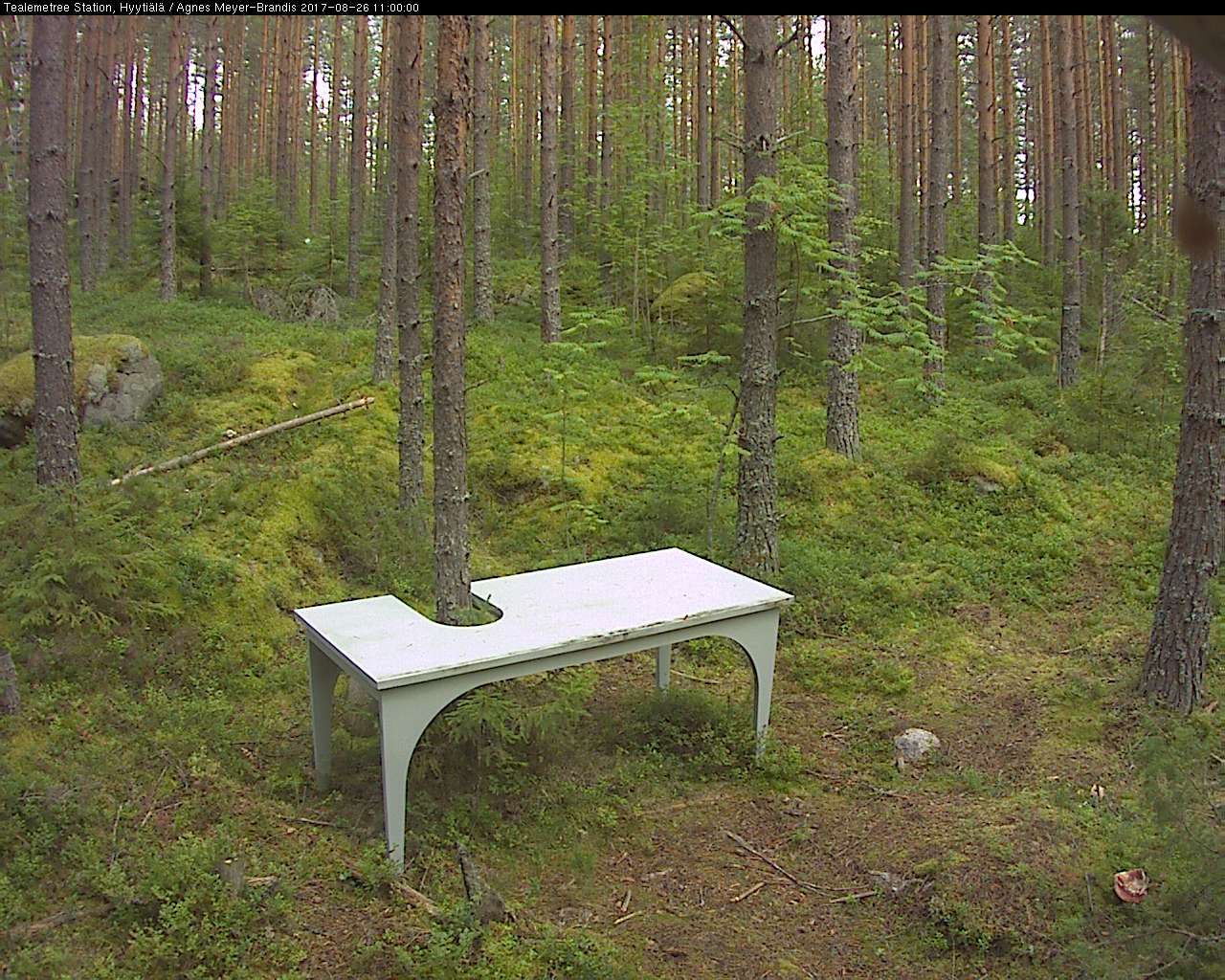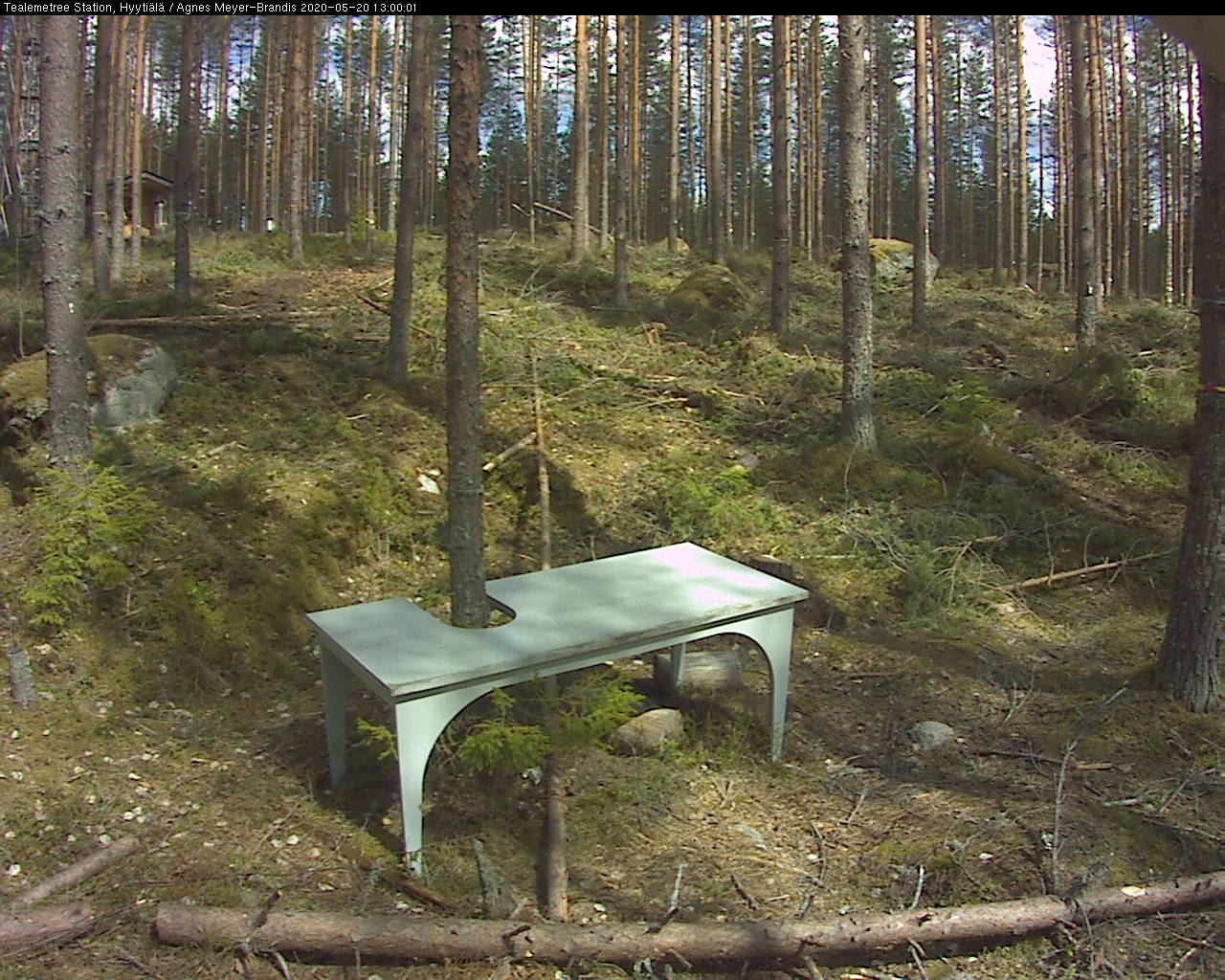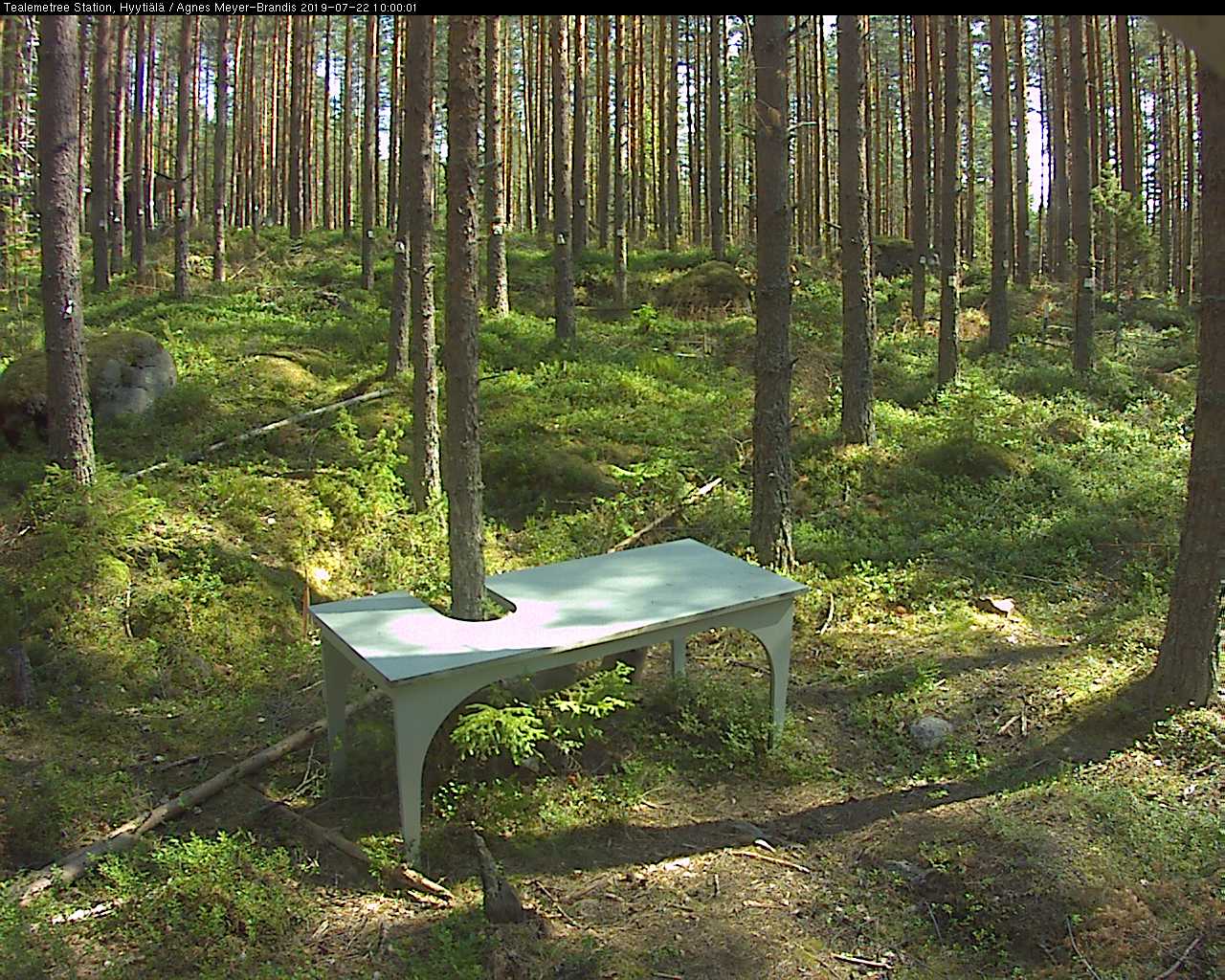 Agnes Meyer-Brandiksen työ Hyytiälässä alkoi tutustumalla aseman muihin tutkijoihin. Pystyäkseen tapaamaan ihmisiä metsässä, hän rakensi pöydän, josta muodostui kohtauspiste ja paikka teehetkille Agneksen ja puun kanssa.