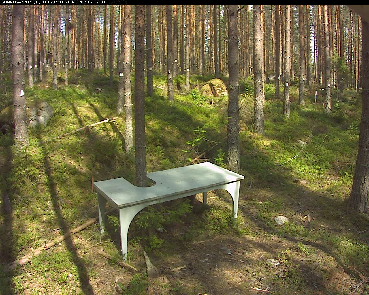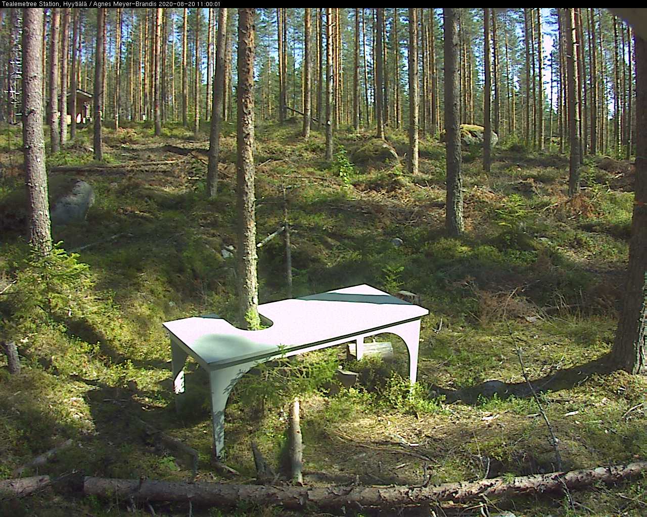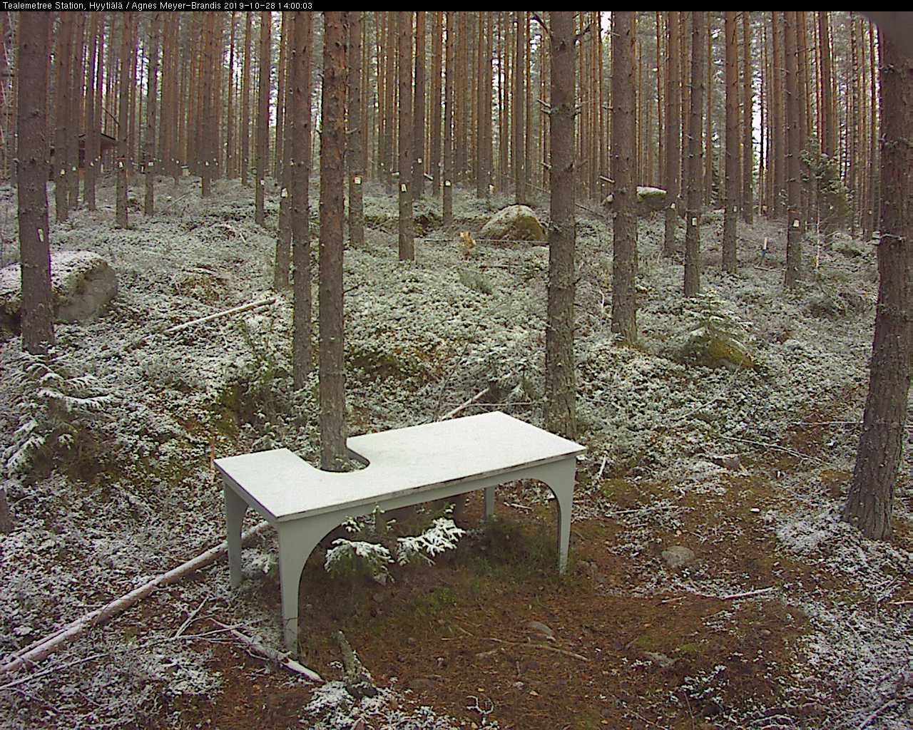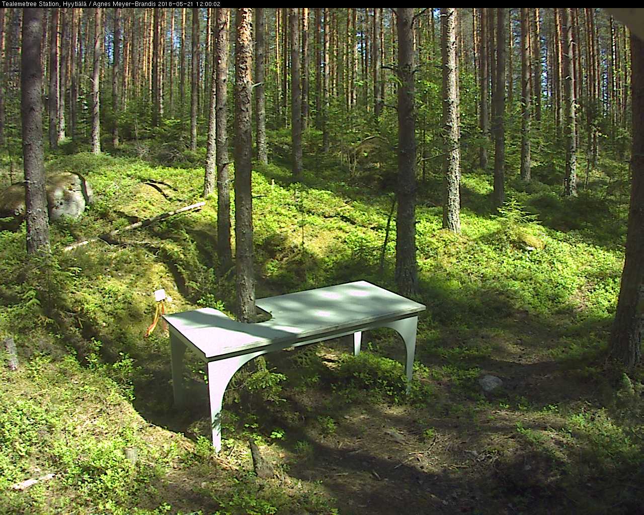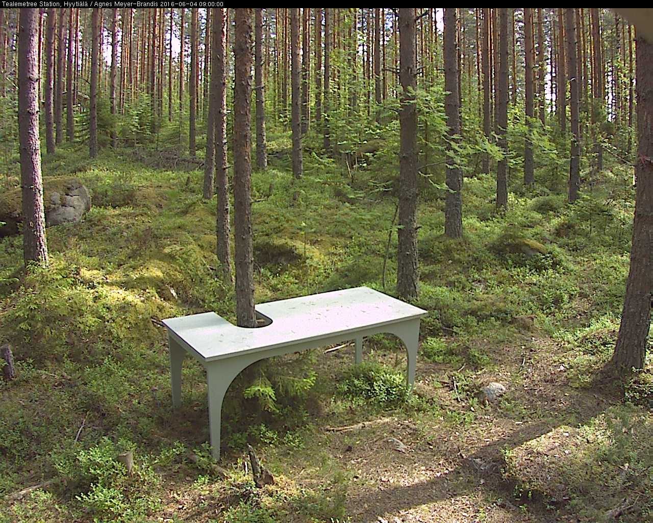 Agnes Meyer-Brandiksen työ Hyytiälässä alkoi tutustumalla aseman muihin tutkijoihin. Pystyäkseen tapaamaan ihmisiä metsässä, hän rakensi pöydän, josta muodostui kohtauspiste ja paikka teehetkille Agneksen ja puun kanssa.