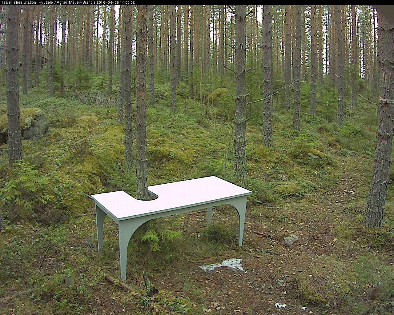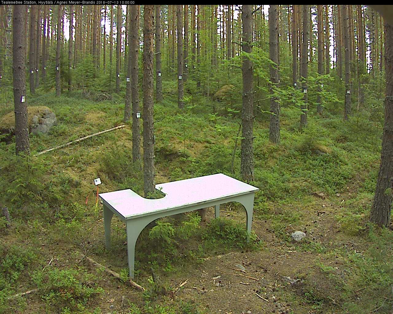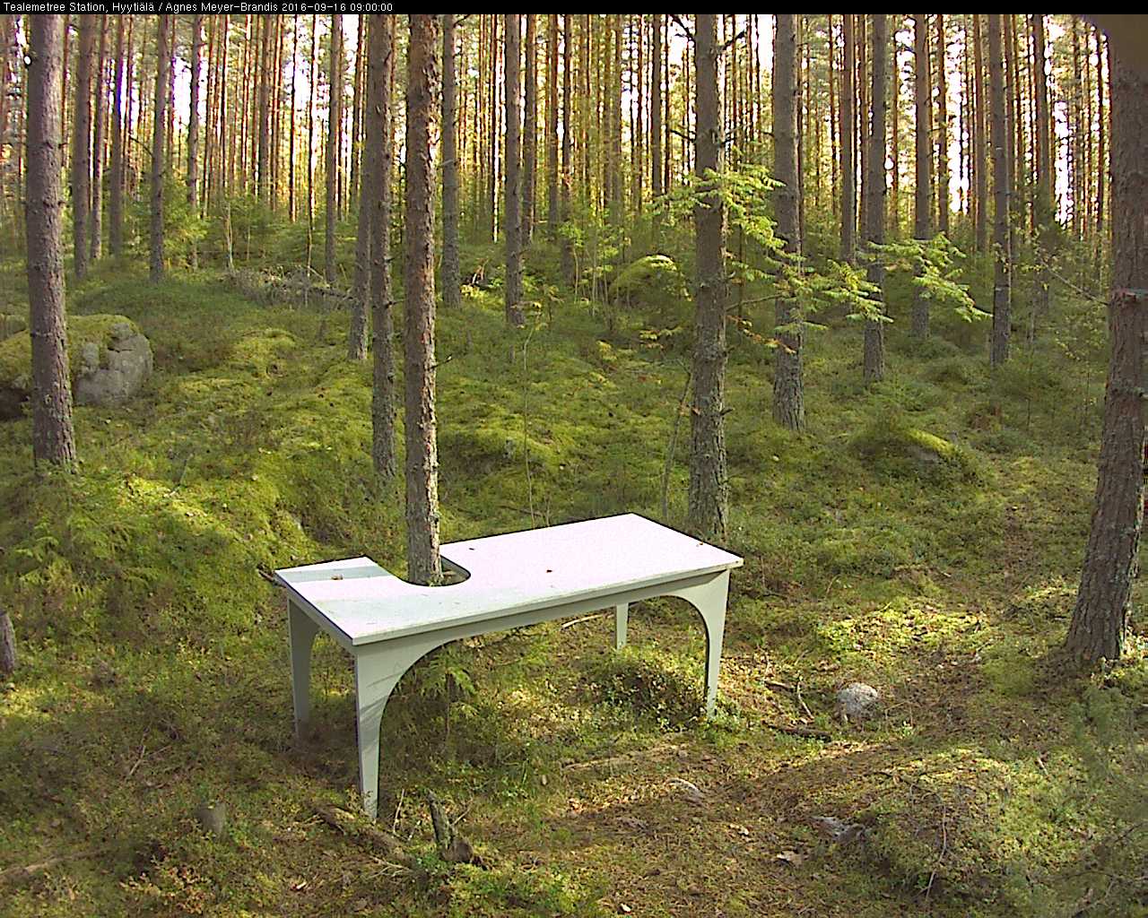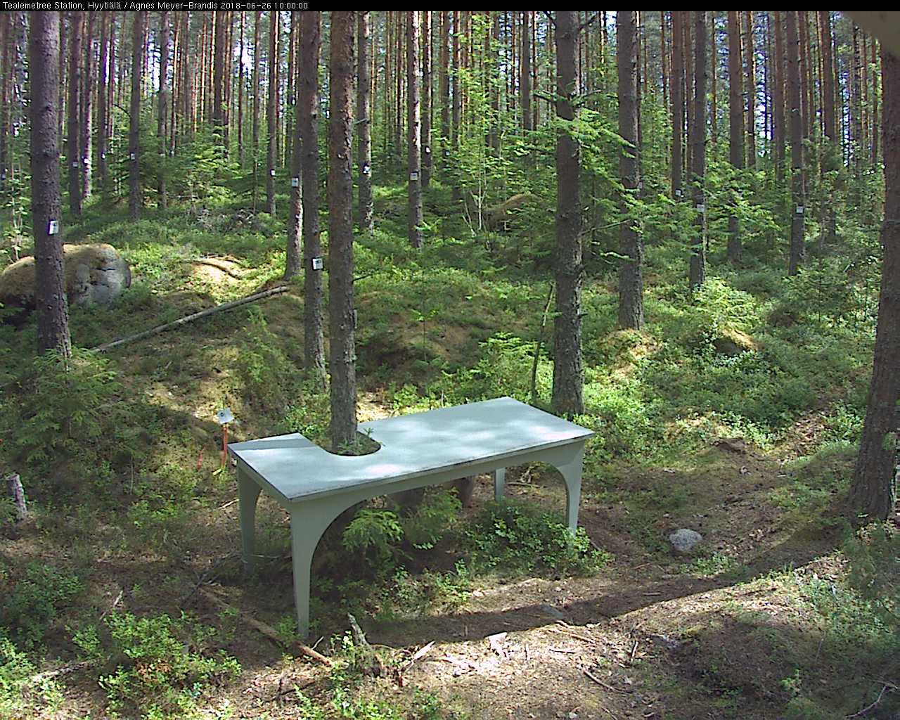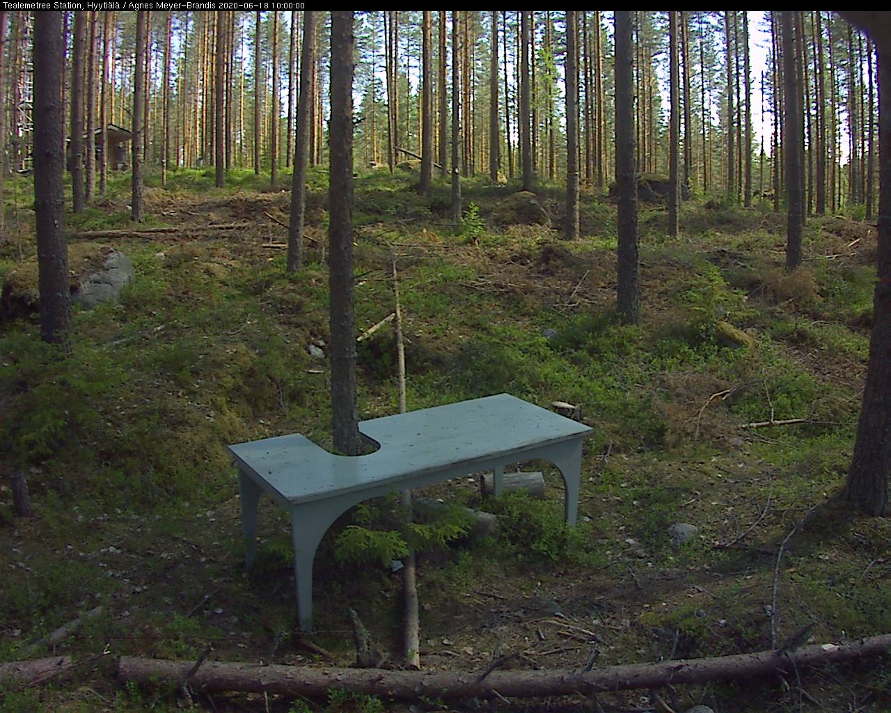 Agnes Meyer-Brandiksen työ Hyytiälässä alkoi tutustumalla aseman muihin tutkijoihin. Pystyäkseen tapaamaan ihmisiä metsässä, hän rakensi pöydän, josta muodostui kohtauspiste ja paikka teehetkille Agneksen ja puun kanssa.