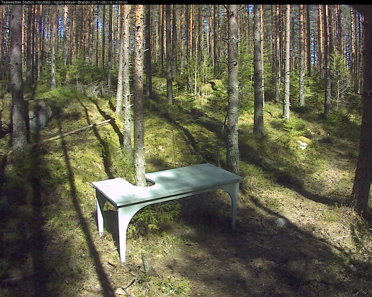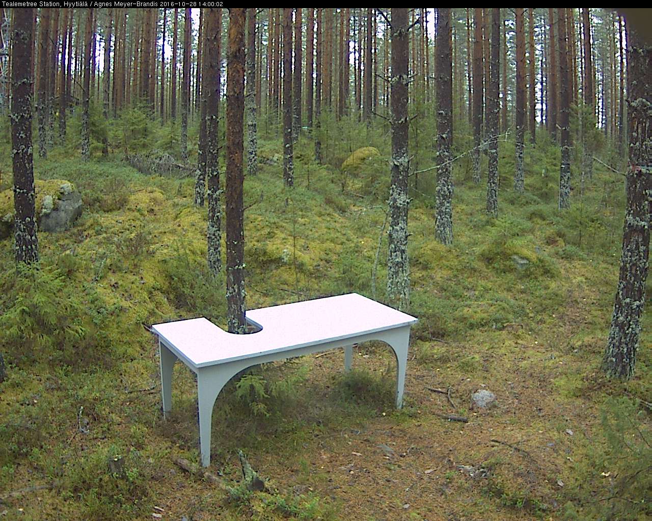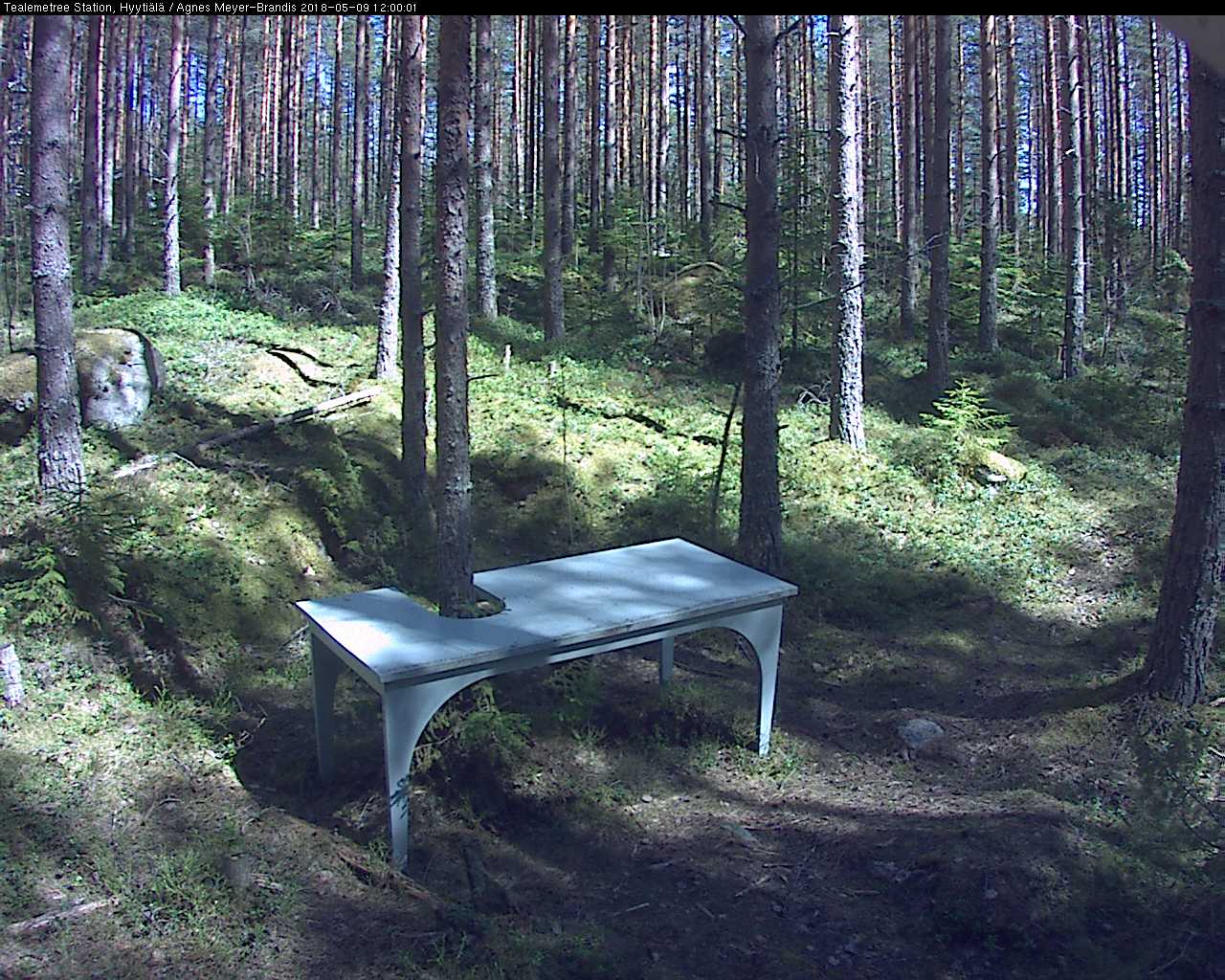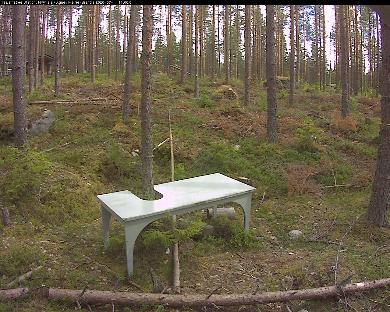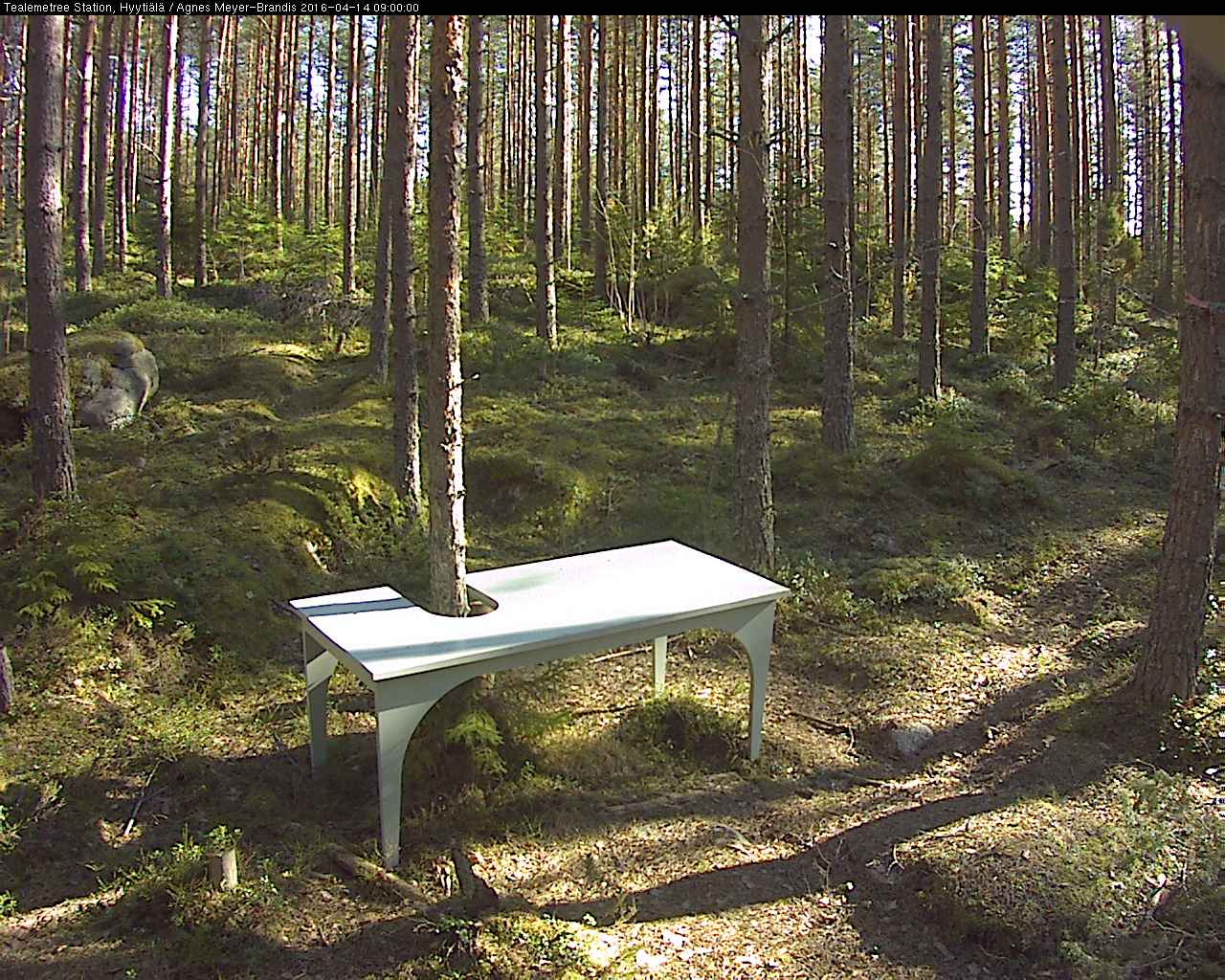 Agnes Meyer-Brandiksen työ Hyytiälässä alkoi tutustumalla aseman muihin tutkijoihin. Pystyäkseen tapaamaan ihmisiä metsässä, hän rakensi pöydän, josta muodostui kohtauspiste ja paikka teehetkille Agneksen ja puun kanssa.