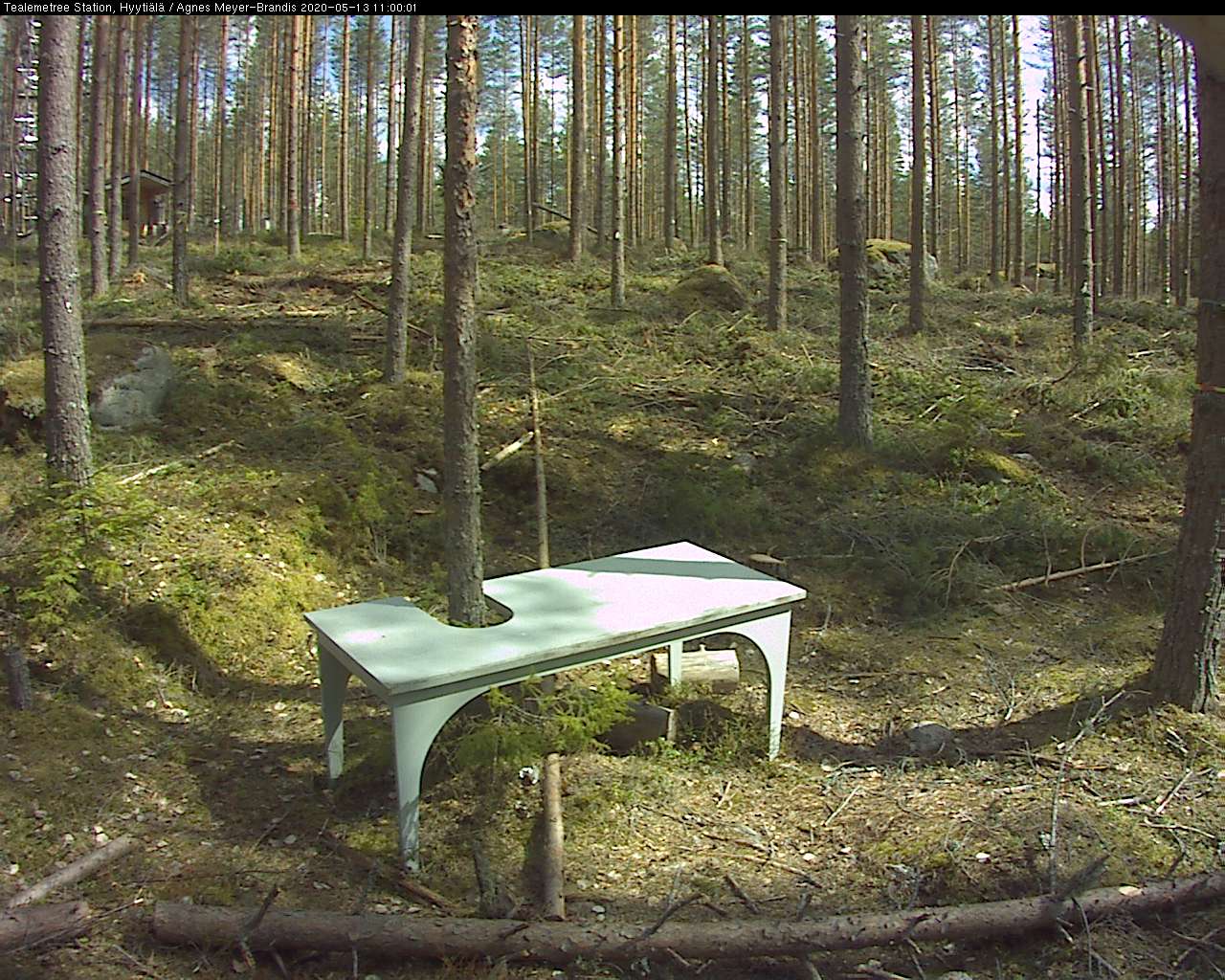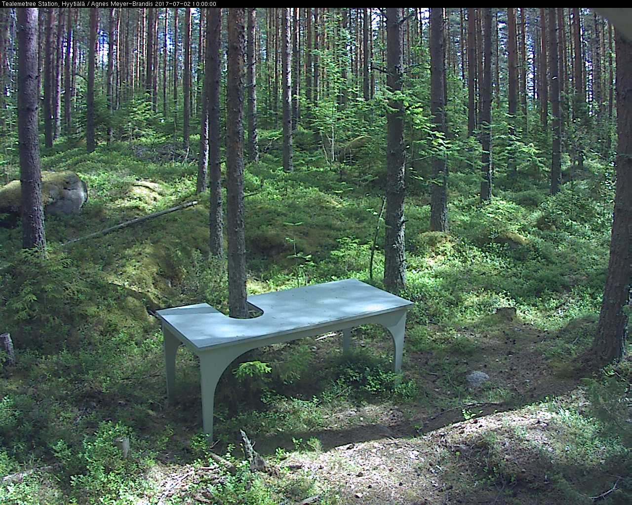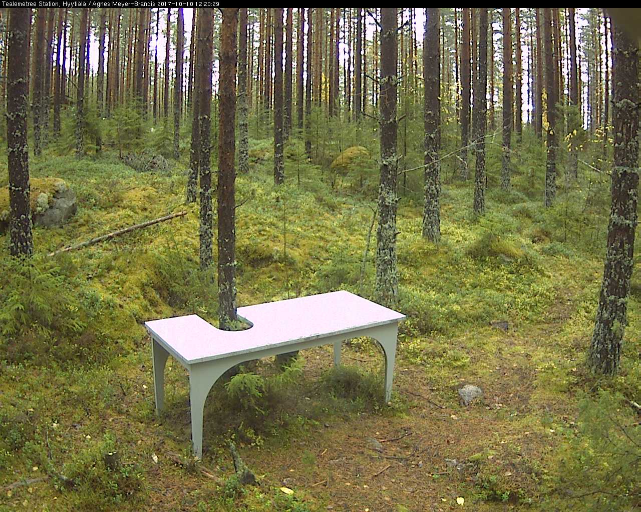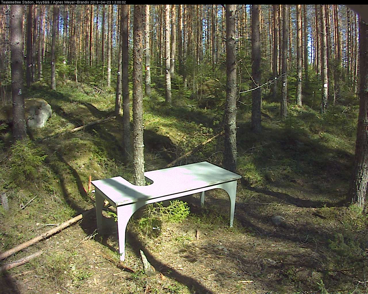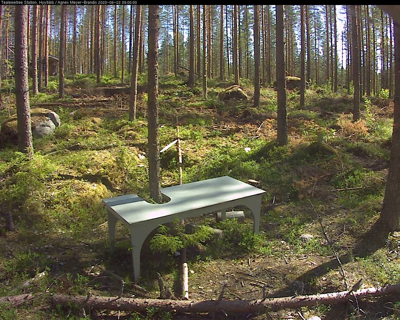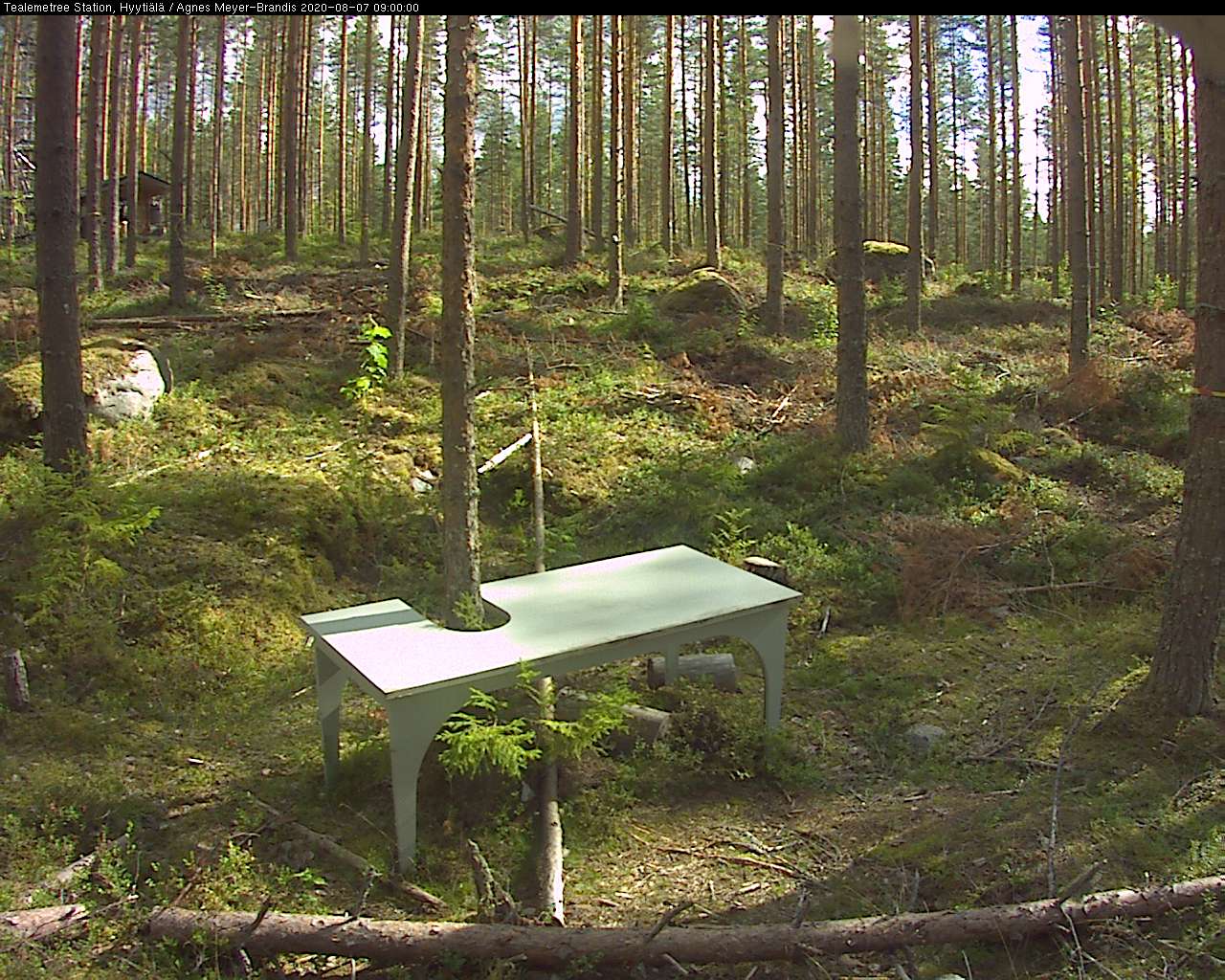Agnes Meyer-Brandiksen työ Hyytiälässä alkoi tutustumalla aseman muihin tutkijoihin. Pystyäkseen tapaamaan ihmisiä metsässä, hän rakensi pöydän, josta muodostui kohtauspiste ja paikka teehetkille Agneksen ja puun kanssa.