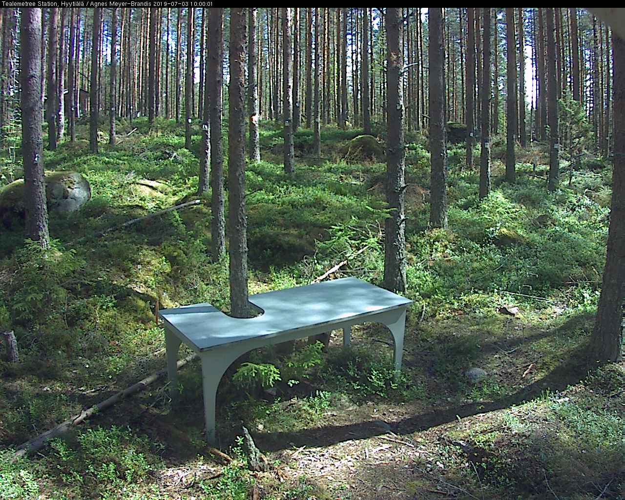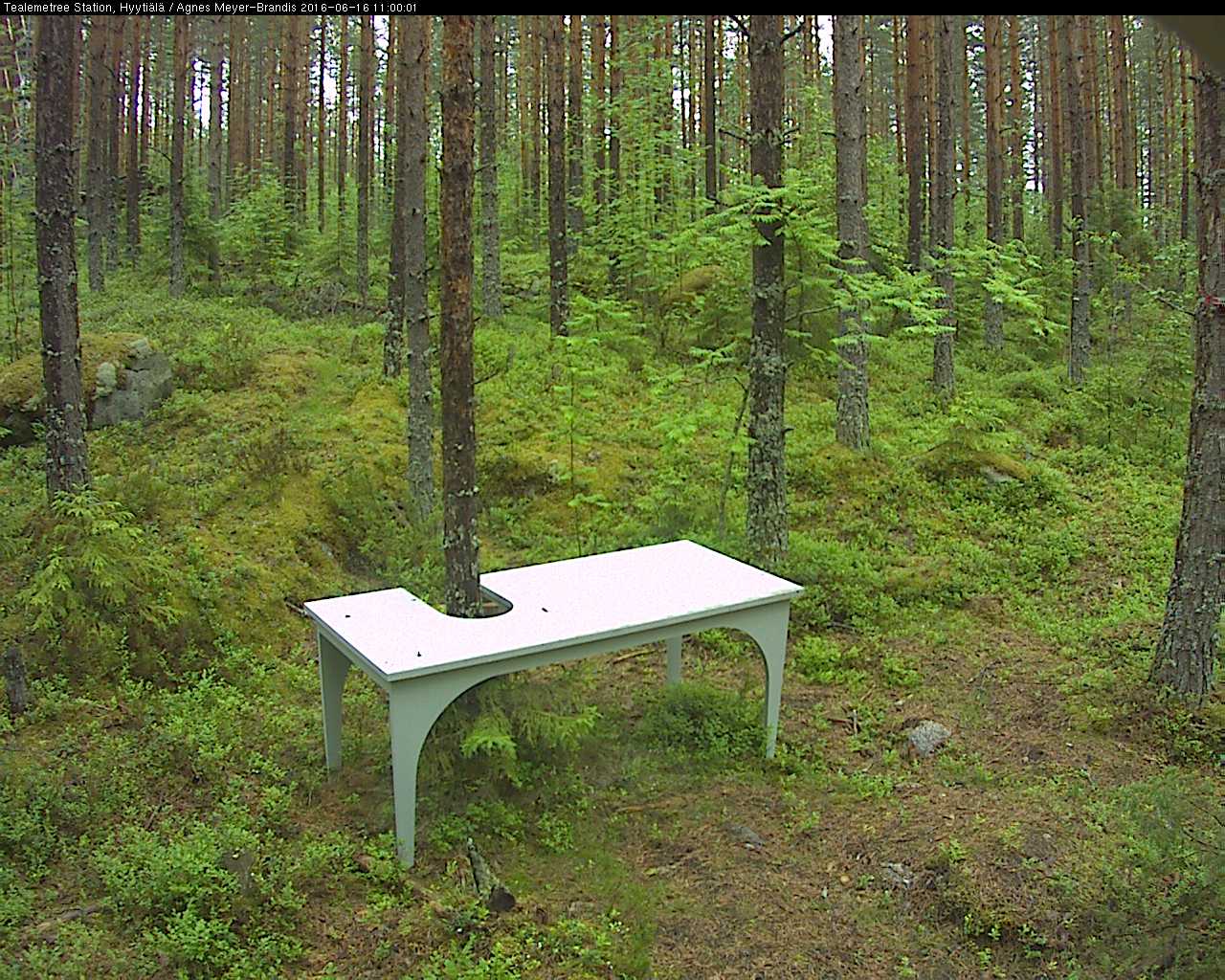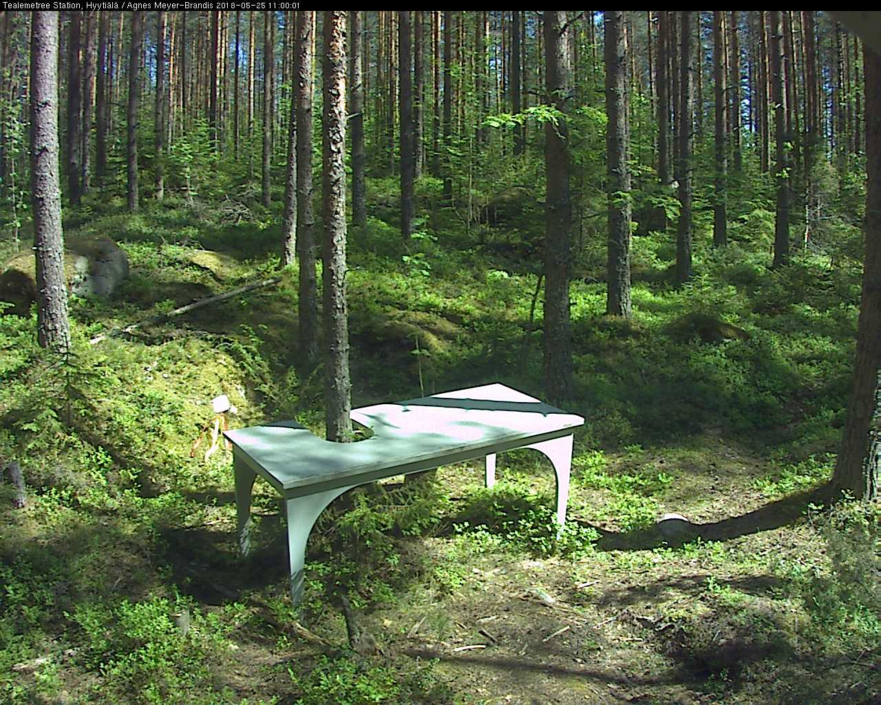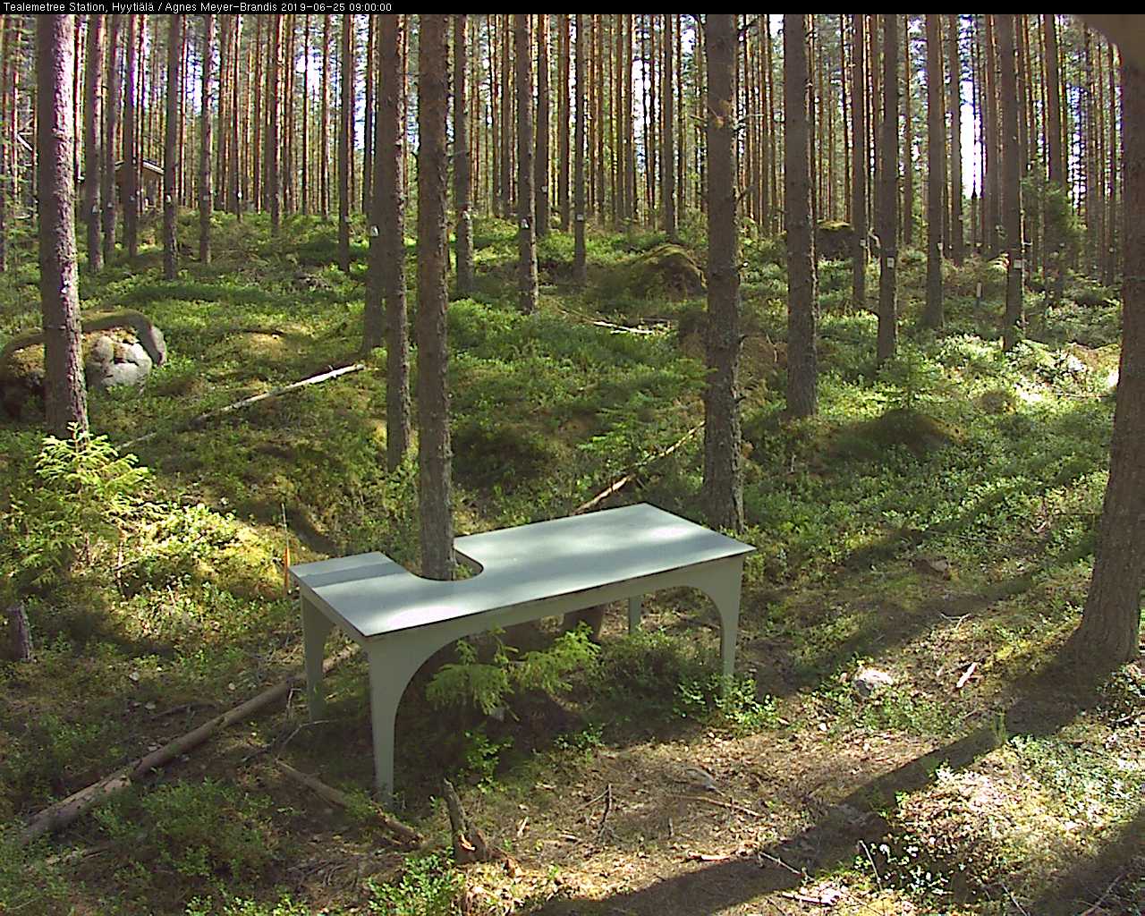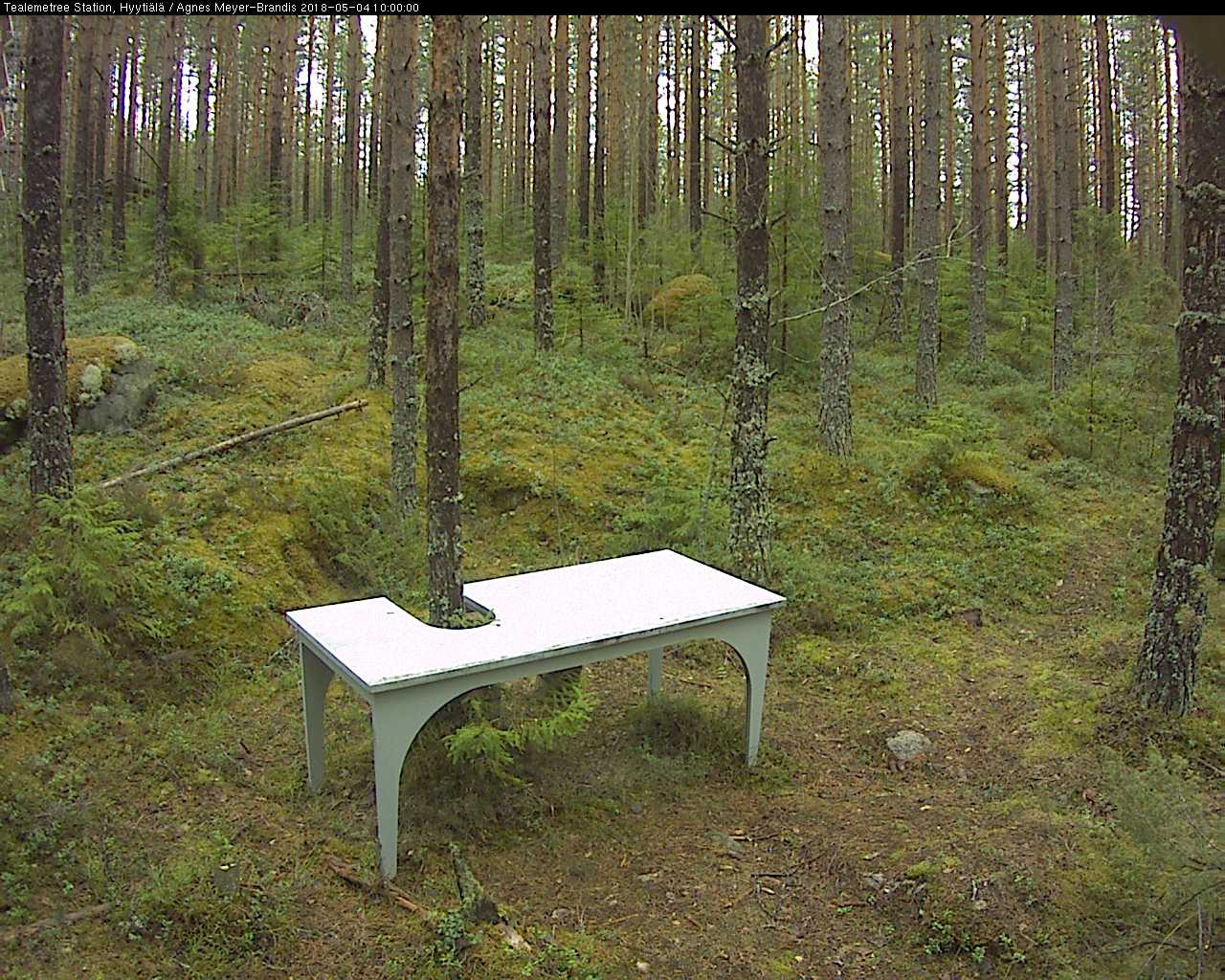 Agnes Meyer-Brandiksen työ Hyytiälässä alkoi tutustumalla aseman muihin tutkijoihin. Pystyäkseen tapaamaan ihmisiä metsässä, hän rakensi pöydän, josta muodostui kohtauspiste ja paikka teehetkille Agneksen ja puun kanssa.