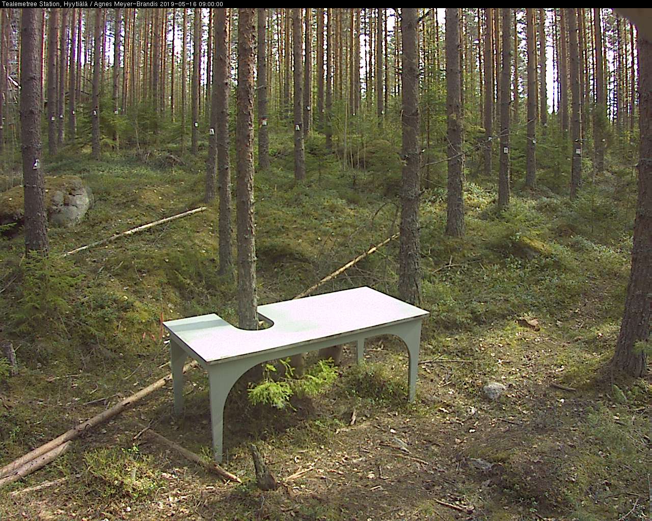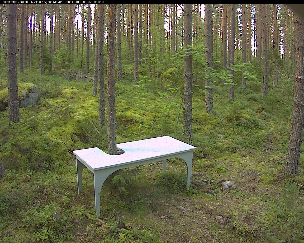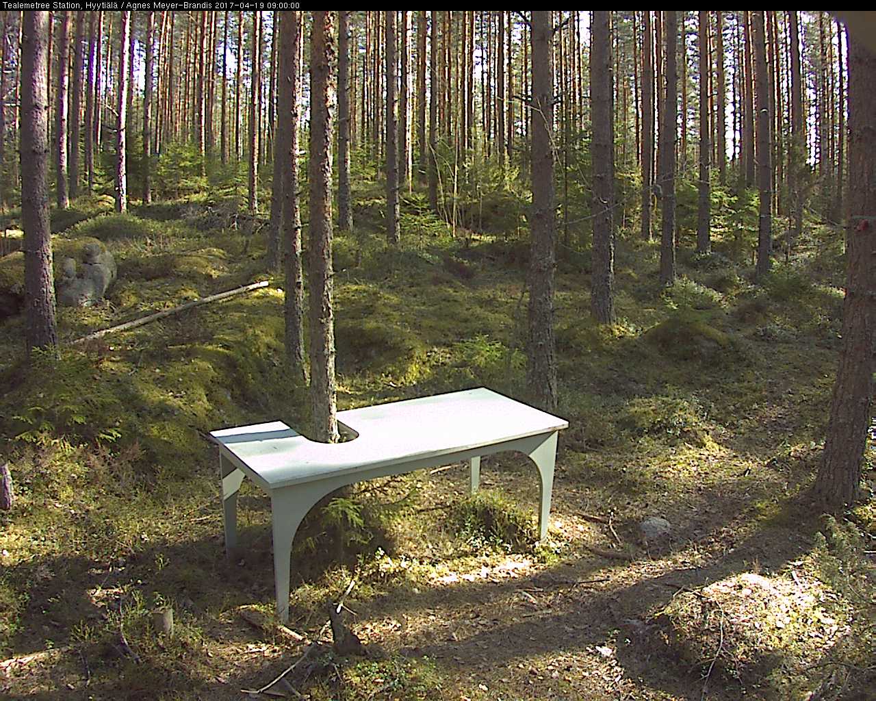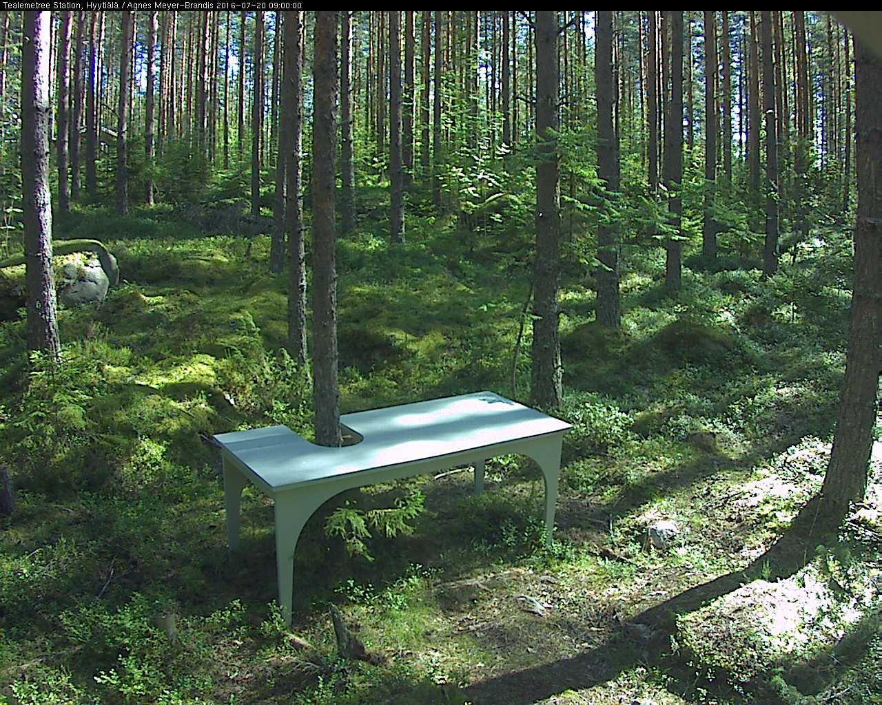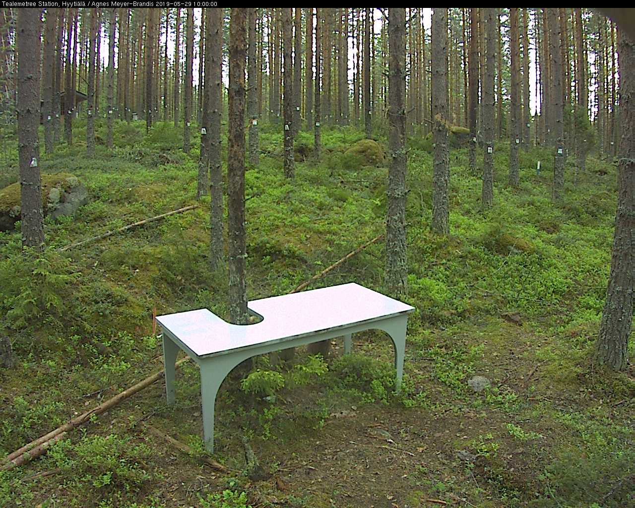 Agnes Meyer-Brandiksen työ Hyytiälässä alkoi tutustumalla aseman muihin tutkijoihin. Pystyäkseen tapaamaan ihmisiä metsässä, hän rakensi pöydän, josta muodostui kohtauspiste ja paikka teehetkille Agneksen ja puun kanssa.