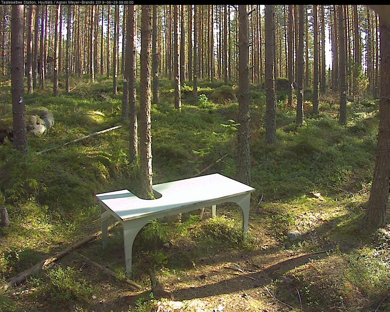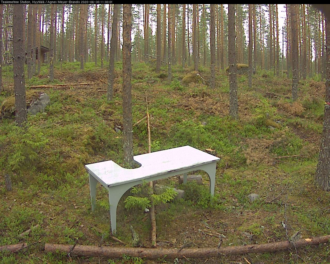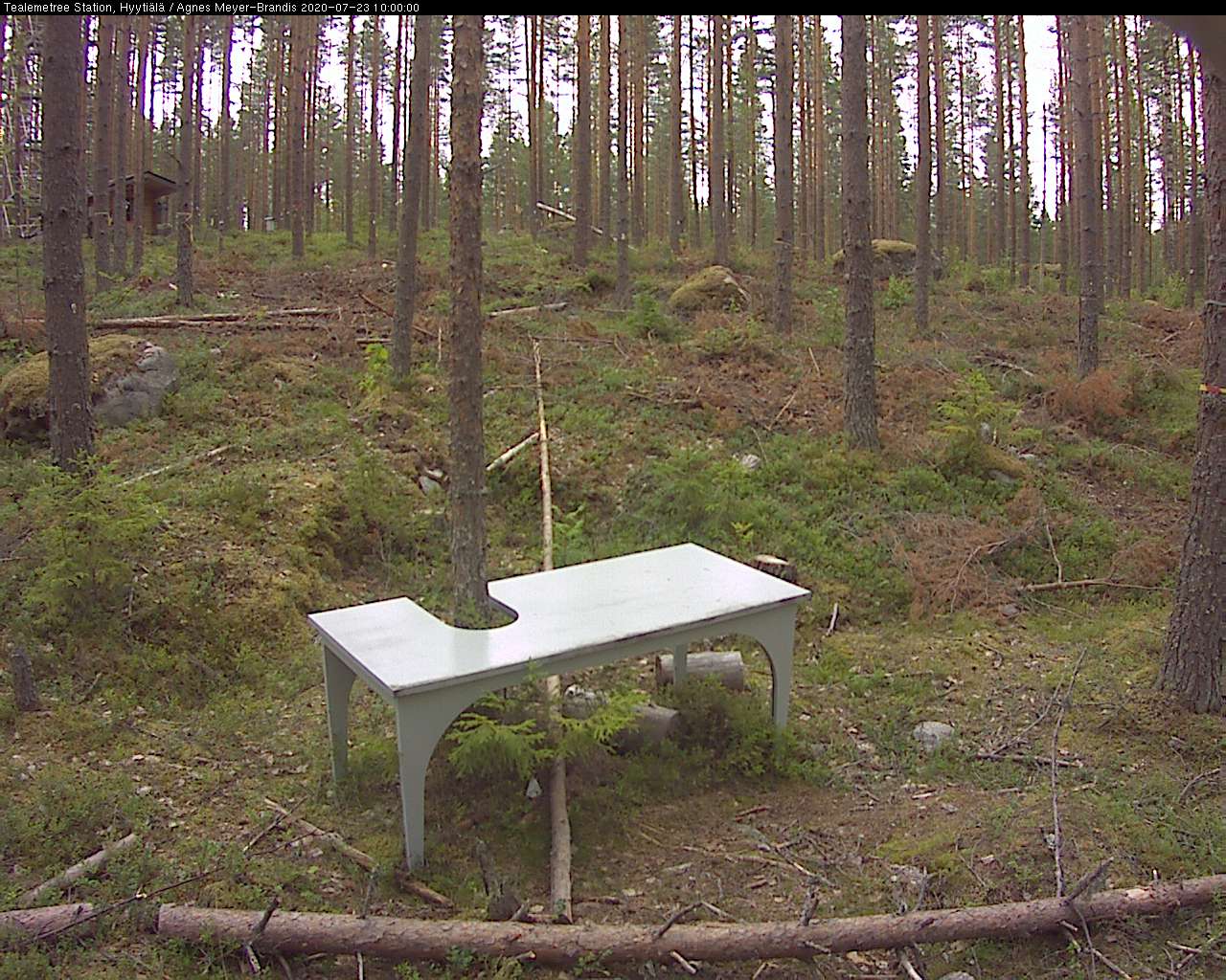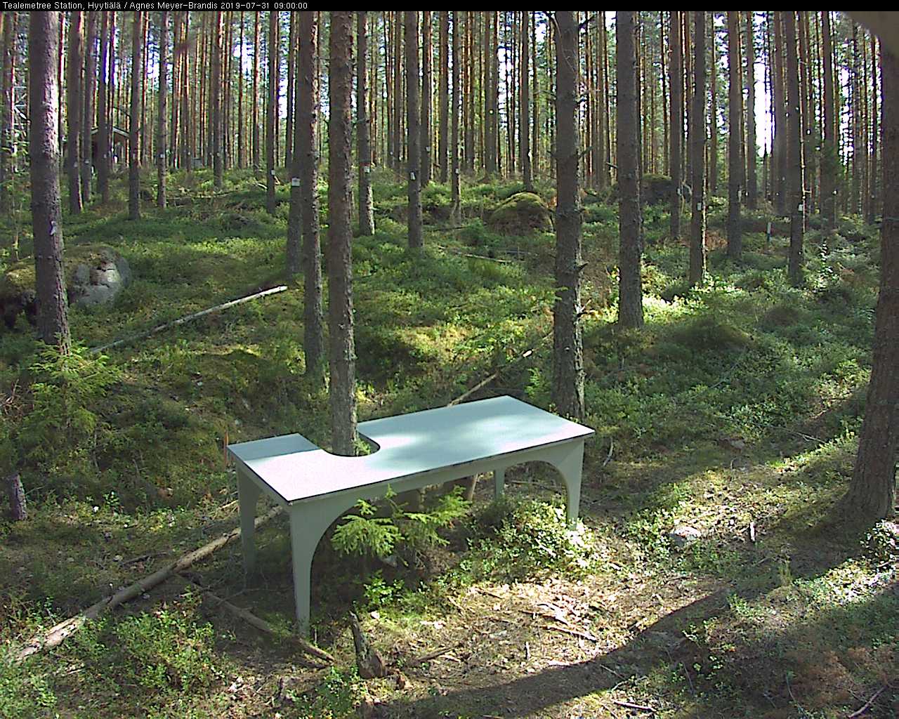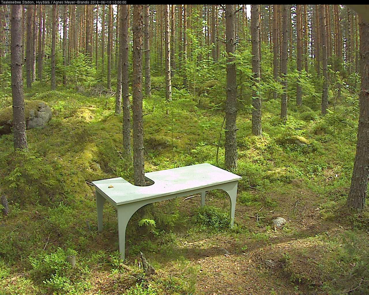 Agnes Meyer-Brandiksen työ Hyytiälässä alkoi tutustumalla aseman muihin tutkijoihin. Pystyäkseen tapaamaan ihmisiä metsässä, hän rakensi pöydän, josta muodostui kohtauspiste ja paikka teehetkille Agneksen ja puun kanssa.