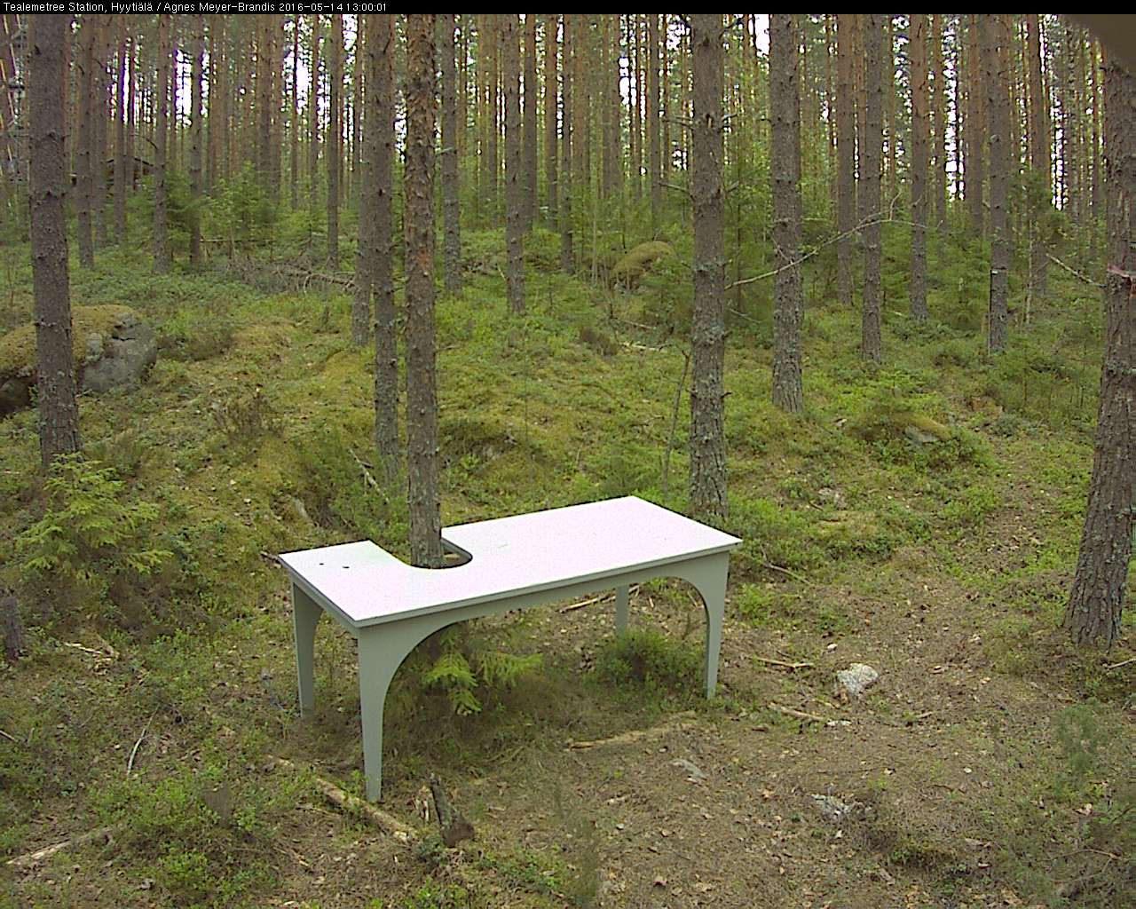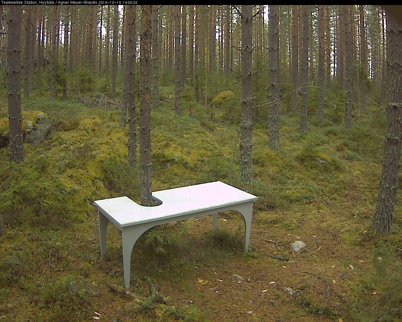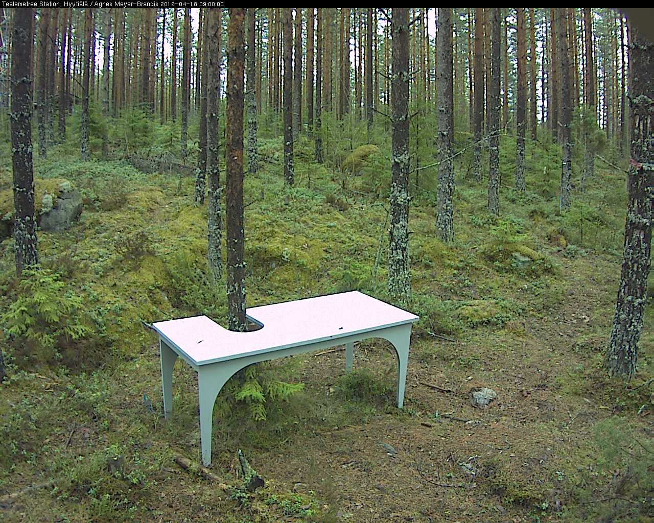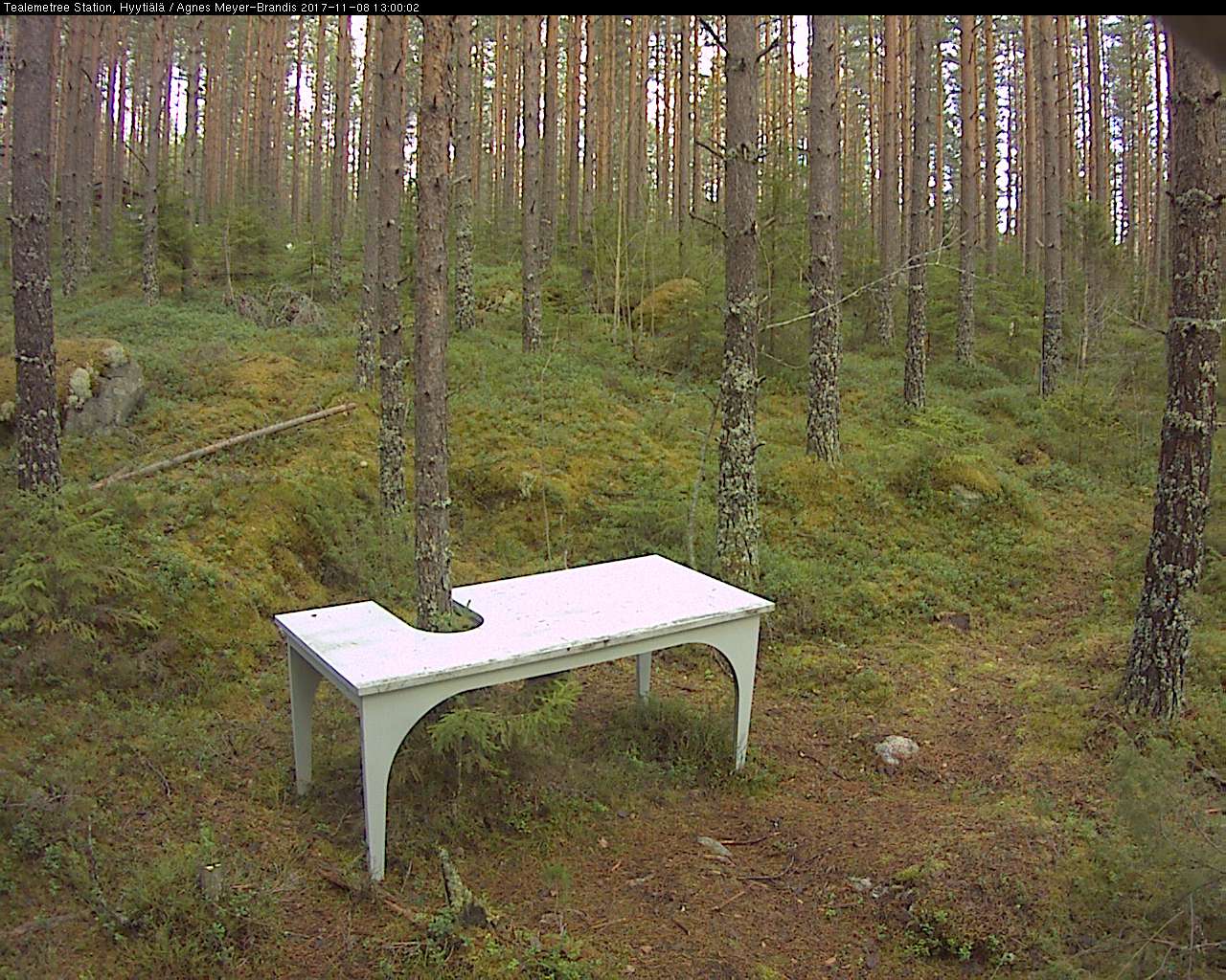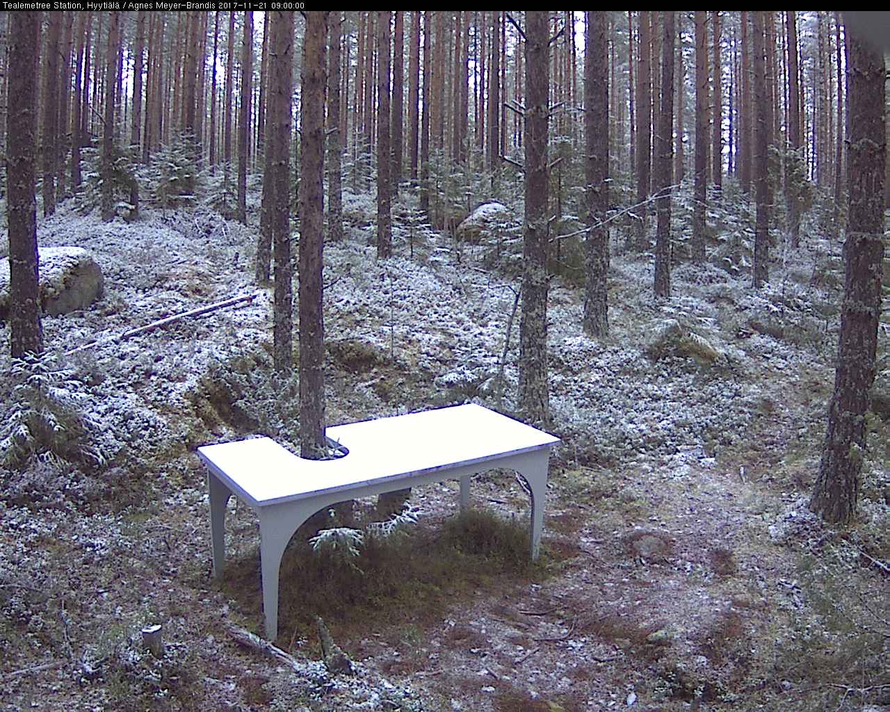 Agnes Meyer-Brandiksen työ Hyytiälässä alkoi tutustumalla aseman muihin tutkijoihin. Pystyäkseen tapaamaan ihmisiä metsässä, hän rakensi pöydän, josta muodostui kohtauspiste ja paikka teehetkille Agneksen ja puun kanssa.