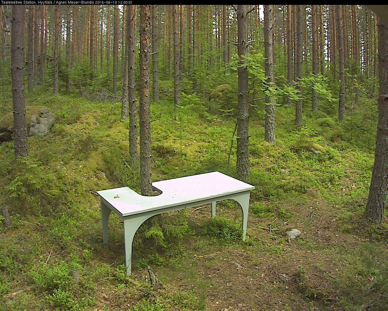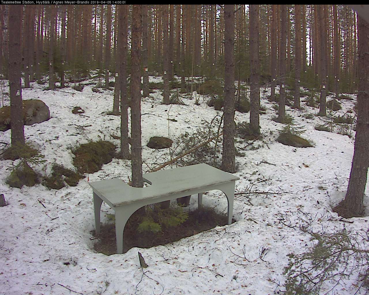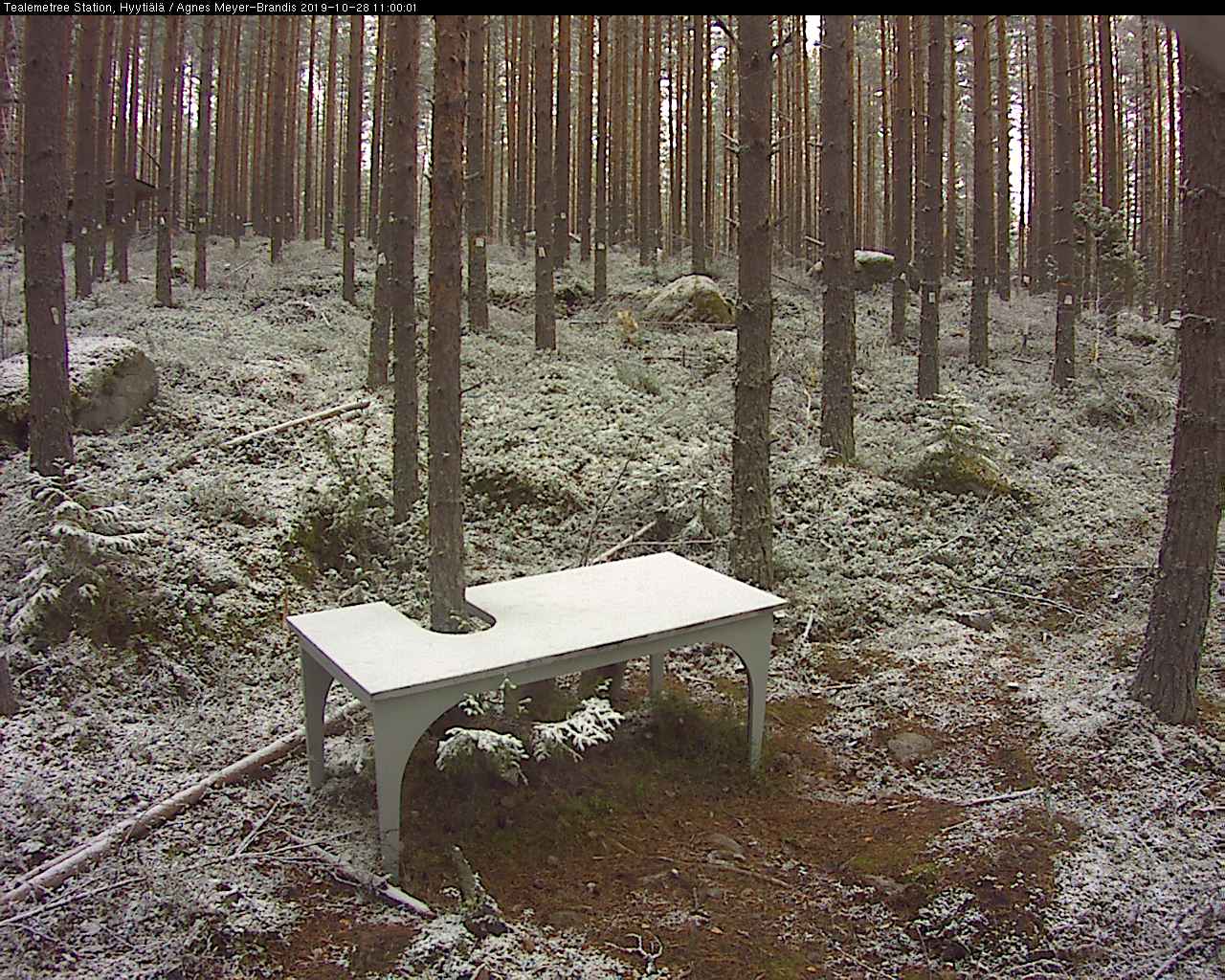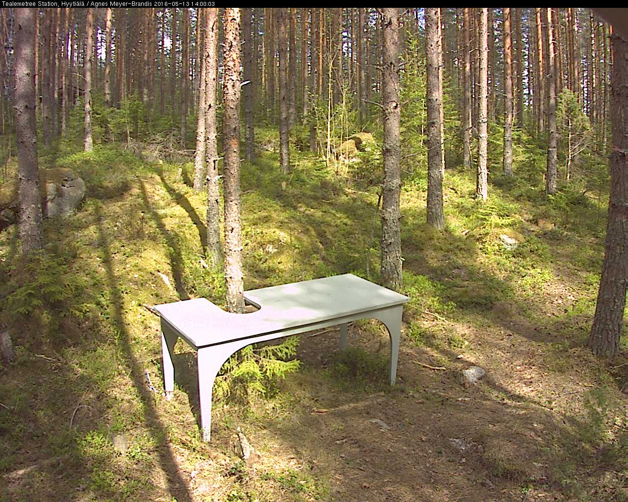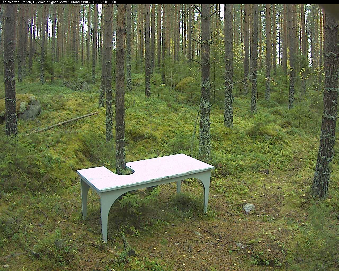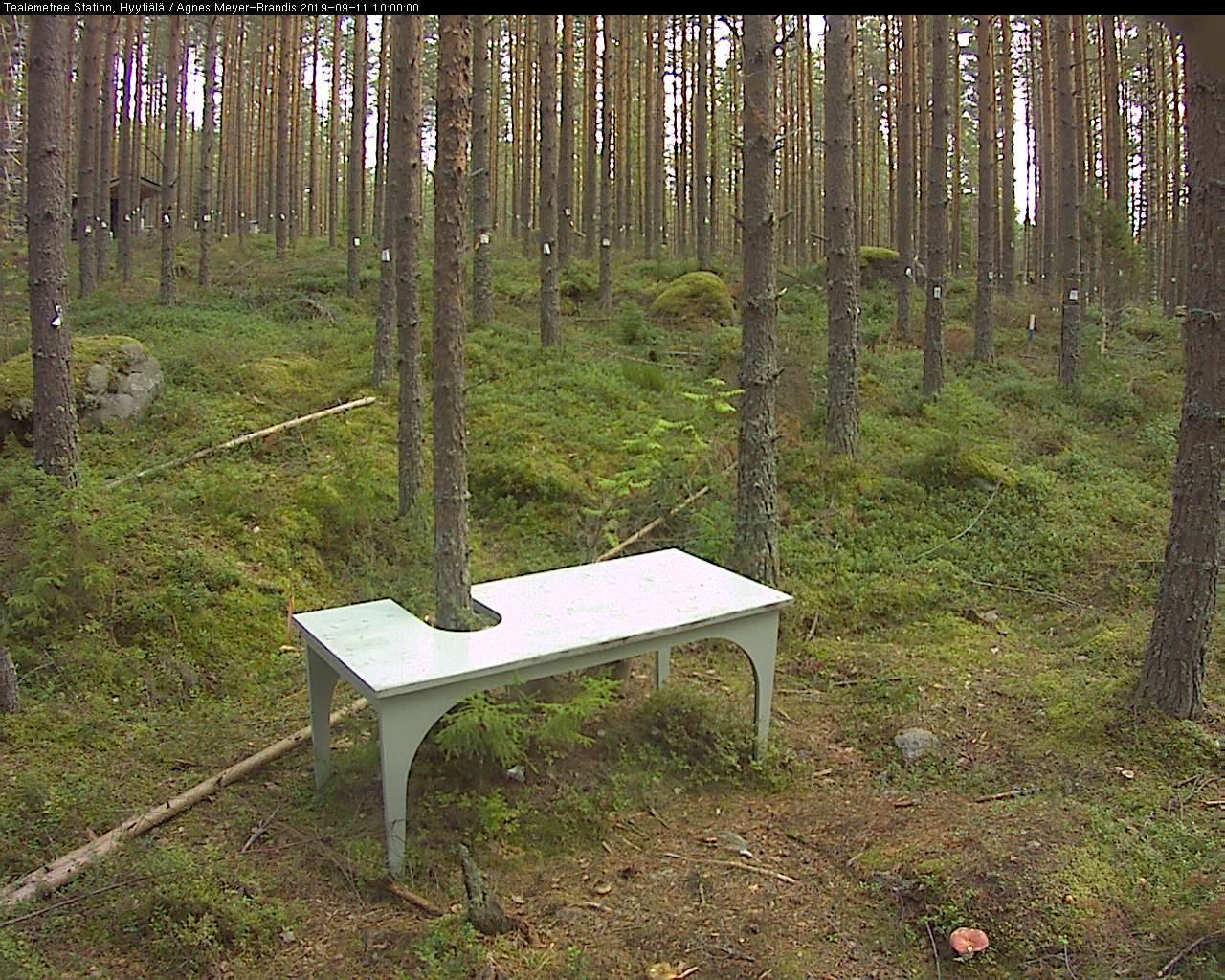 Agnes Meyer-Brandiksen työ Hyytiälässä alkoi tutustumalla aseman muihin tutkijoihin. Pystyäkseen tapaamaan ihmisiä metsässä, hän rakensi pöydän, josta muodostui kohtauspiste ja paikka teehetkille Agneksen ja puun kanssa.