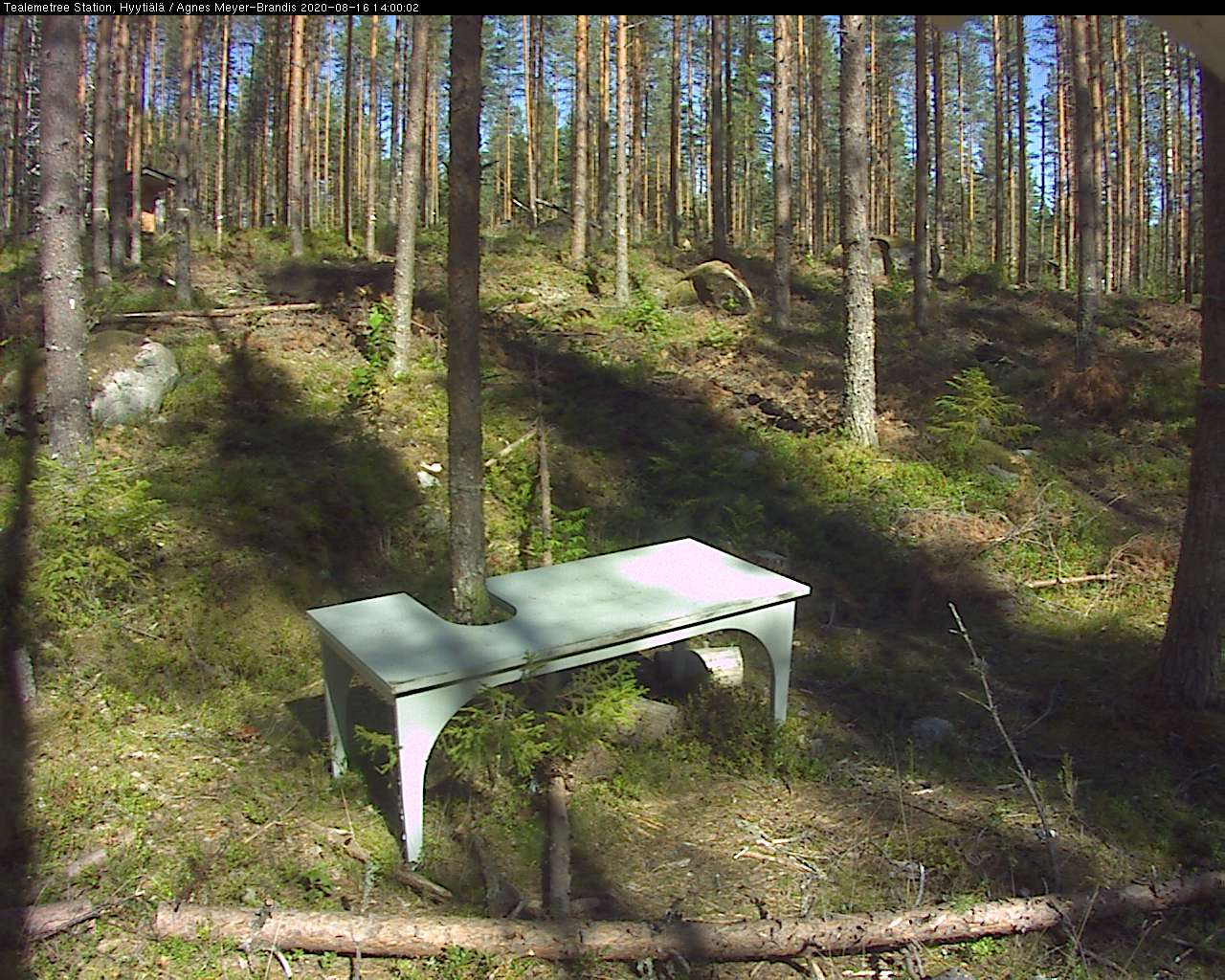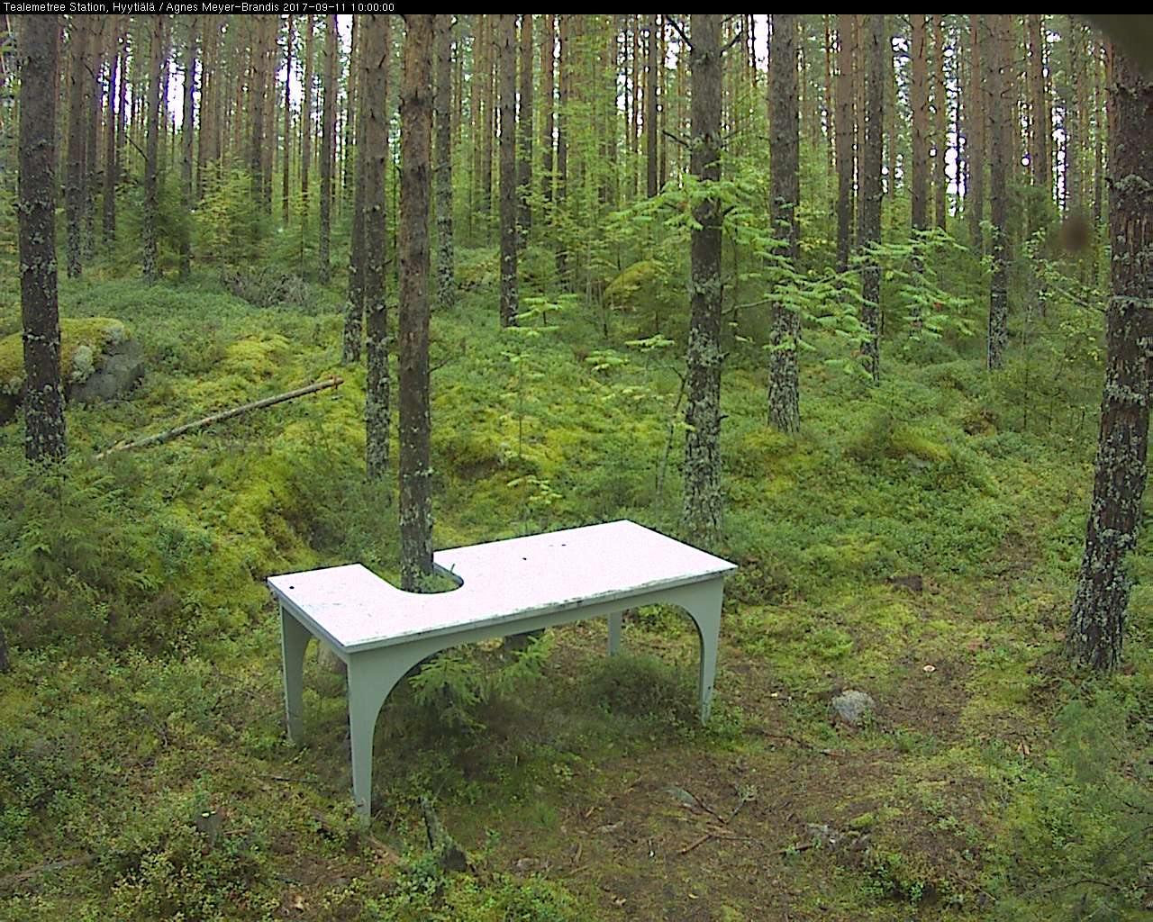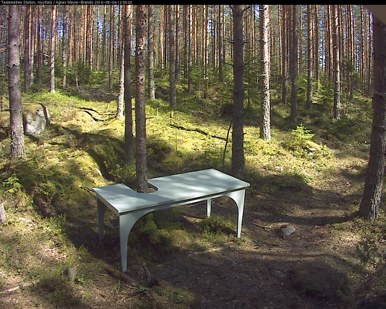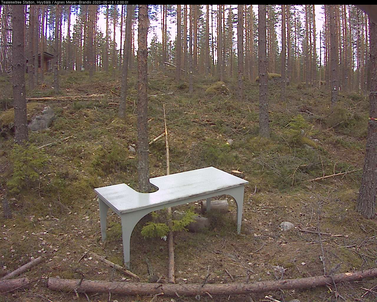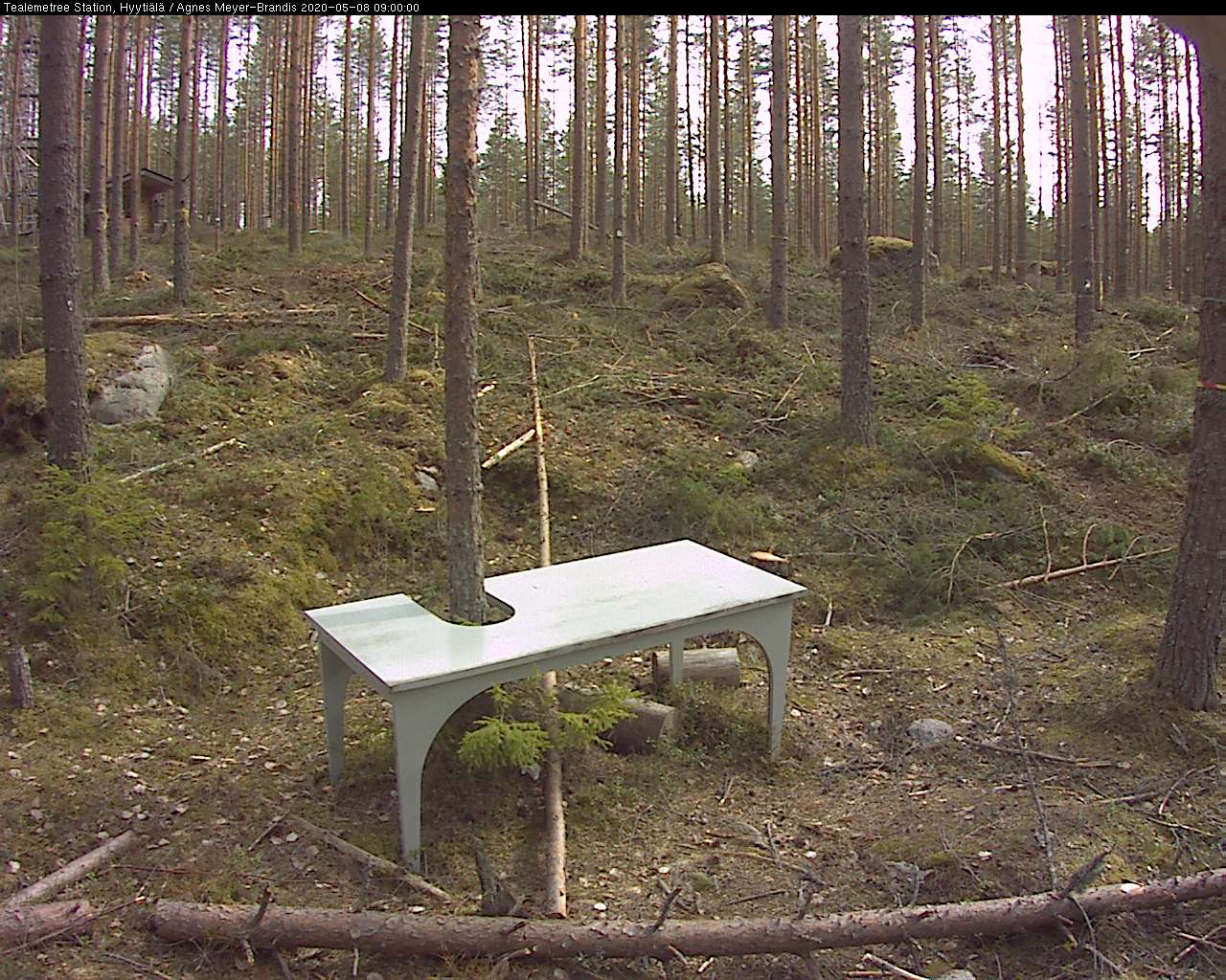 Agnes Meyer-Brandiksen työ Hyytiälässä alkoi tutustumalla aseman muihin tutkijoihin. Pystyäkseen tapaamaan ihmisiä metsässä, hän rakensi pöydän, josta muodostui kohtauspiste ja paikka teehetkille Agneksen ja puun kanssa.