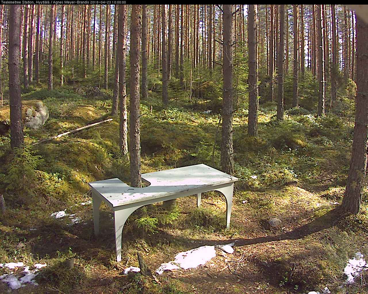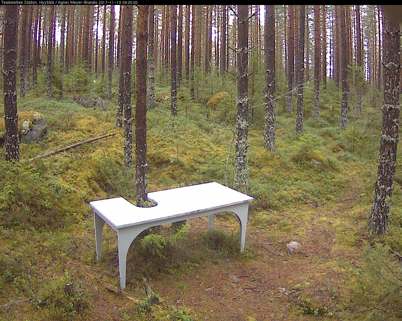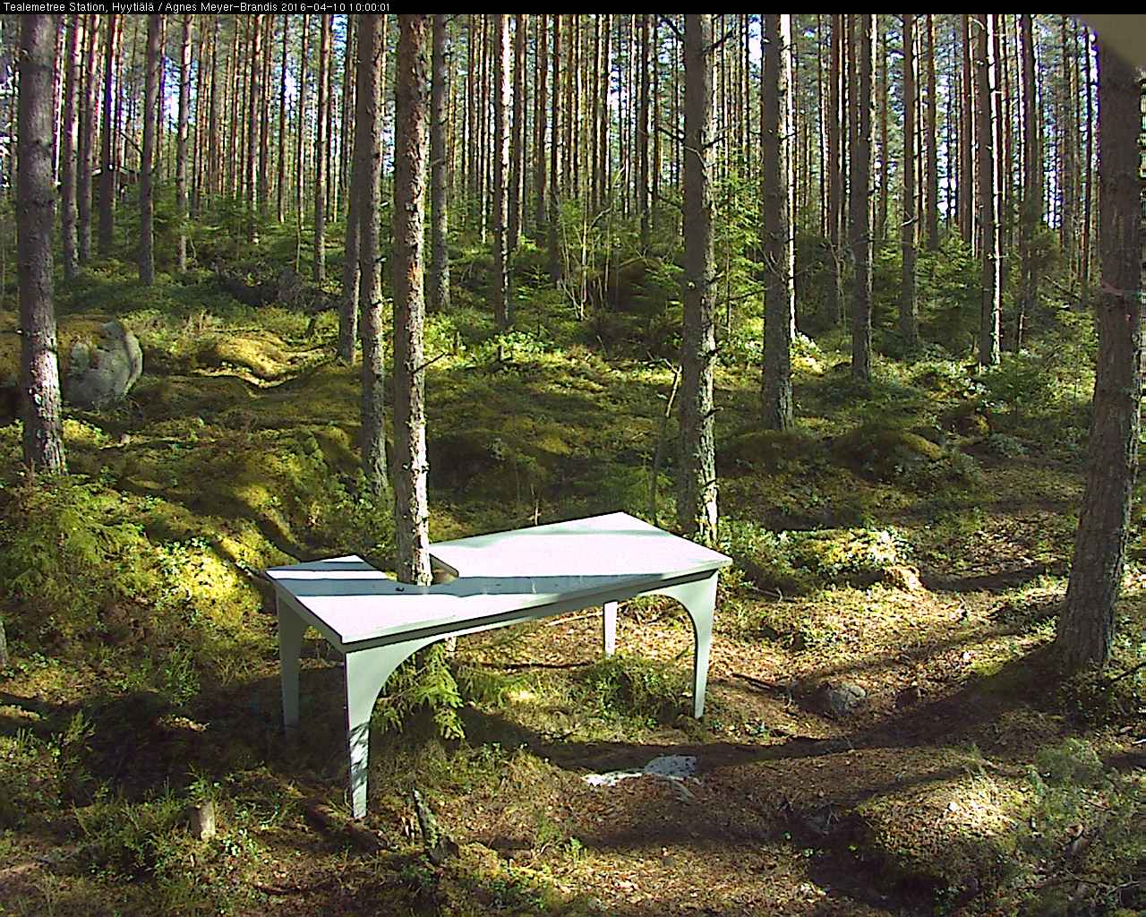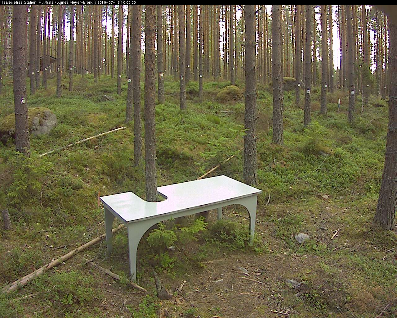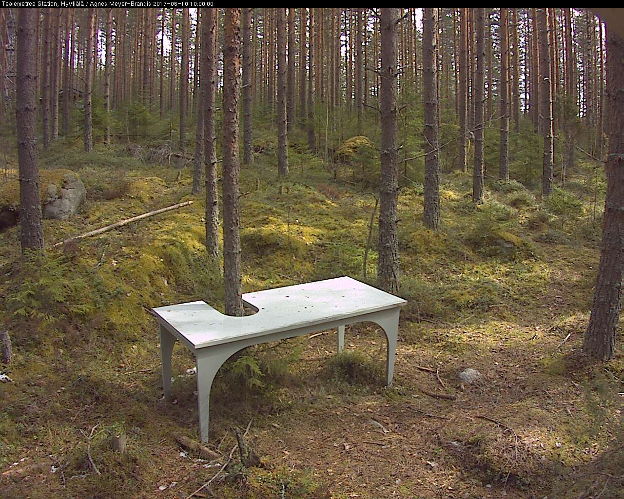 Agnes Meyer-Brandiksen työ Hyytiälässä alkoi tutustumalla aseman muihin tutkijoihin. Pystyäkseen tapaamaan ihmisiä metsässä, hän rakensi pöydän, josta muodostui kohtauspiste ja paikka teehetkille Agneksen ja puun kanssa.