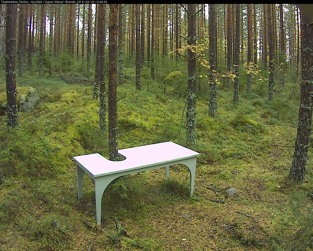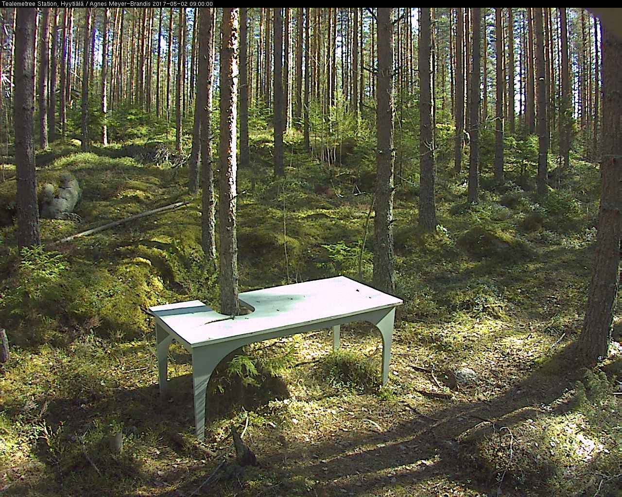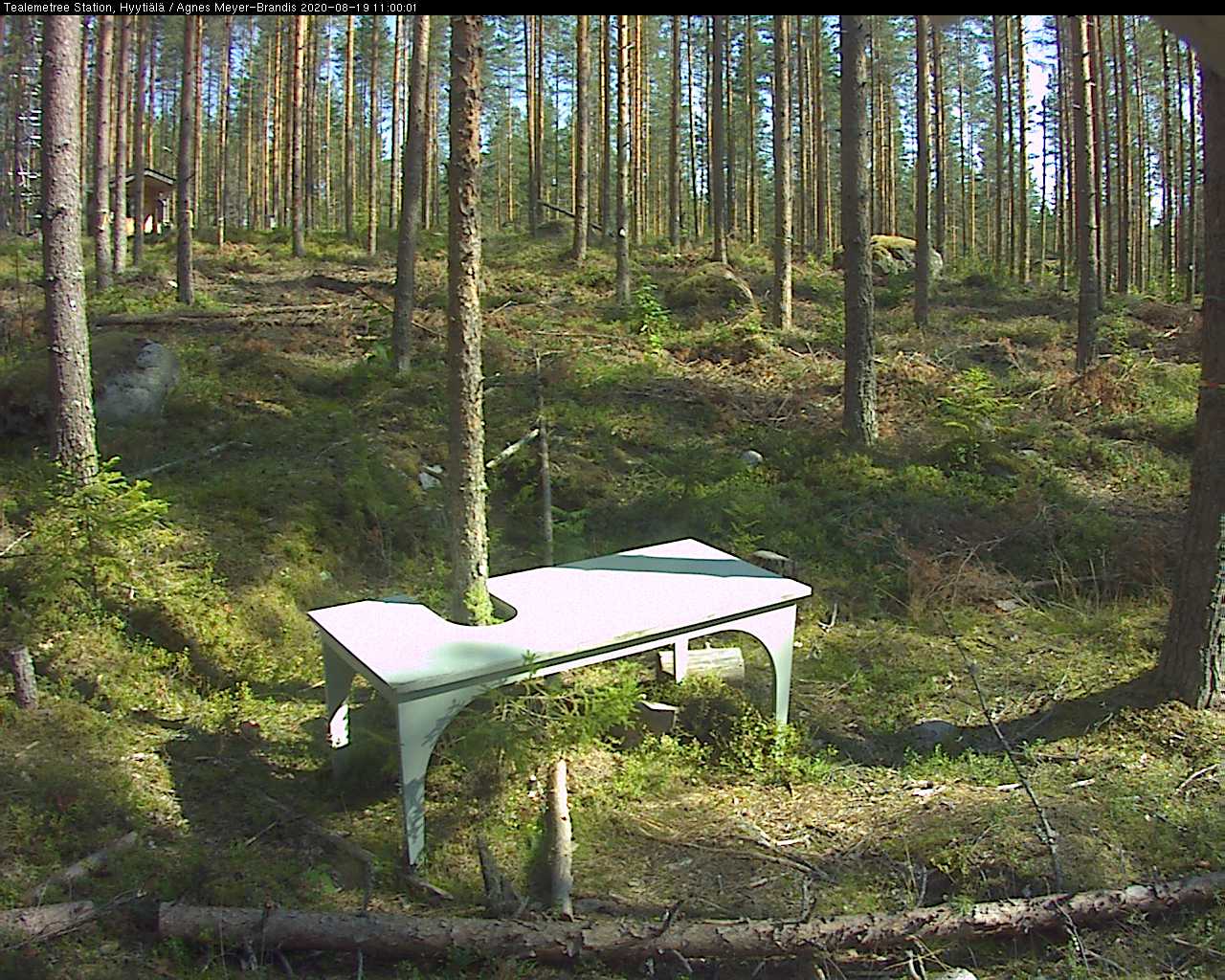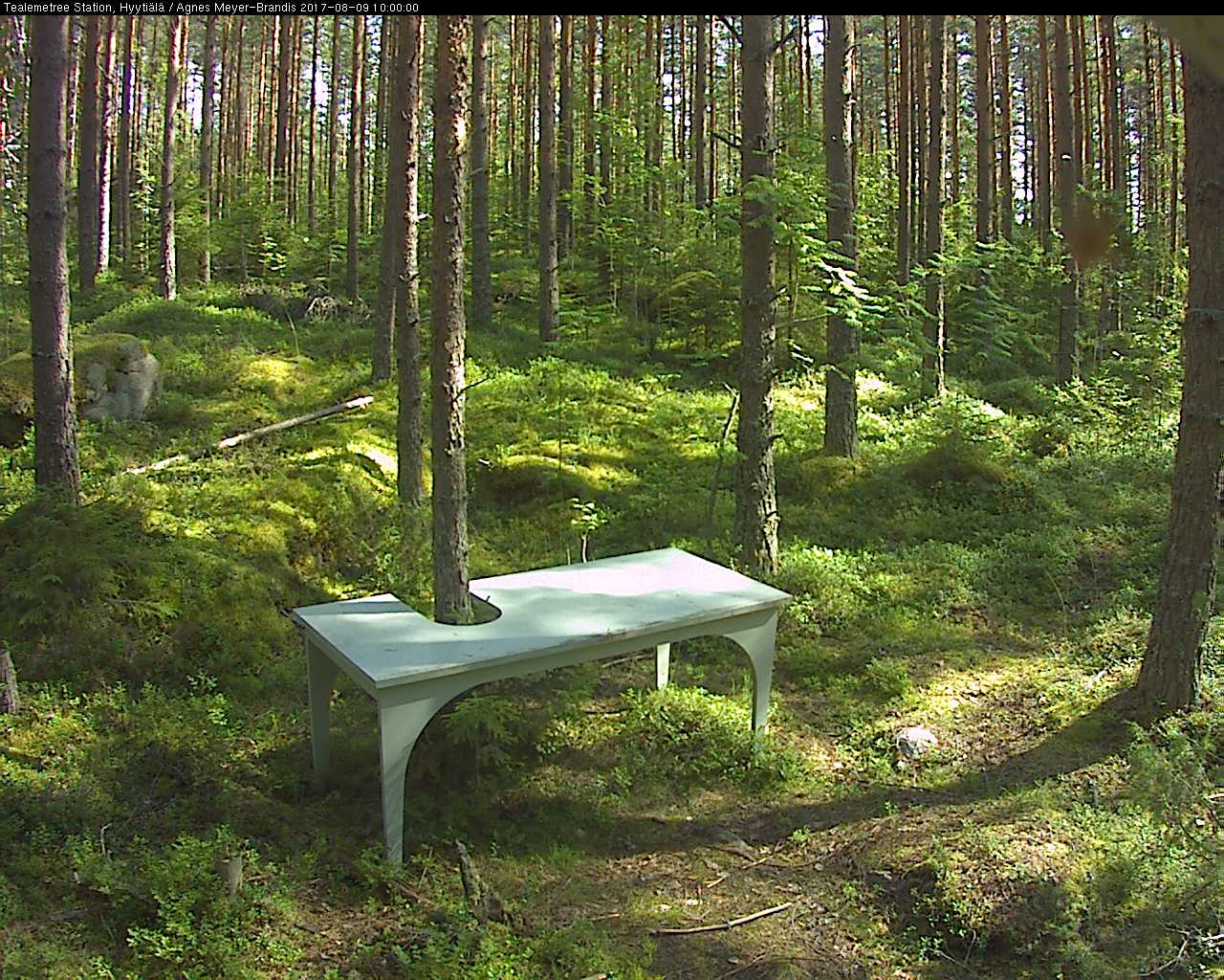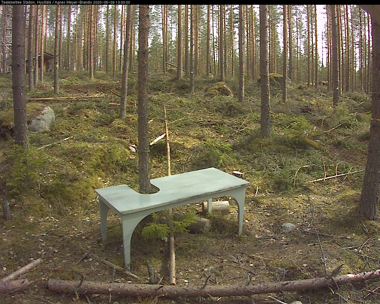 Agnes Meyer-Brandiksen työ Hyytiälässä alkoi tutustumalla aseman muihin tutkijoihin. Pystyäkseen tapaamaan ihmisiä metsässä, hän rakensi pöydän, josta muodostui kohtauspiste ja paikka teehetkille Agneksen ja puun kanssa.
