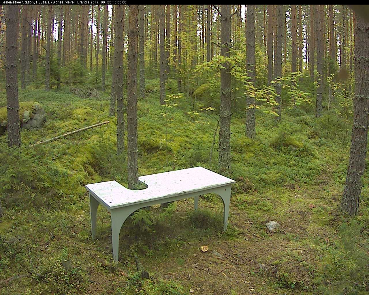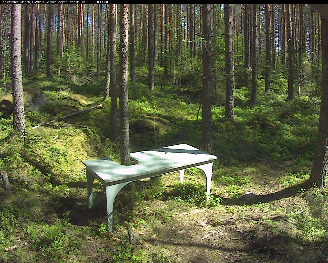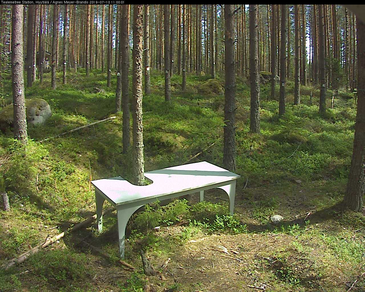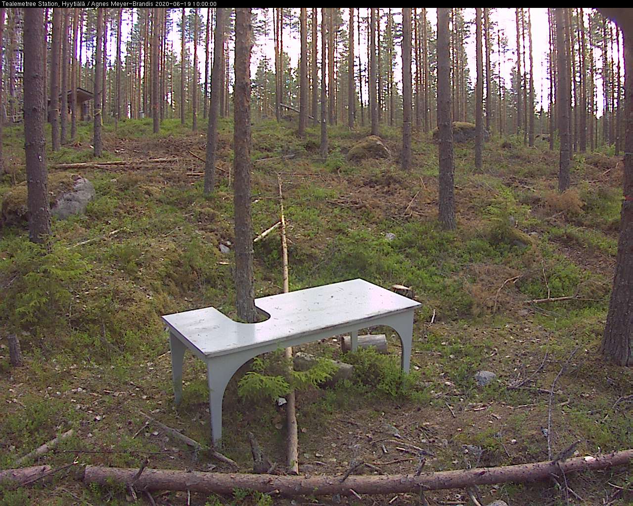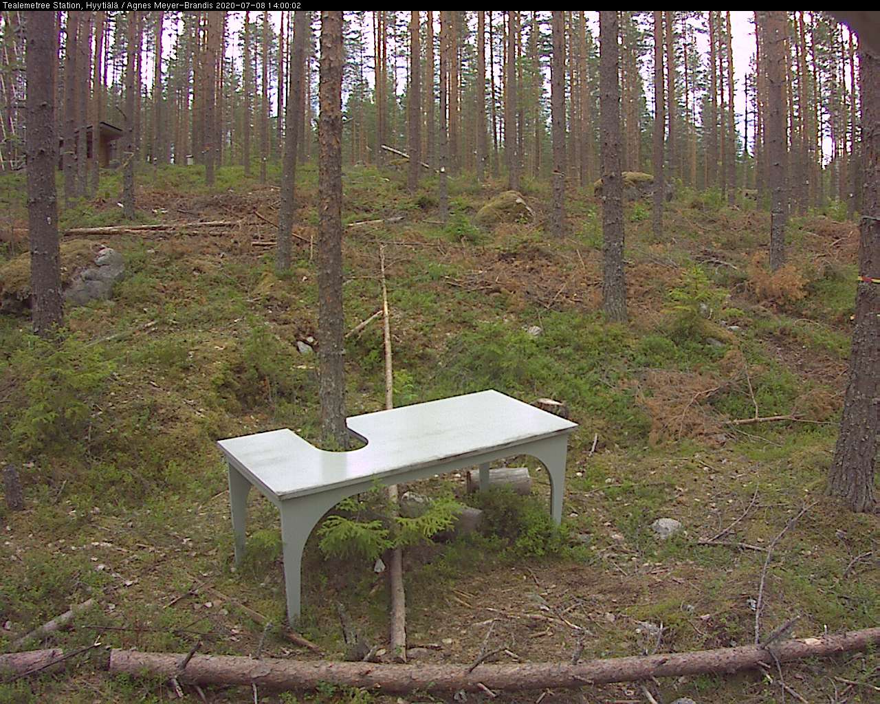 Agnes Meyer-Brandiksen työ Hyytiälässä alkoi tutustumalla aseman muihin tutkijoihin. Pystyäkseen tapaamaan ihmisiä metsässä, hän rakensi pöydän, josta muodostui kohtauspiste ja paikka teehetkille Agneksen ja puun kanssa.