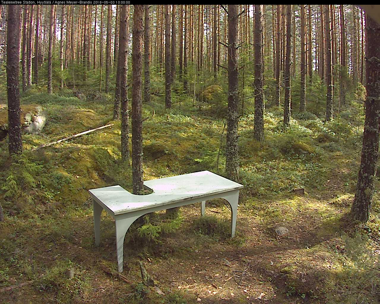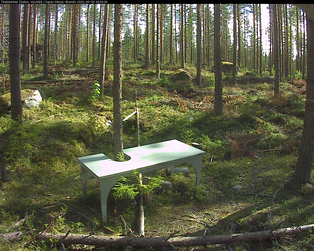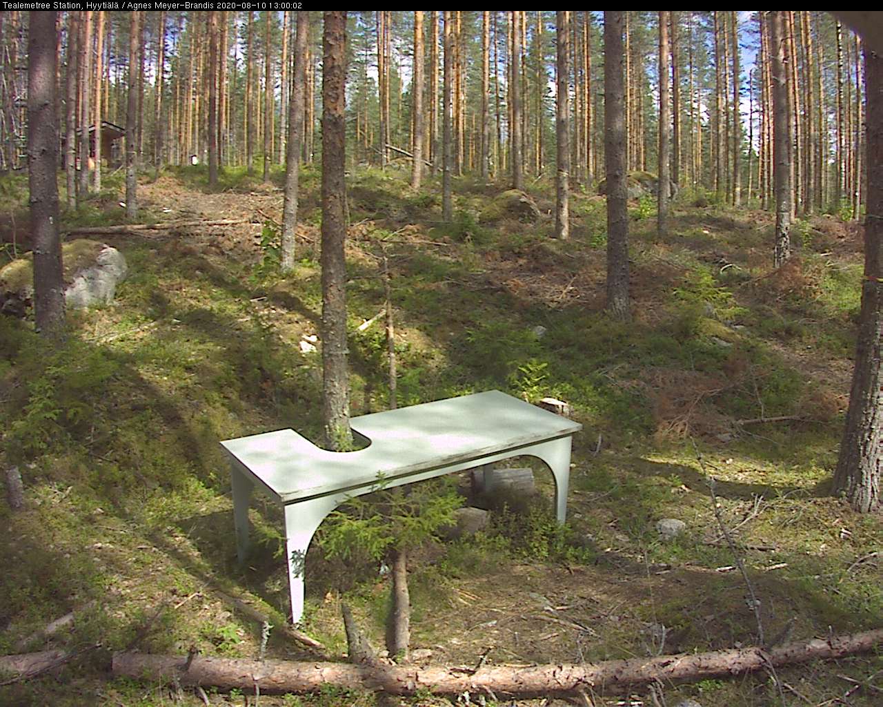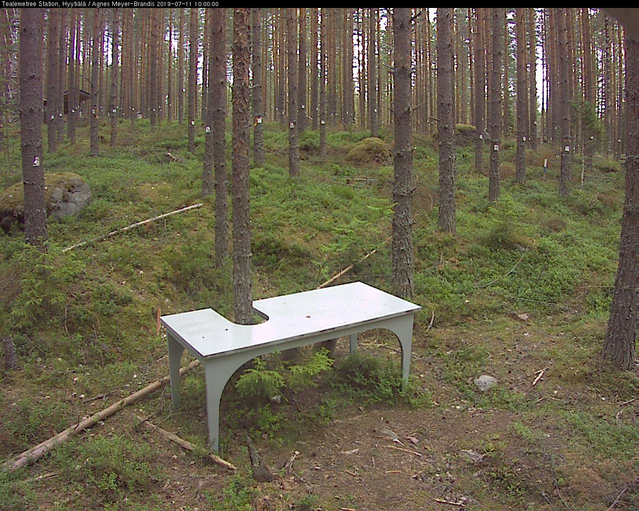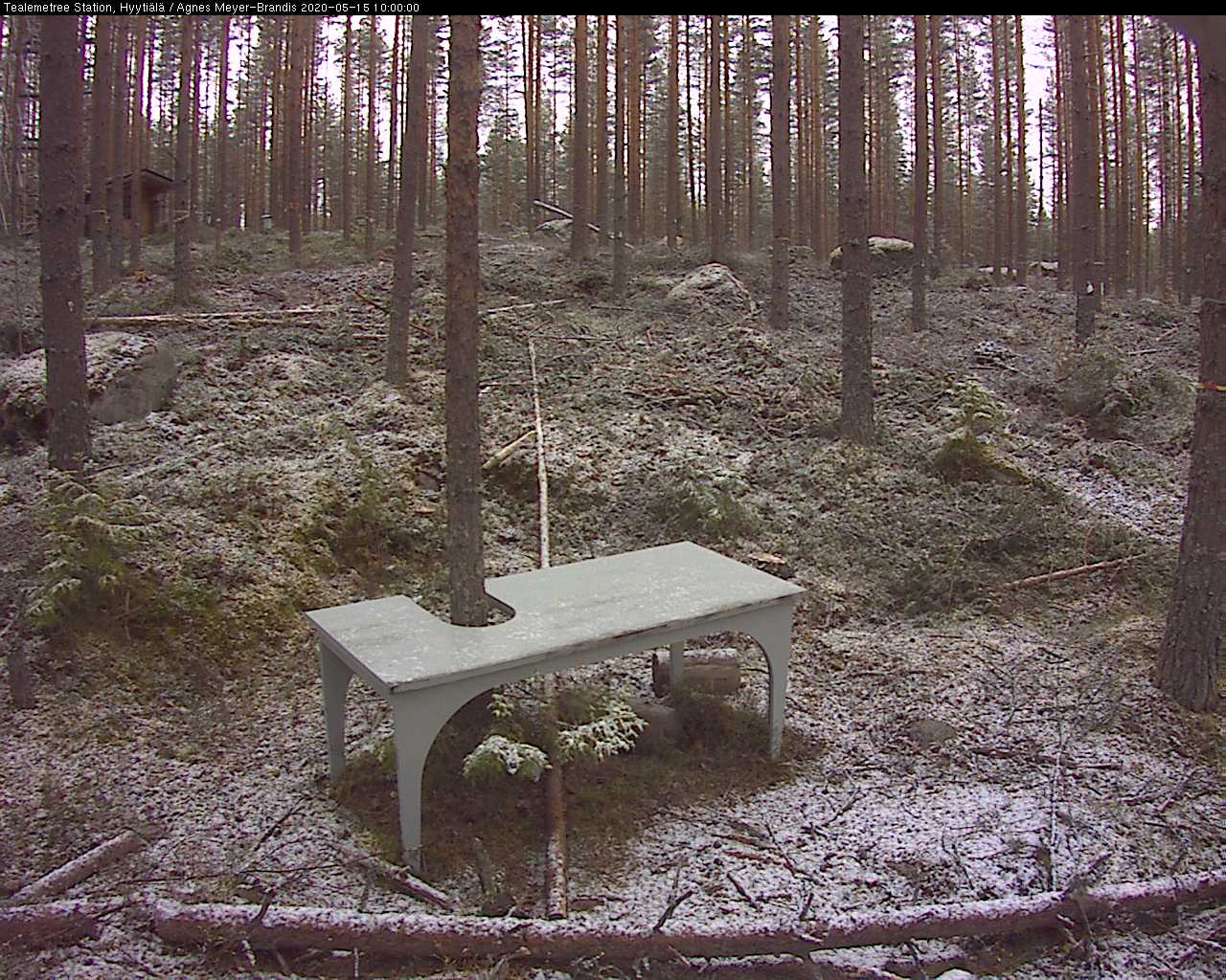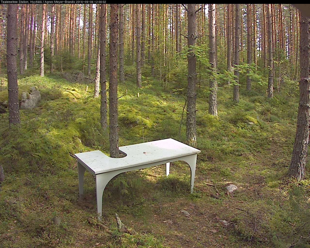 Agnes Meyer-Brandiksen työ Hyytiälässä alkoi tutustumalla aseman muihin tutkijoihin. Pystyäkseen tapaamaan ihmisiä metsässä, hän rakensi pöydän, josta muodostui kohtauspiste ja paikka teehetkille Agneksen ja puun kanssa.