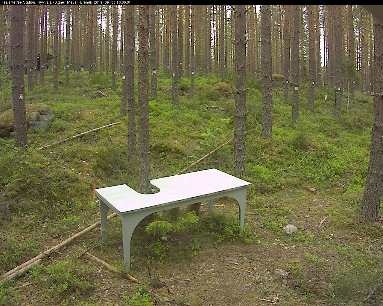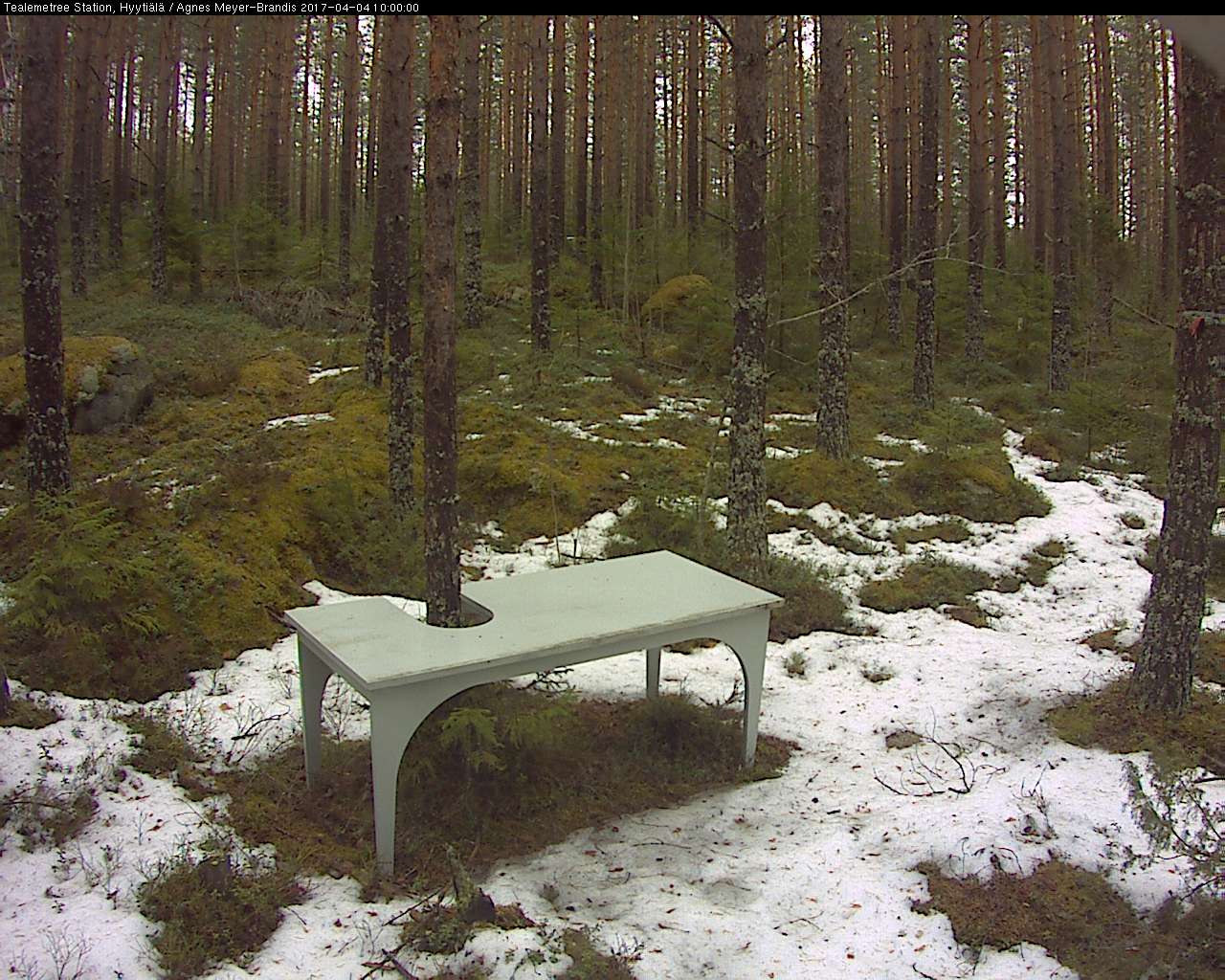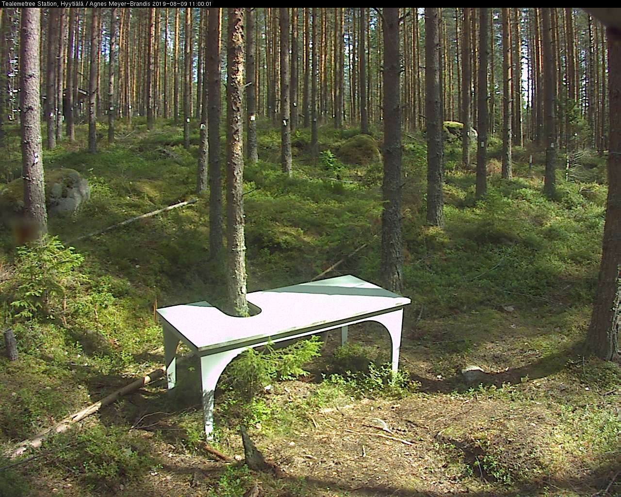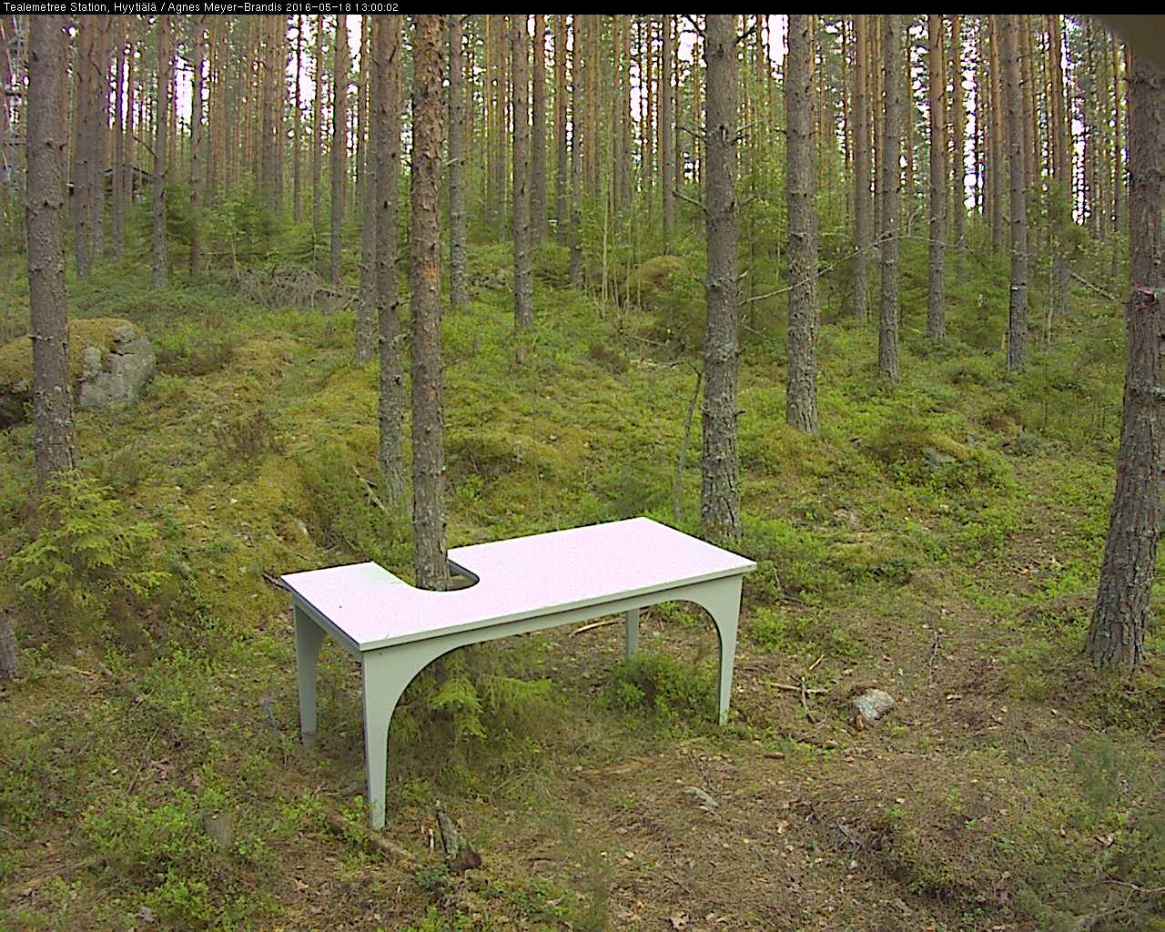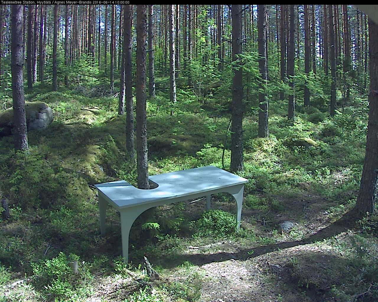 Agnes Meyer-Brandiksen työ Hyytiälässä alkoi tutustumalla aseman muihin tutkijoihin. Pystyäkseen tapaamaan ihmisiä metsässä, hän rakensi pöydän, josta muodostui kohtauspiste ja paikka teehetkille Agneksen ja puun kanssa.