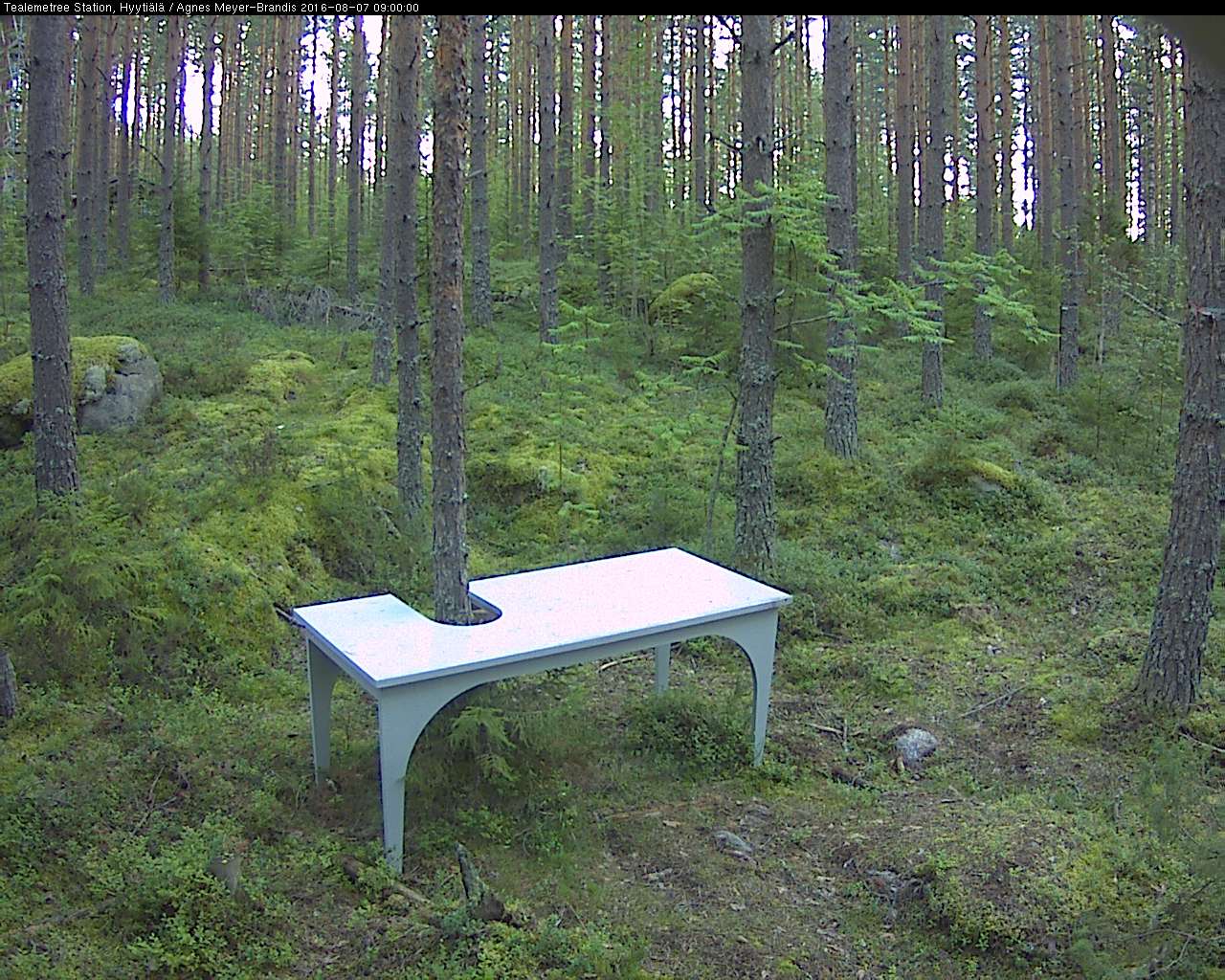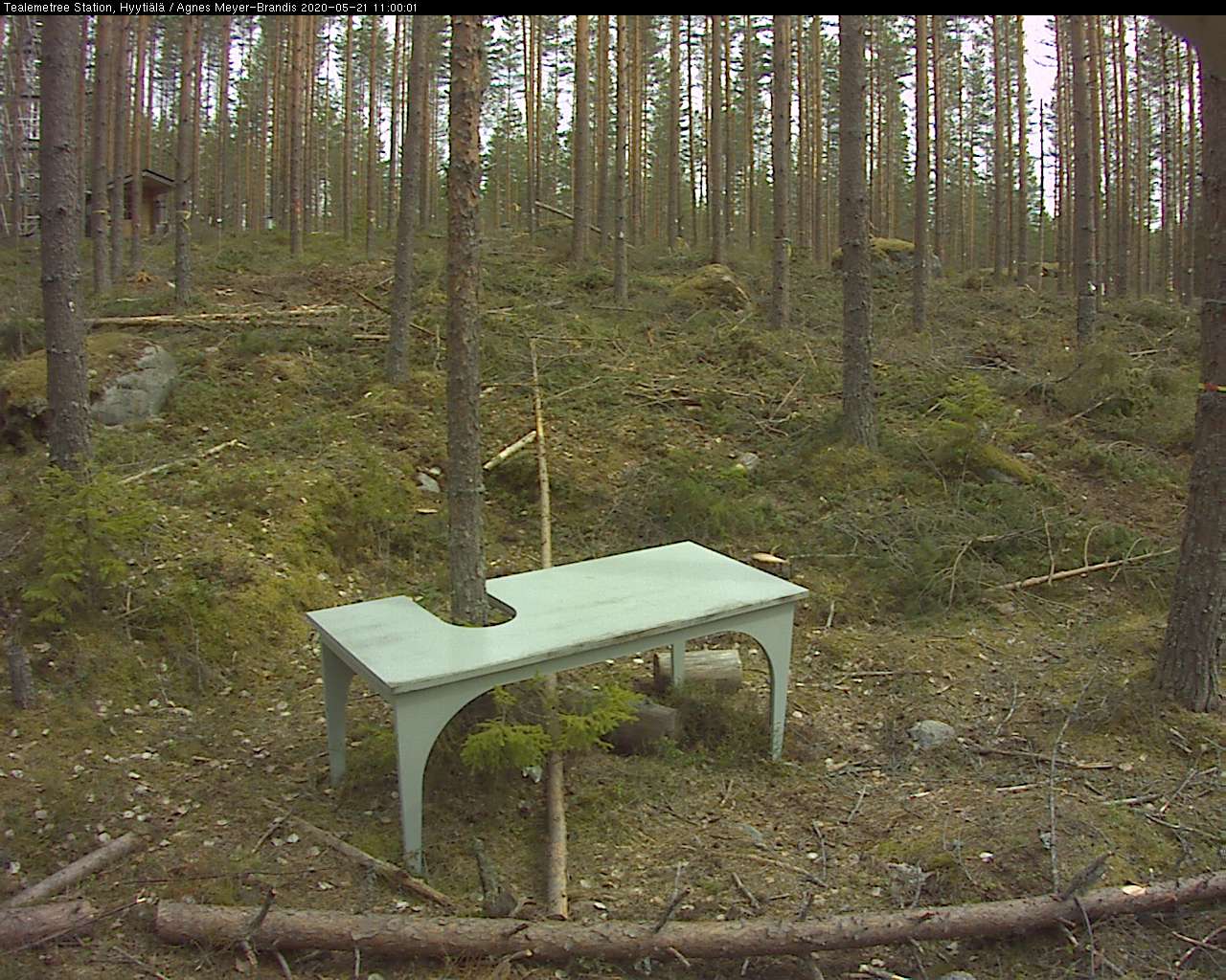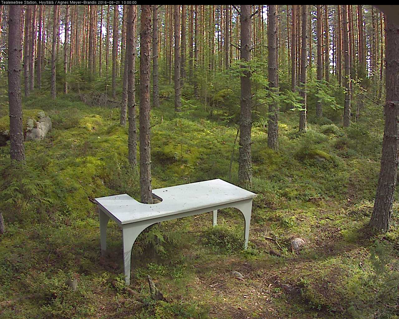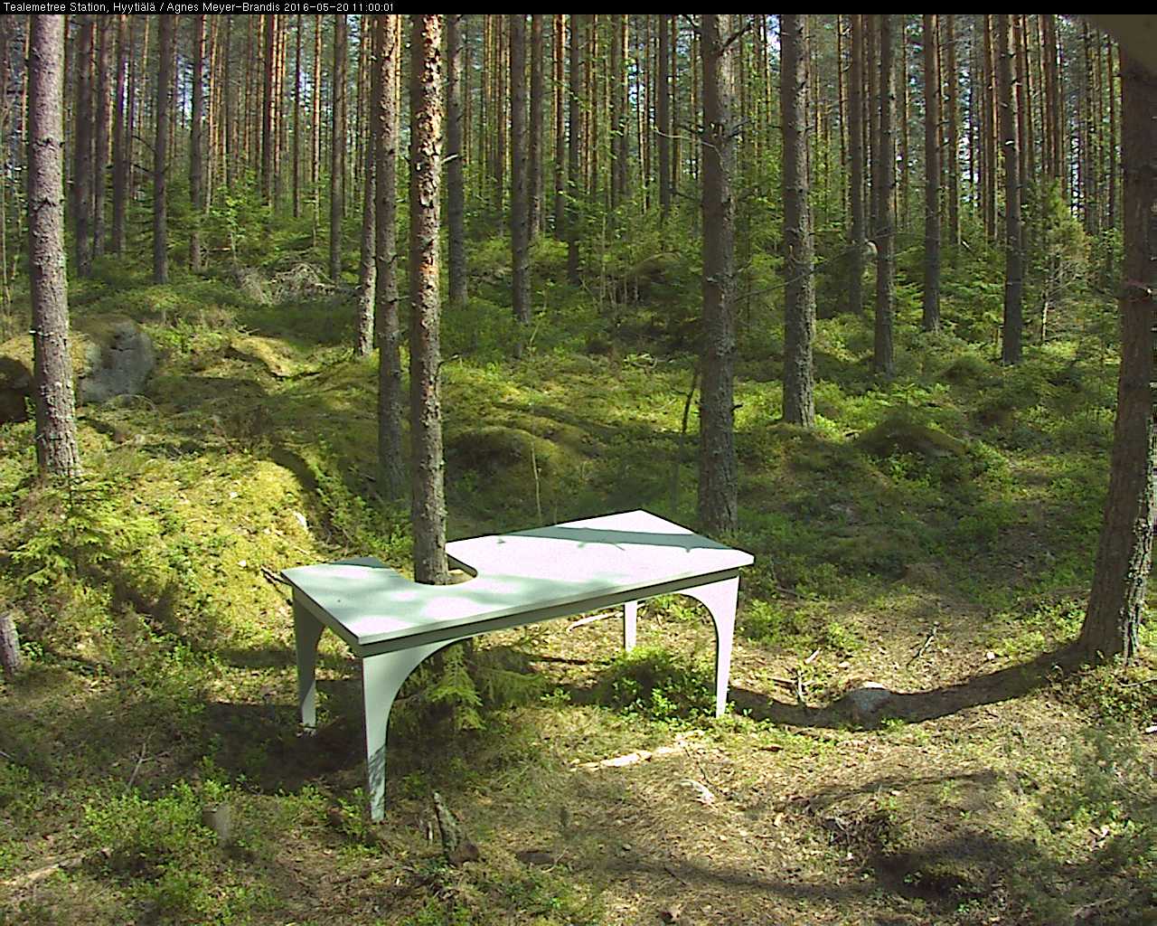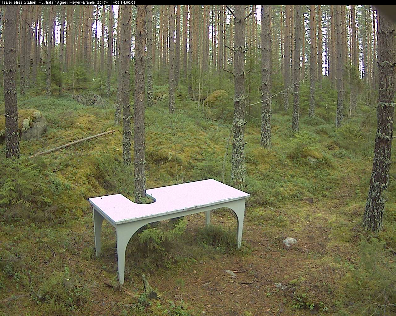 Agnes Meyer-Brandiksen työ Hyytiälässä alkoi tutustumalla aseman muihin tutkijoihin. Pystyäkseen tapaamaan ihmisiä metsässä, hän rakensi pöydän, josta muodostui kohtauspiste ja paikka teehetkille Agneksen ja puun kanssa.