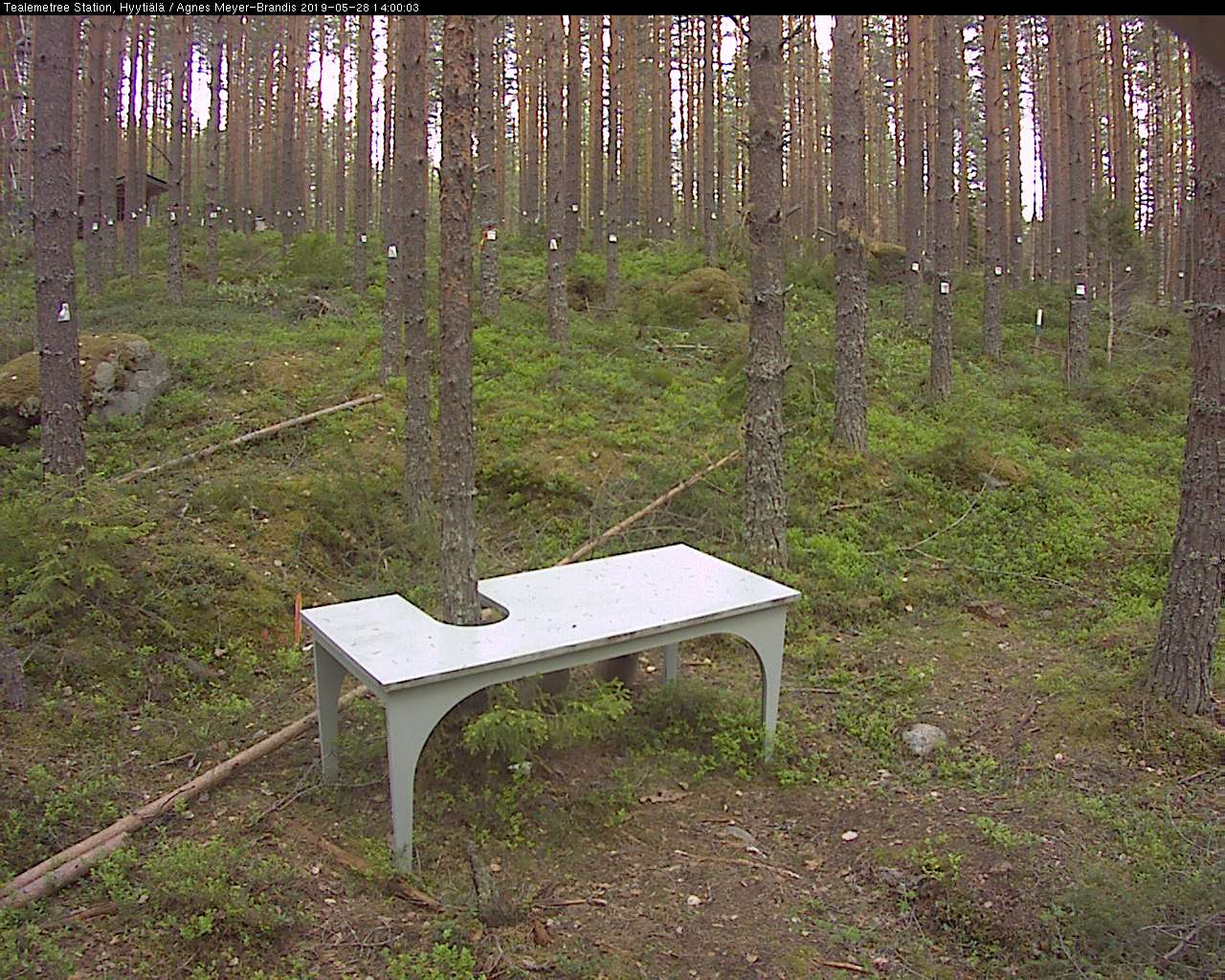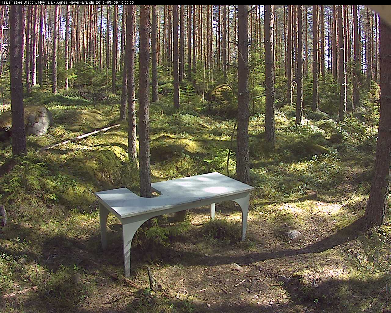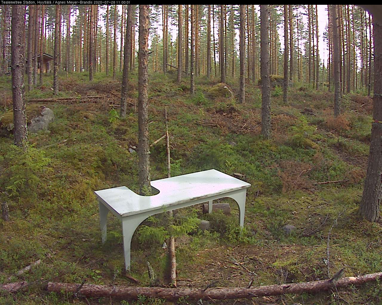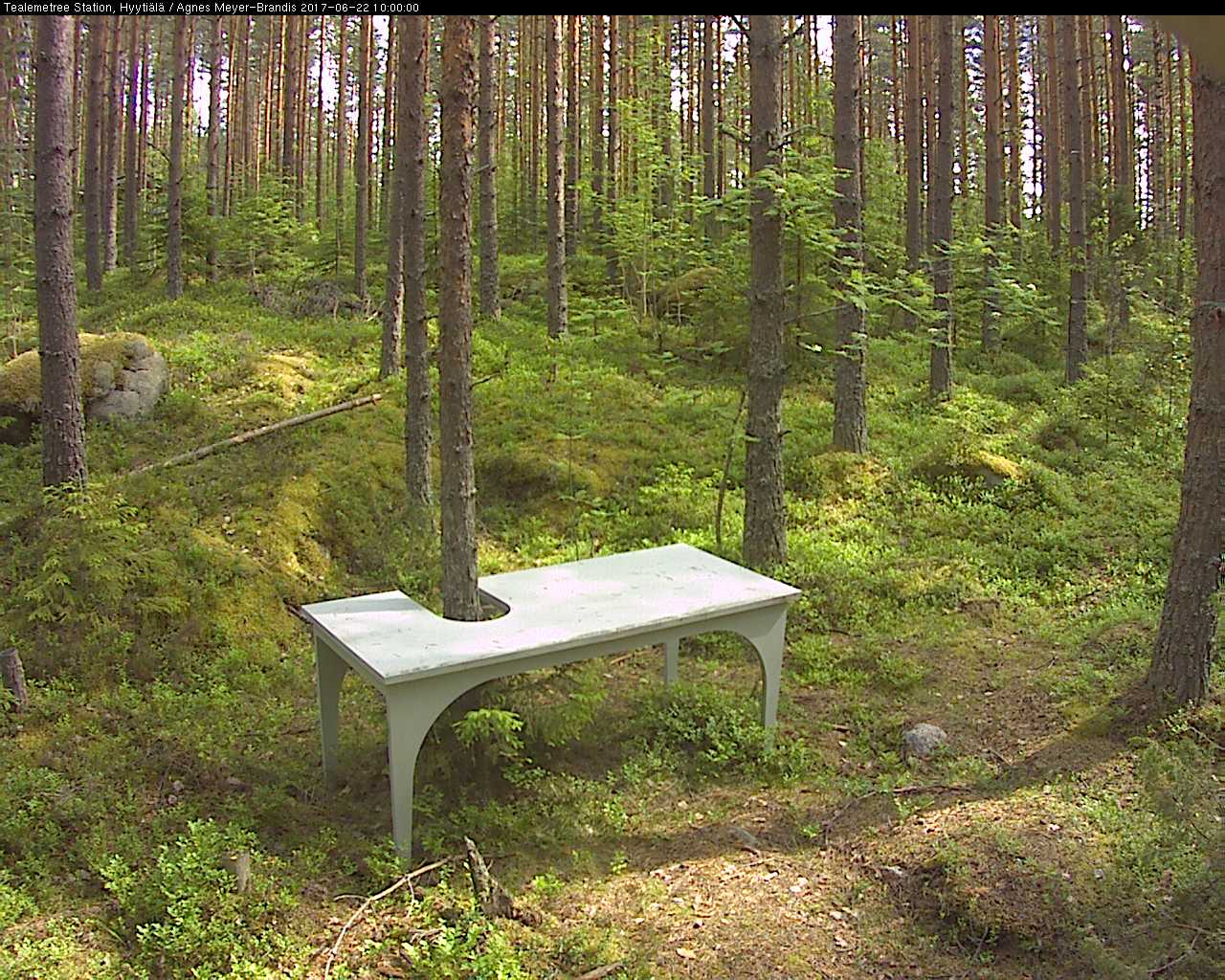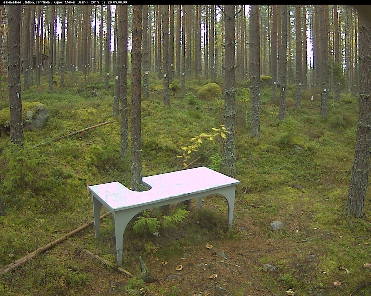 Agnes Meyer-Brandiksen työ Hyytiälässä alkoi tutustumalla aseman muihin tutkijoihin. Pystyäkseen tapaamaan ihmisiä metsässä, hän rakensi pöydän, josta muodostui kohtauspiste ja paikka teehetkille Agneksen ja puun kanssa.