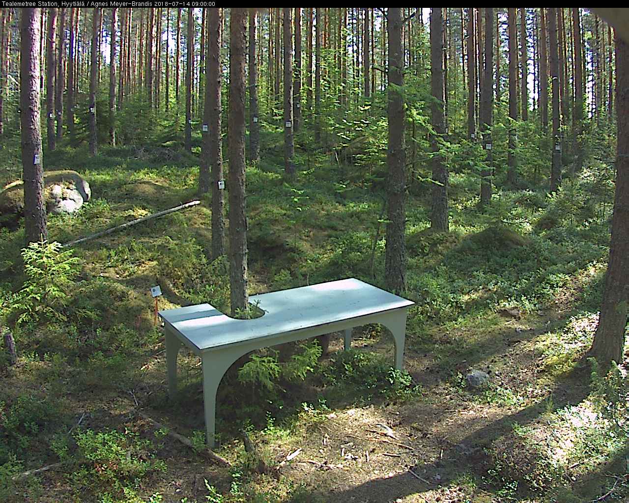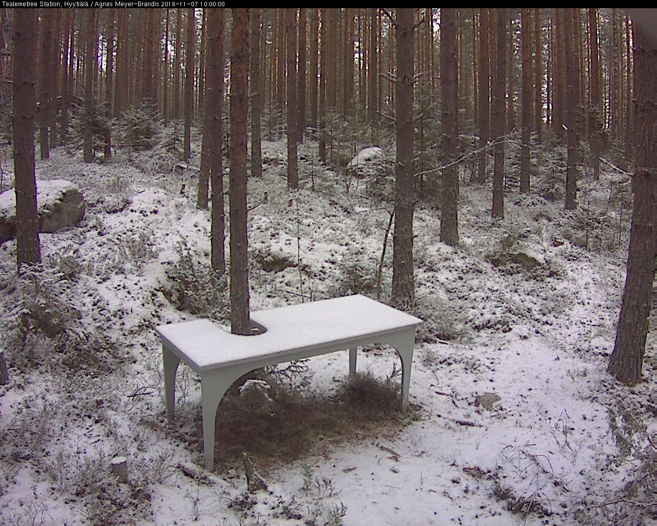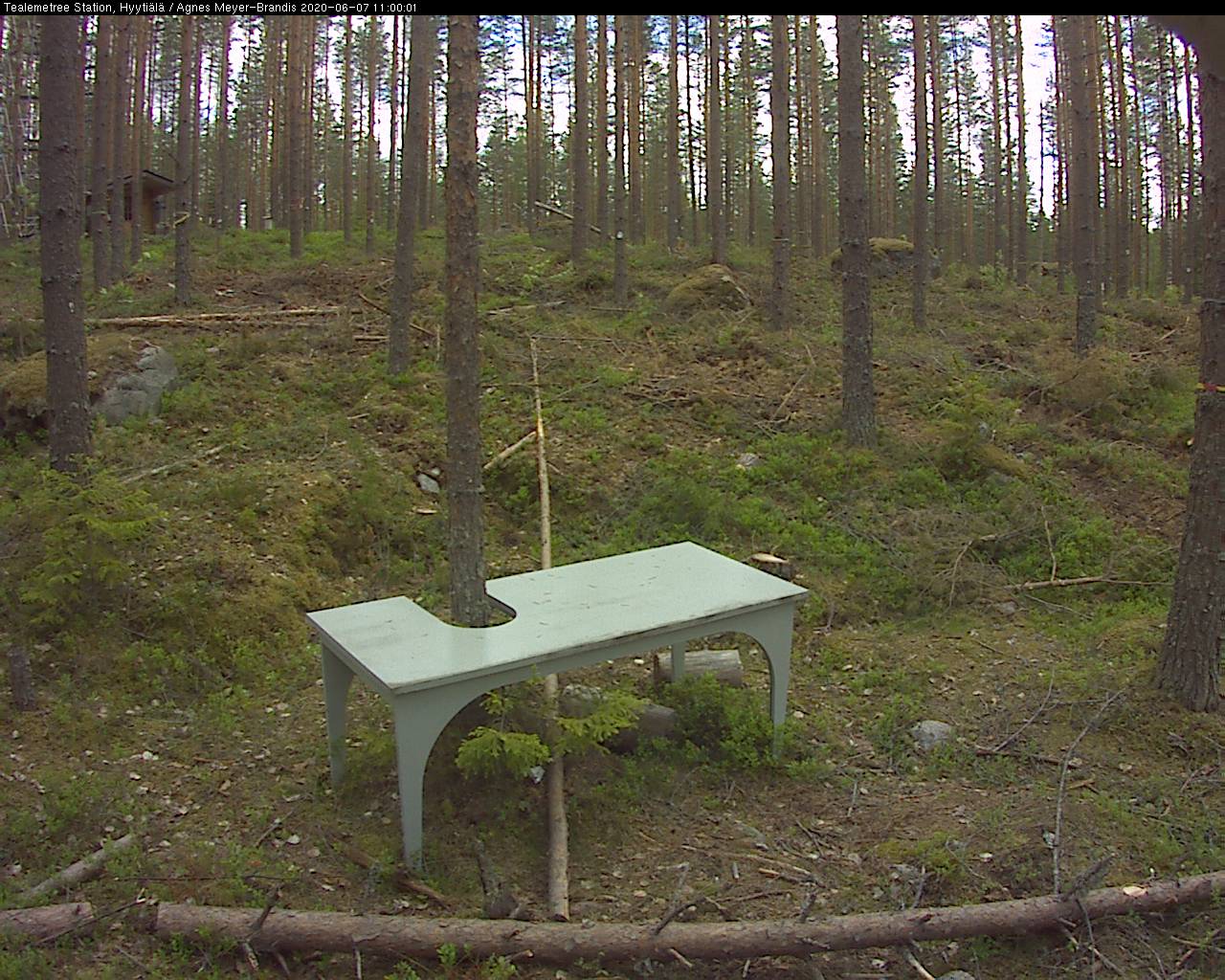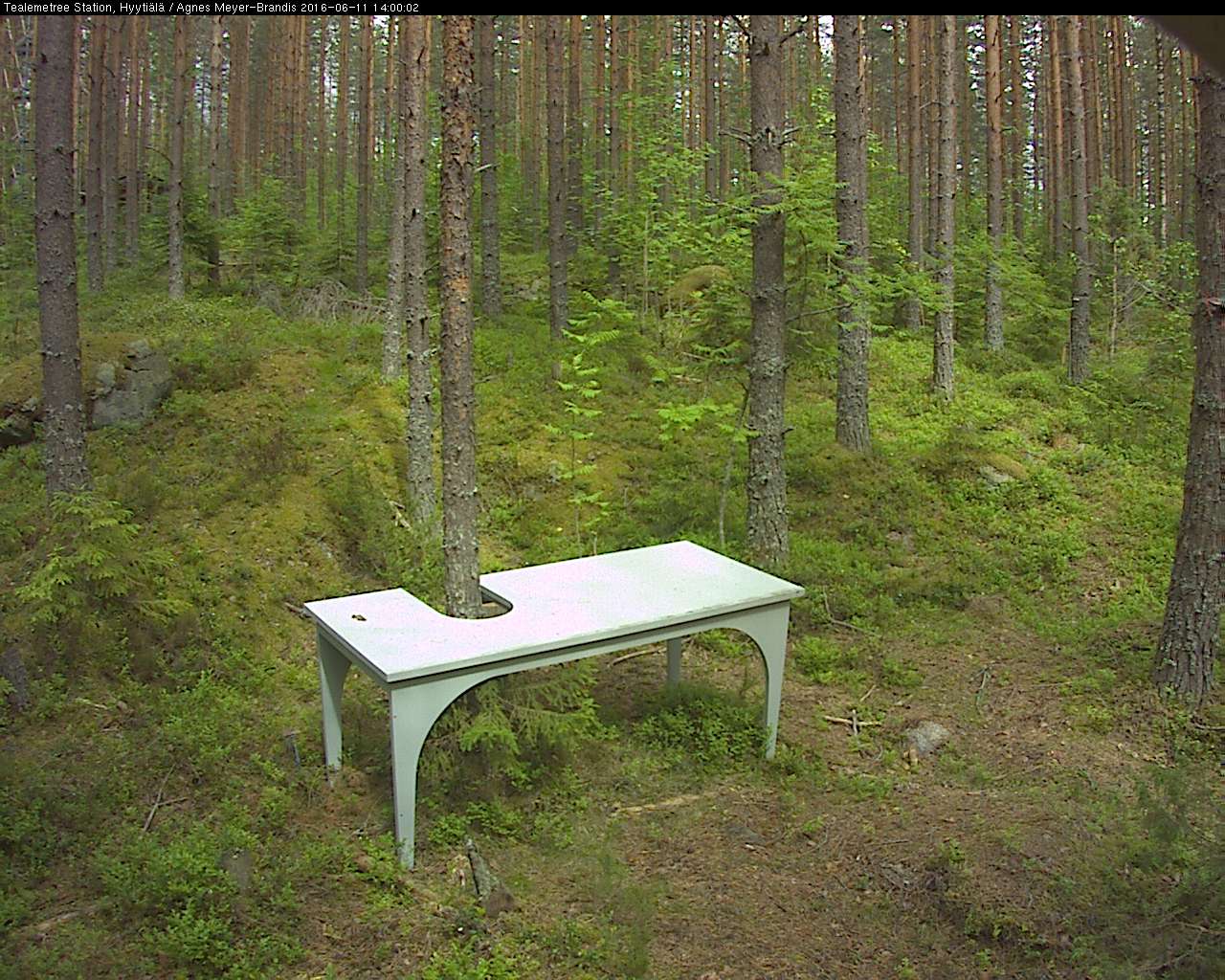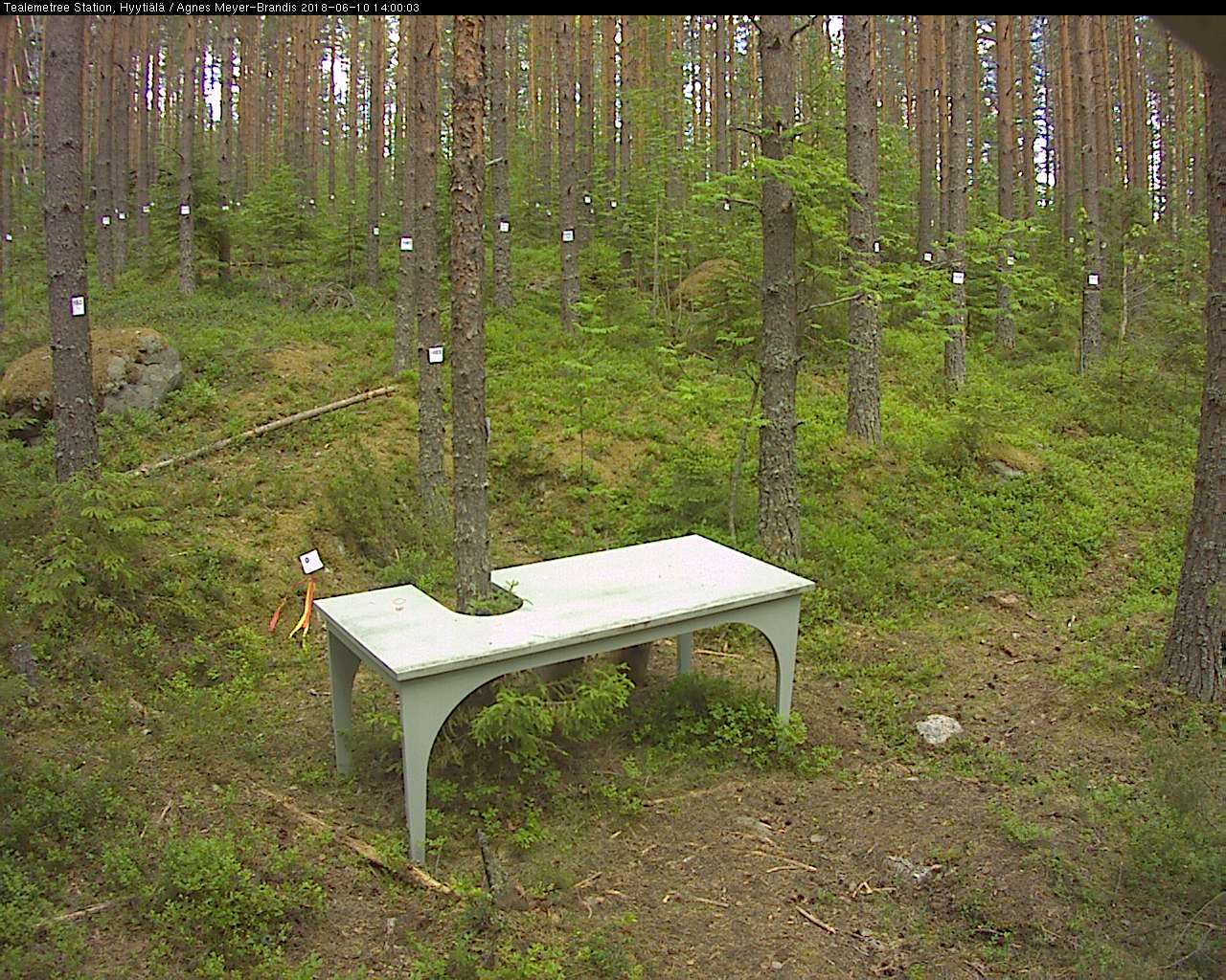 Agnes Meyer-Brandiksen työ Hyytiälässä alkoi tutustumalla aseman muihin tutkijoihin. Pystyäkseen tapaamaan ihmisiä metsässä, hän rakensi pöydän, josta muodostui kohtauspiste ja paikka teehetkille Agneksen ja puun kanssa.