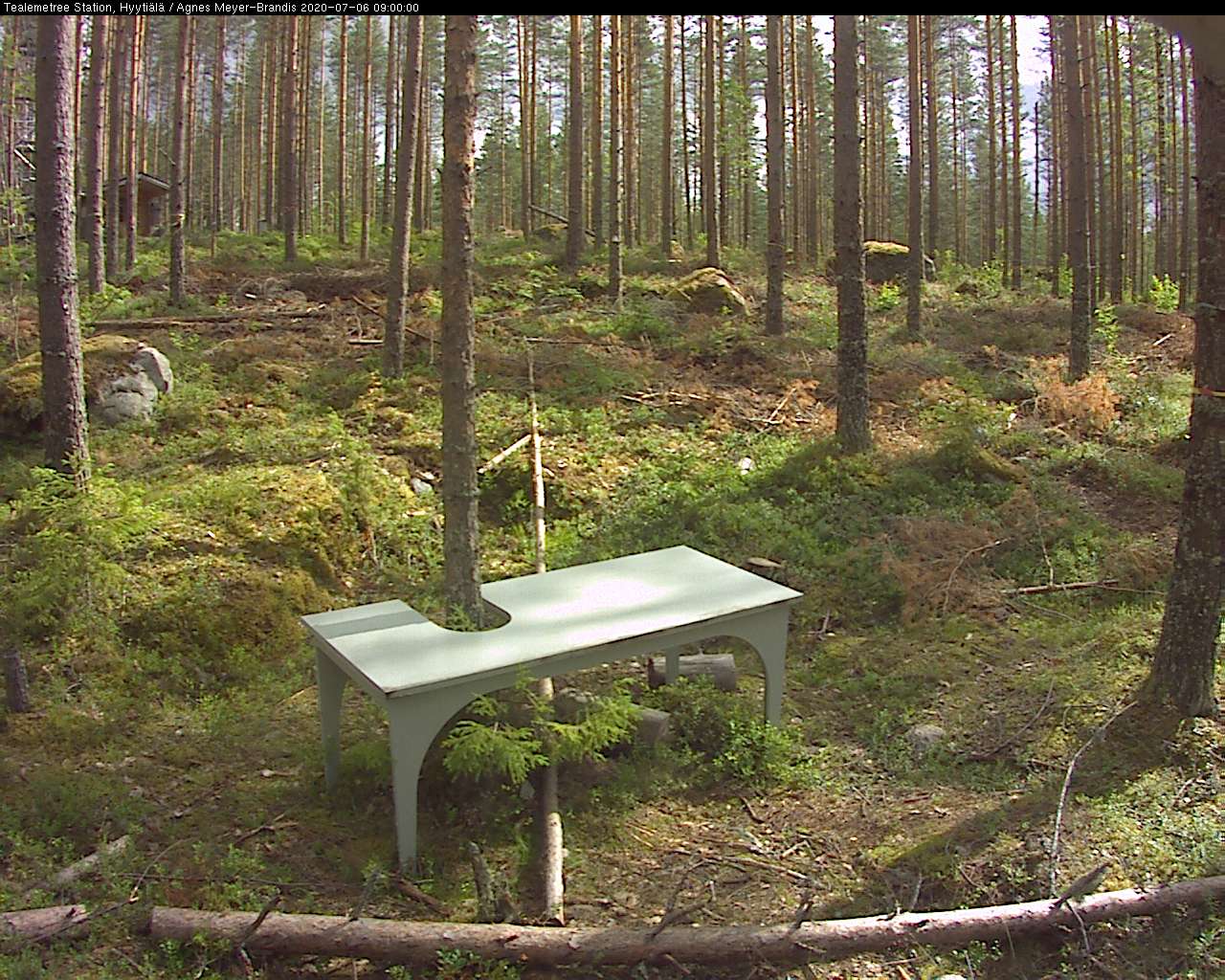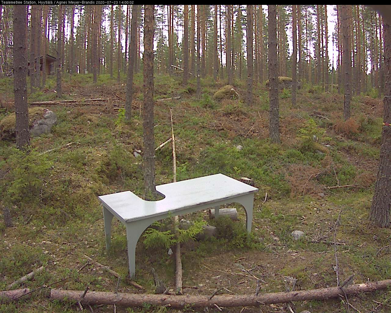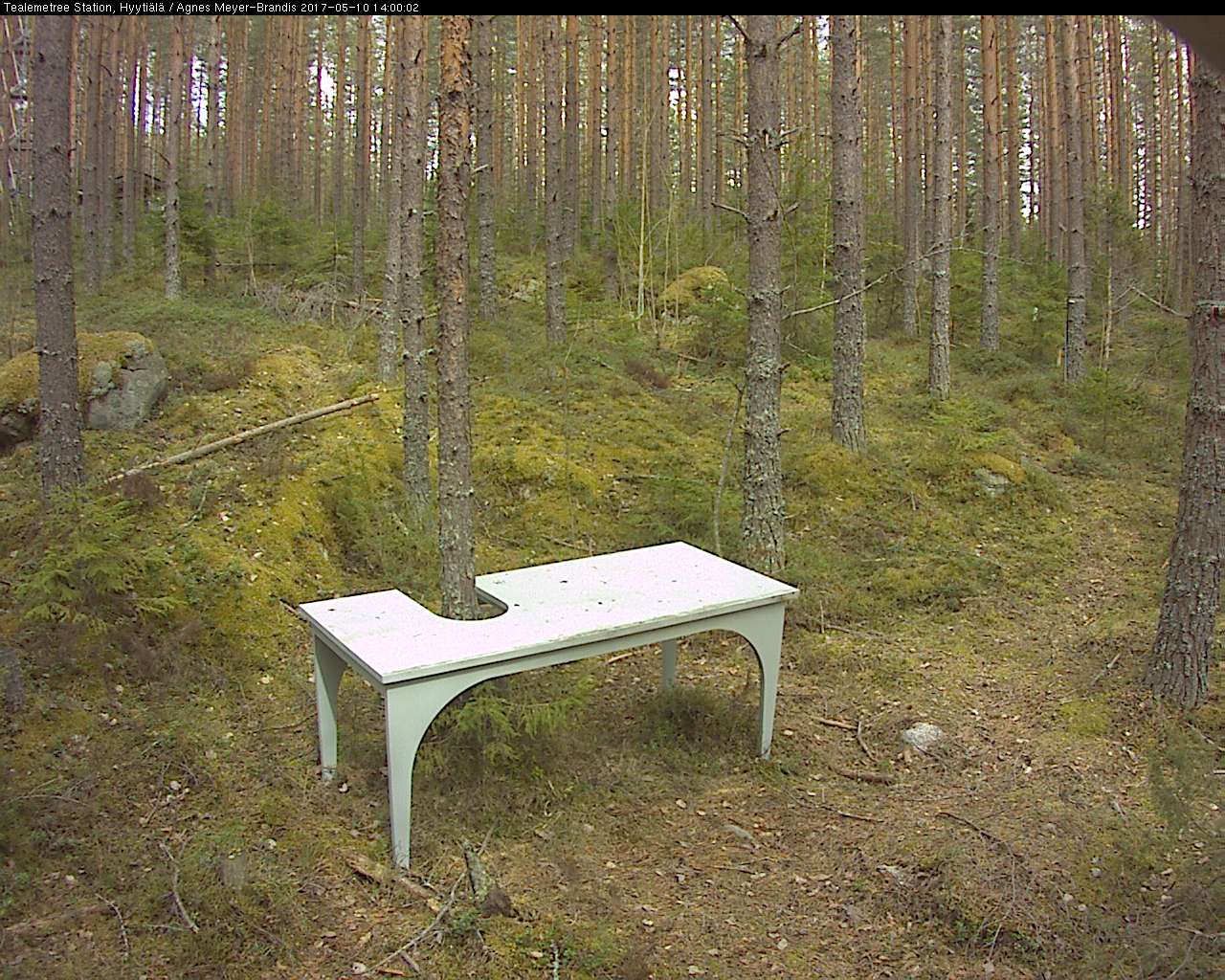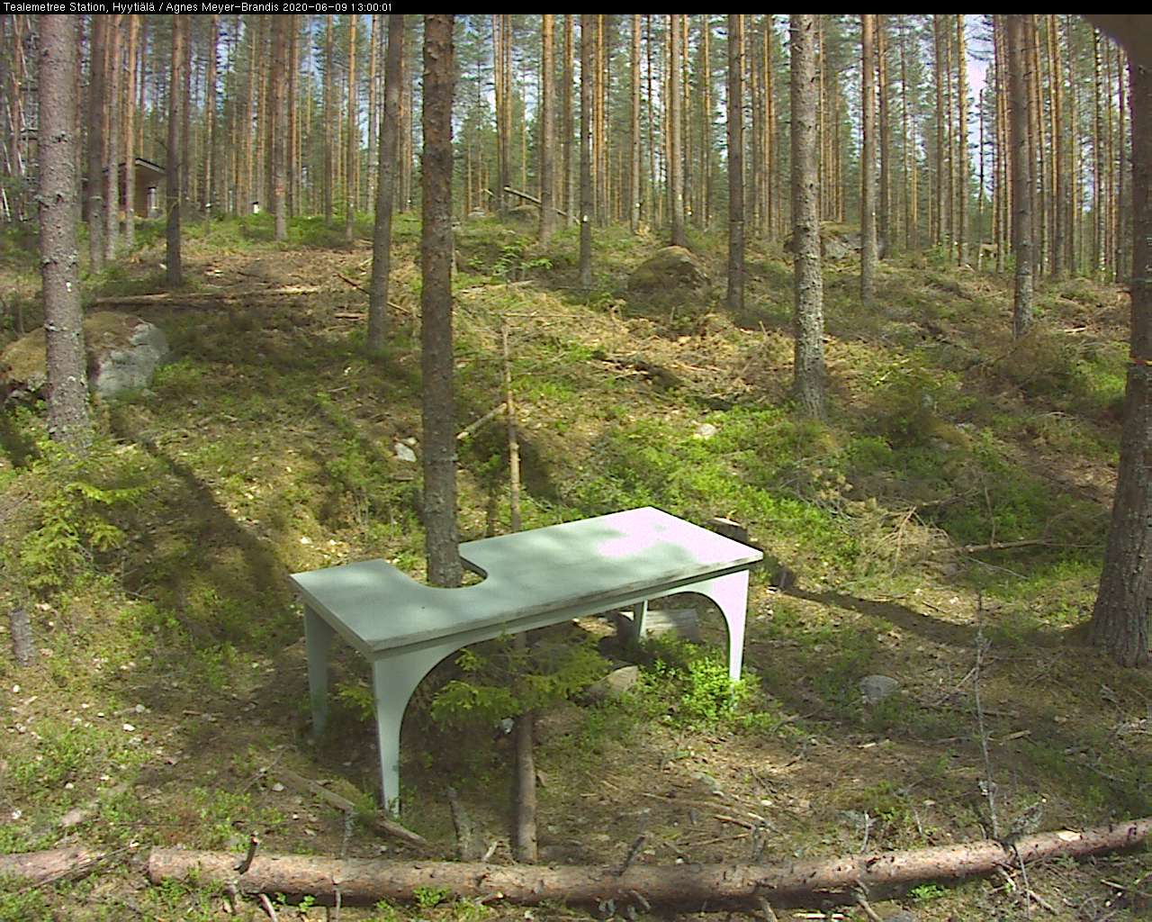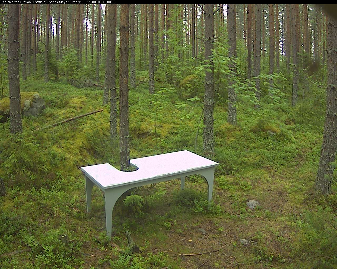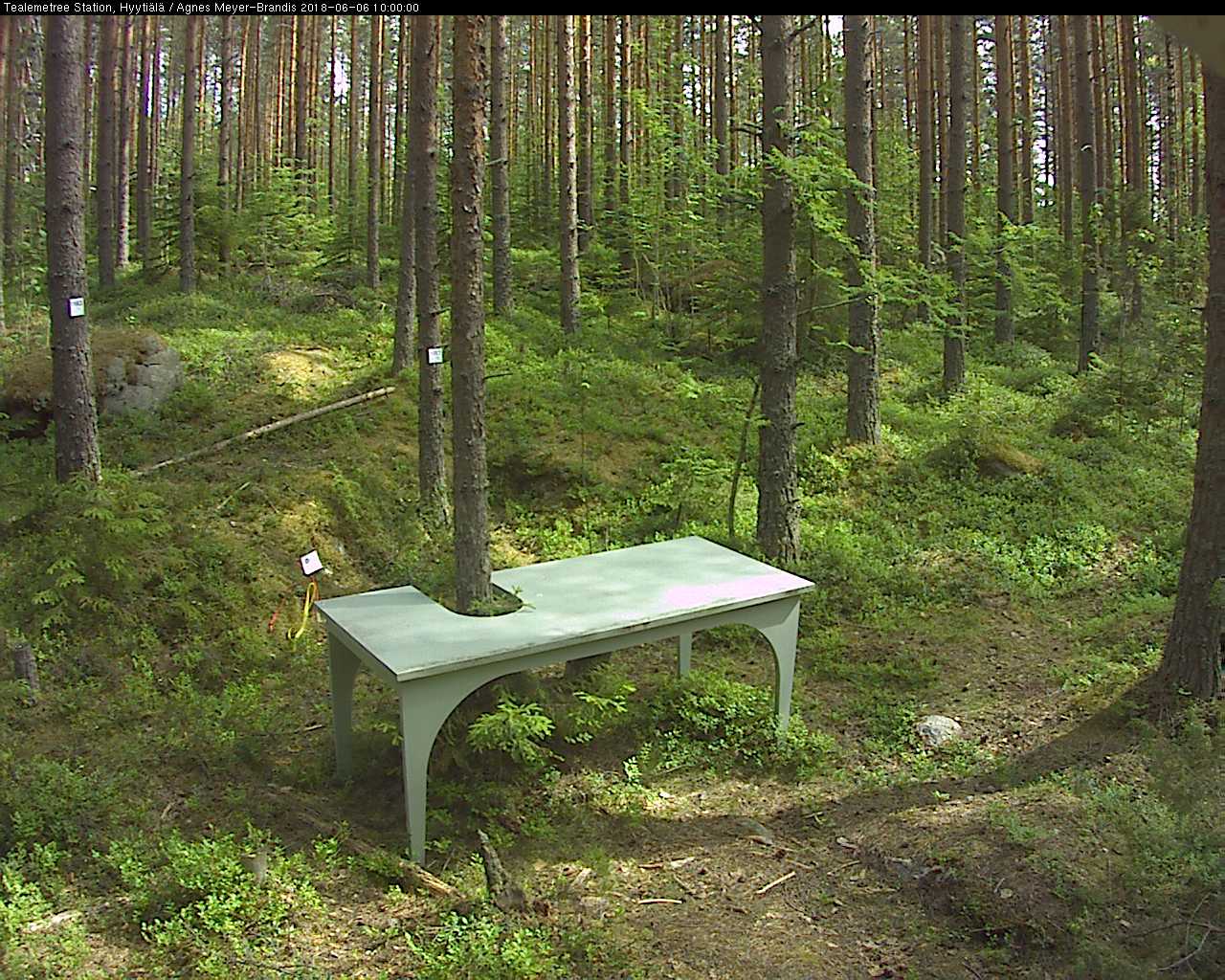 Agnes Meyer-Brandiksen työ Hyytiälässä alkoi tutustumalla aseman muihin tutkijoihin. Pystyäkseen tapaamaan ihmisiä metsässä, hän rakensi pöydän, josta muodostui kohtauspiste ja paikka teehetkille Agneksen ja puun kanssa.