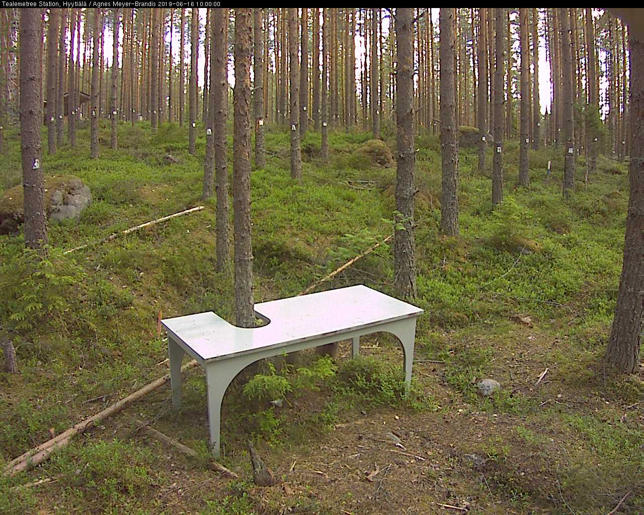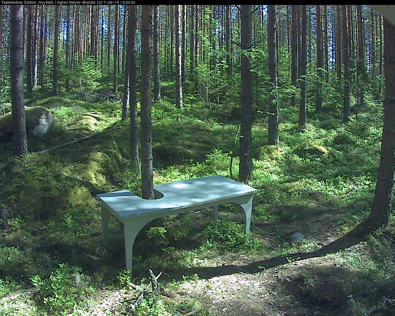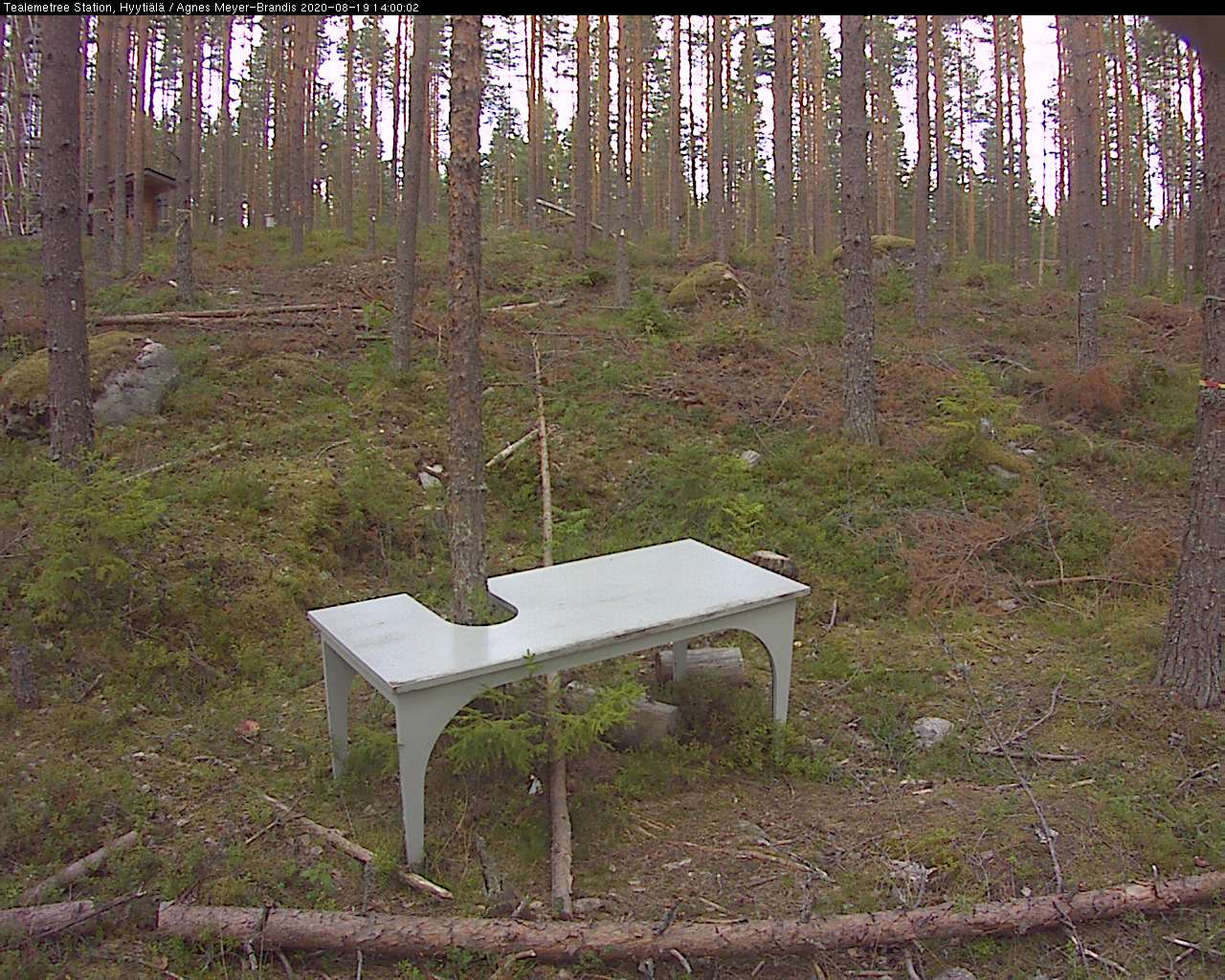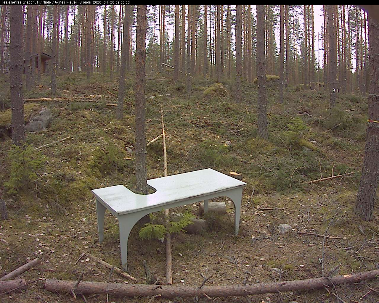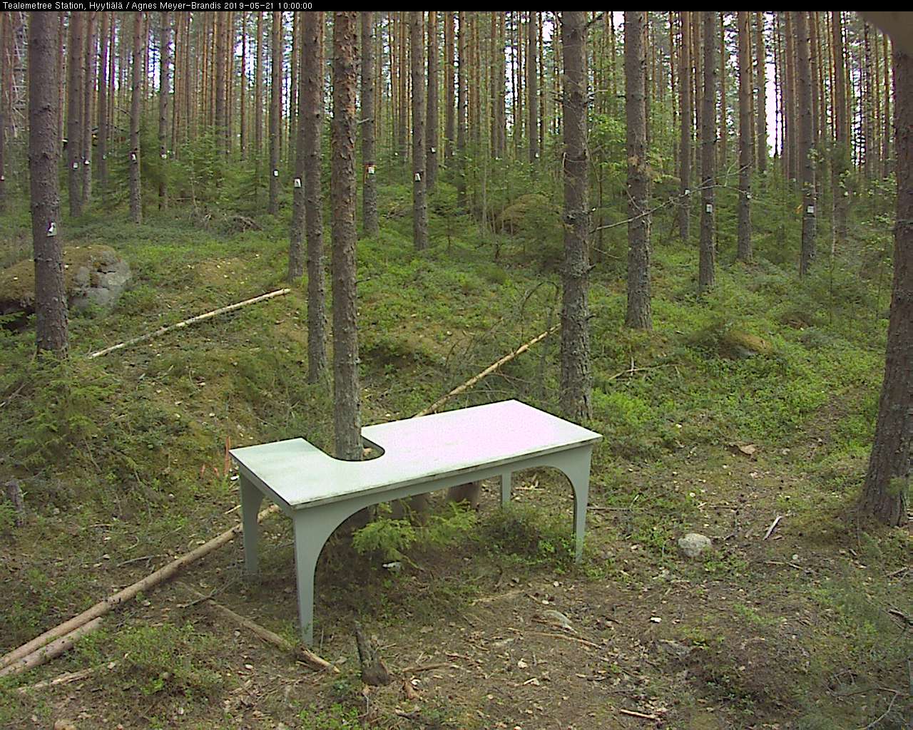 Agnes Meyer-Brandiksen työ Hyytiälässä alkoi tutustumalla aseman muihin tutkijoihin. Pystyäkseen tapaamaan ihmisiä metsässä, hän rakensi pöydän, josta muodostui kohtauspiste ja paikka teehetkille Agneksen ja puun kanssa.