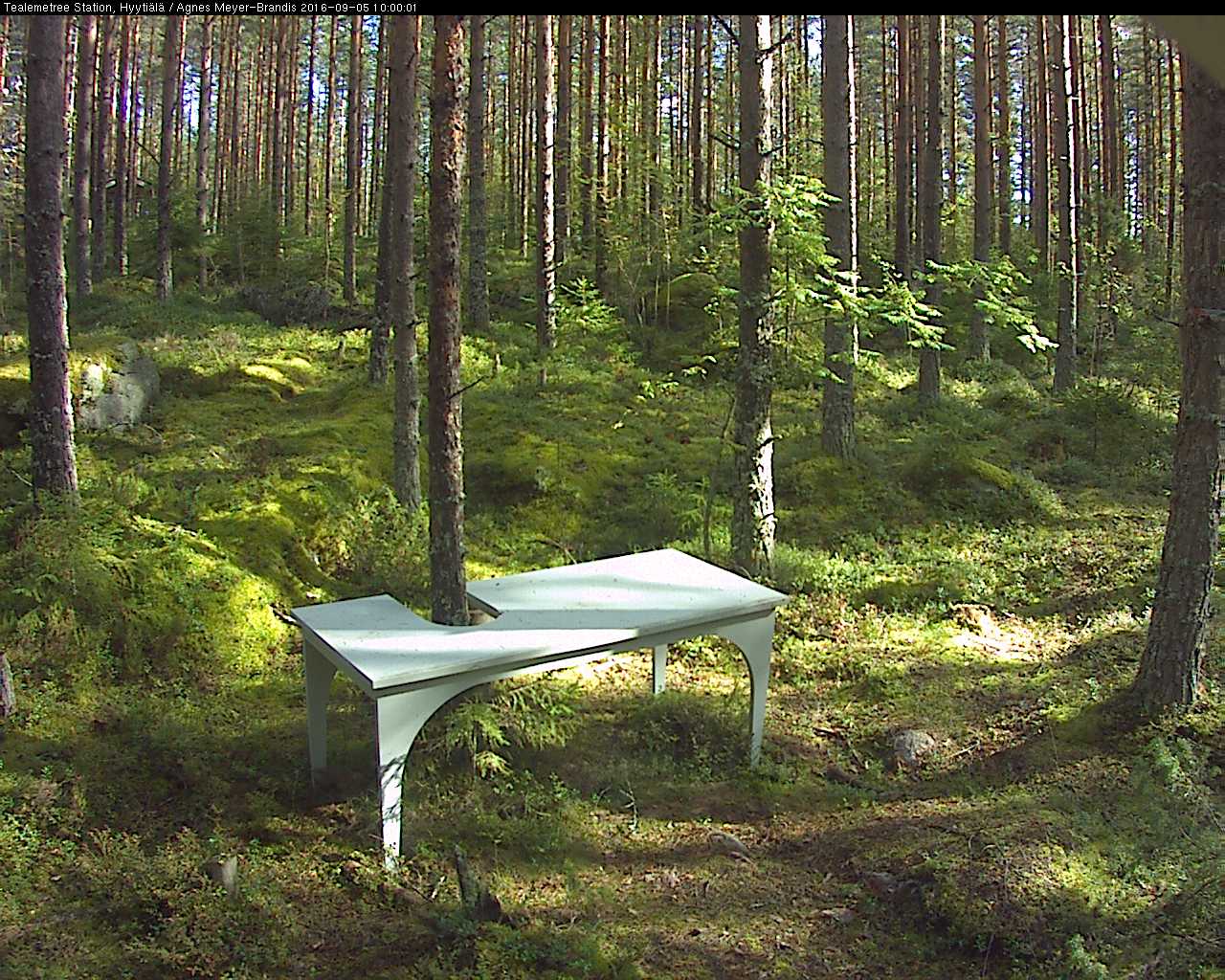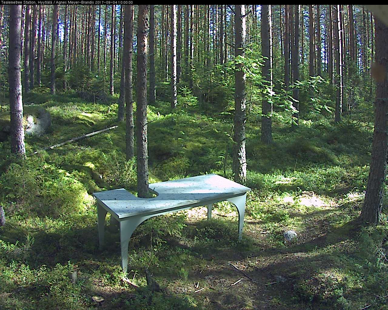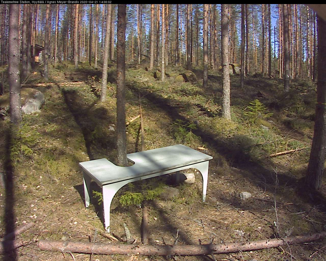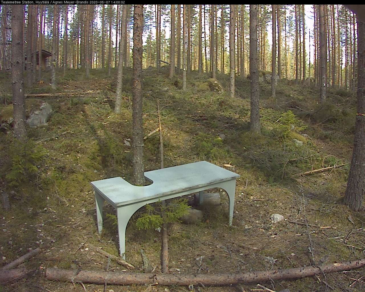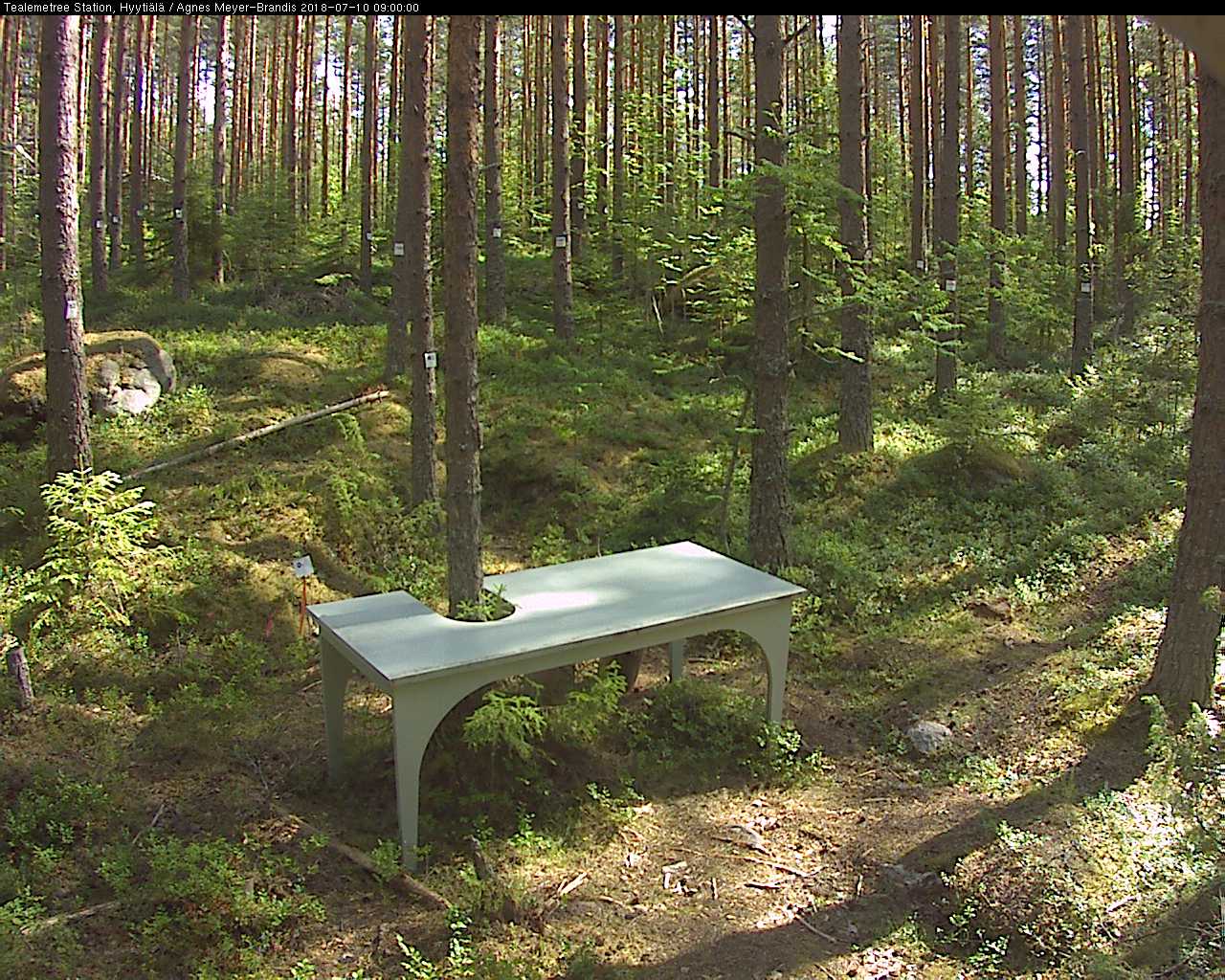 Agnes Meyer-Brandiksen työ Hyytiälässä alkoi tutustumalla aseman muihin tutkijoihin. Pystyäkseen tapaamaan ihmisiä metsässä, hän rakensi pöydän, josta muodostui kohtauspiste ja paikka teehetkille Agneksen ja puun kanssa.