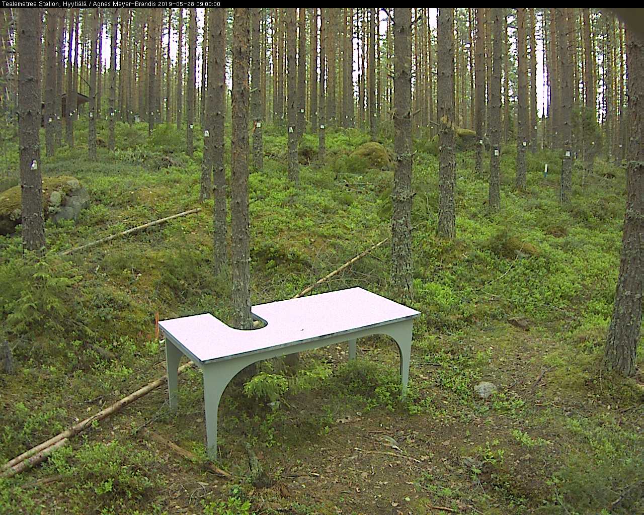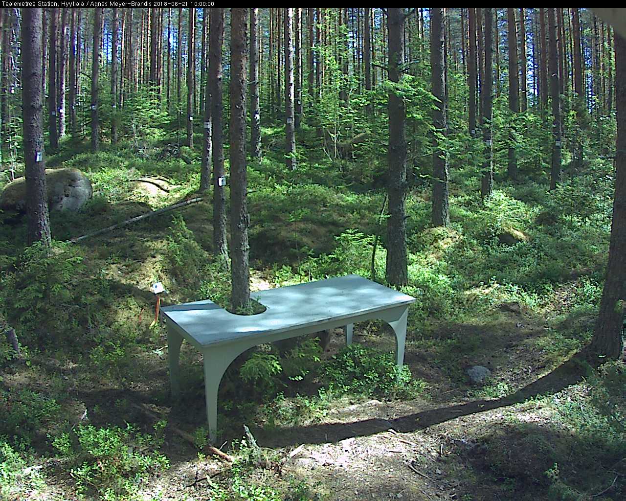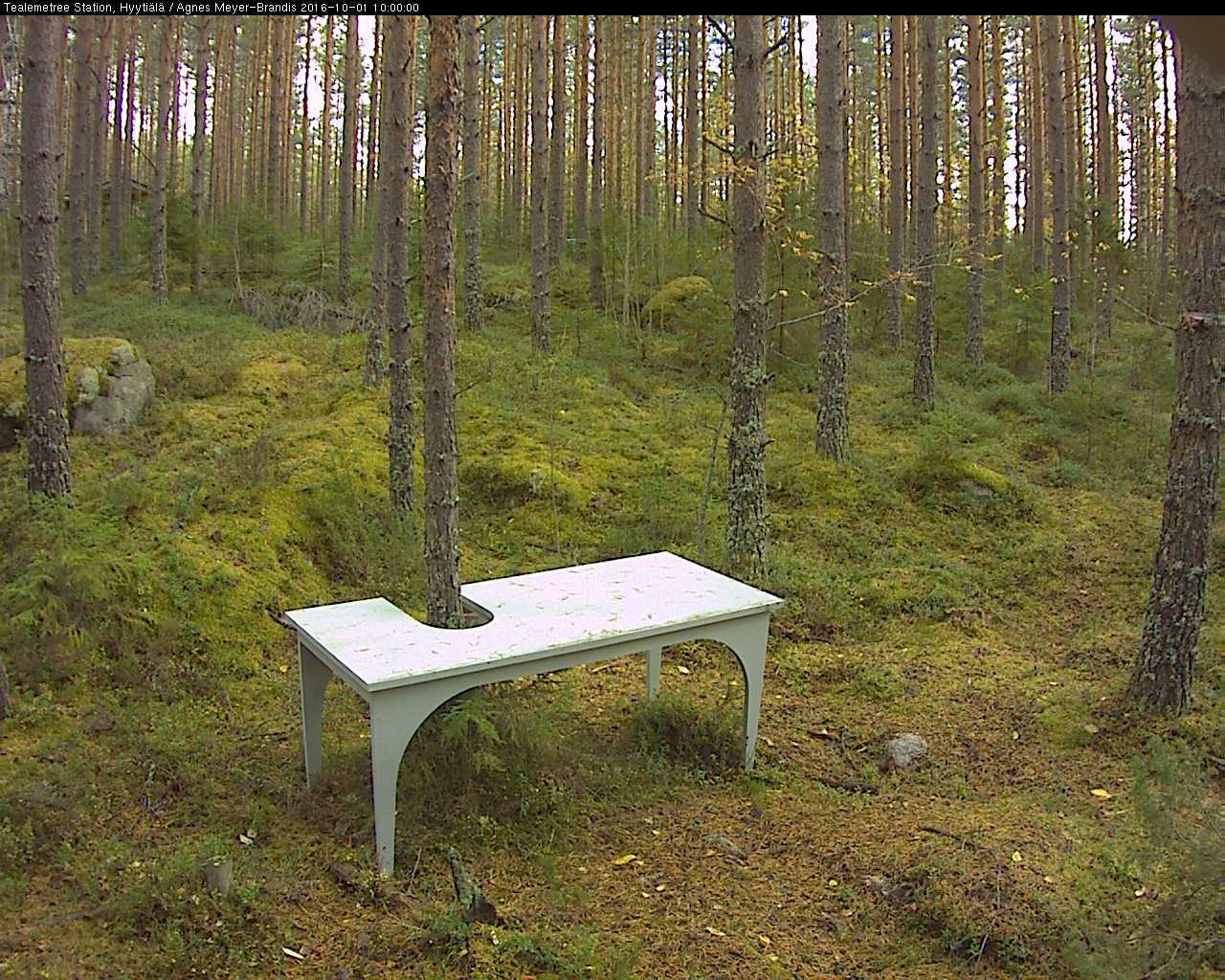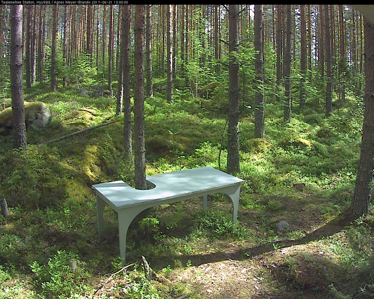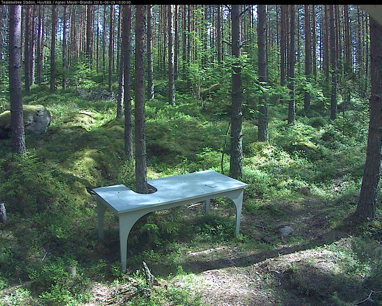 Agnes Meyer-Brandiksen työ Hyytiälässä alkoi tutustumalla aseman muihin tutkijoihin. Pystyäkseen tapaamaan ihmisiä metsässä, hän rakensi pöydän, josta muodostui kohtauspiste ja paikka teehetkille Agneksen ja puun kanssa.