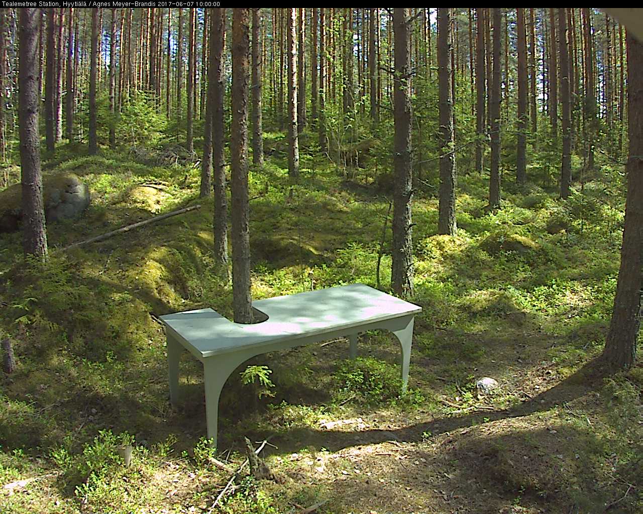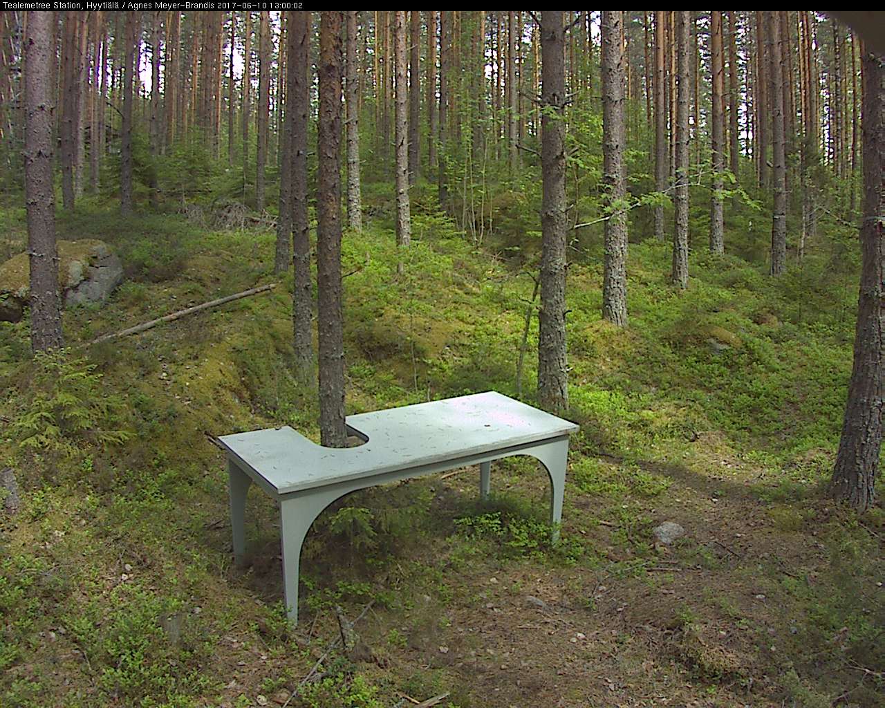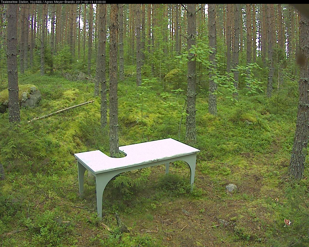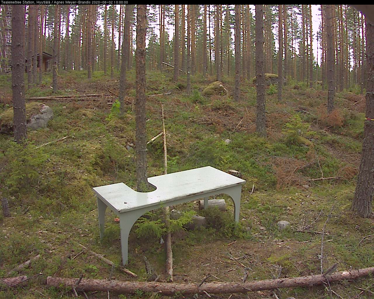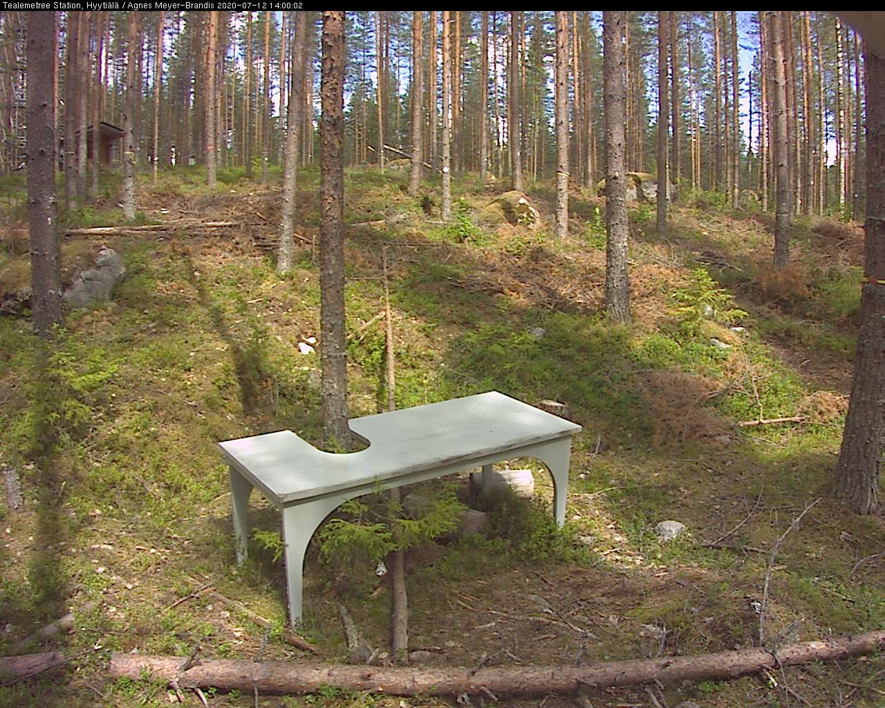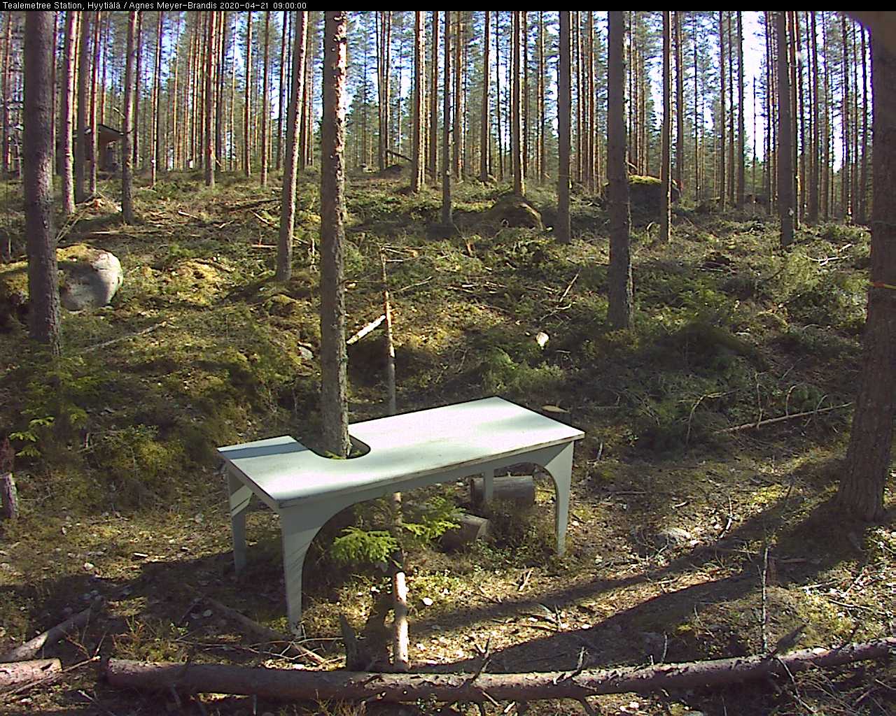 Agnes Meyer-Brandiksen työ Hyytiälässä alkoi tutustumalla aseman muihin tutkijoihin. Pystyäkseen tapaamaan ihmisiä metsässä, hän rakensi pöydän, josta muodostui kohtauspiste ja paikka teehetkille Agneksen ja puun kanssa.