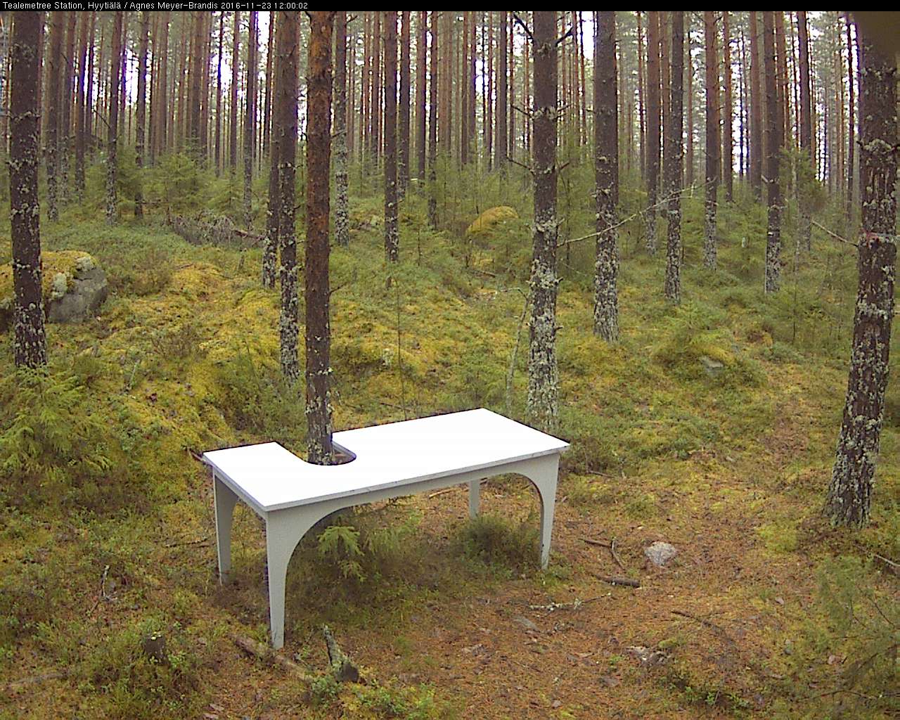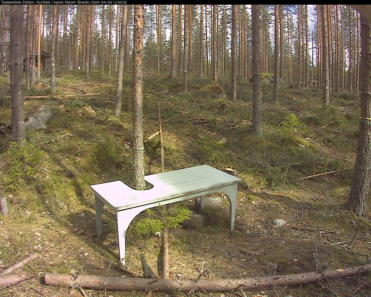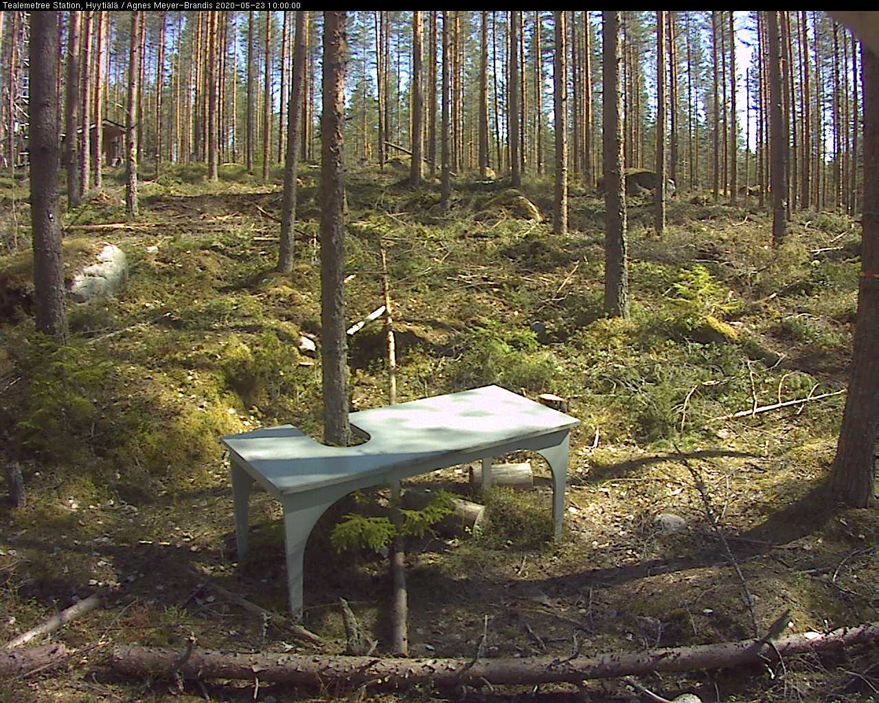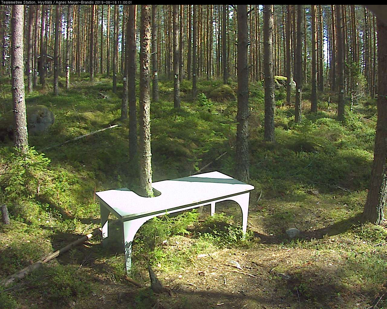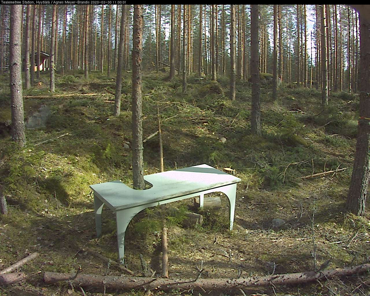 Agnes Meyer-Brandiksen työ Hyytiälässä alkoi tutustumalla aseman muihin tutkijoihin. Pystyäkseen tapaamaan ihmisiä metsässä, hän rakensi pöydän, josta muodostui kohtauspiste ja paikka teehetkille Agneksen ja puun kanssa.