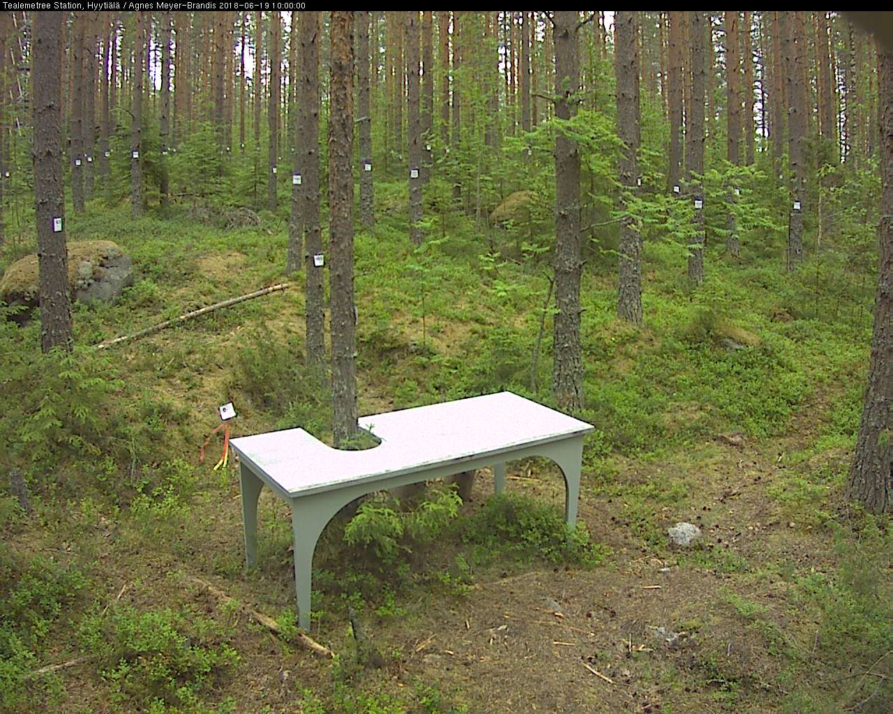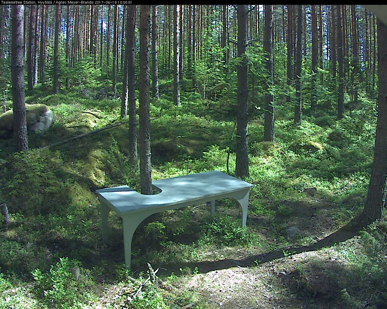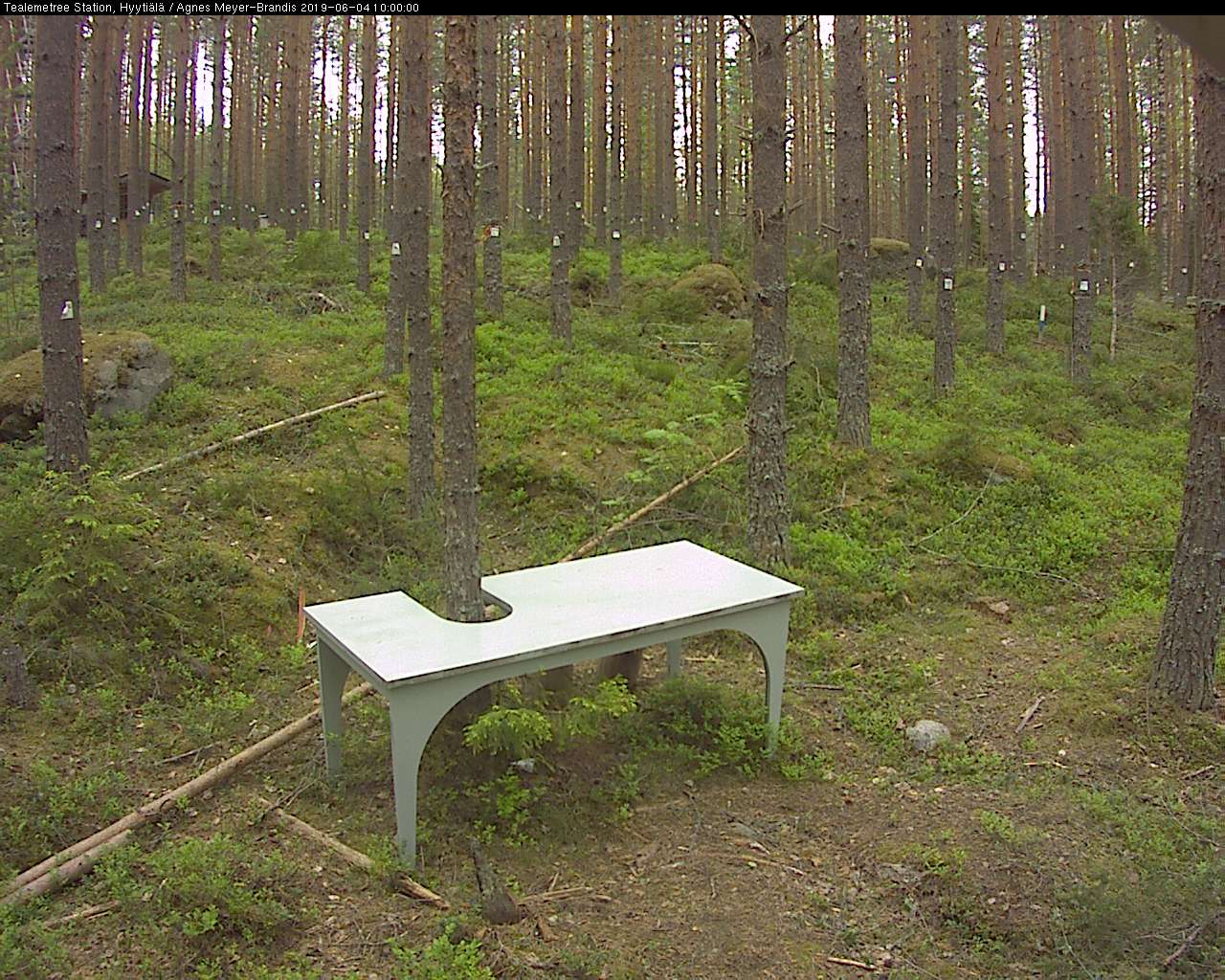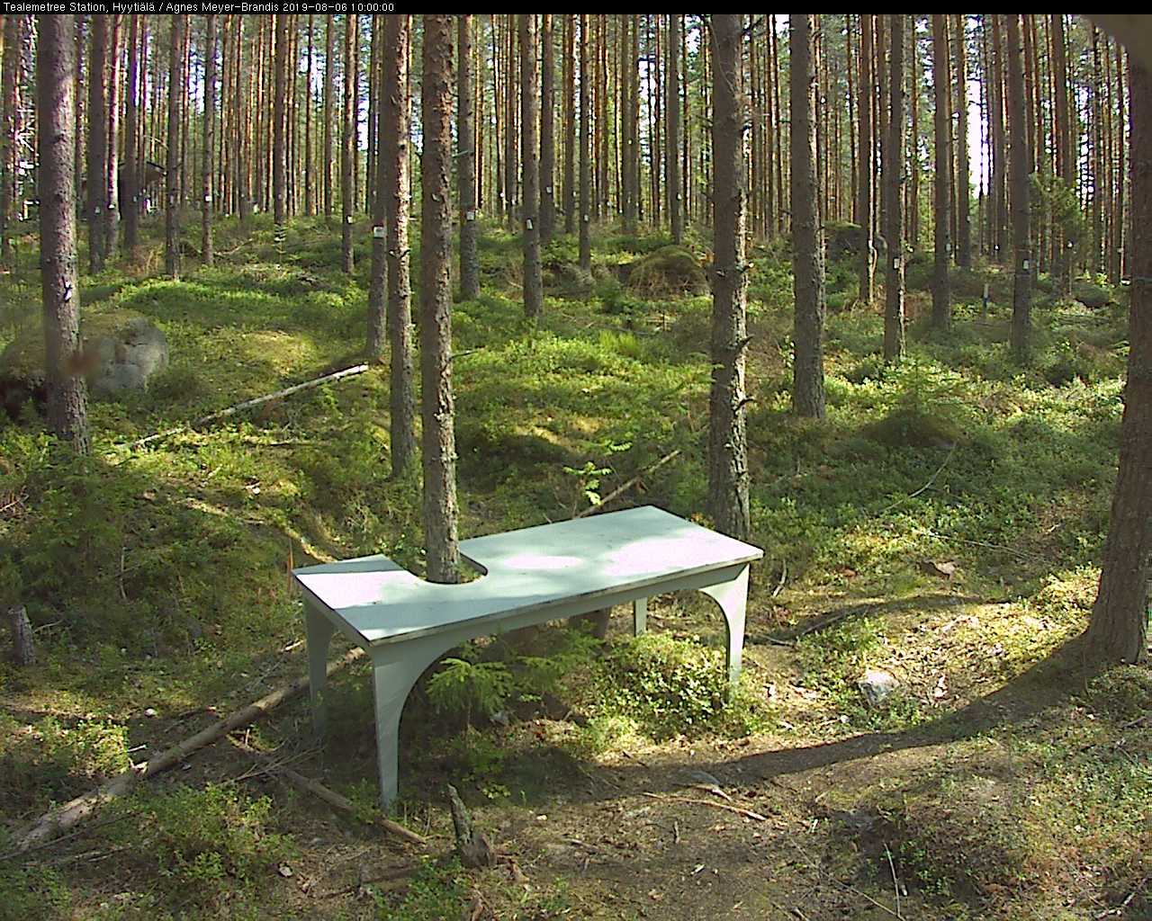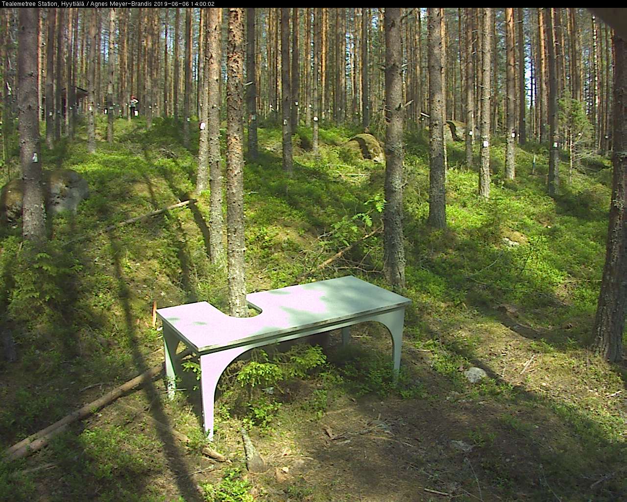 Agnes Meyer-Brandiksen työ Hyytiälässä alkoi tutustumalla aseman muihin tutkijoihin. Pystyäkseen tapaamaan ihmisiä metsässä, hän rakensi pöydän, josta muodostui kohtauspiste ja paikka teehetkille Agneksen ja puun kanssa.