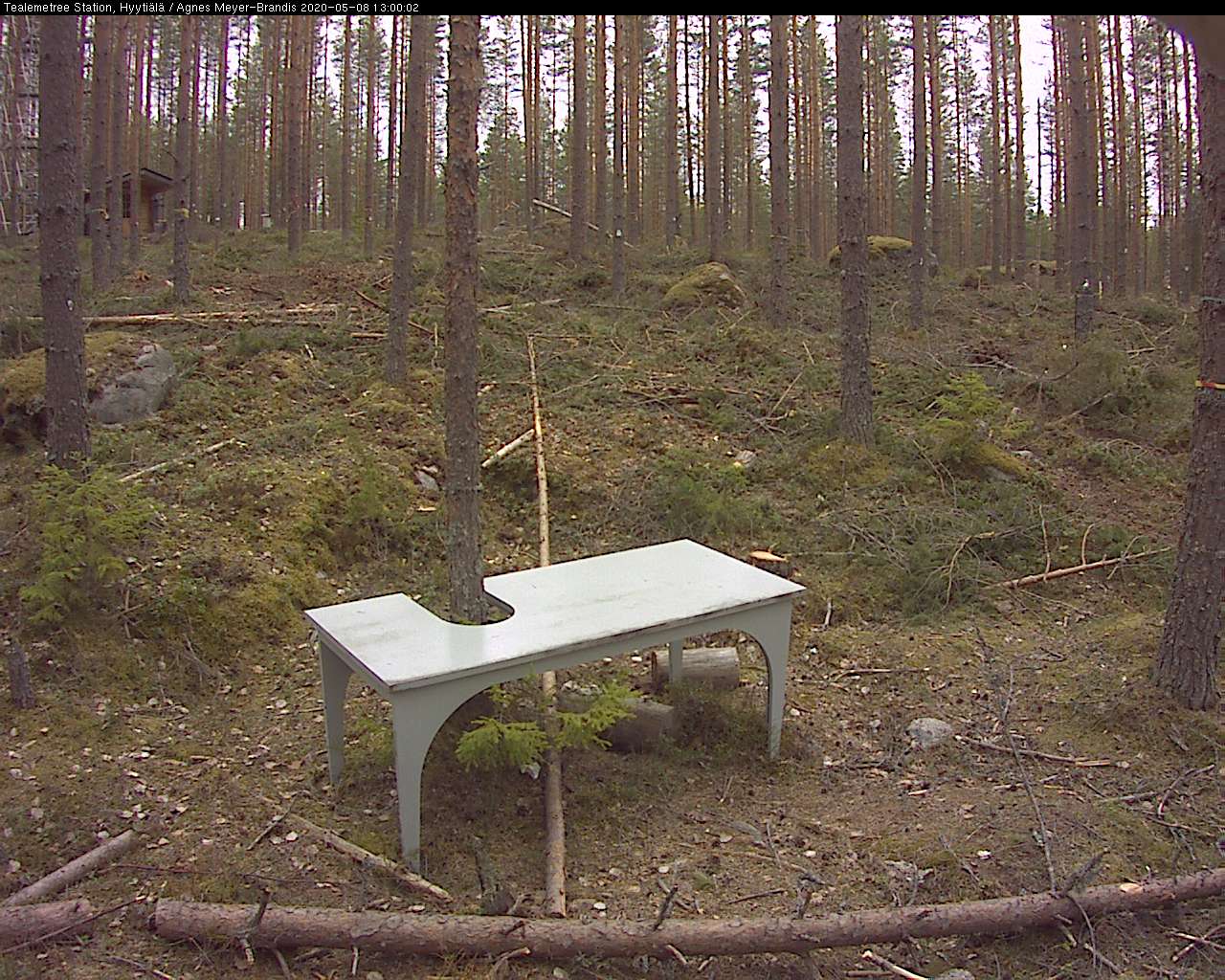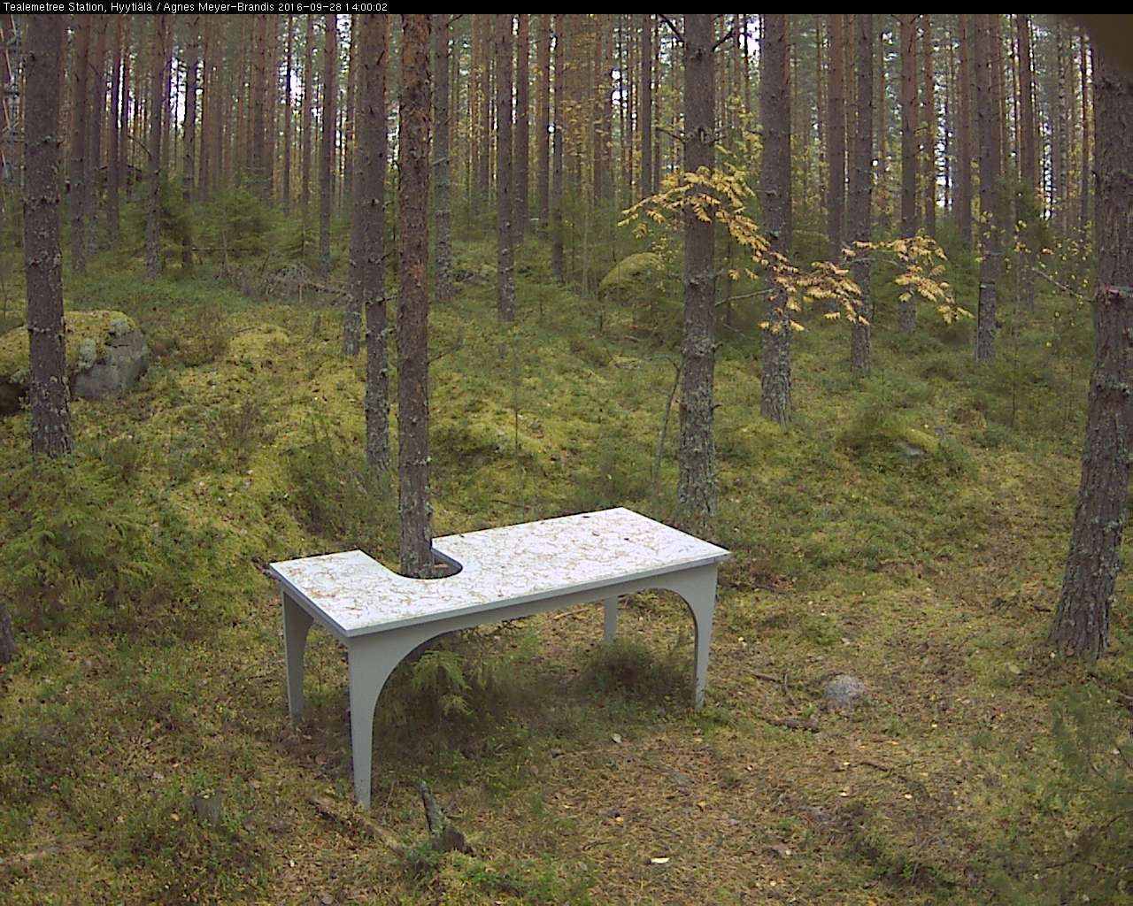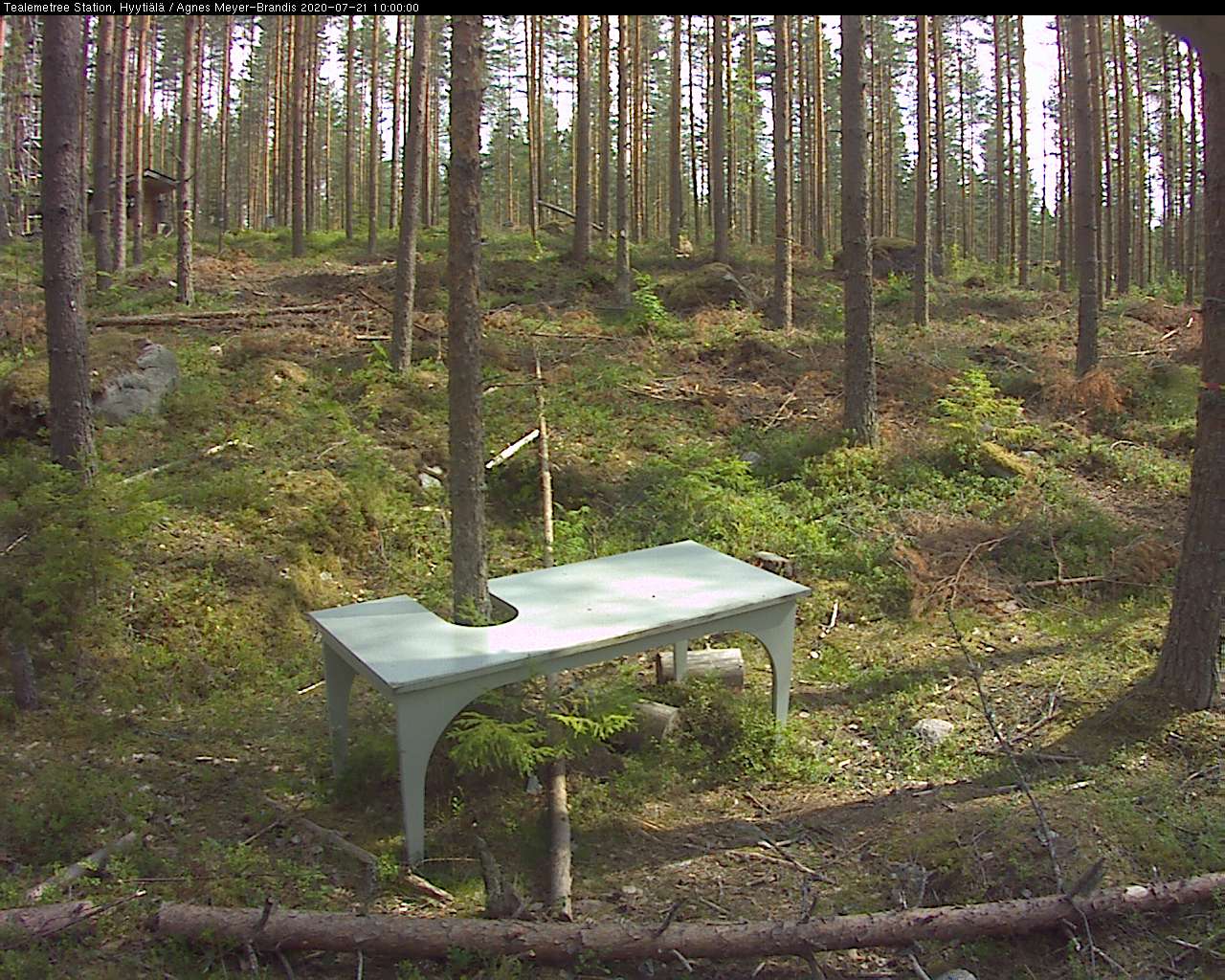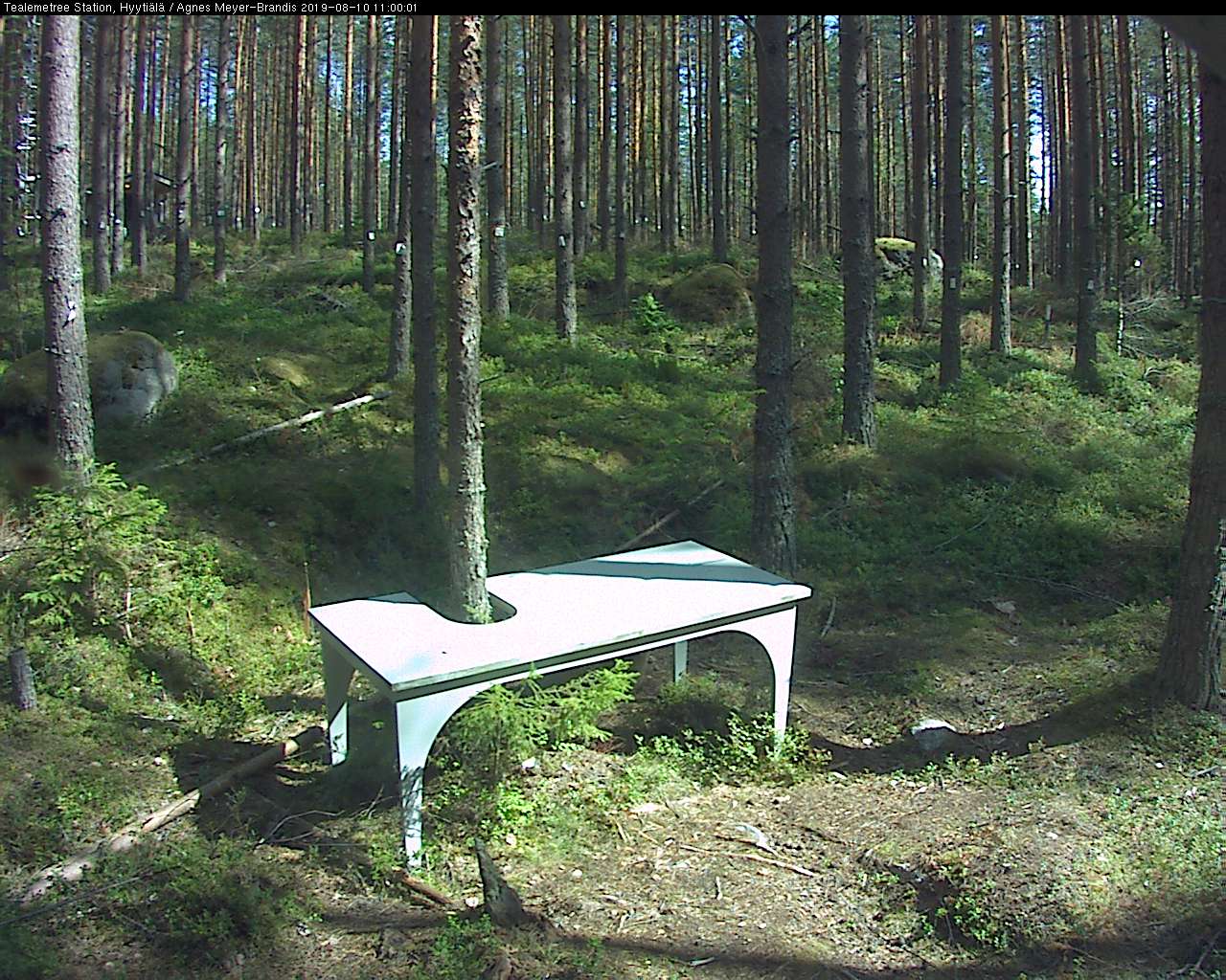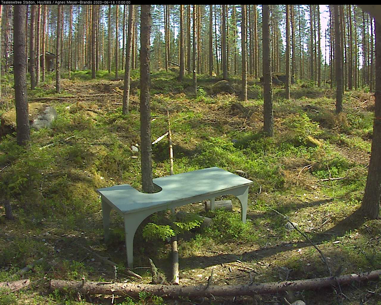 Agnes Meyer-Brandiksen työ Hyytiälässä alkoi tutustumalla aseman muihin tutkijoihin. Pystyäkseen tapaamaan ihmisiä metsässä, hän rakensi pöydän, josta muodostui kohtauspiste ja paikka teehetkille Agneksen ja puun kanssa.